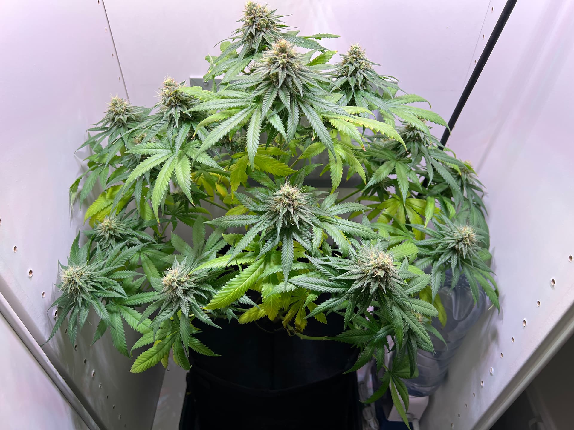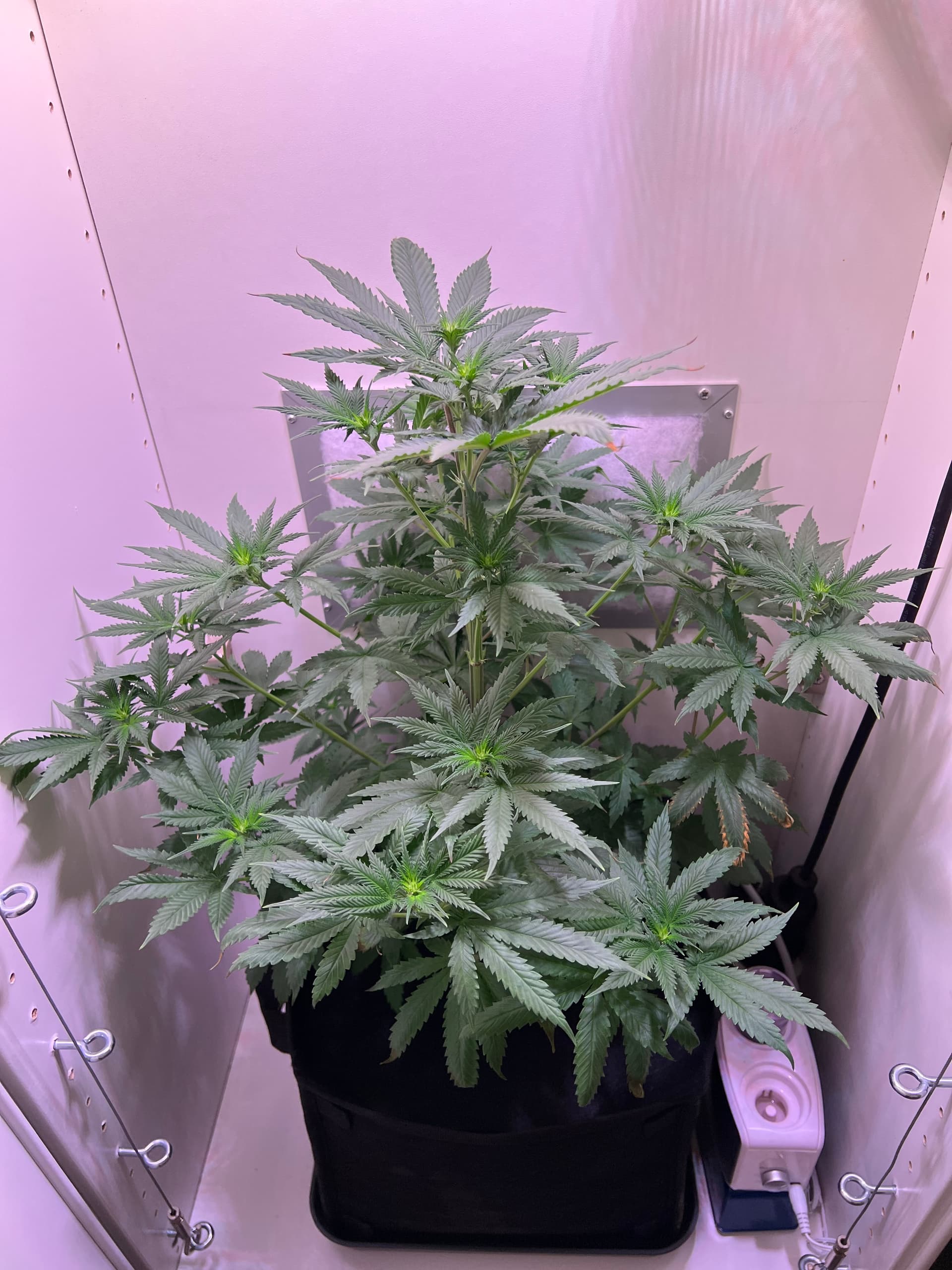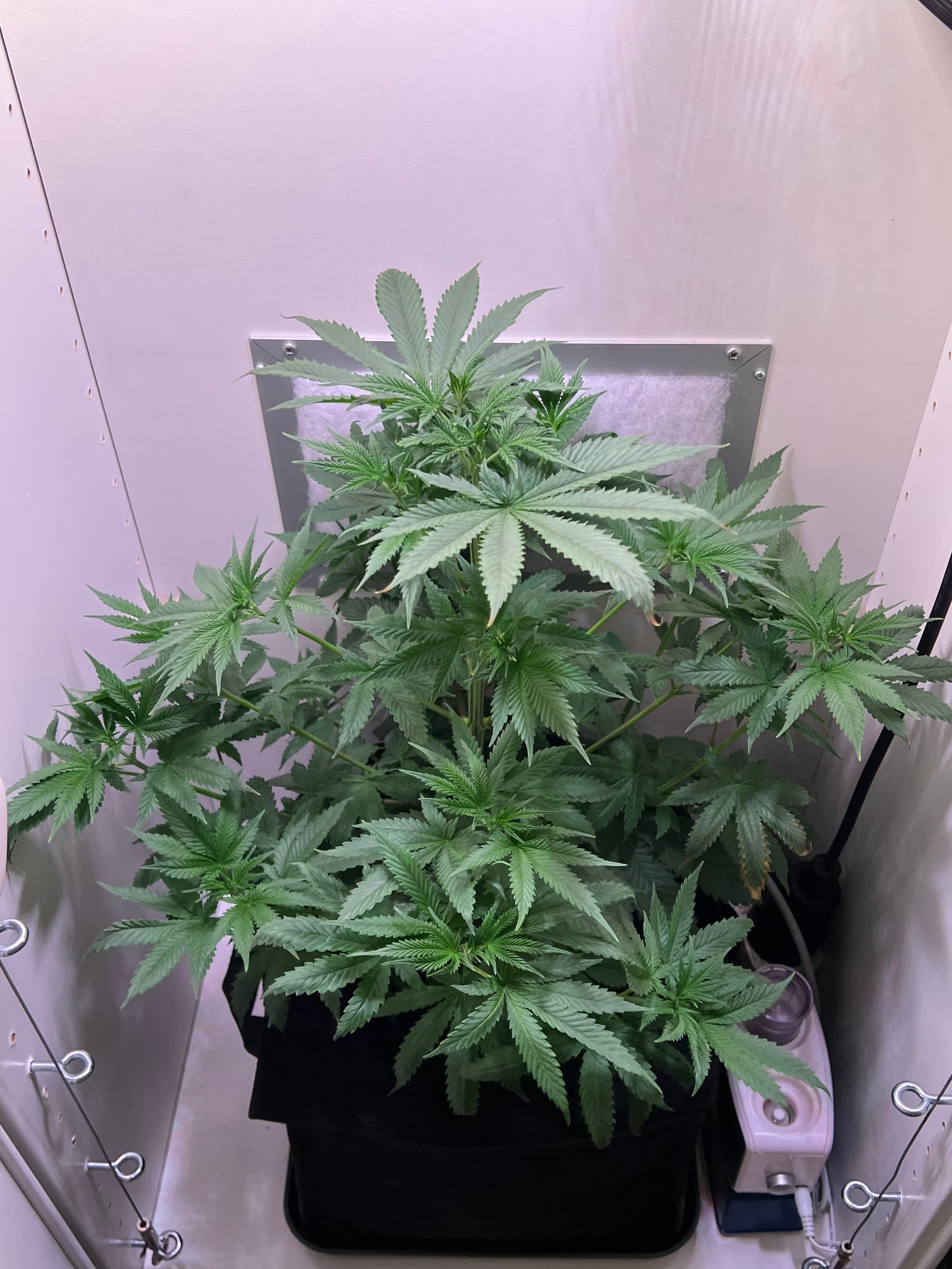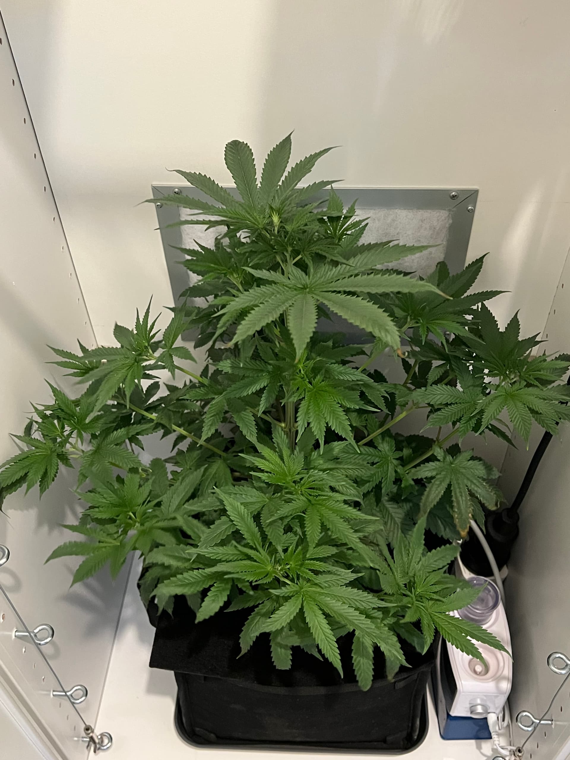 Heute wieder gegossen, nachdem der Topf schon sehr leicht war. Dieses Mal sind auch wirklich 3 Liter (LW + Bittersalz + Bio Heaven + Alg-A-Mic + Top Max) reingegangen, minimaler Drain. Und ein paar wenige der kleinsten Blätter ganz unten, die absolut kein Licht kriegen, hab ich auch weggenommen. Richtig Entlauben würde ich wahrscheinlich in etwa 2 Wochen.