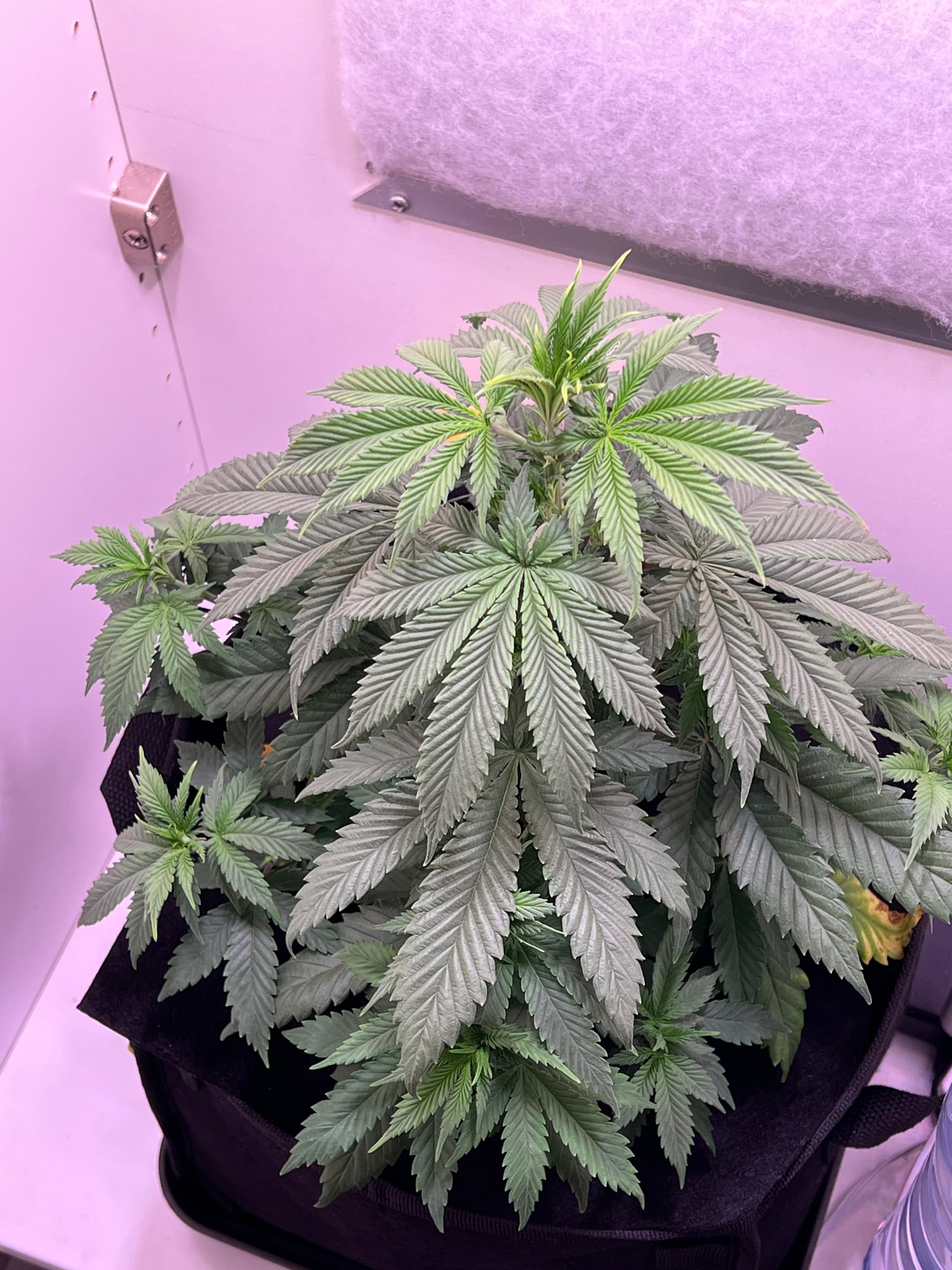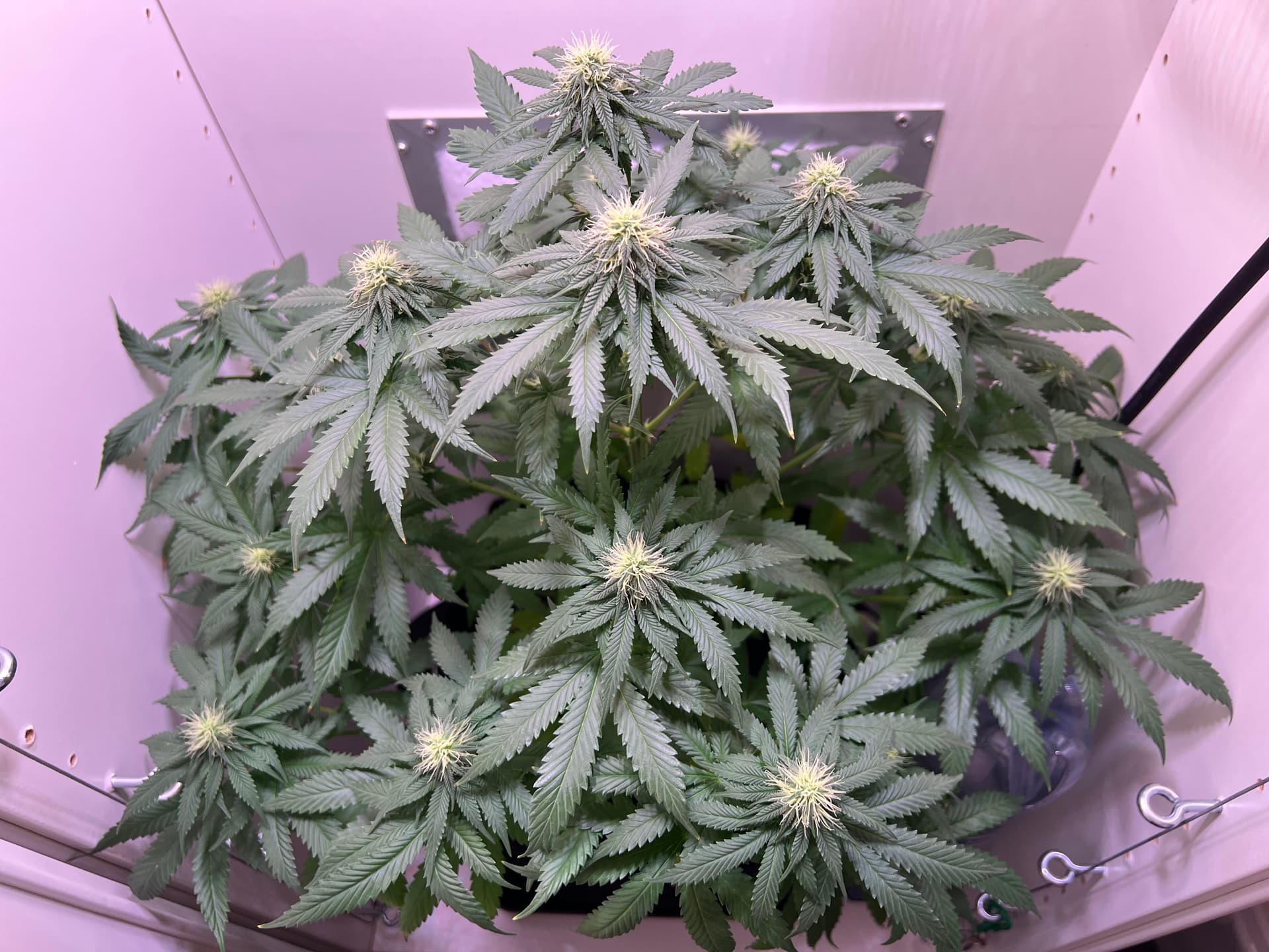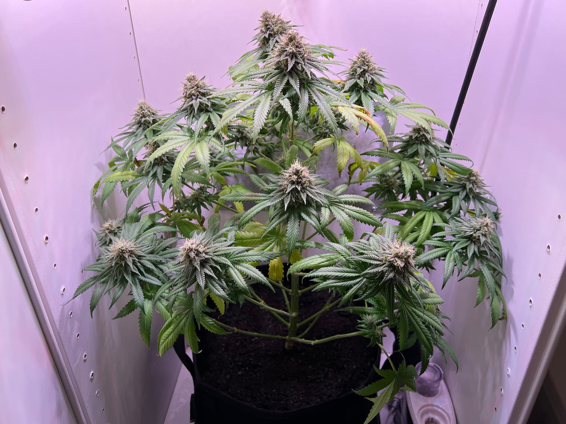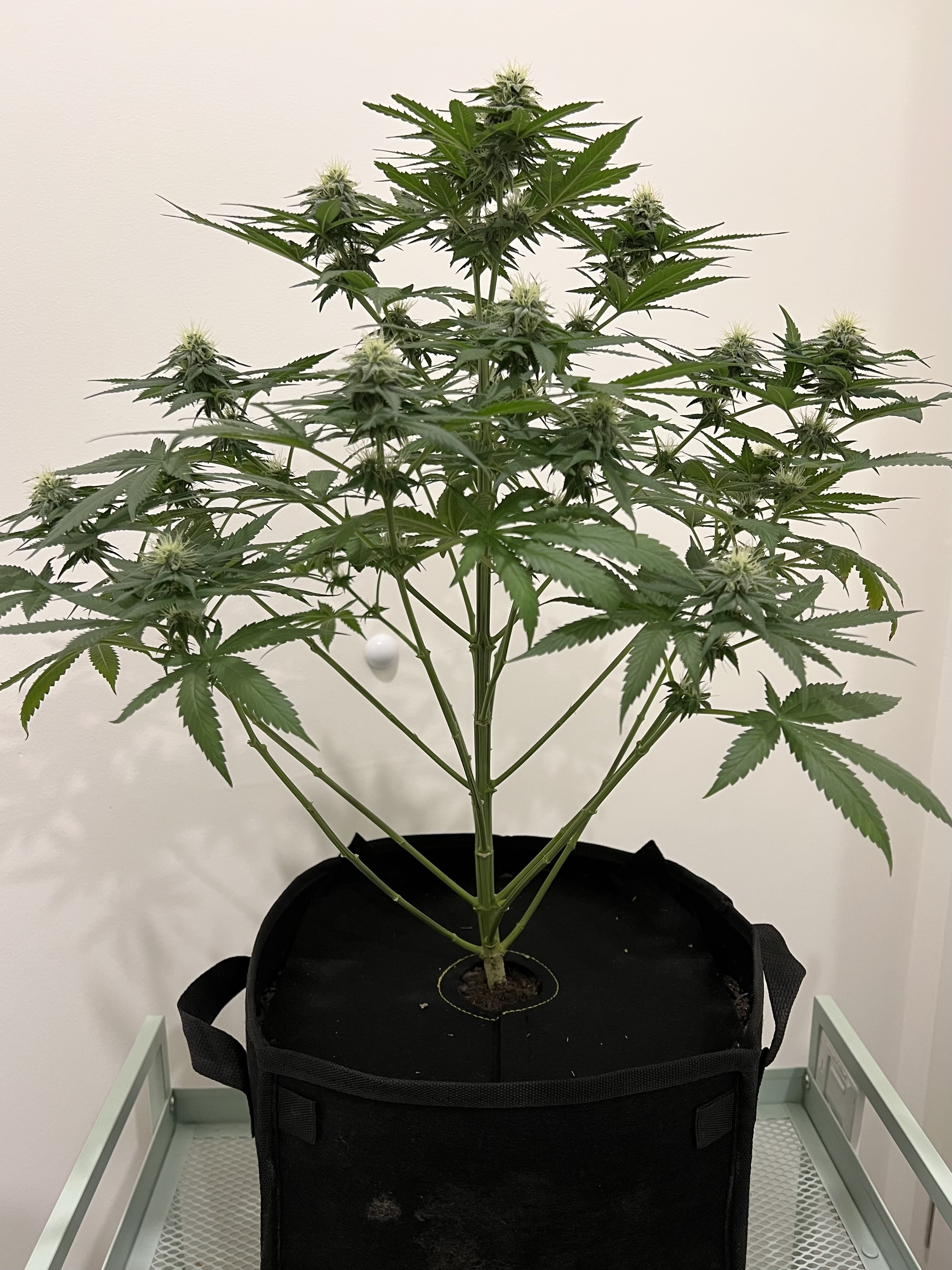 Heute wieder gegossen, nachdem der Topf schon sehr leicht war. Dieses Mal sind auch wirklich 3 Liter (LW + Bittersalz + Bio Heaven + Alg-A-Mic + Top Max) reingegangen, minimaler Drain. Und ein paar wenige der kleinsten Blätter ganz unten, die absolut kein Licht kriegen, hab ich auch weggenommen. Richtig Entlauben würde ich wahrscheinlich in etwa 2 Wochen.