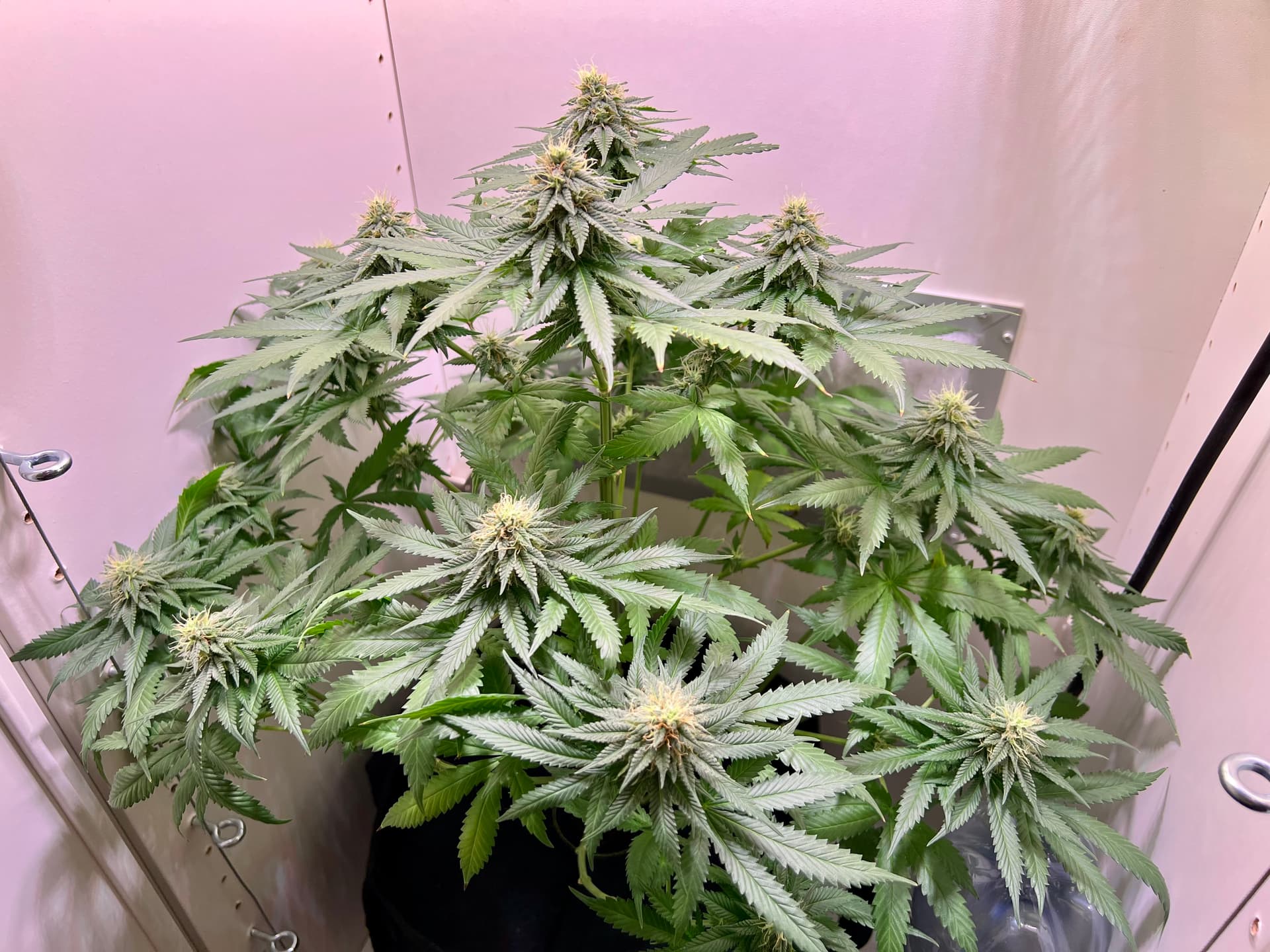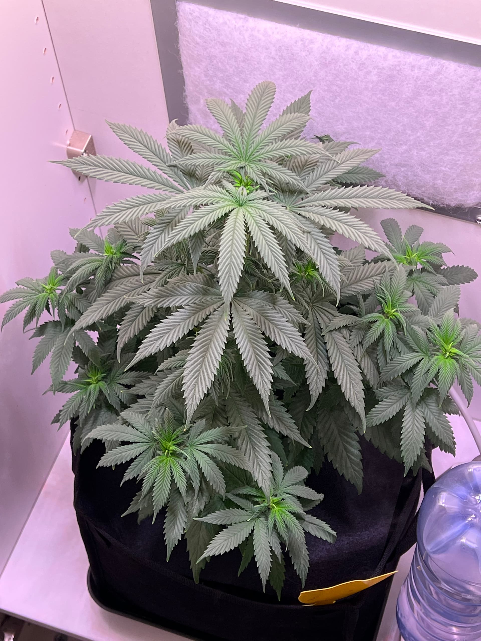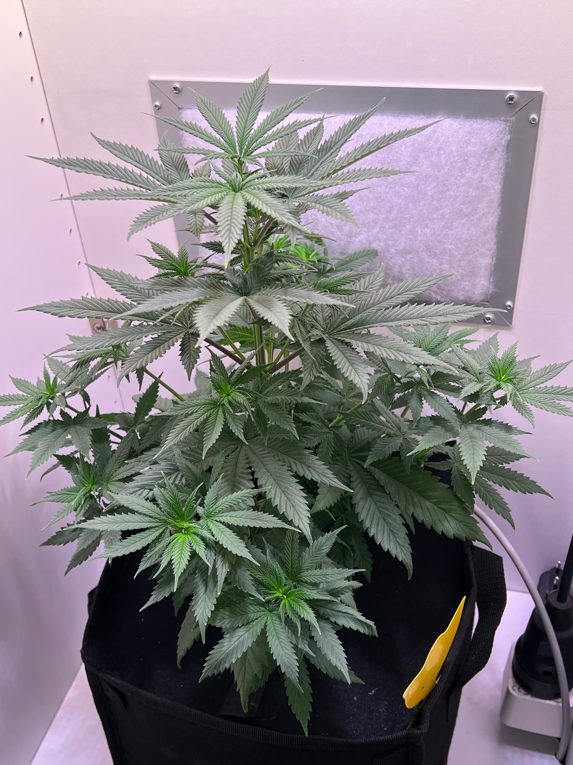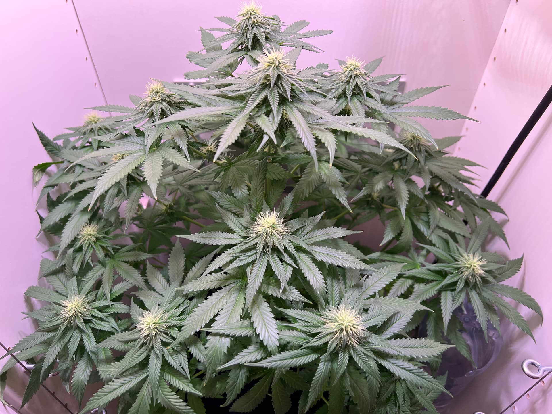 Heute wieder gegossen, nachdem der Topf schon sehr leicht war. Dieses Mal sind auch wirklich 3 Liter (LW + Bittersalz + Bio Heaven + Alg-A-Mic + Top Max) reingegangen, minimaler Drain. Und ein paar wenige der kleinsten Blätter ganz unten, die absolut kein Licht kriegen, hab ich auch weggenommen. Richtig Entlauben würde ich wahrscheinlich in etwa 2 Wochen.