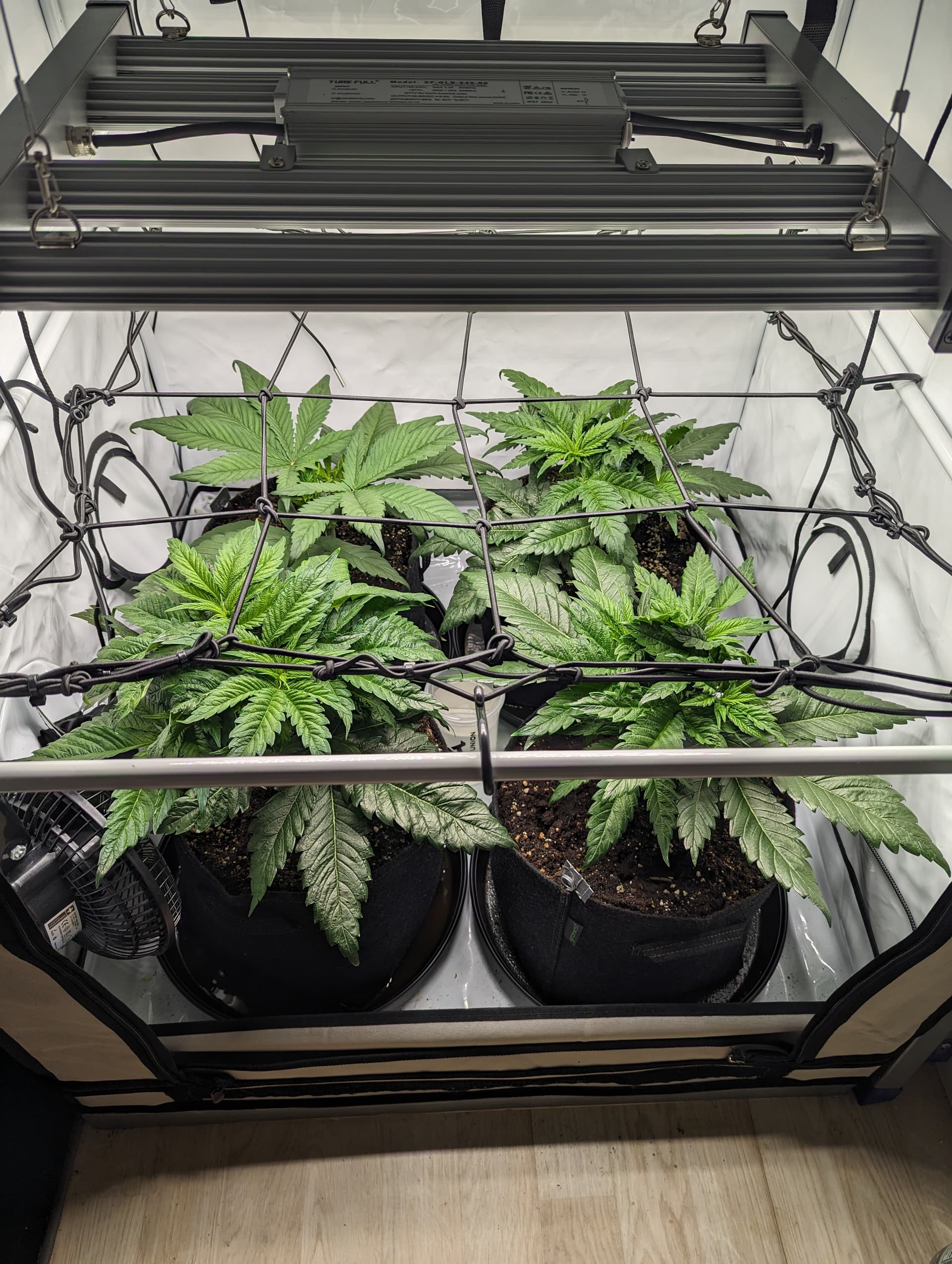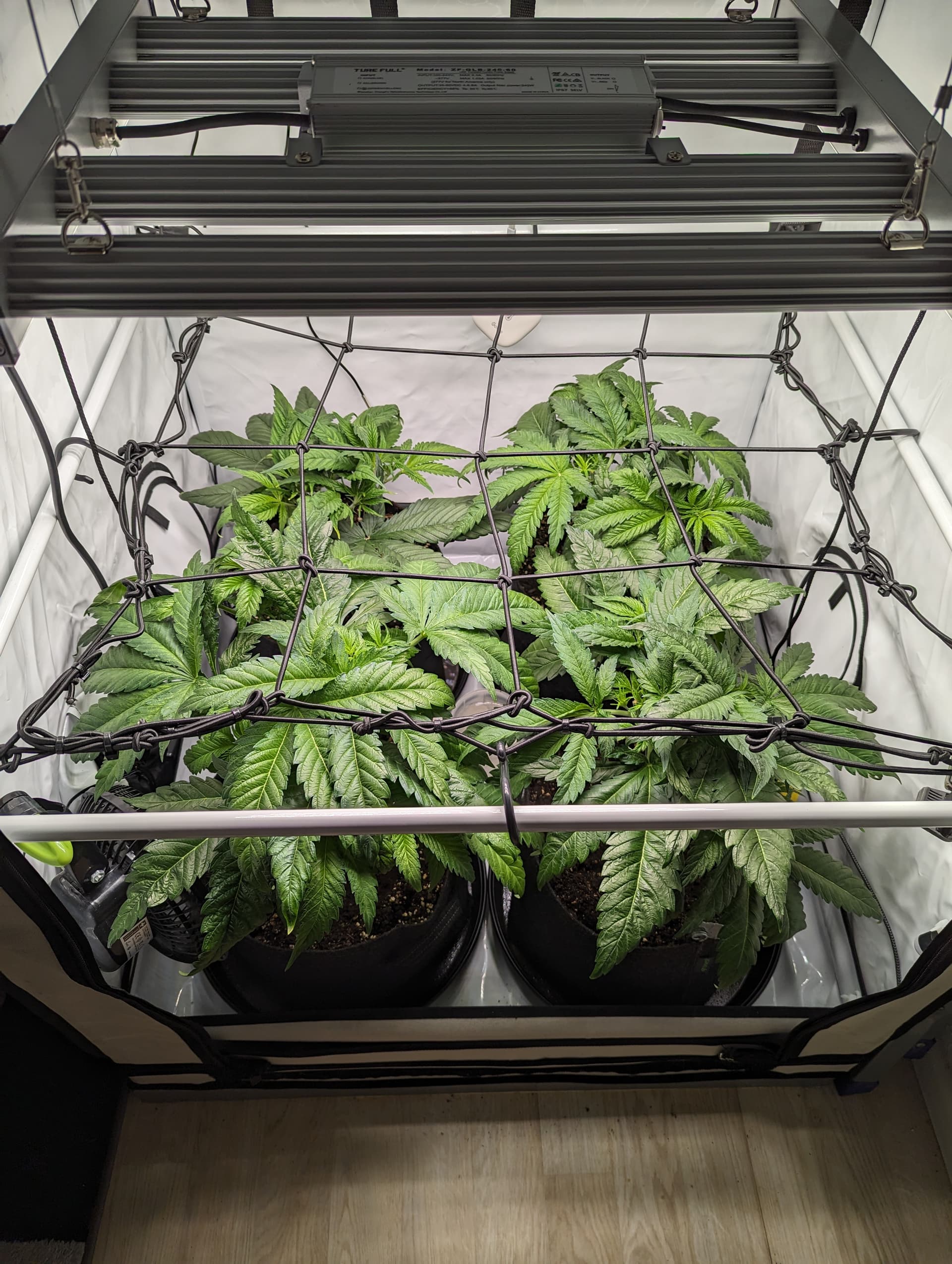Alle Pflanzen haben sich gut erholt und wachsen prächtig. Ich habe das Scrog Netz circa 10cm höher gehangen da die Ladys diesen Donnerstag schon gegen das Netz drückten und ich sie erst in 2 Wochen beim Umstellen auf Blüte dort sehen möchte.