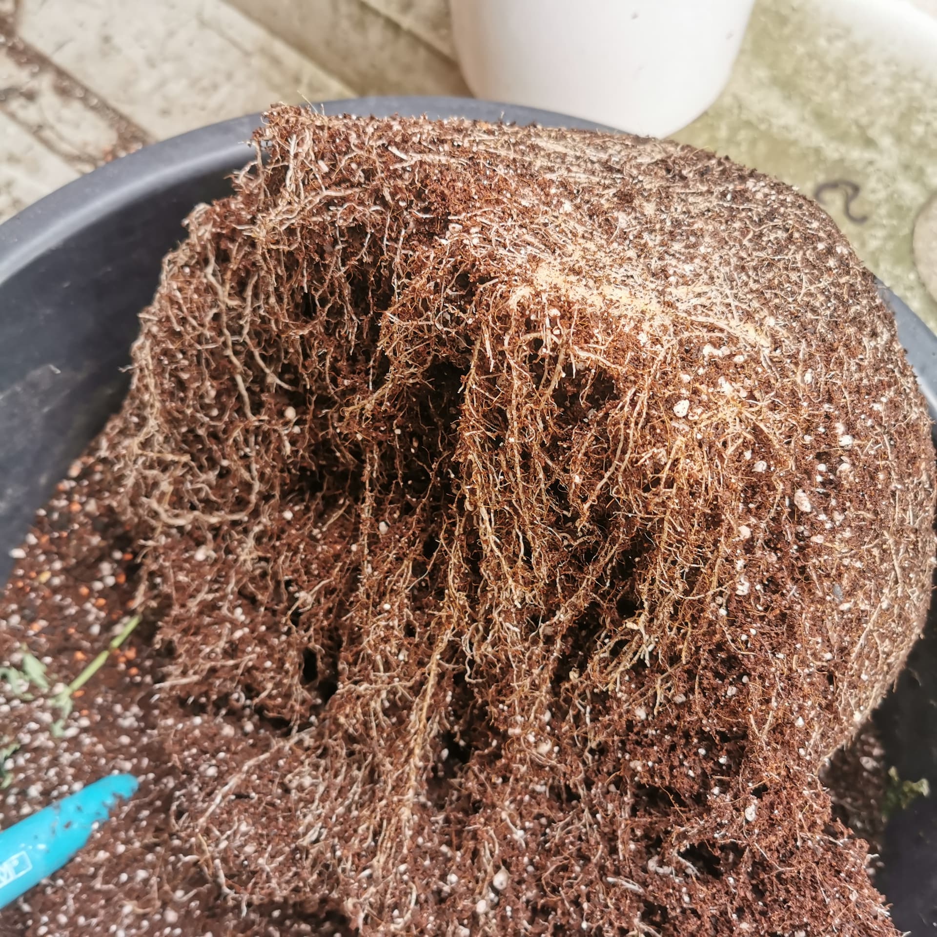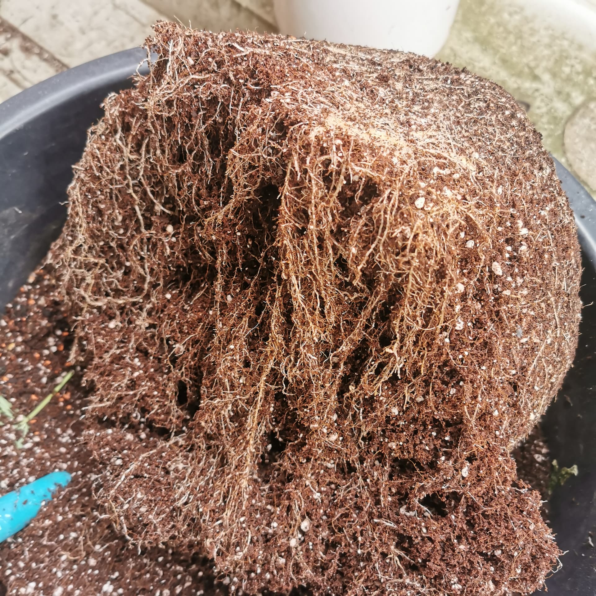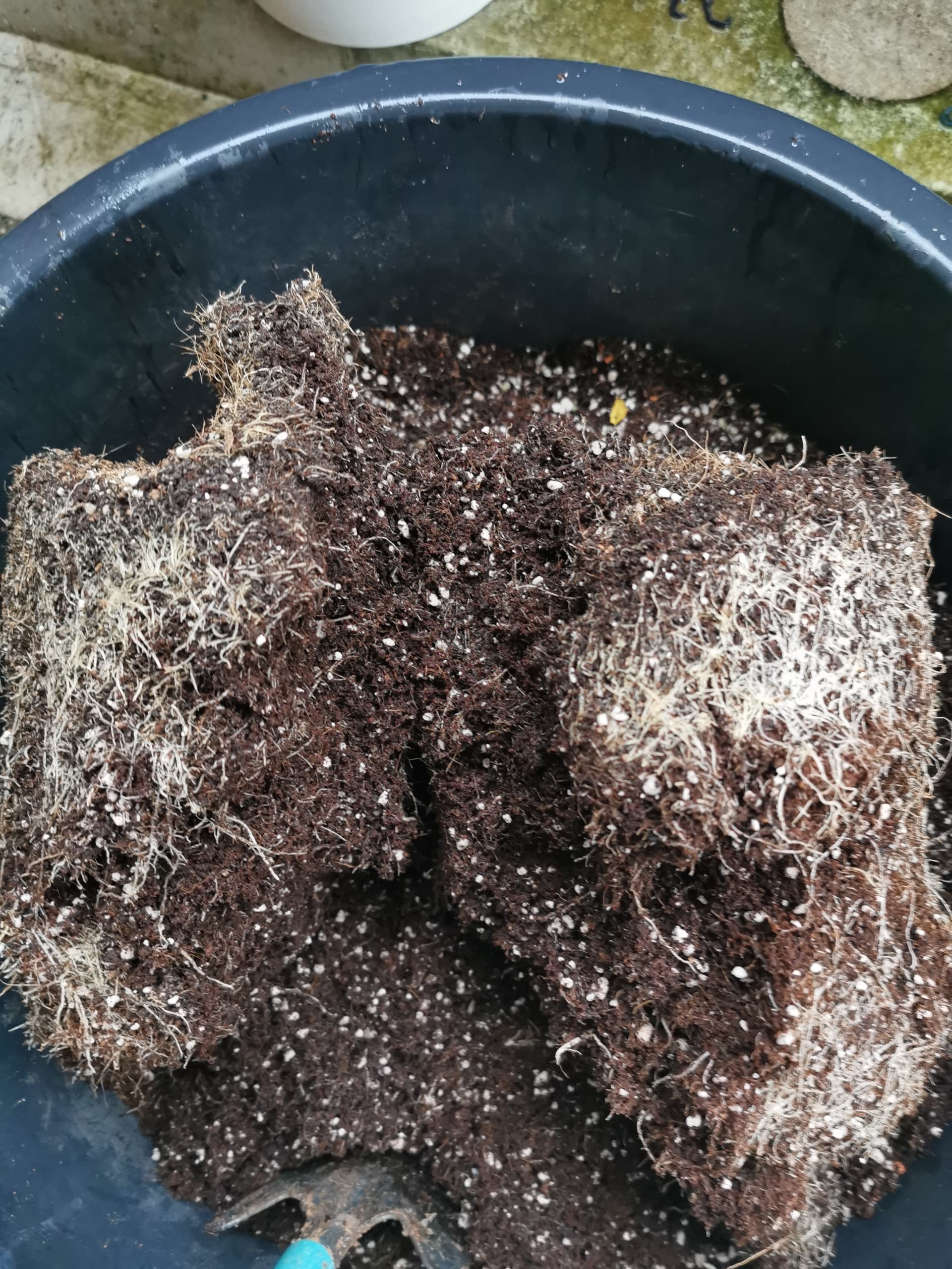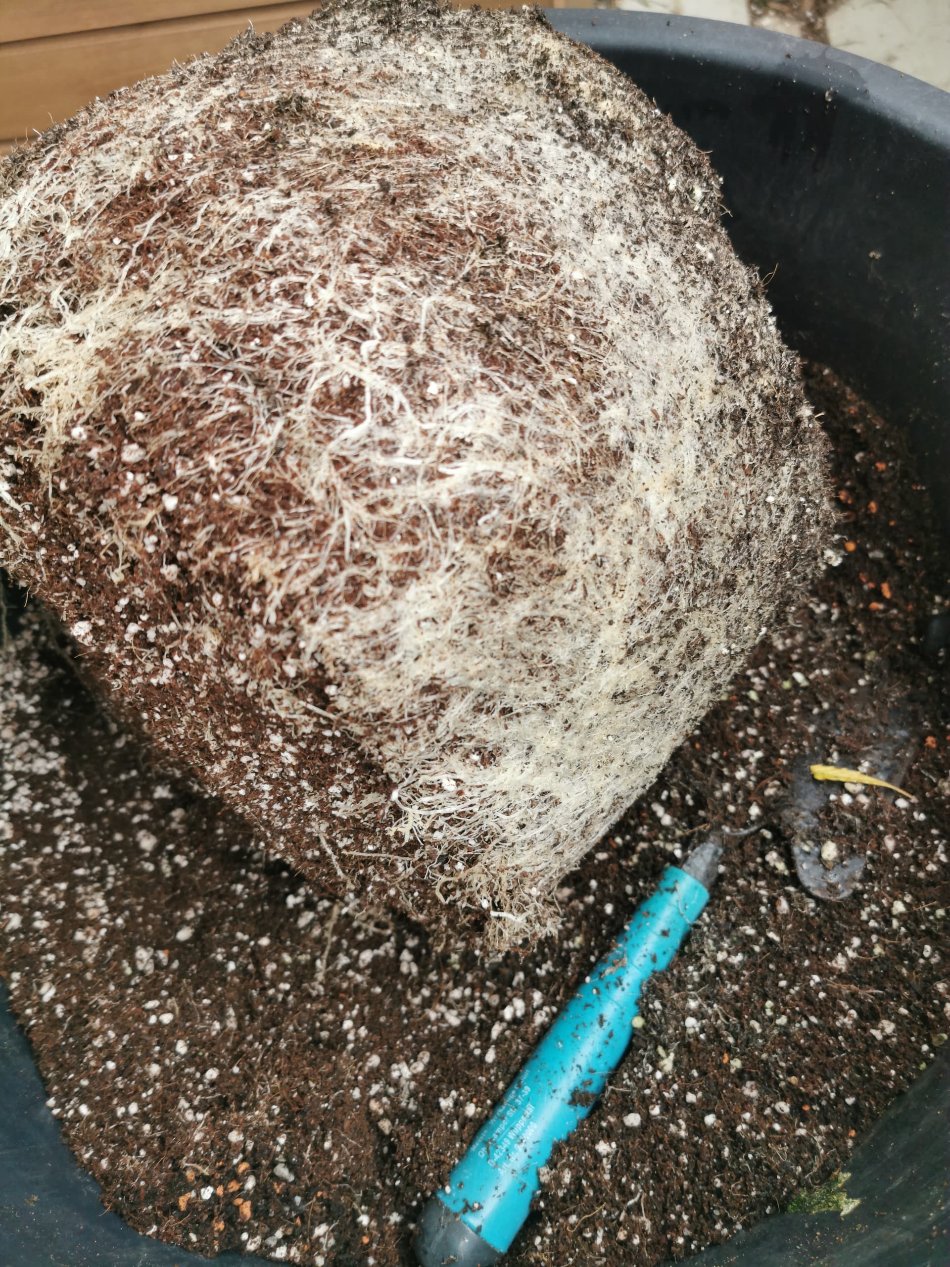 Vom Gefühl ist der Ballen in der Mitte weniger stark durchwurzelt, als an den Seiten. Es gibt kaum dickere Wurzeln, fast alles sieht so aus wie an den Seiten, wenn auch weniger ausgeprägt.