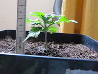 die Pflänzchen wachsen und gedeihen ganz gut vor sich hin. Nach 6 Tagen habe ich sie wieder gegossen. Für das Gießwasser (ph 6,5) habe ich 5 l Leitungswasser (ph 8,4) mit 1ml Canna Organic-Aid gemischt. Und die Pflanzen wieder von unten gegossen.