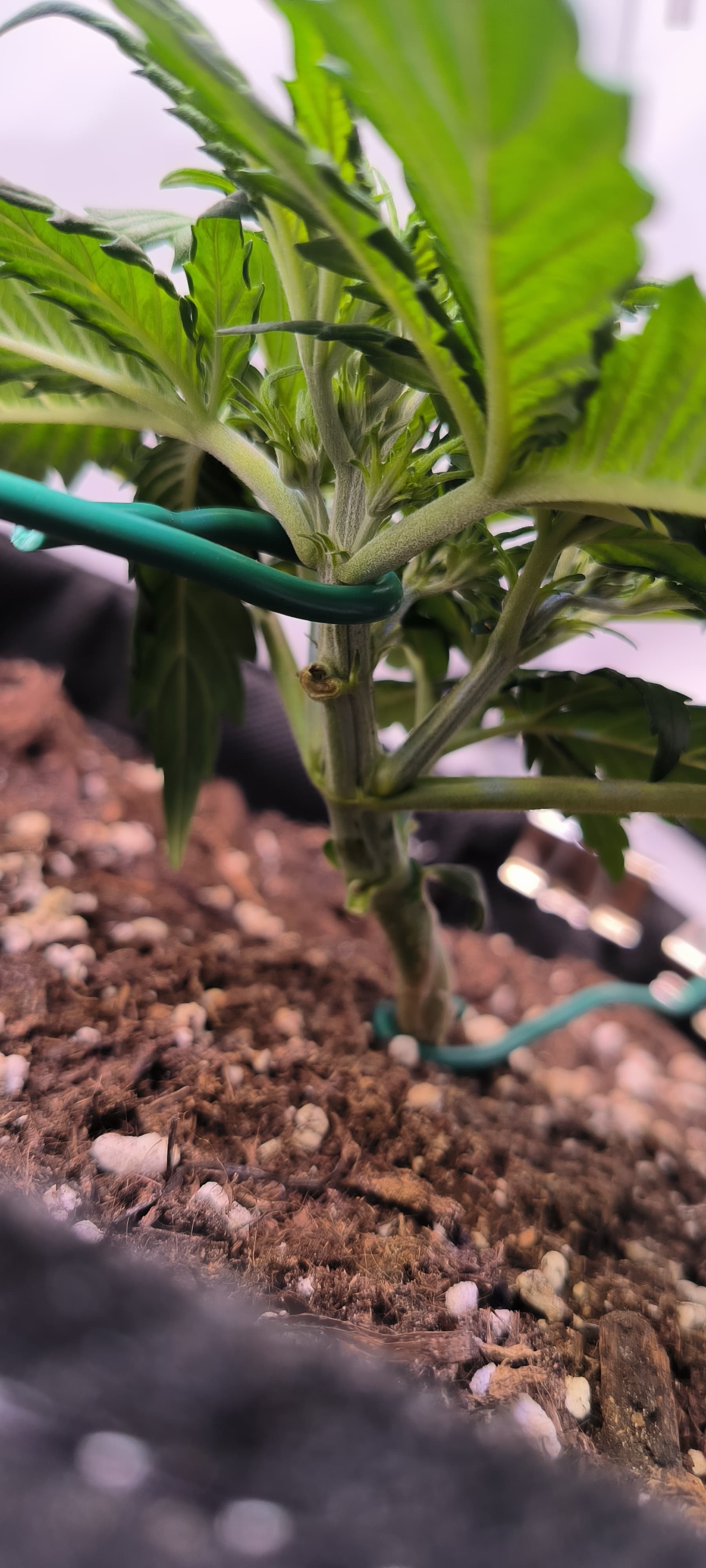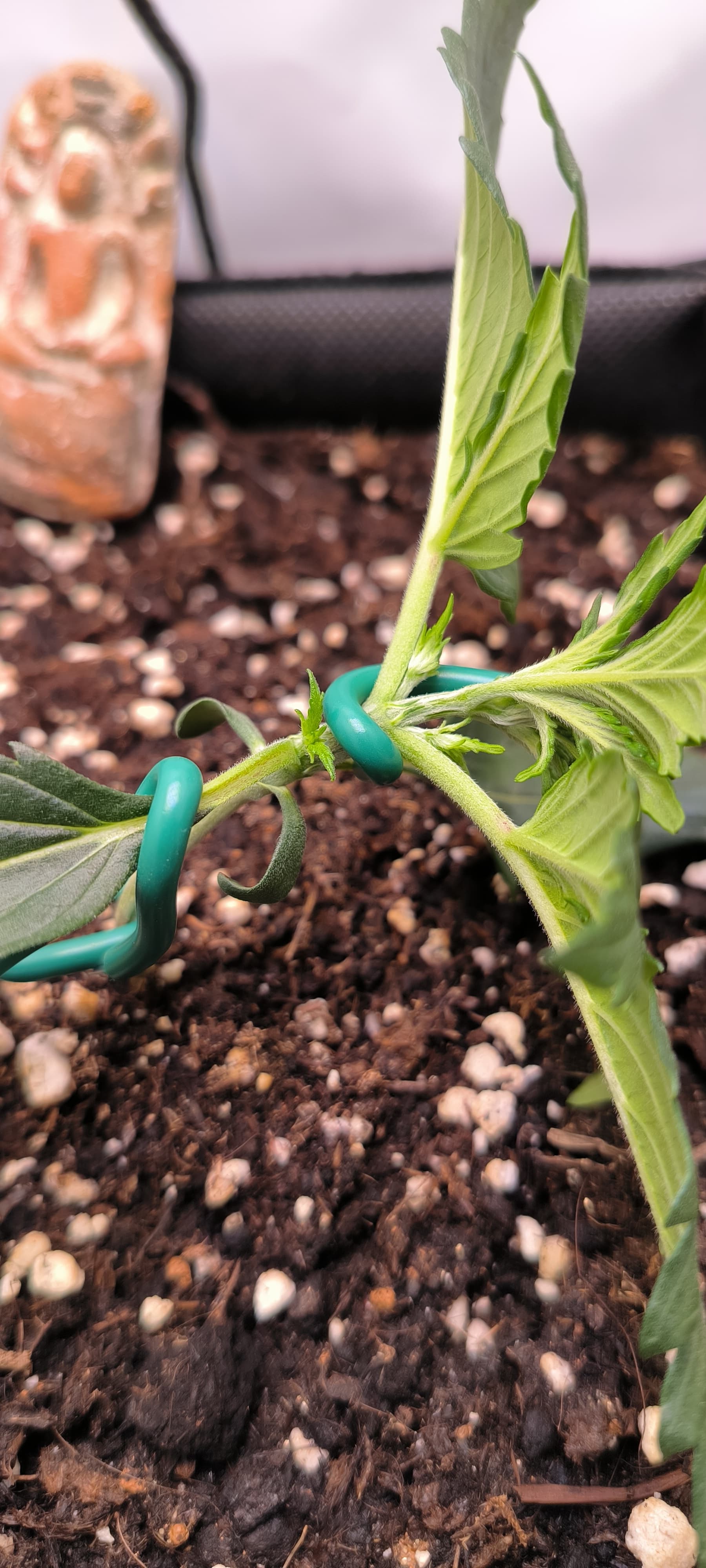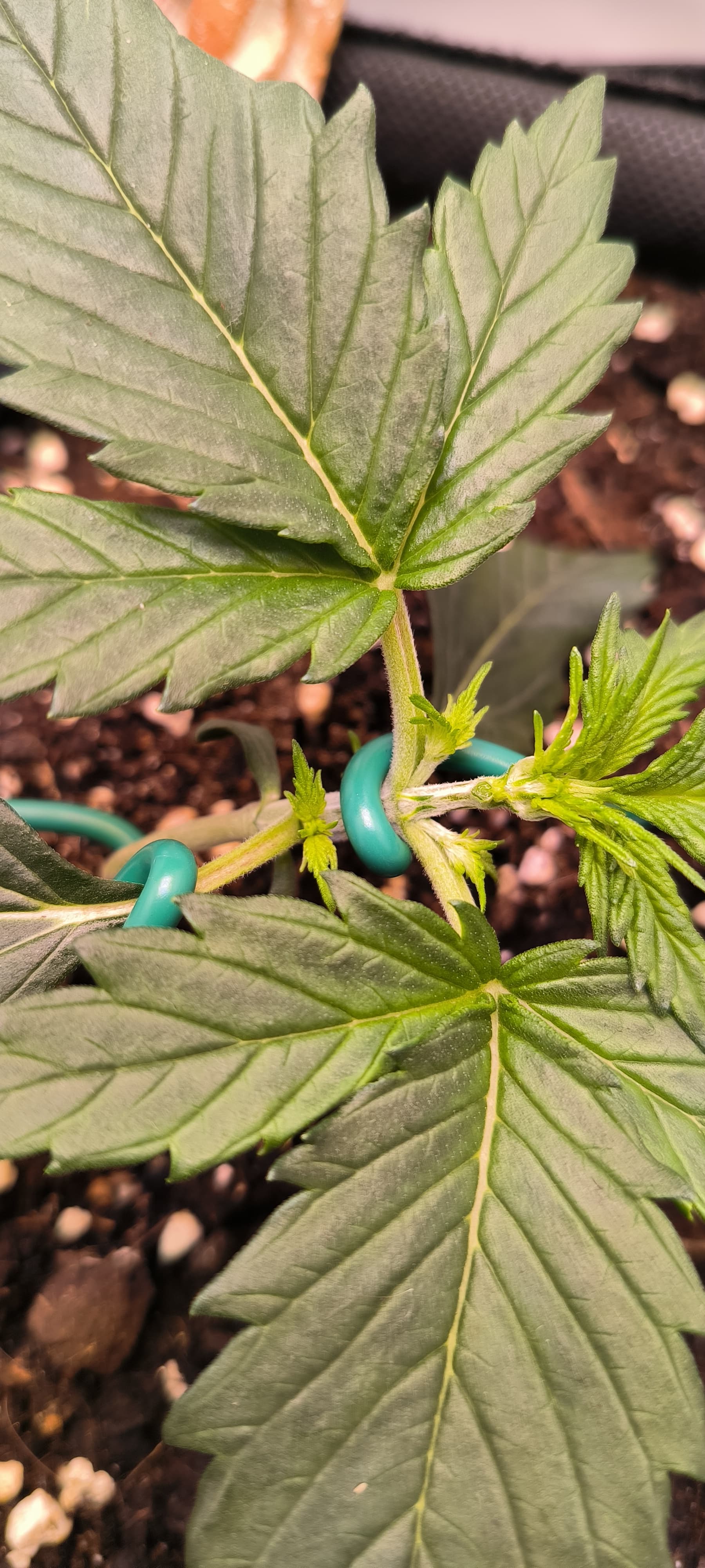 Desweiteren hab ich angefangen die Pflanze zu trainieren. Eines der Blätter musste weichen um den Lichteinfall für die Seitentriebe zu gewährleisten.