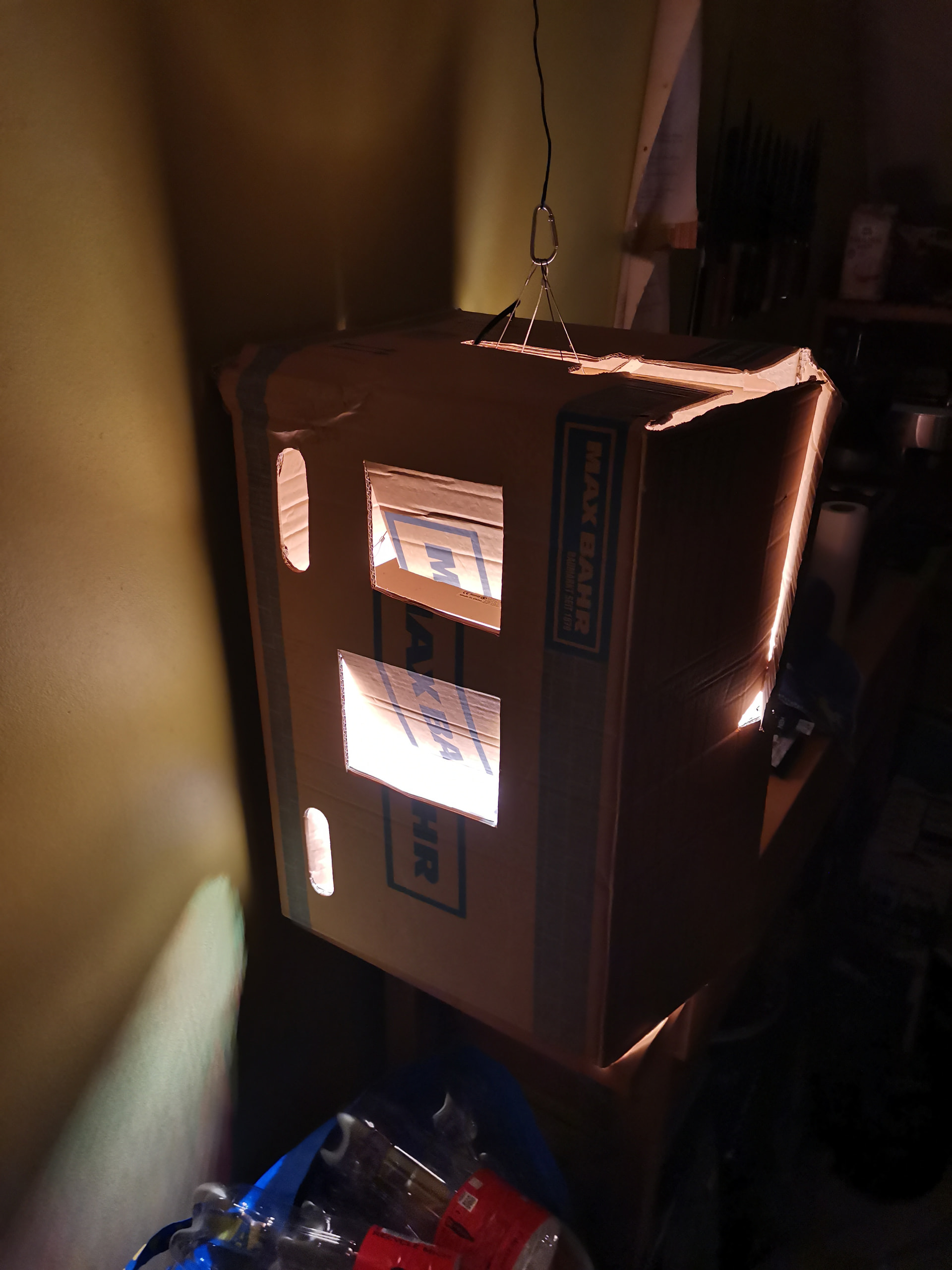 So, heute sind die drei Damen in die Erde gewandert. Wobei ich Zweien nicht ganz traue, da sie 2 Tage im Zewa keinerlei Veränderung zeigten. Ich habe also vorsorglich noch drei Dosdos33 ins Wasser geworfen. Wenn die jetzt alle ploppen, dann isses halt blöd. Aber was solls, will diesmal mit 3 gleich alten Pflanzen starten. Da ich meine kleine Anzuchtlampe in der Küche habe, weil das Zelt noch mit dem aktuellen grow belegt ist, störte mich das grelle Licht, welches ja nun 24 Std ballert, sehr. Da habe ich mal wieder schnell was gezaubert zum Nulltarif. Seht und staunt.