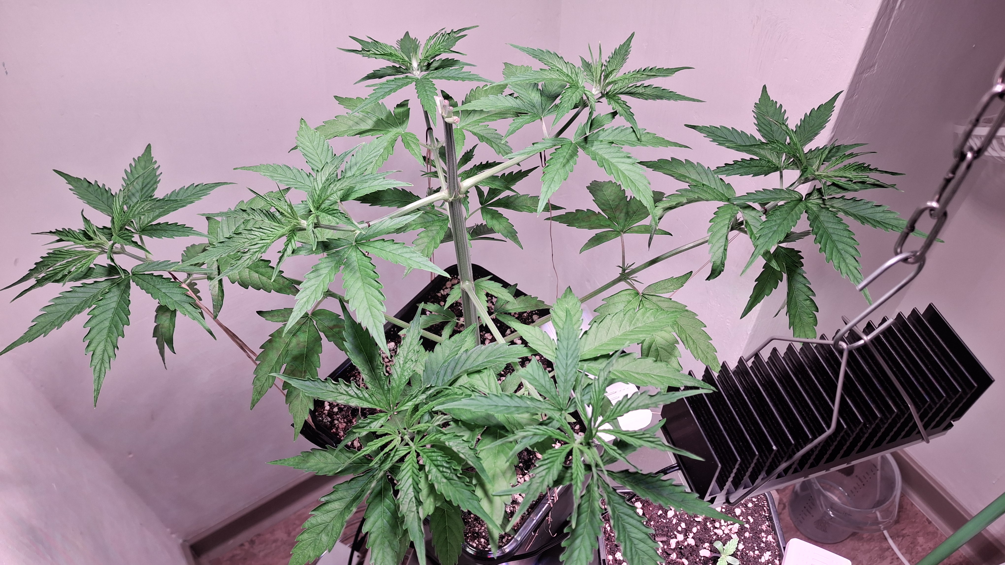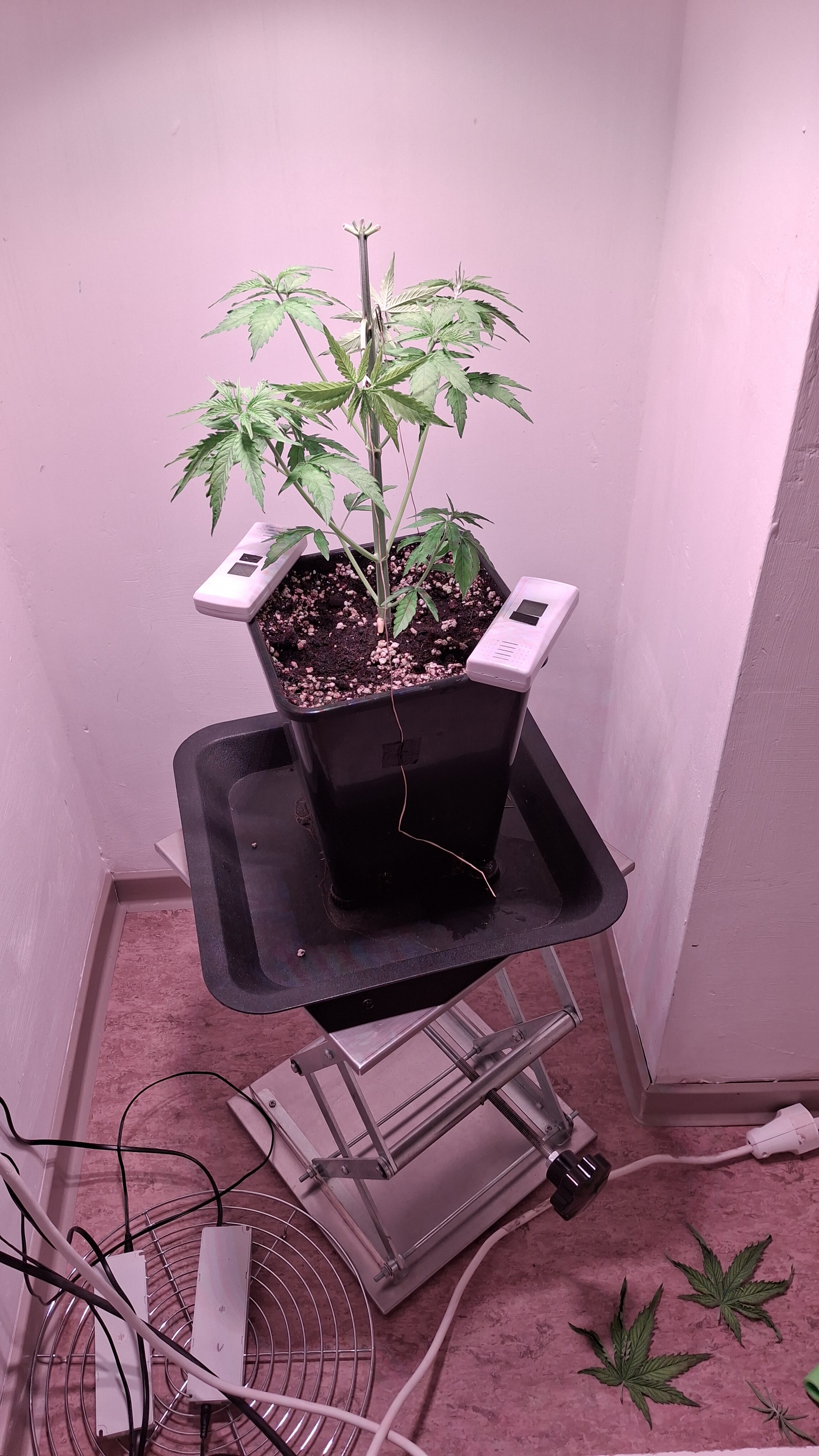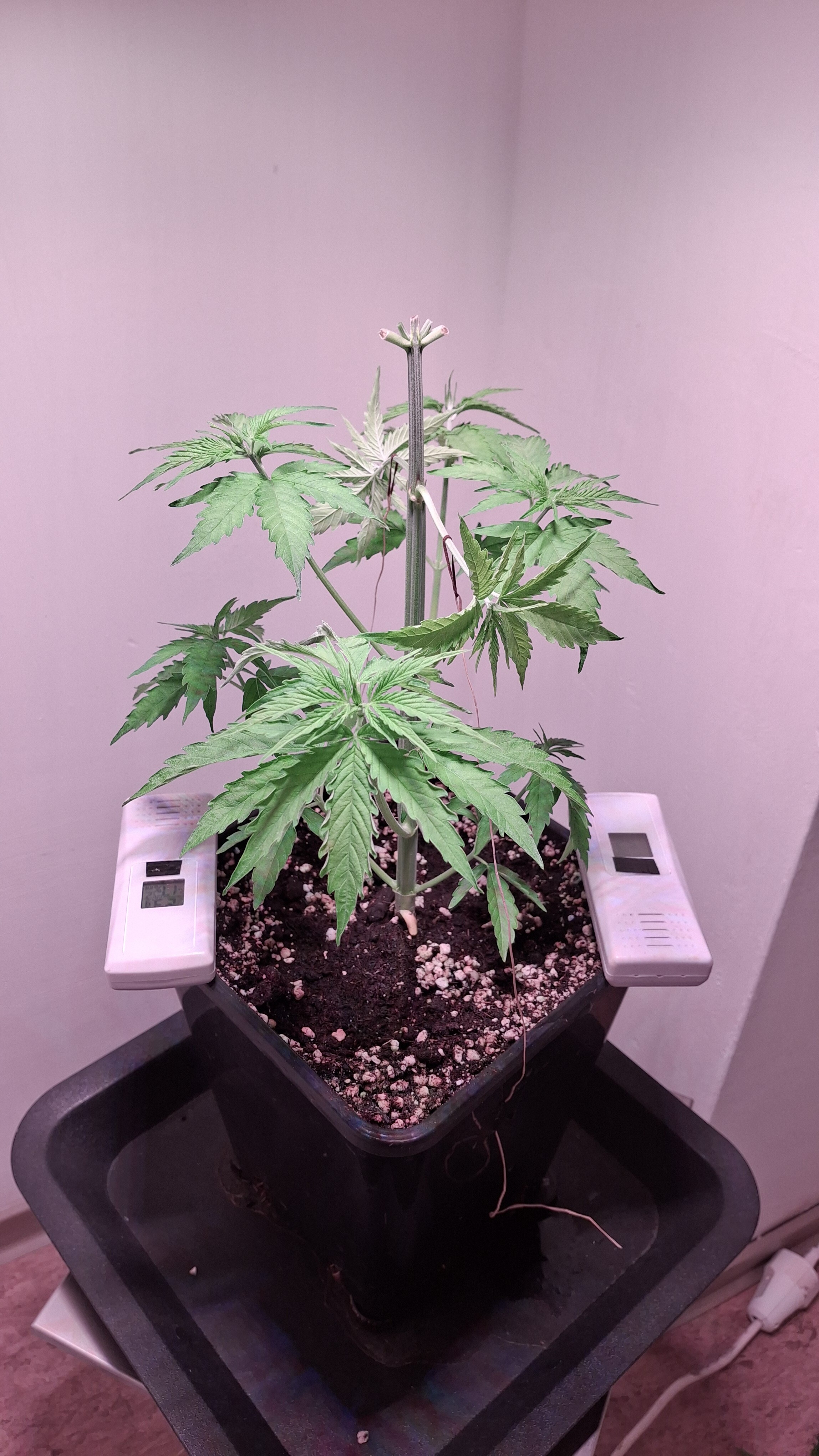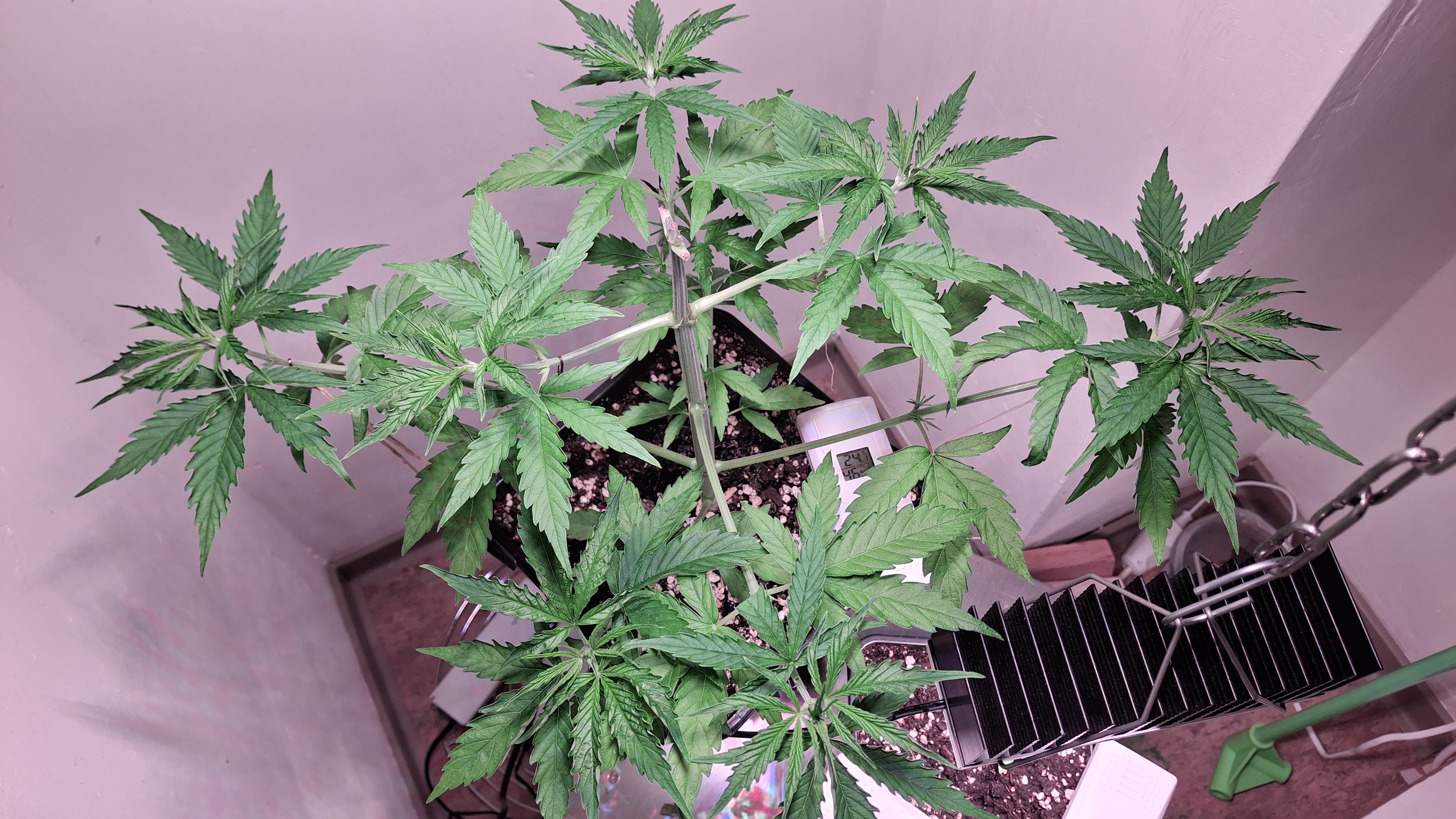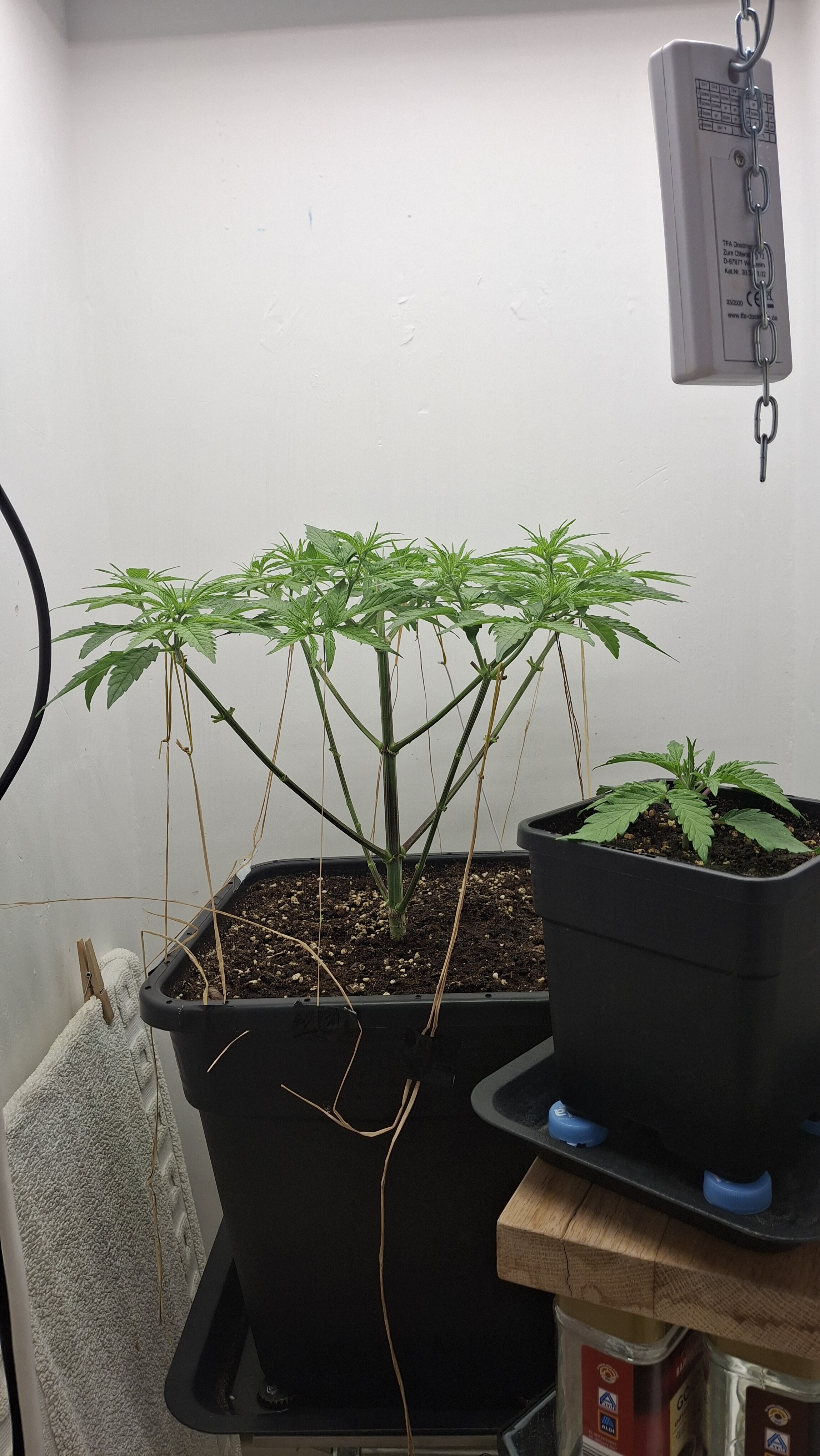 Egal ob’s hilft, das Entlauben war zum richtigen Zeitpunkt. Als Faustformel wird generell landauf- und landab gesagt, dass man 2 Tage vor der Umstellung auf 12/12 entlauben sollte. Das wurde hier gemacht, denn ich schrieb schon, dass sie „eigentlich“ reif für 12/12 wäre. Aber nun muss sie sich noch ein wenig gedulden und so wie sie sich heute präsentiert bin ich entspannt. Sie steht in korrekter Erde die ordentlich (bis 6 Wochen) vorgedüngt ist und vielleicht wird sie ja noch ein Selbstläufer. Fakt ist aber auch, dass die RLF doch etwas angehoben wurde. Hier krabbels Hygro auf 50 % im Wohnraum und 48 % im Bunker. Das steigert sich noch etwas. Es ist immer noch „hart am Wind gesegelt“, aber immerhin besser als 42-45 %.