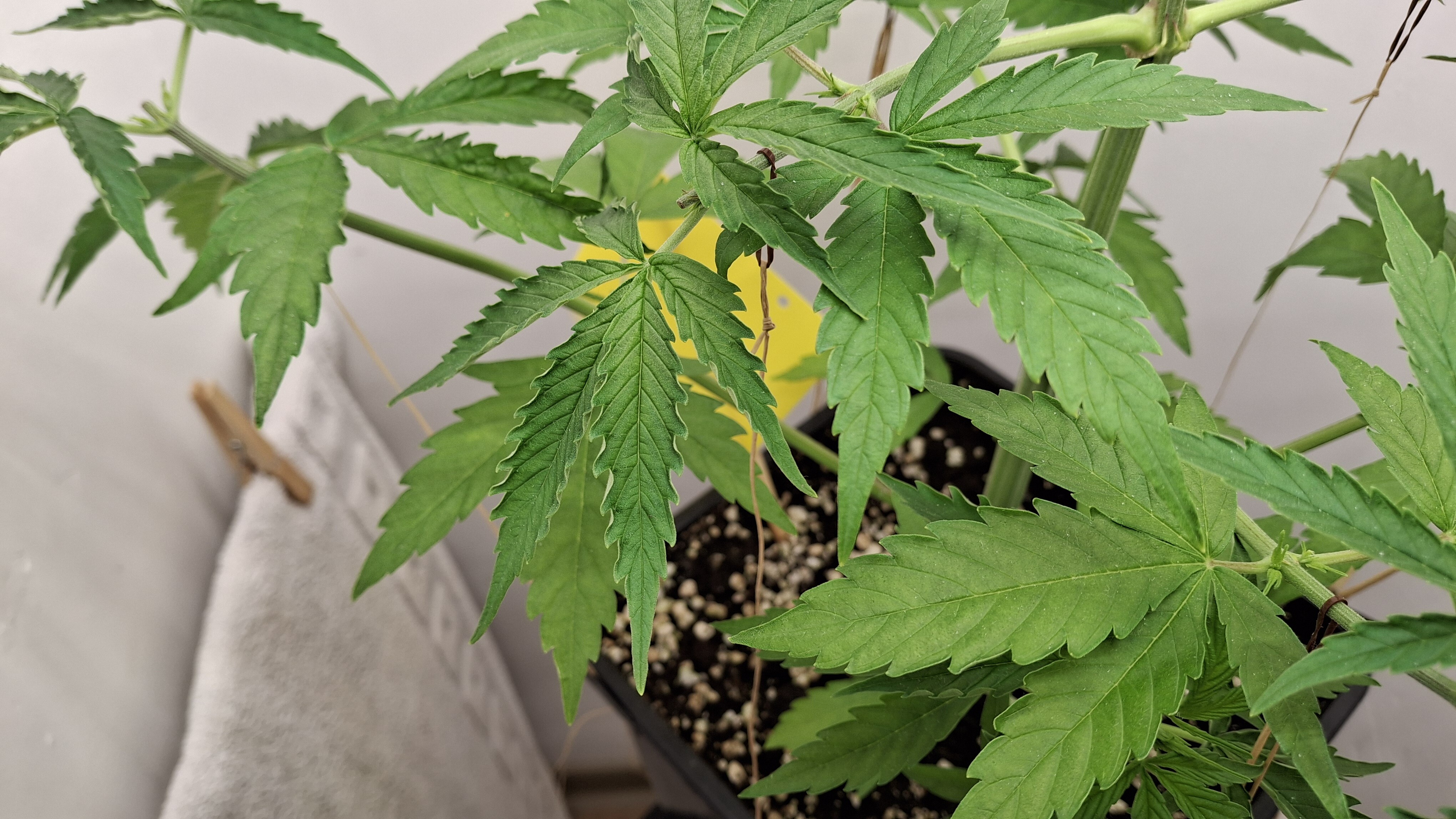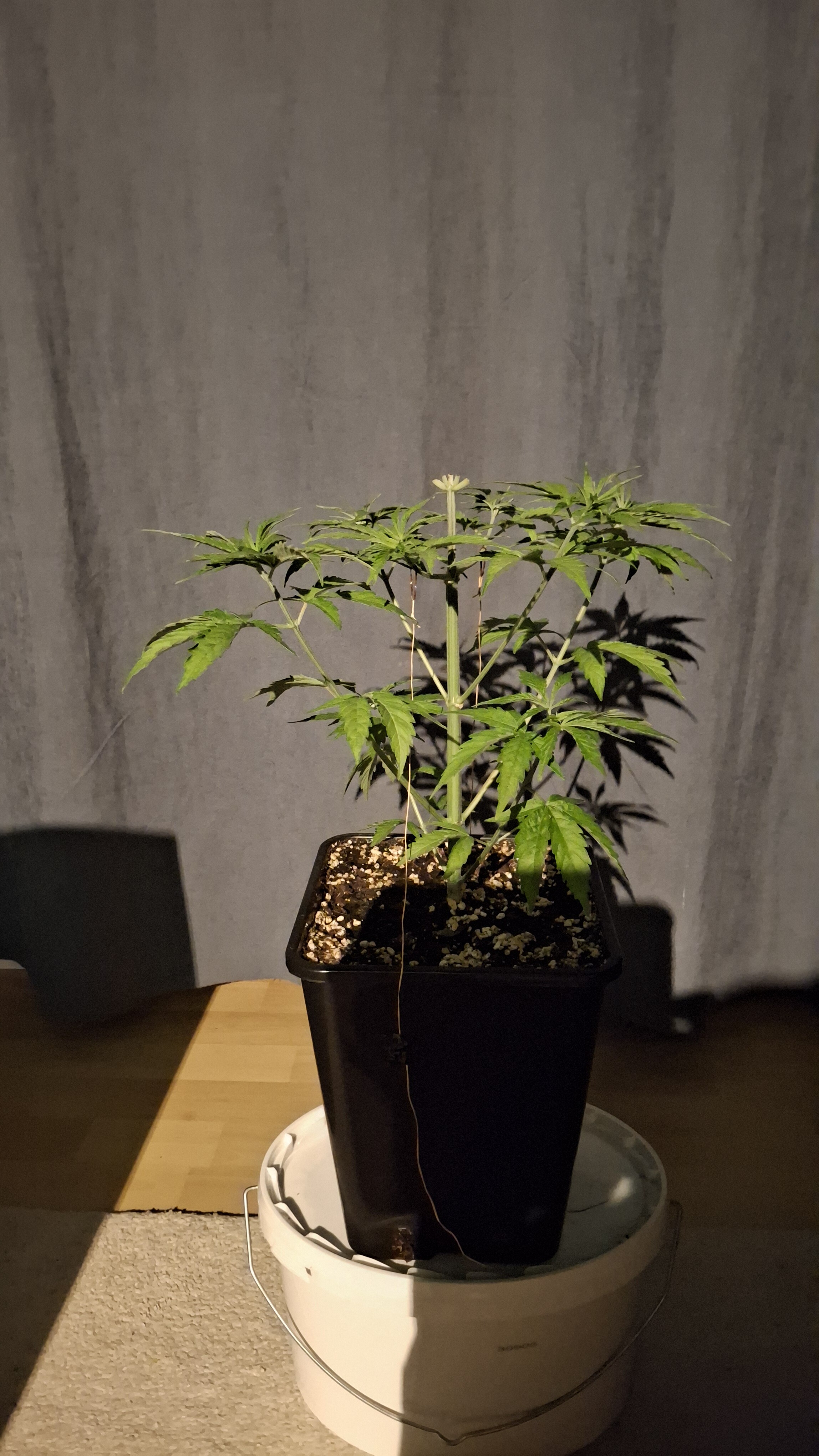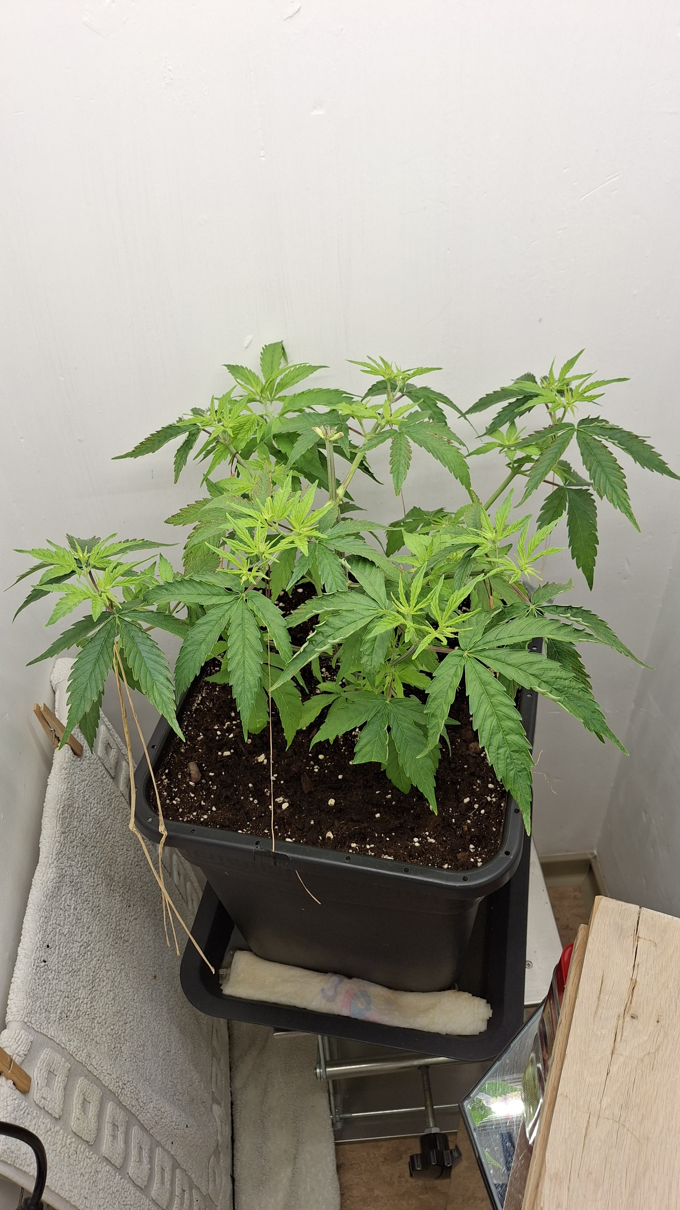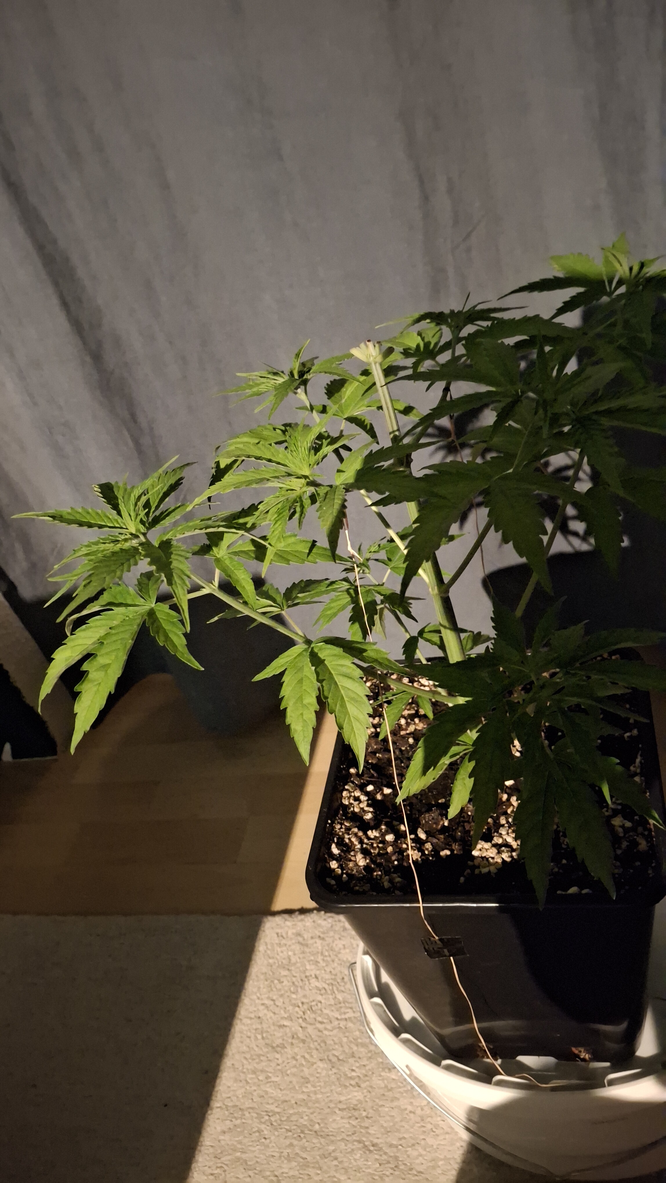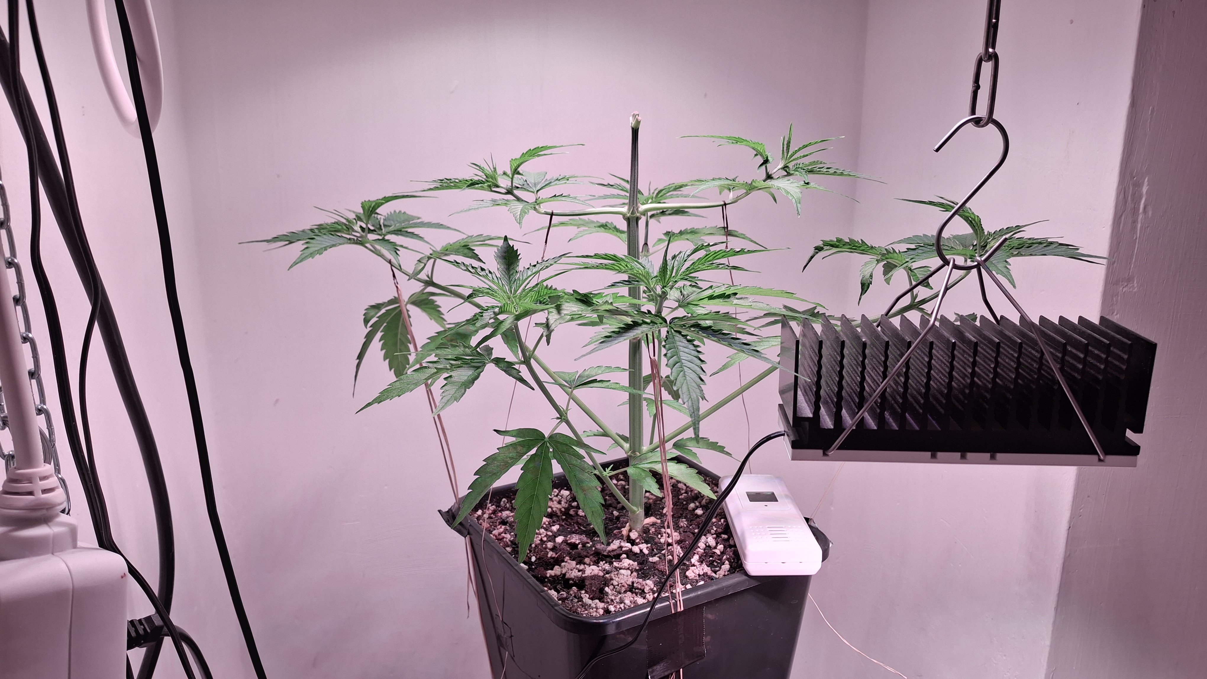 Egal ob’s hilft, das Entlauben war zum richtigen Zeitpunkt. Als Faustformel wird generell landauf- und landab gesagt, dass man 2 Tage vor der Umstellung auf 12/12 entlauben sollte. Das wurde hier gemacht, denn ich schrieb schon, dass sie „eigentlich“ reif für 12/12 wäre. Aber nun muss sie sich noch ein wenig gedulden und so wie sie sich heute präsentiert bin ich entspannt. Sie steht in korrekter Erde die ordentlich (bis 6 Wochen) vorgedüngt ist und vielleicht wird sie ja noch ein Selbstläufer. Fakt ist aber auch, dass die RLF doch etwas angehoben wurde. Hier krabbels Hygro auf 50 % im Wohnraum und 48 % im Bunker. Das steigert sich noch etwas. Es ist immer noch „hart am Wind gesegelt“, aber immerhin besser als 42-45 %.