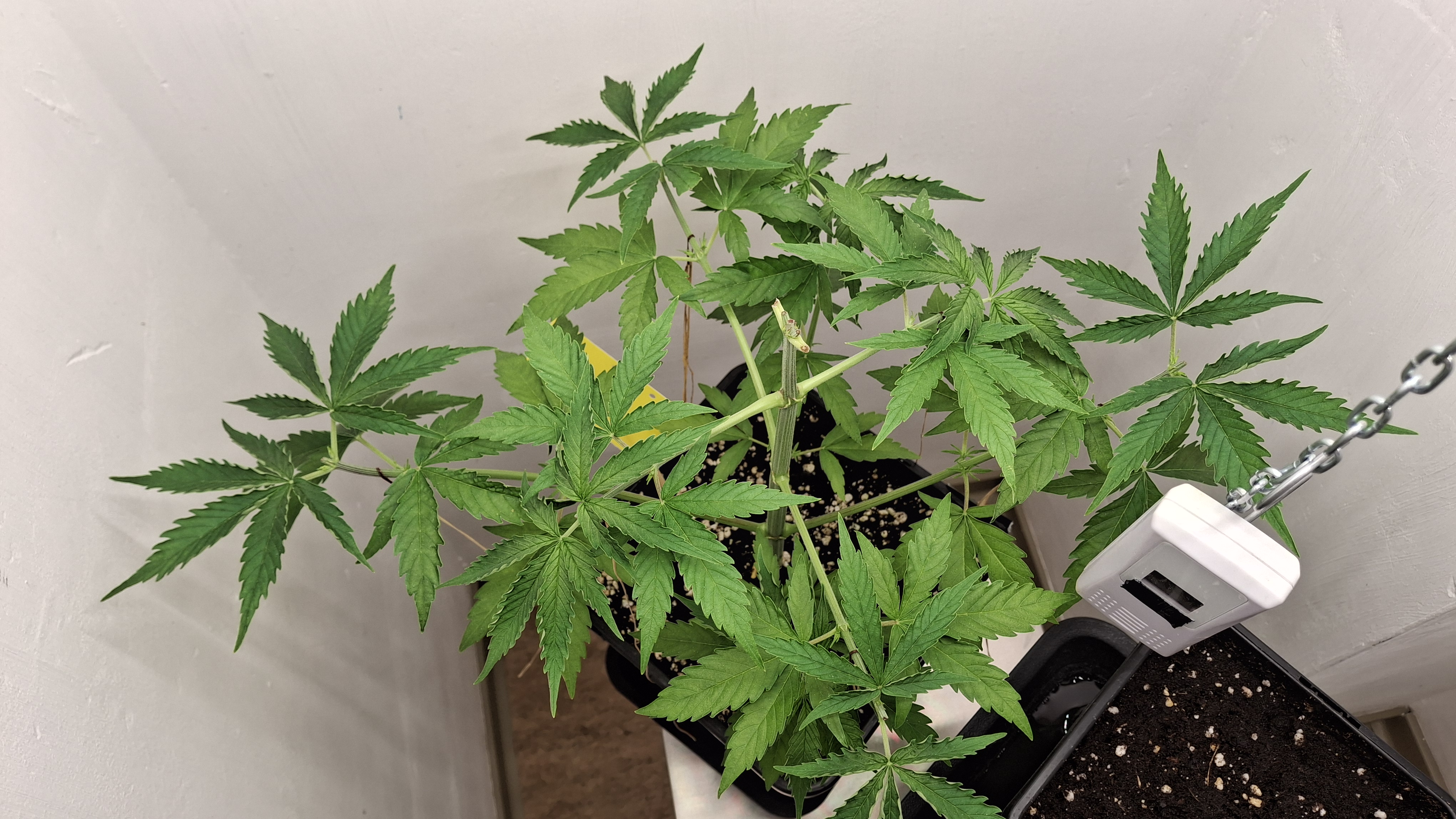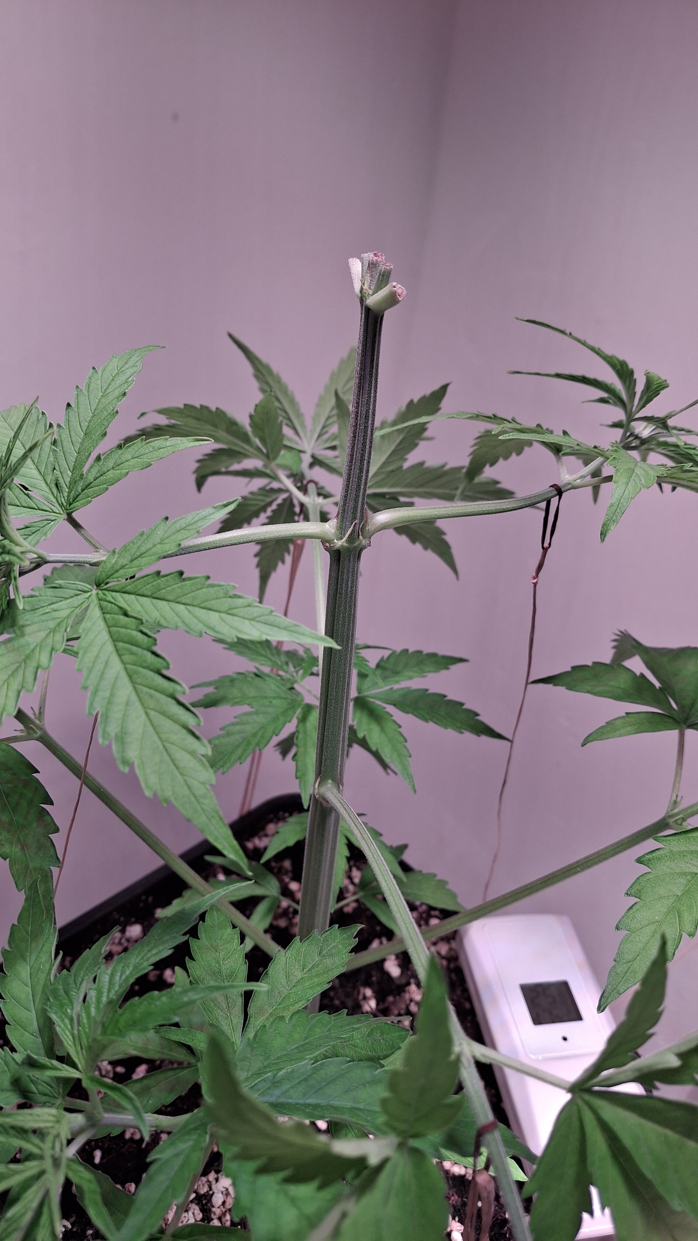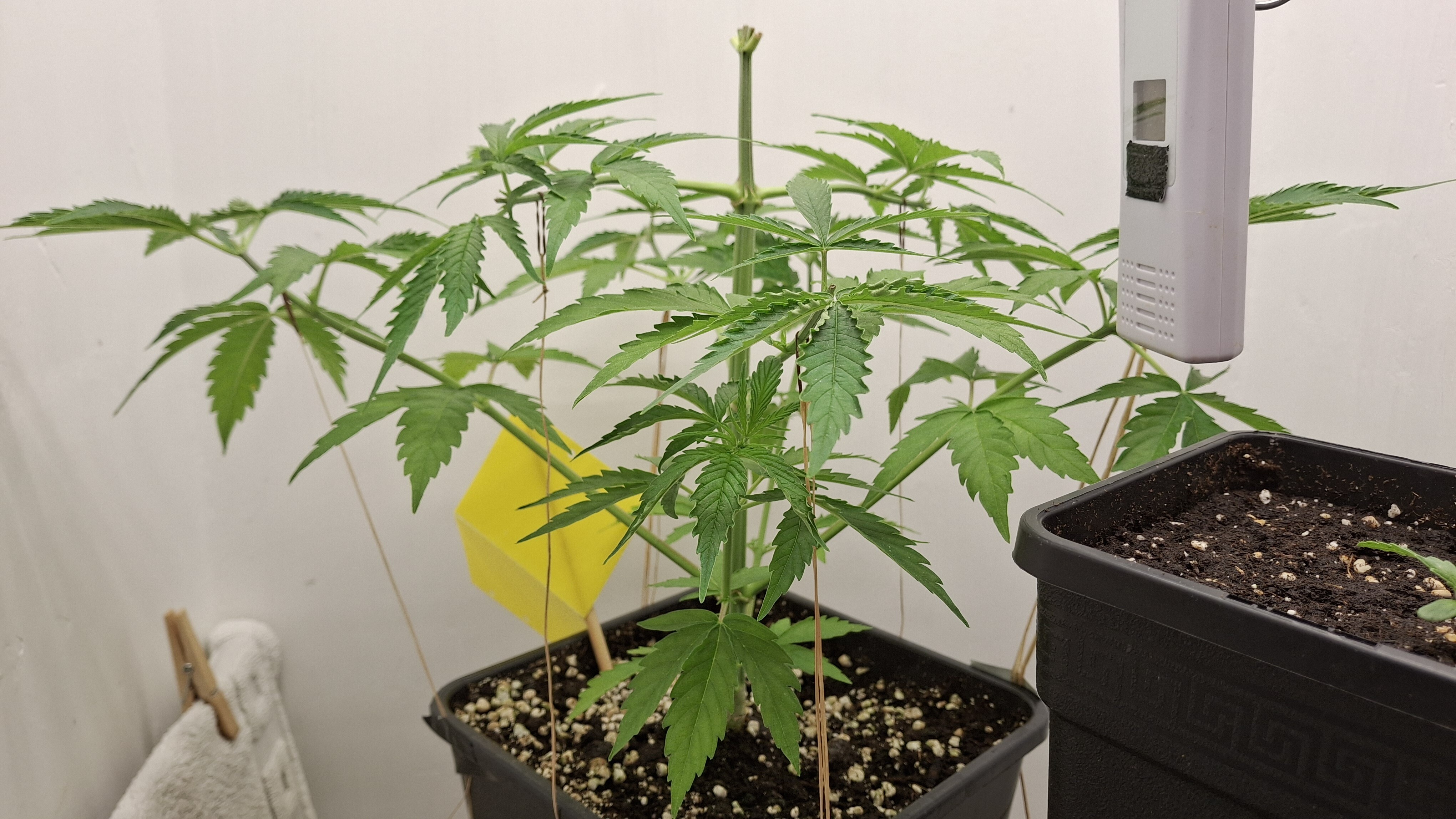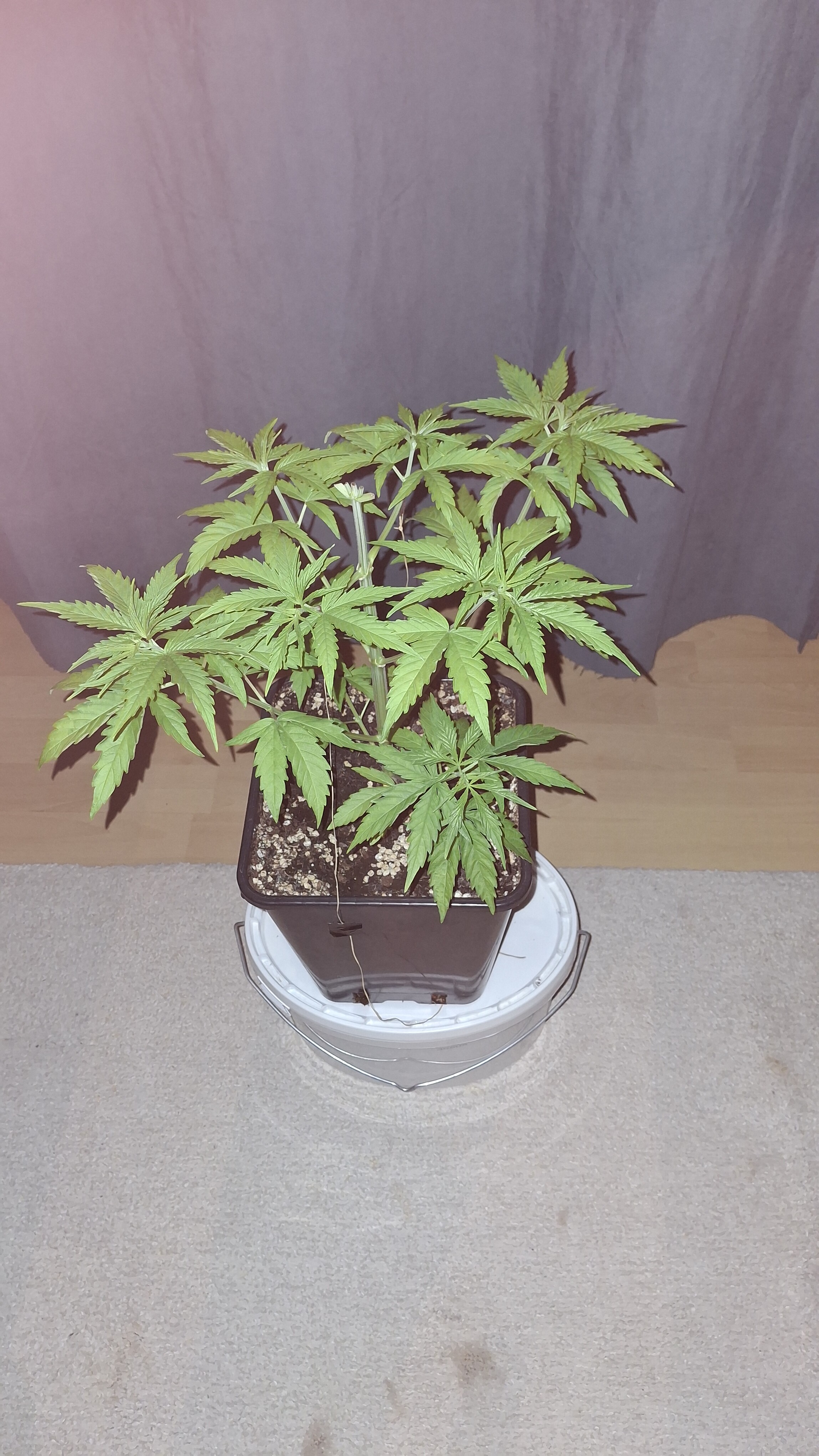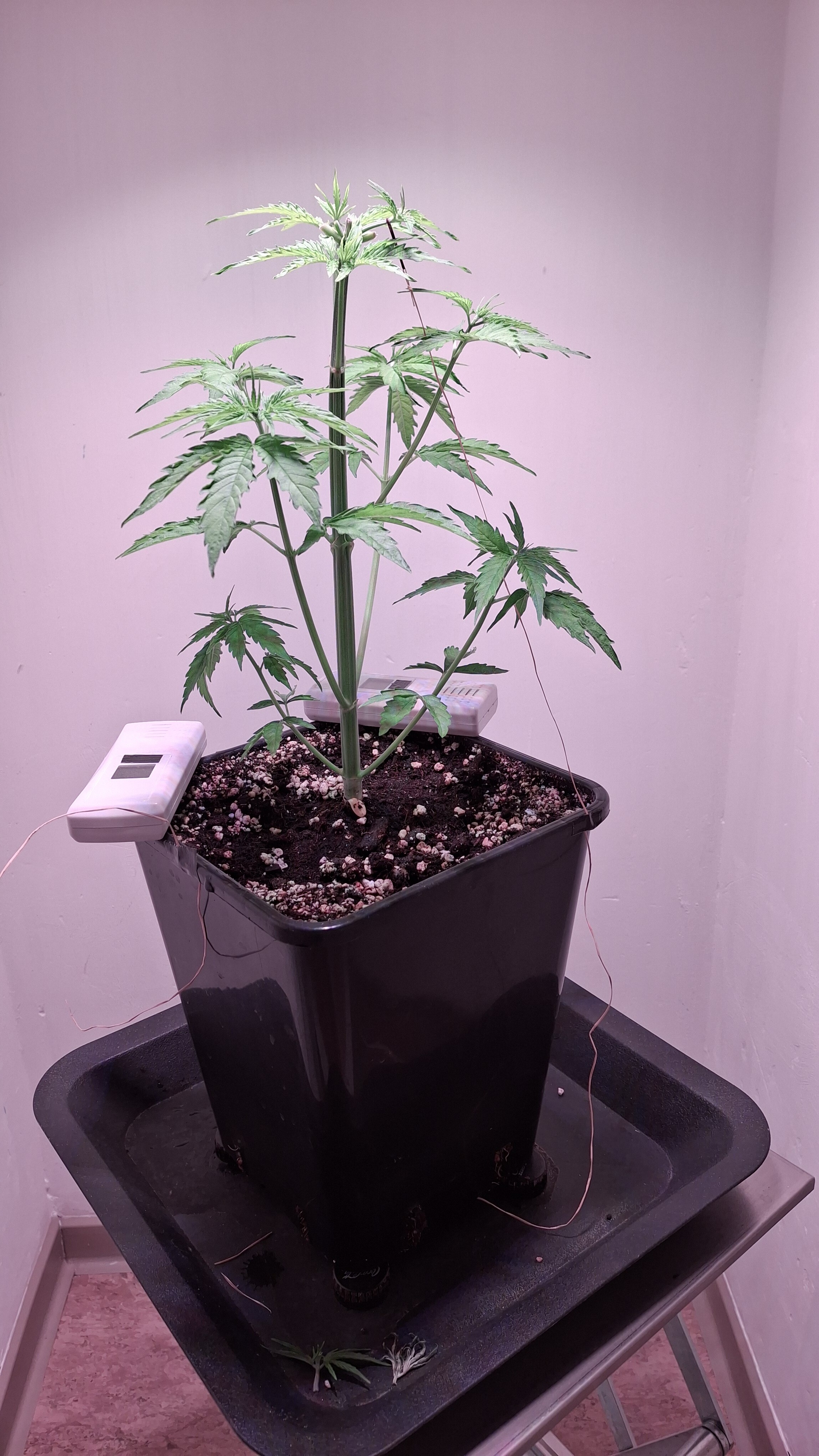 Egal ob’s hilft, das Entlauben war zum richtigen Zeitpunkt. Als Faustformel wird generell landauf- und landab gesagt, dass man 2 Tage vor der Umstellung auf 12/12 entlauben sollte. Das wurde hier gemacht, denn ich schrieb schon, dass sie „eigentlich“ reif für 12/12 wäre. Aber nun muss sie sich noch ein wenig gedulden und so wie sie sich heute präsentiert bin ich entspannt. Sie steht in korrekter Erde die ordentlich (bis 6 Wochen) vorgedüngt ist und vielleicht wird sie ja noch ein Selbstläufer. Fakt ist aber auch, dass die RLF doch etwas angehoben wurde. Hier krabbels Hygro auf 50 % im Wohnraum und 48 % im Bunker. Das steigert sich noch etwas. Es ist immer noch „hart am Wind gesegelt“, aber immerhin besser als 42-45 %.