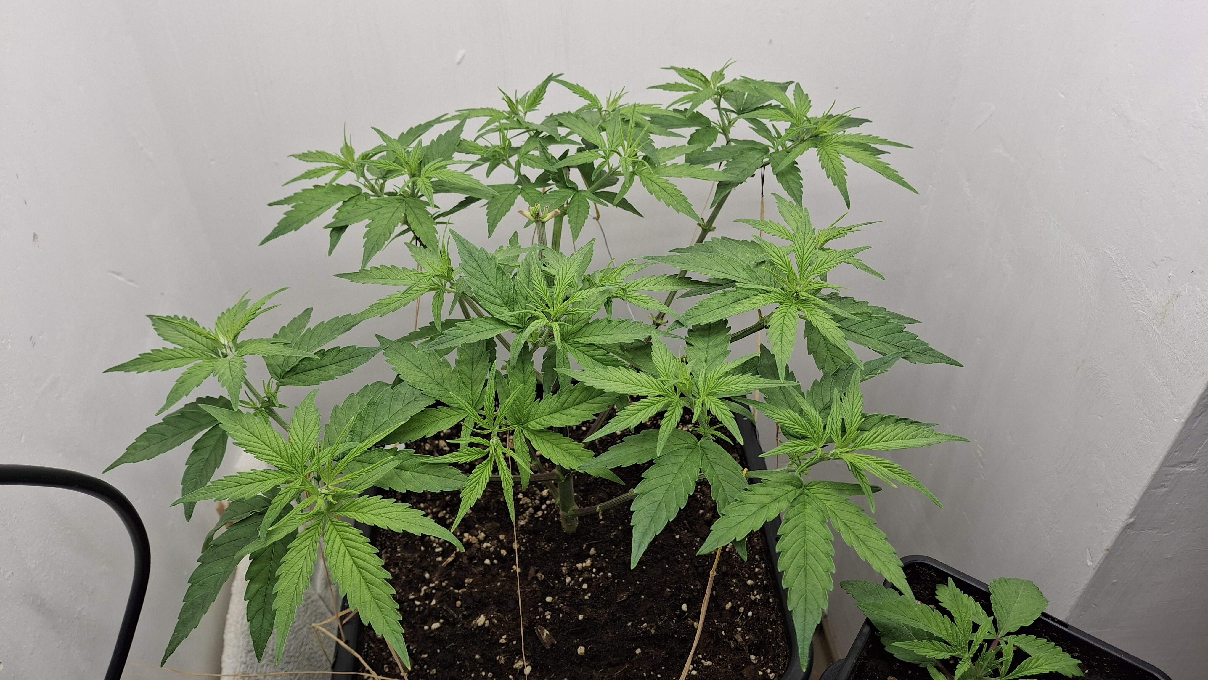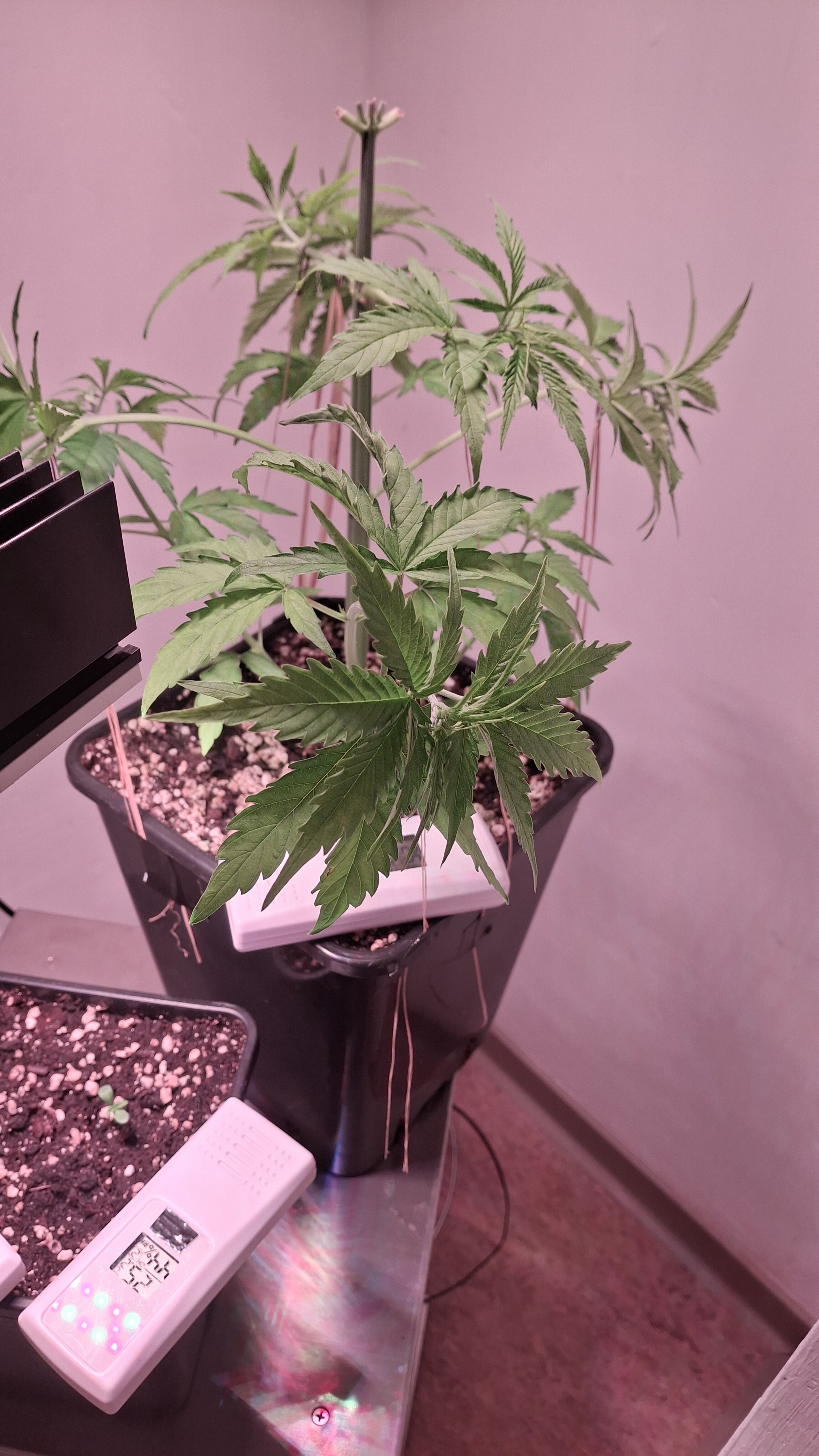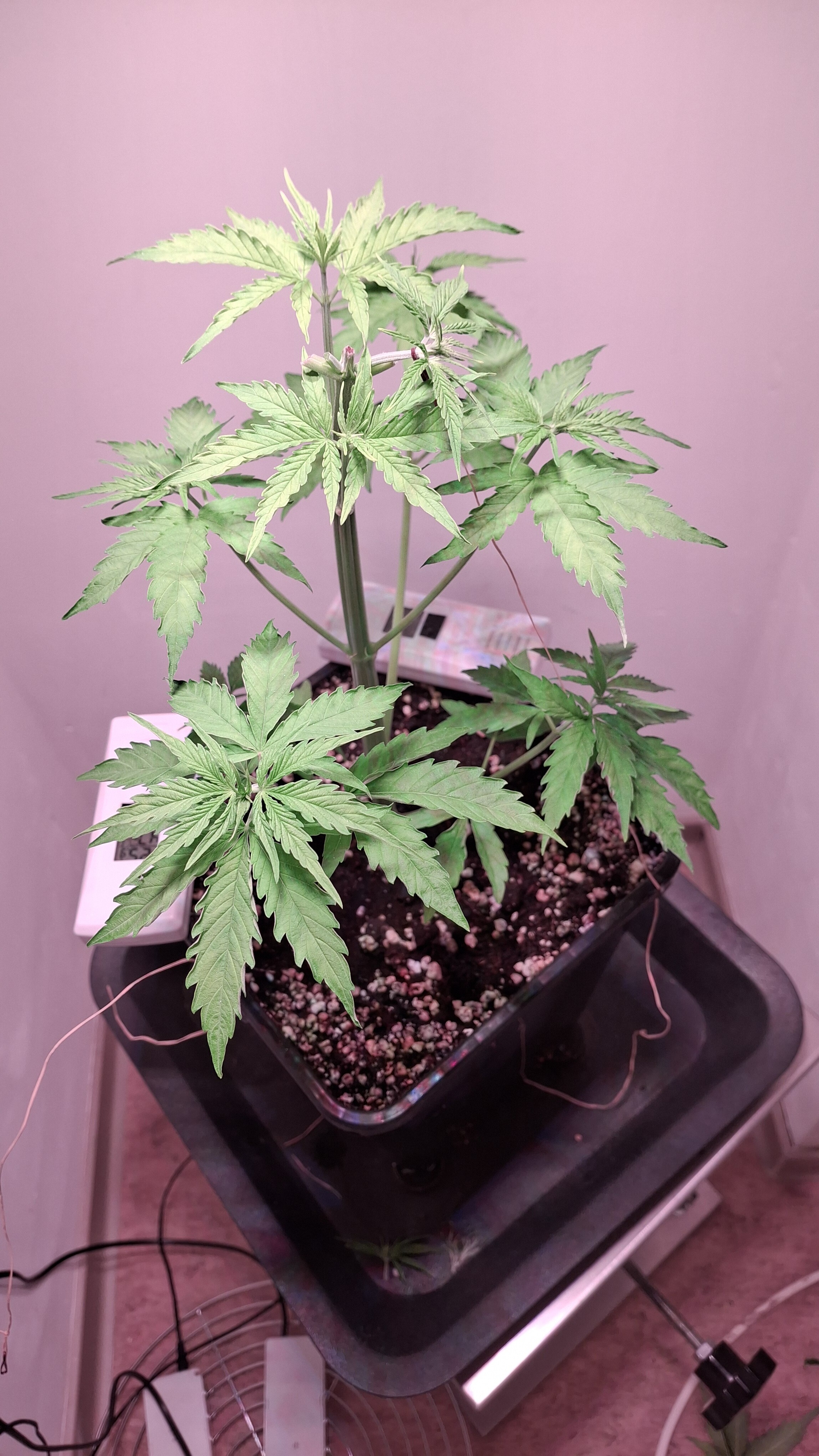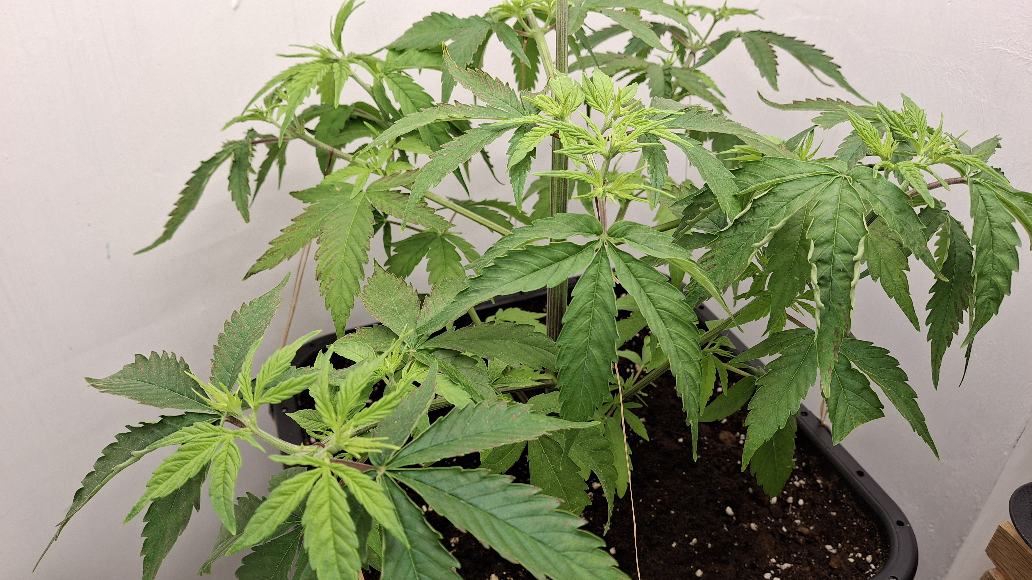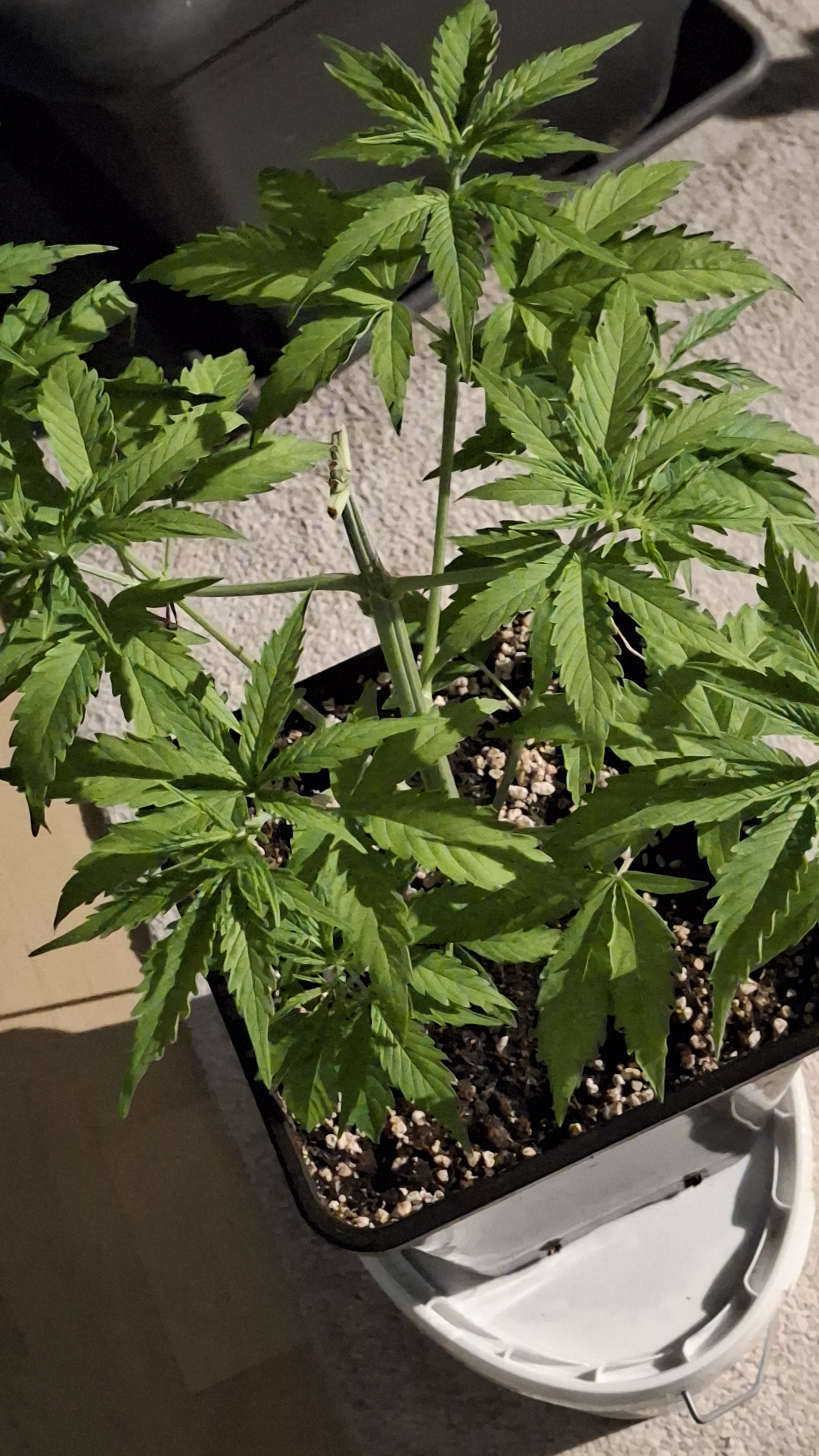 Egal ob’s hilft, das Entlauben war zum richtigen Zeitpunkt. Als Faustformel wird generell landauf- und landab gesagt, dass man 2 Tage vor der Umstellung auf 12/12 entlauben sollte. Das wurde hier gemacht, denn ich schrieb schon, dass sie „eigentlich“ reif für 12/12 wäre. Aber nun muss sie sich noch ein wenig gedulden und so wie sie sich heute präsentiert bin ich entspannt. Sie steht in korrekter Erde die ordentlich (bis 6 Wochen) vorgedüngt ist und vielleicht wird sie ja noch ein Selbstläufer. Fakt ist aber auch, dass die RLF doch etwas angehoben wurde. Hier krabbels Hygro auf 50 % im Wohnraum und 48 % im Bunker. Das steigert sich noch etwas. Es ist immer noch „hart am Wind gesegelt“, aber immerhin besser als 42-45 %.