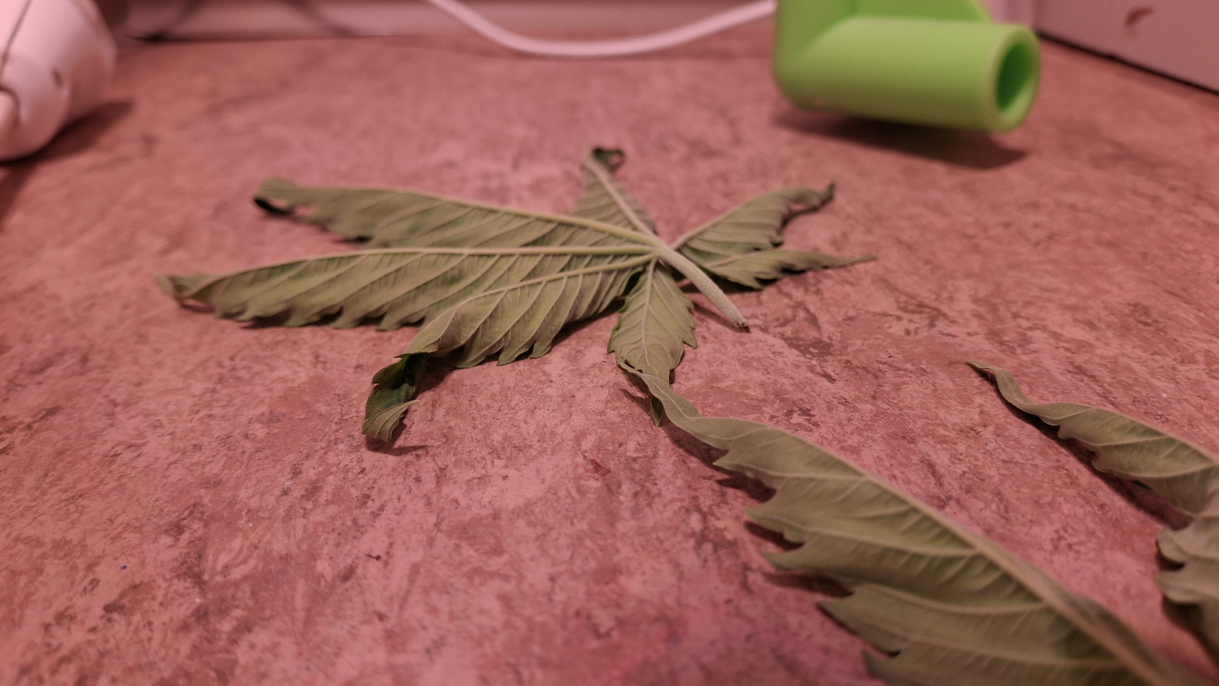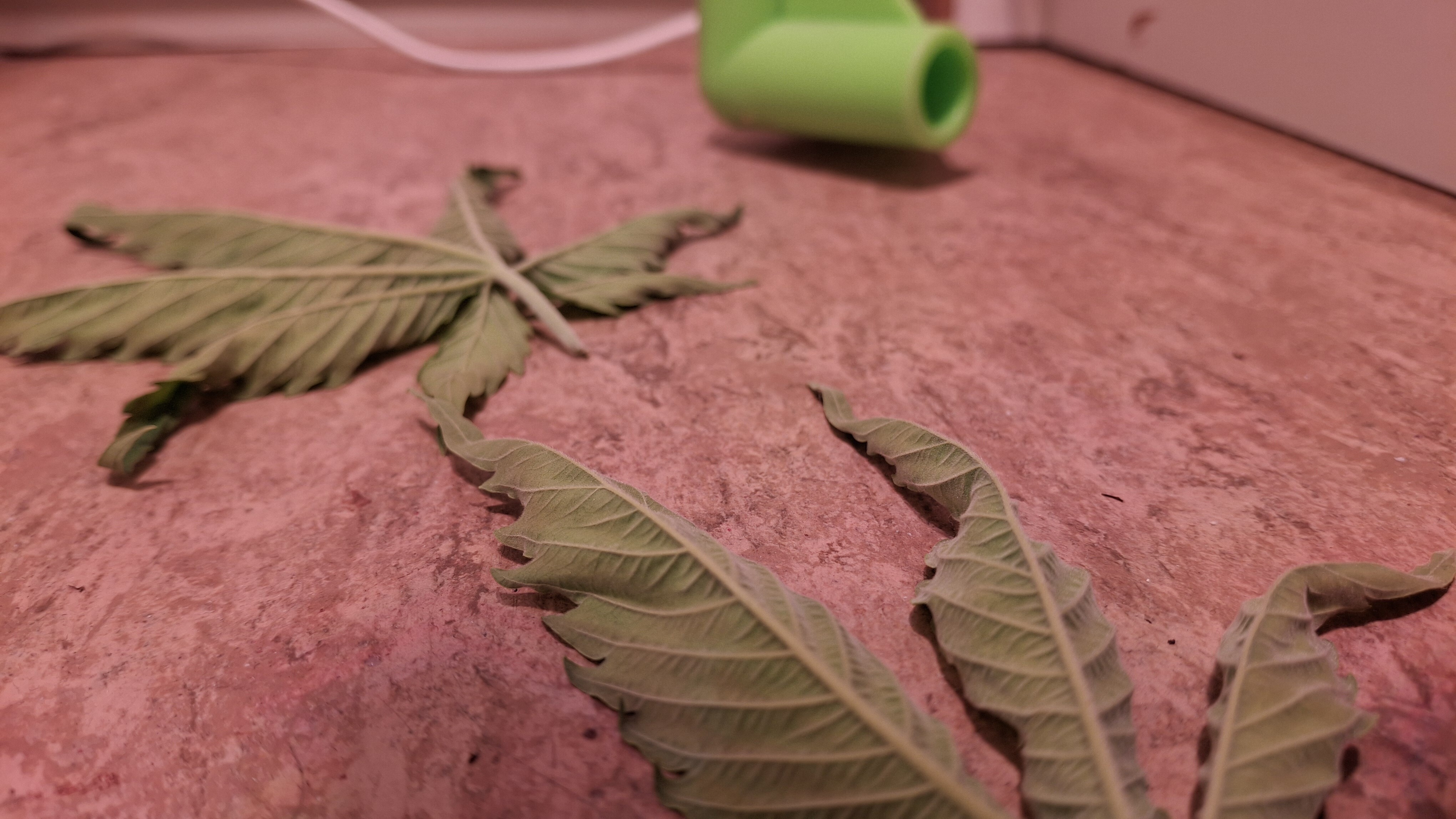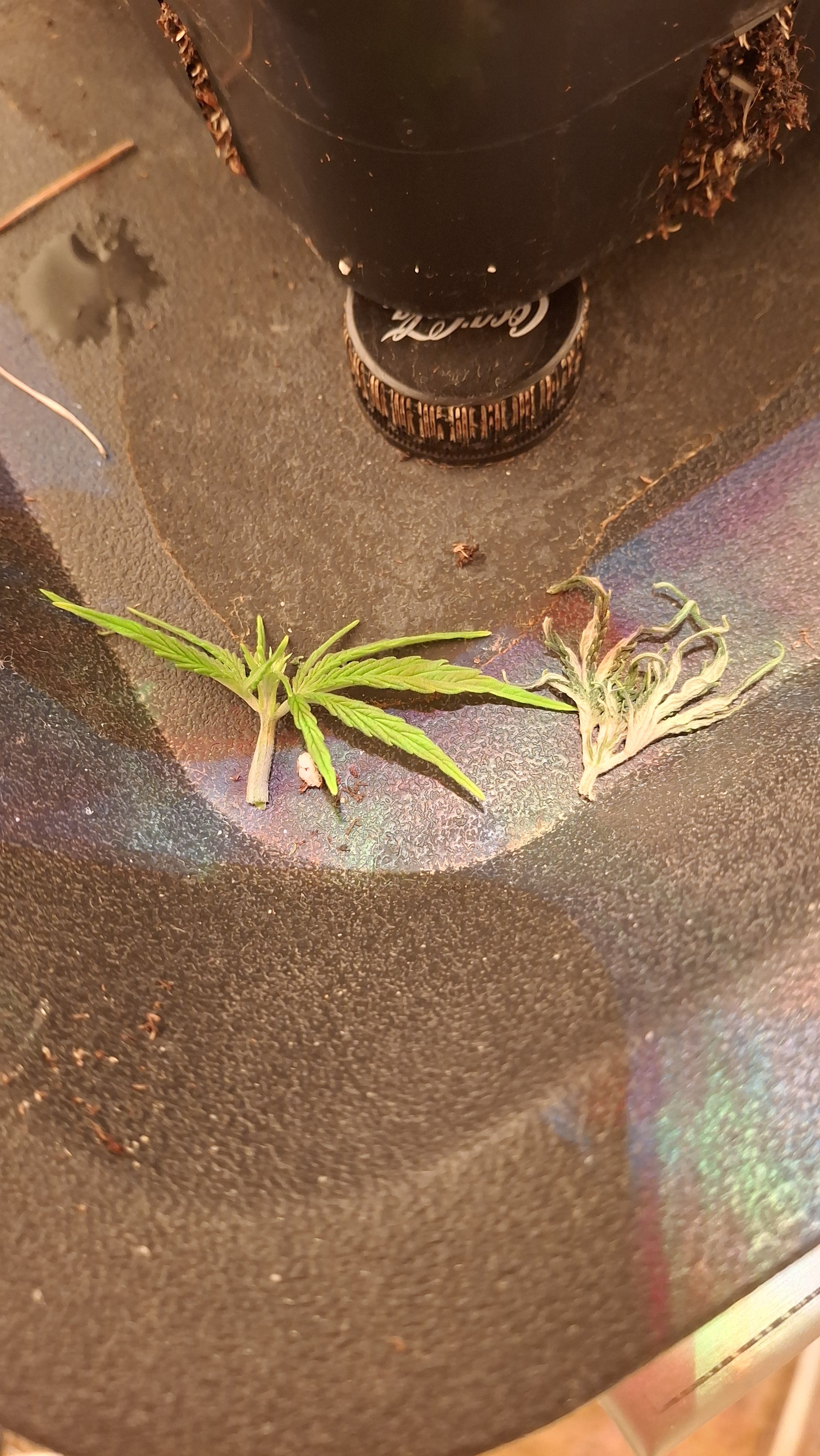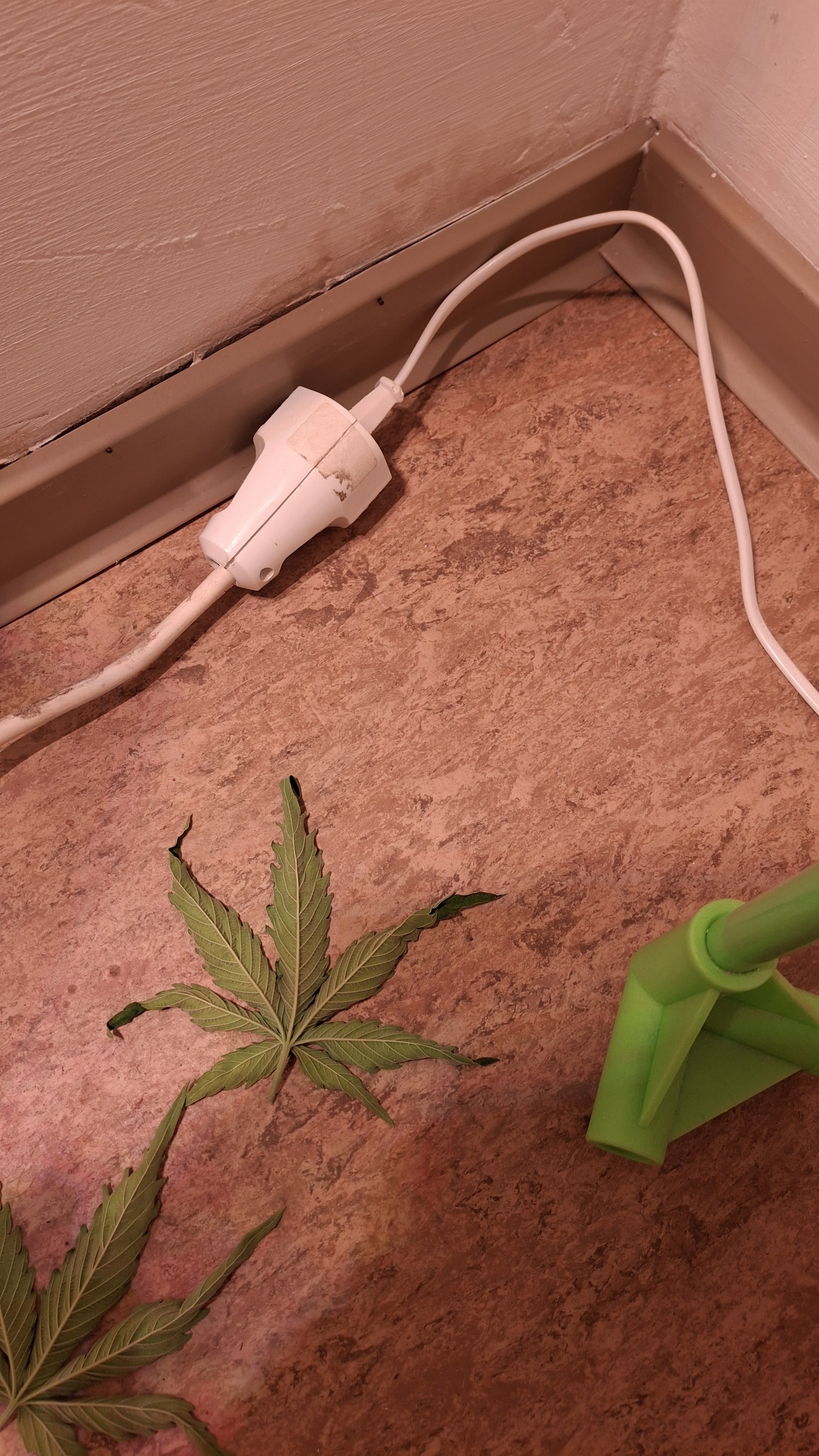 9 Tage ohne Wasser; der Topf täglich schwer wie Blei. Extrem verlangsamter Wuchs und sehr helle Blattfarbe. Sie ist nicht höher ale eine 1 Liter Cola. Die Blätter wellten sich immer noch. Vor 2 Tagen die welligen Blätter abgeschnitten. Die liegen auf dem Boden und sind „immer noch“ relativ frisch. Normalerweise kleben Blätter die man 48 Std. vorher abgeschnitten hat platt am Boden. Man kann ganz gut erkennen, wieviel Spannkraft die beiden Blätter nach 48! Std. noch haben … kein Plan, aber es ist dubios und für mich nicht erklärbar. Genetik!? Muss! Aber i-wie spooky. 9 x Schrott aus 2 verschiedenen Quellen!? Oder ist der Skunk kaputt?! Keine Ahnung. Im nächsten Update sattel ich um auf Oreoz … da läufts gerade normal …