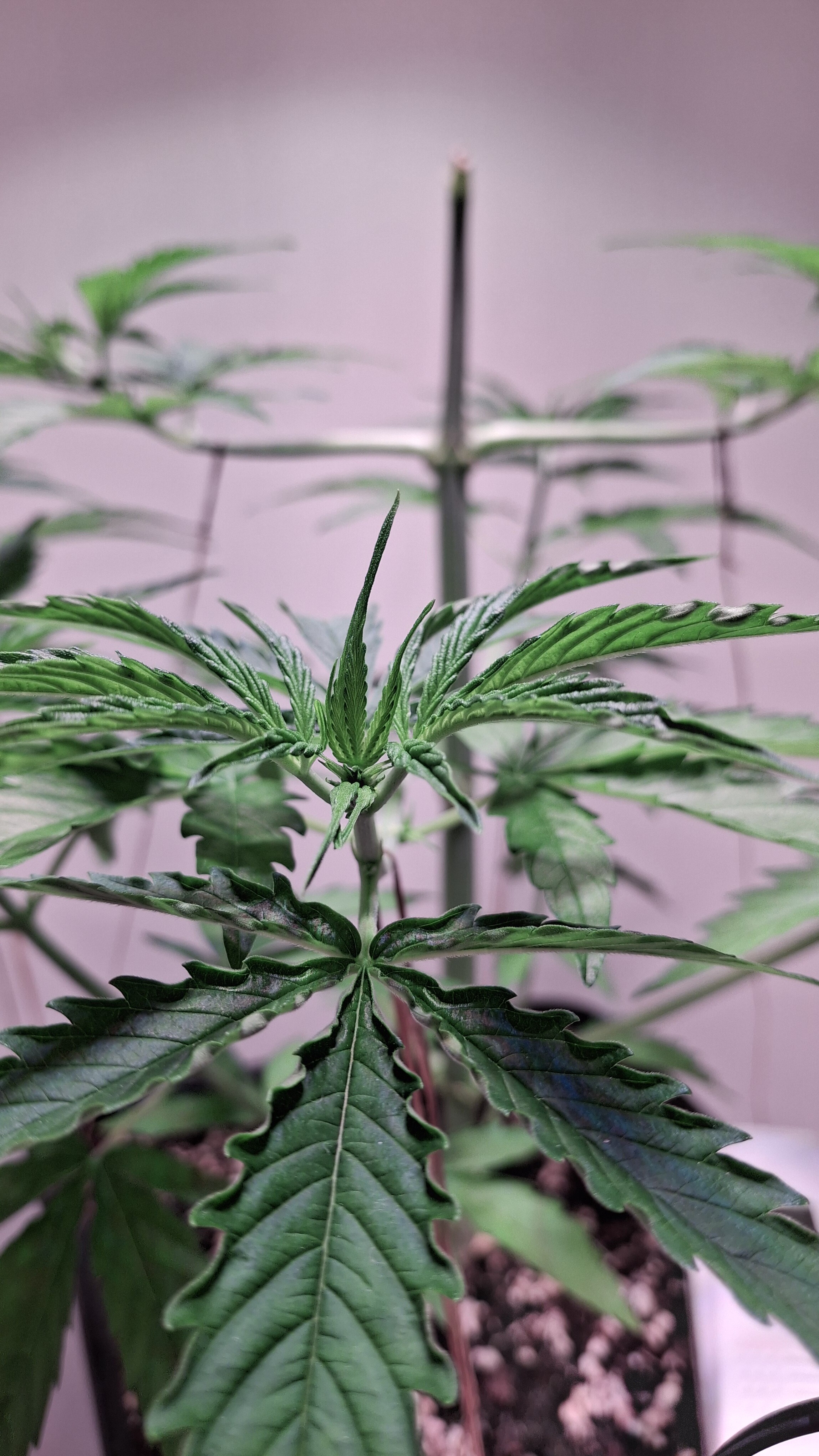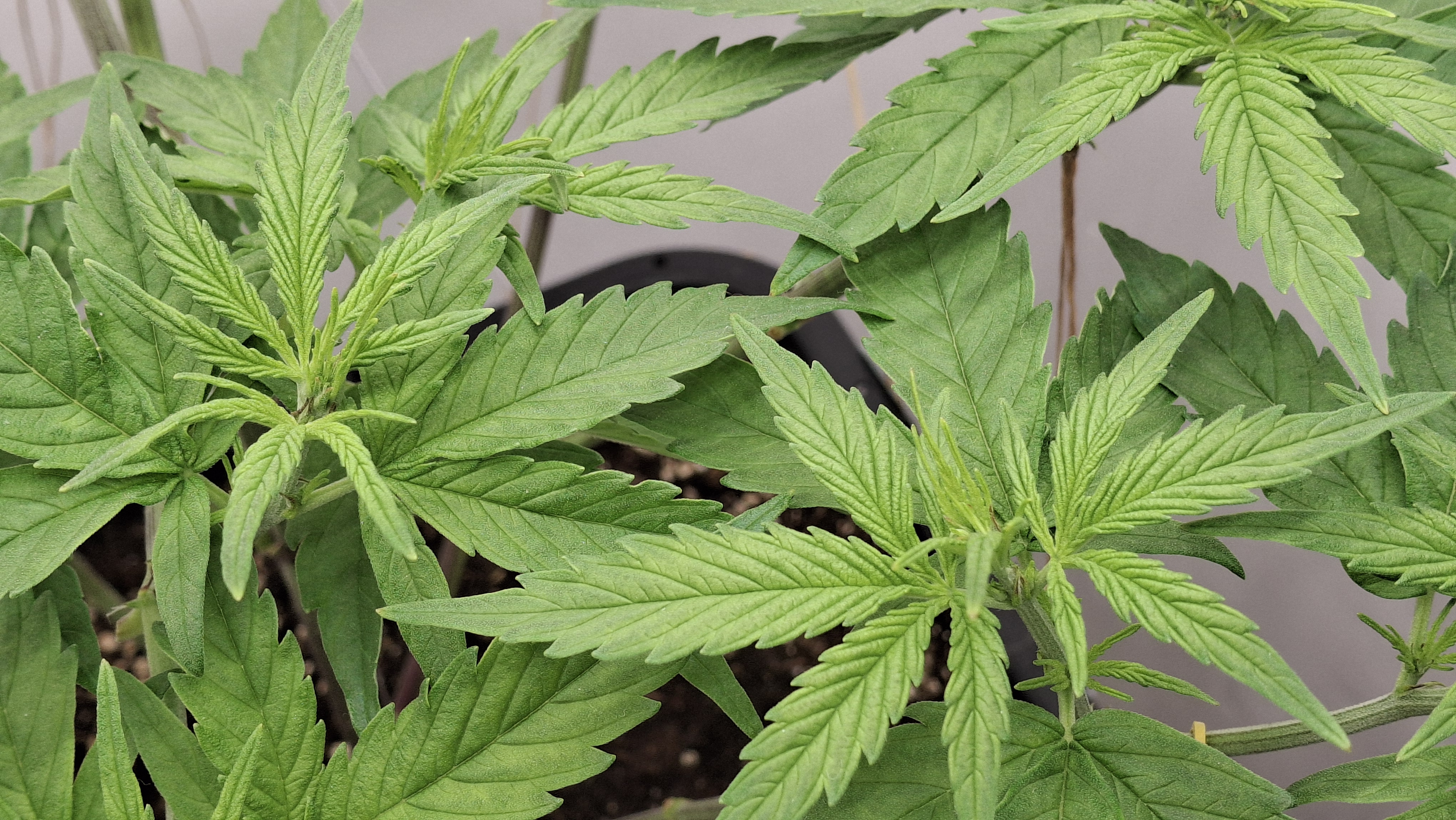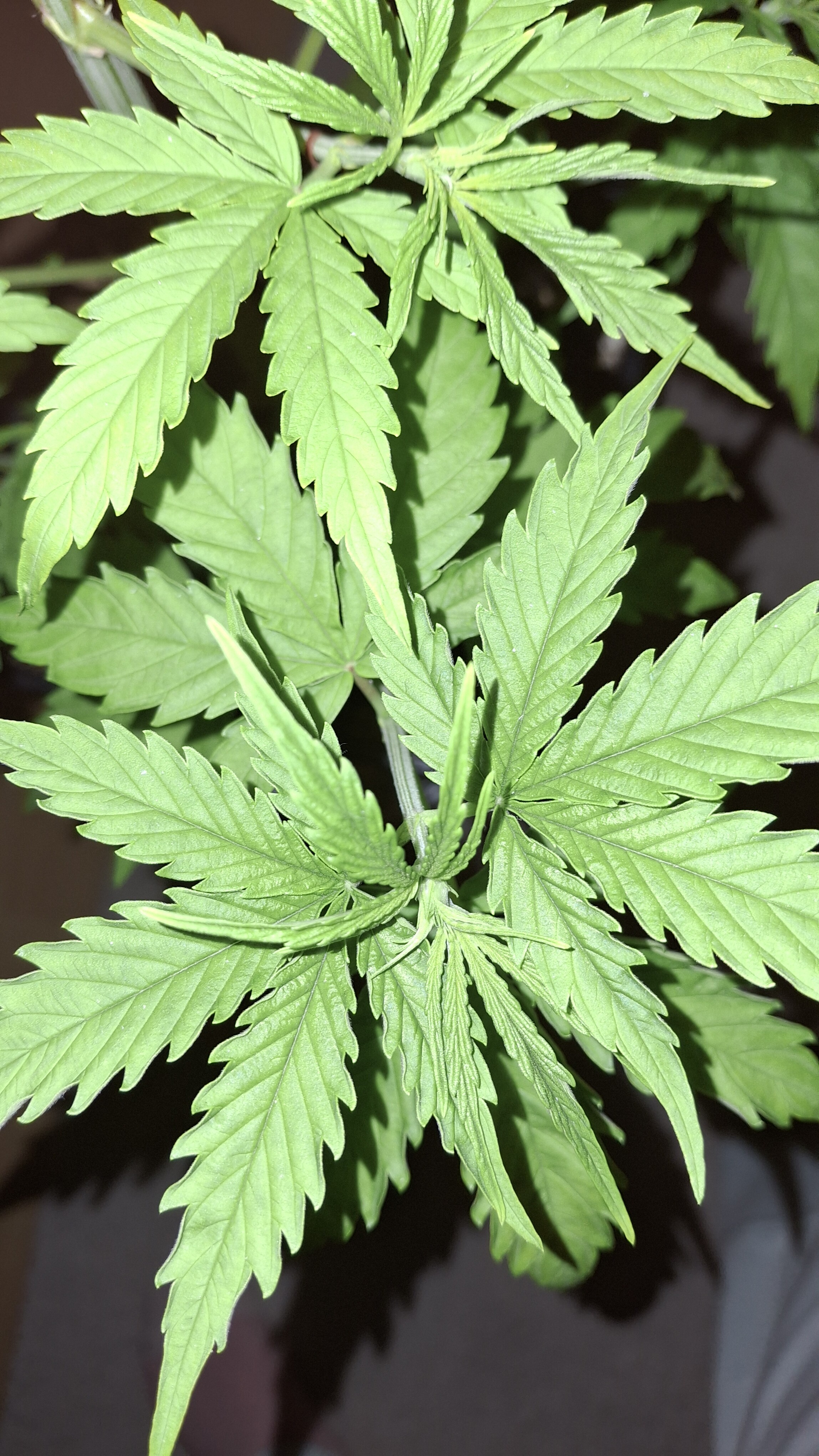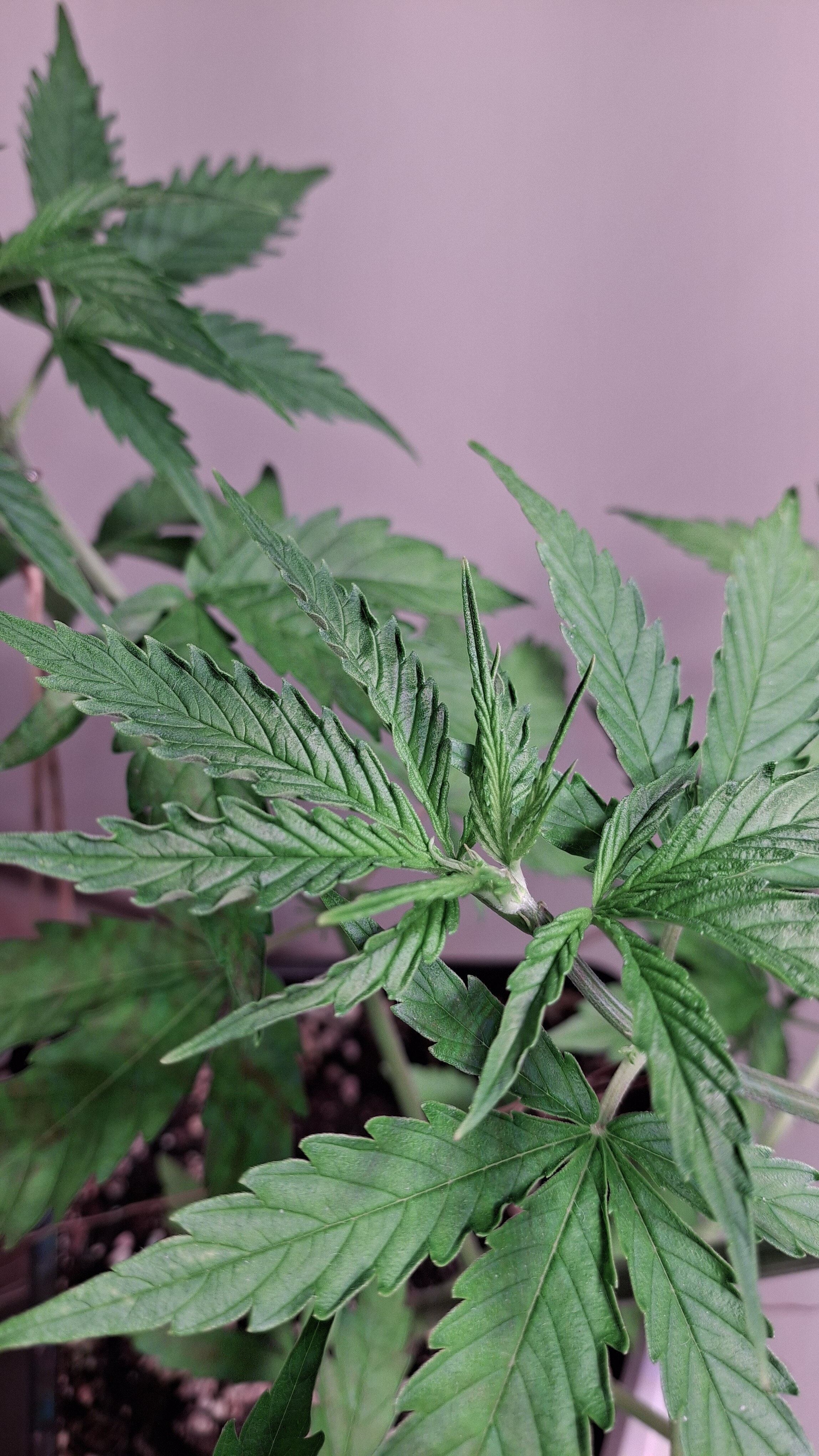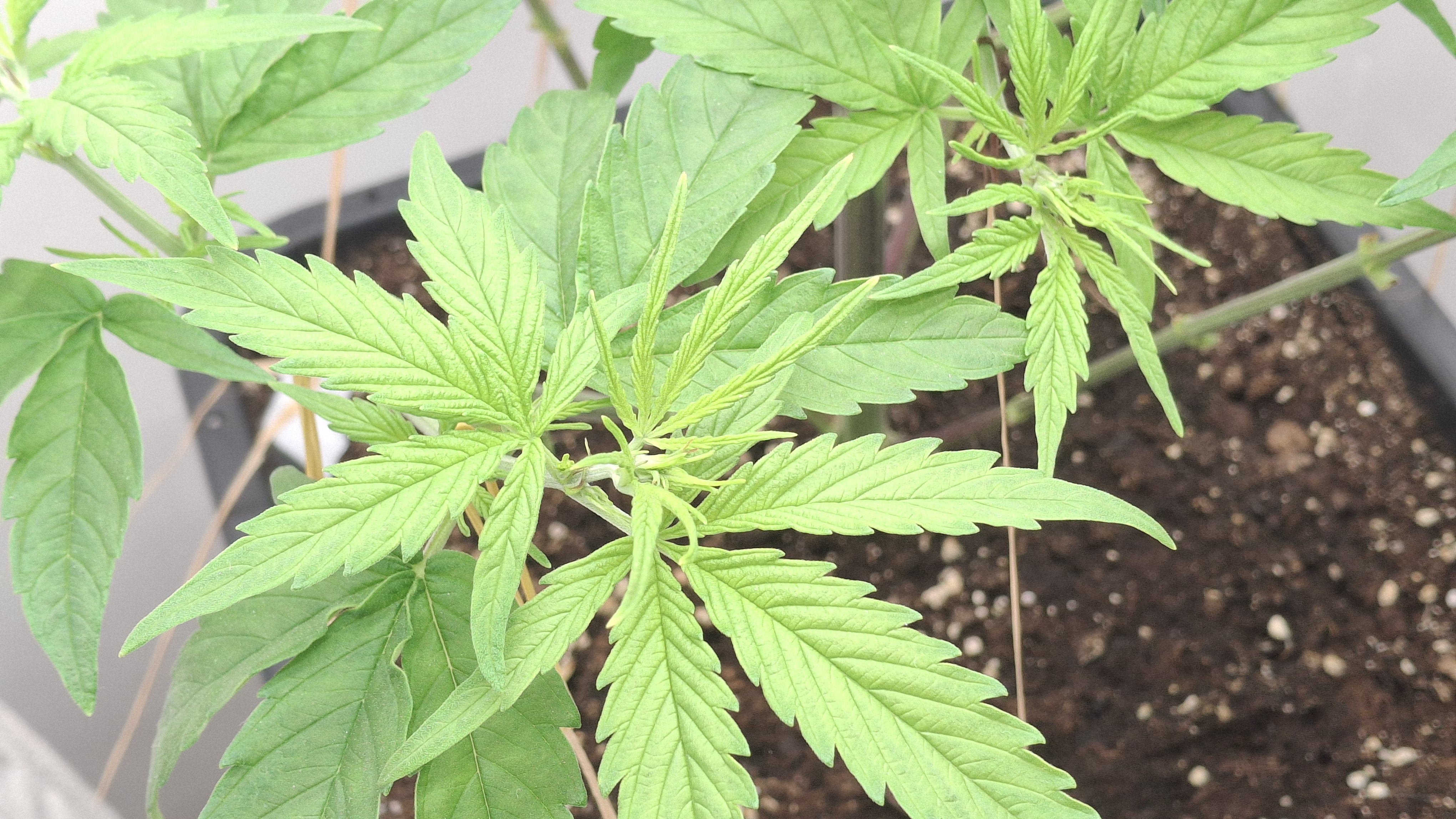 Diese Lady so gerade eben^^ - sie hat ein gutes Grün und die N-Dröhnung kam definitiv an und hat nicht geschadet; aber sie ist und bleibt eine Mimose und ihre Genetik ist schwach. Sie hatte tagsüber um die 24,5° und nachts ca. 22° bei durchschnittlich eher trockener RLF - ca. 45 %. Ich wiederhole, sie steht in frischem Bio Bizz LM und bekam 60 Watt aus 2 Sanlight M30 im Abstand von ca. 33 cm. Alles wie immer! Auch habe ich das hiesige LW nochmal recherchiert und es hat sich nichts geändert. Alles wie immer!