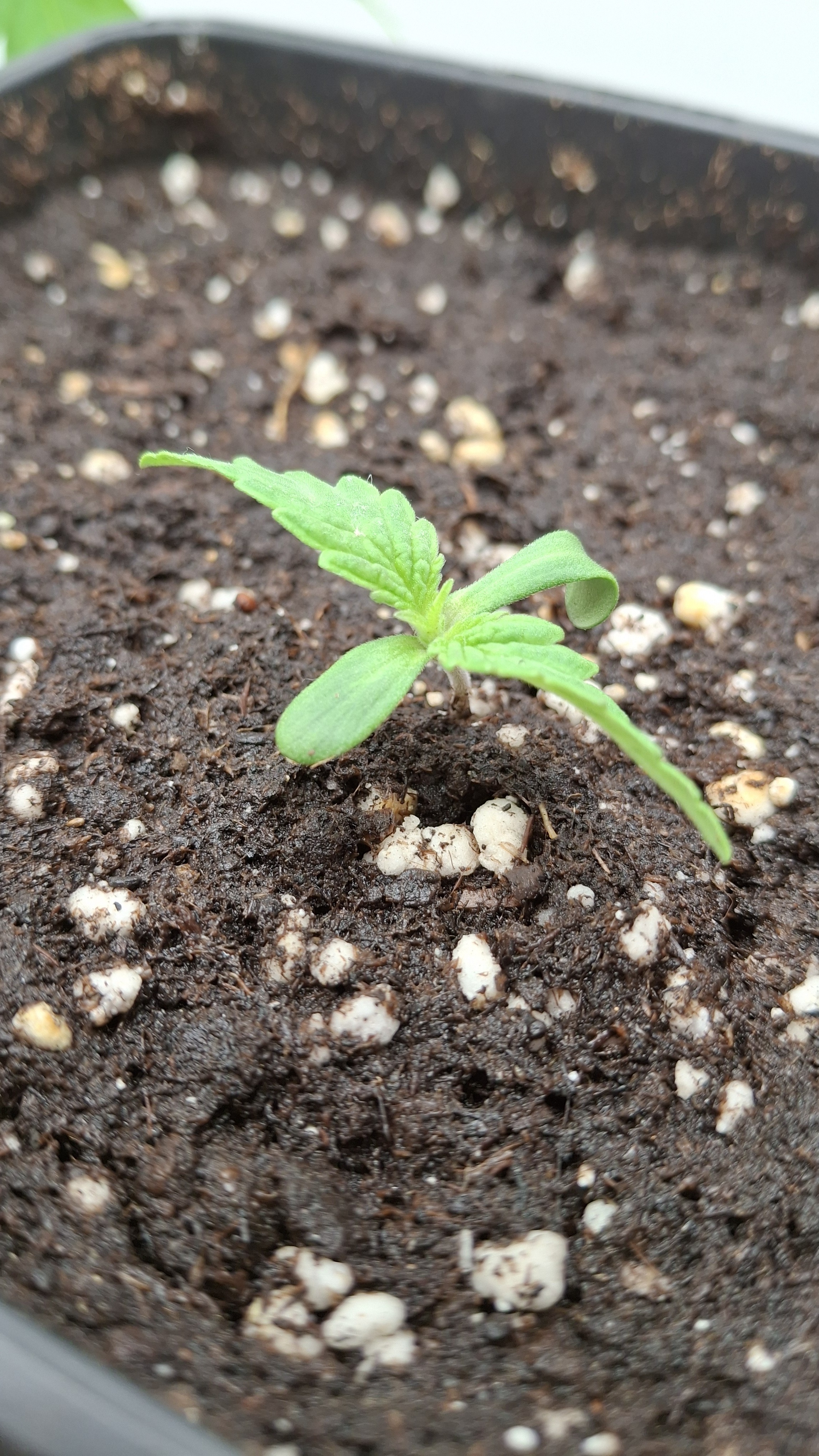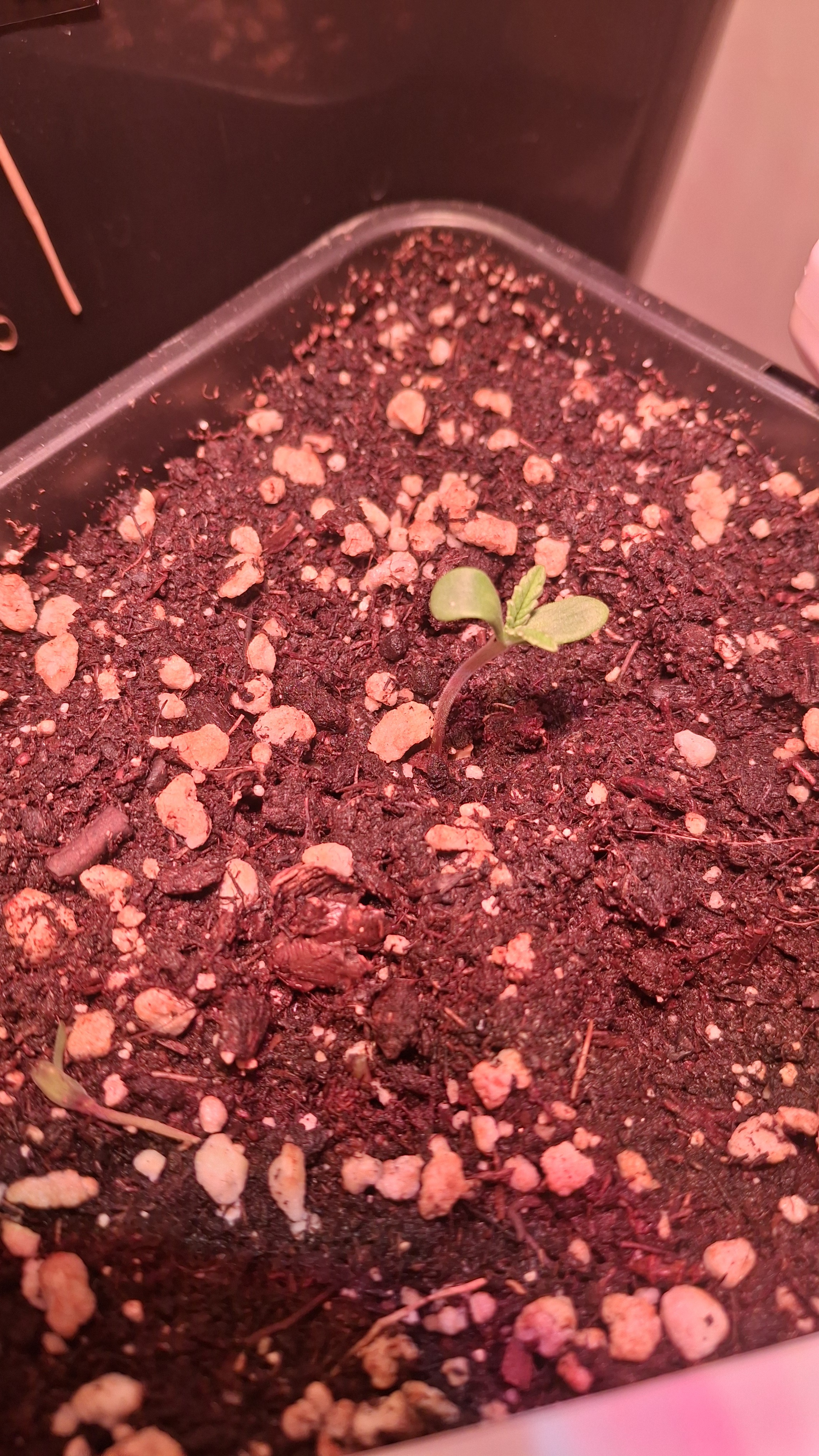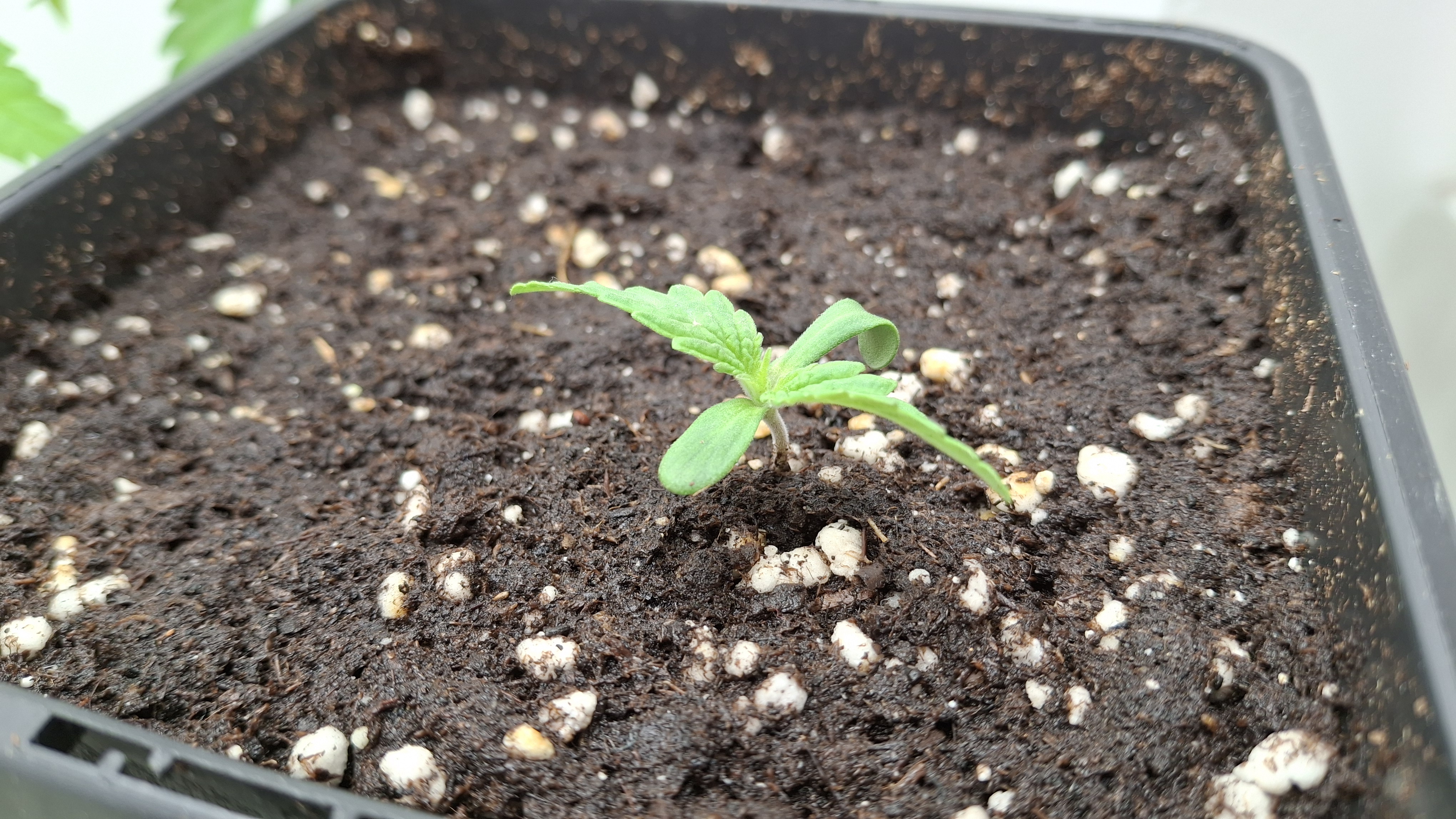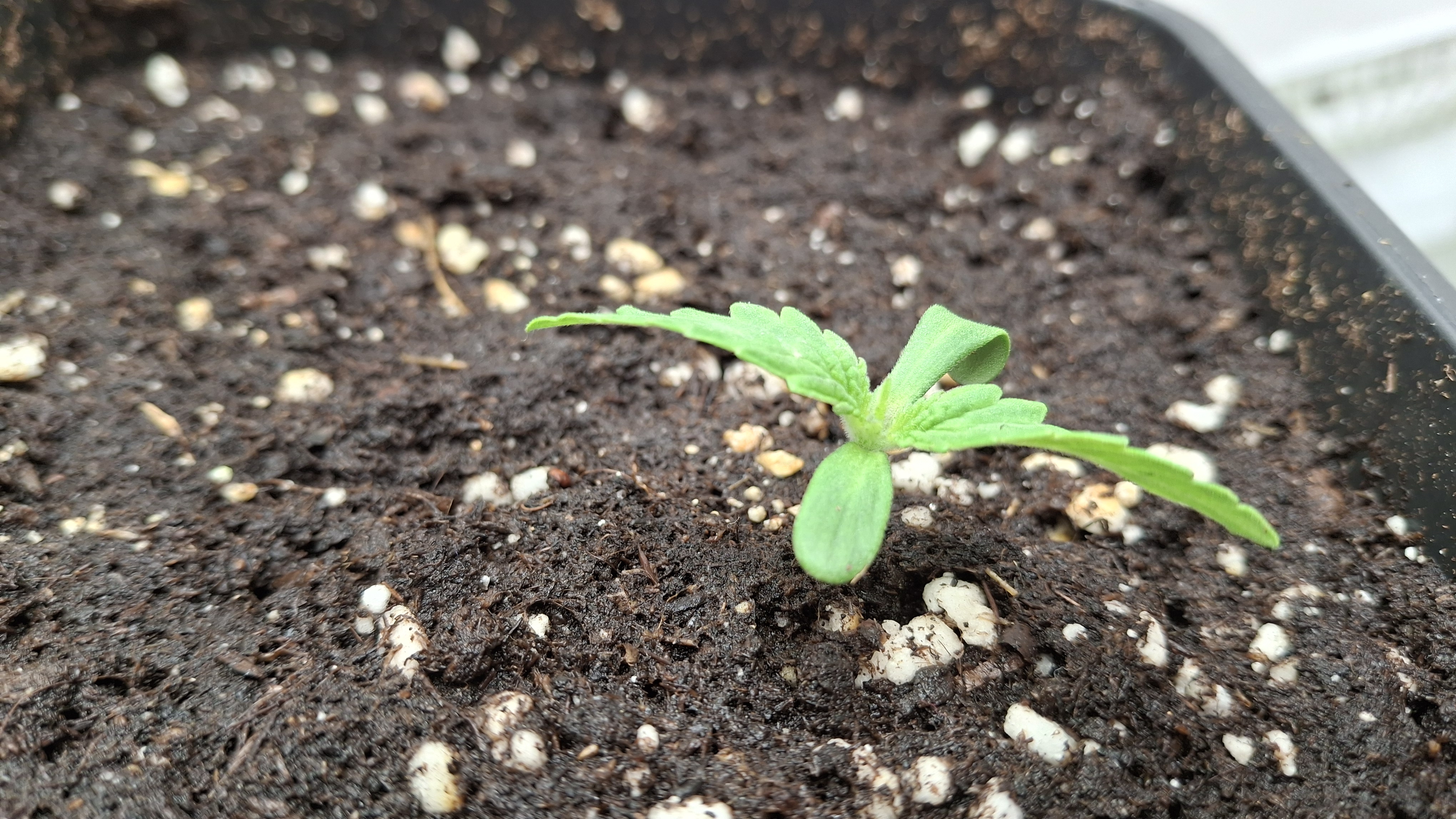 Das 4er Pack von Sensi Seeds war blind. Darin war die Mutation die oben zu sehen ist. Die 4 White Label Samen waren frisch aus 07/25. Dann 3 Kügelchen aus dem regionalen Grow-Shop gekauft. Alles Blindgänger bis auf die kleine Lady auf dem Foto hier. Sie ist jetzt ca. 3 Wochen alt, wurde sehr unregelmäßig beleuchtet, hatte kaum Dunkelphasen, stand ca. 3 Tage auf der Fensterbank und steht jetzt einfach so mit im Bunker. Mal sehen was passiert mit dem Kernschrott. Dann nochmals 2 Samen vom regionalen Grow-Shop. Einer ist ebenfalls wieder nicht aufgegangen und dieser hier hat sich im Papiertuch einen Spalt geöffnet, dann war auch hier Stillstand. Ich habe ihm die komplette Hülle abgenommen und dann den ganzen Klops in Pott geworfen. Und, dieses Mal hat es geklappt.