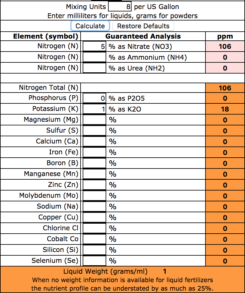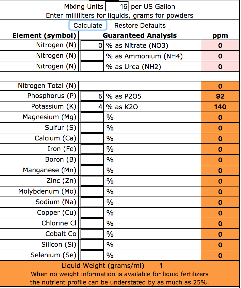 Lucas Formula rounds off to use 8 ml FloraMicro and 16 ml FloraBloom, so the N-P-K-Mg ppm will be slightly higher than the previously stated 122N-99P-171K-68Mg values using 7.5ml/15ml respectively. Using 8 ml FloraMicro and 16 ml FloraBloom, the N-P-K-Mg values are 130N-106P-183K-73Mg.