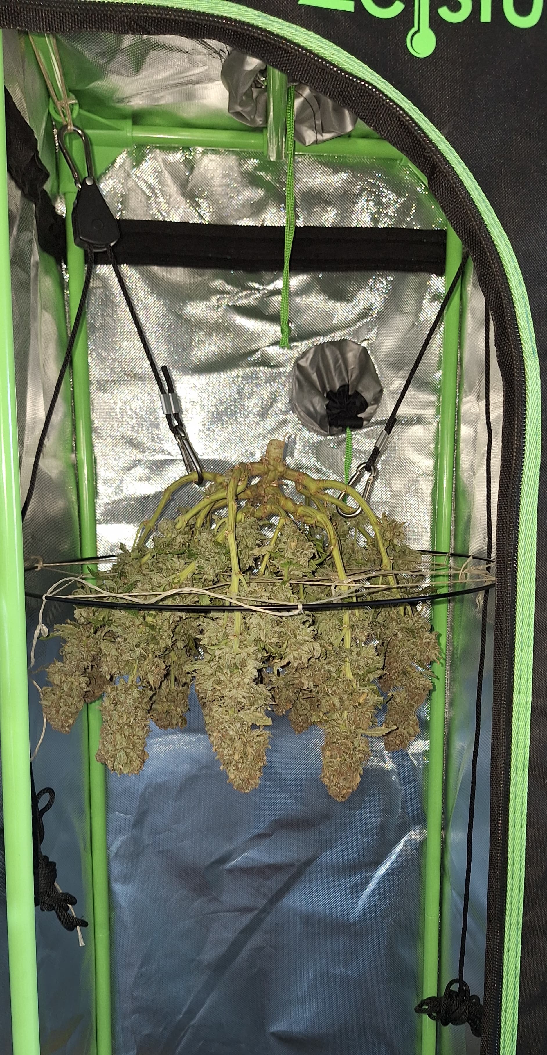 Der Oszilierende Ventilator hab ich auf den Boden gestellt, auf Stufe 1 und die Pflanze so weit hochgezogen, bis mir der Wind schwach genug zum trockenen erschien.