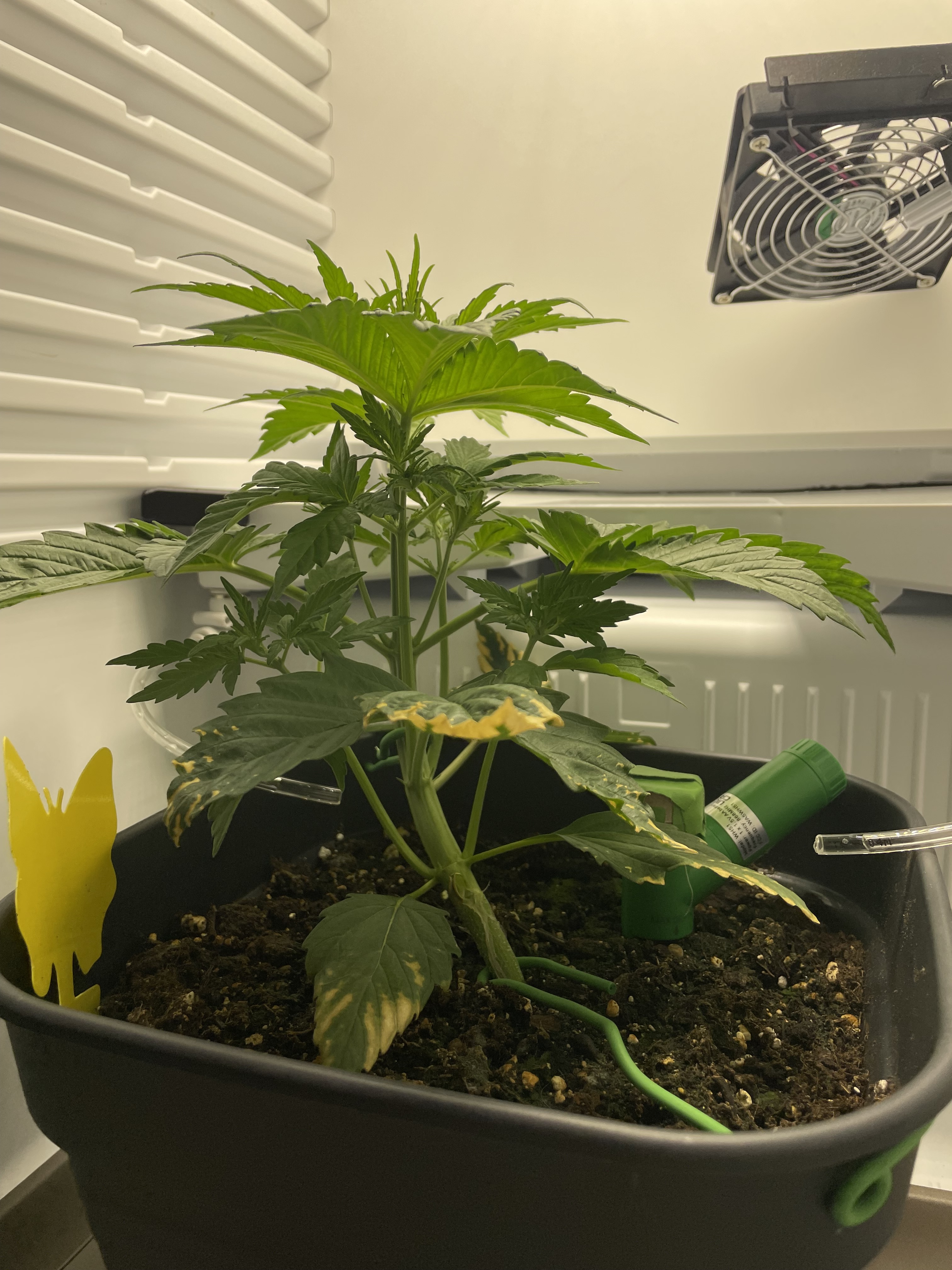 Auch die Zuckerblätter sind betroffen (Bilder folgen), gegossen mit Leitungswasser hatte ich vorher (nicht Zuviel), feucht ist die Erde immer noch, die Fridge hat auch durchgängig funktioniert.