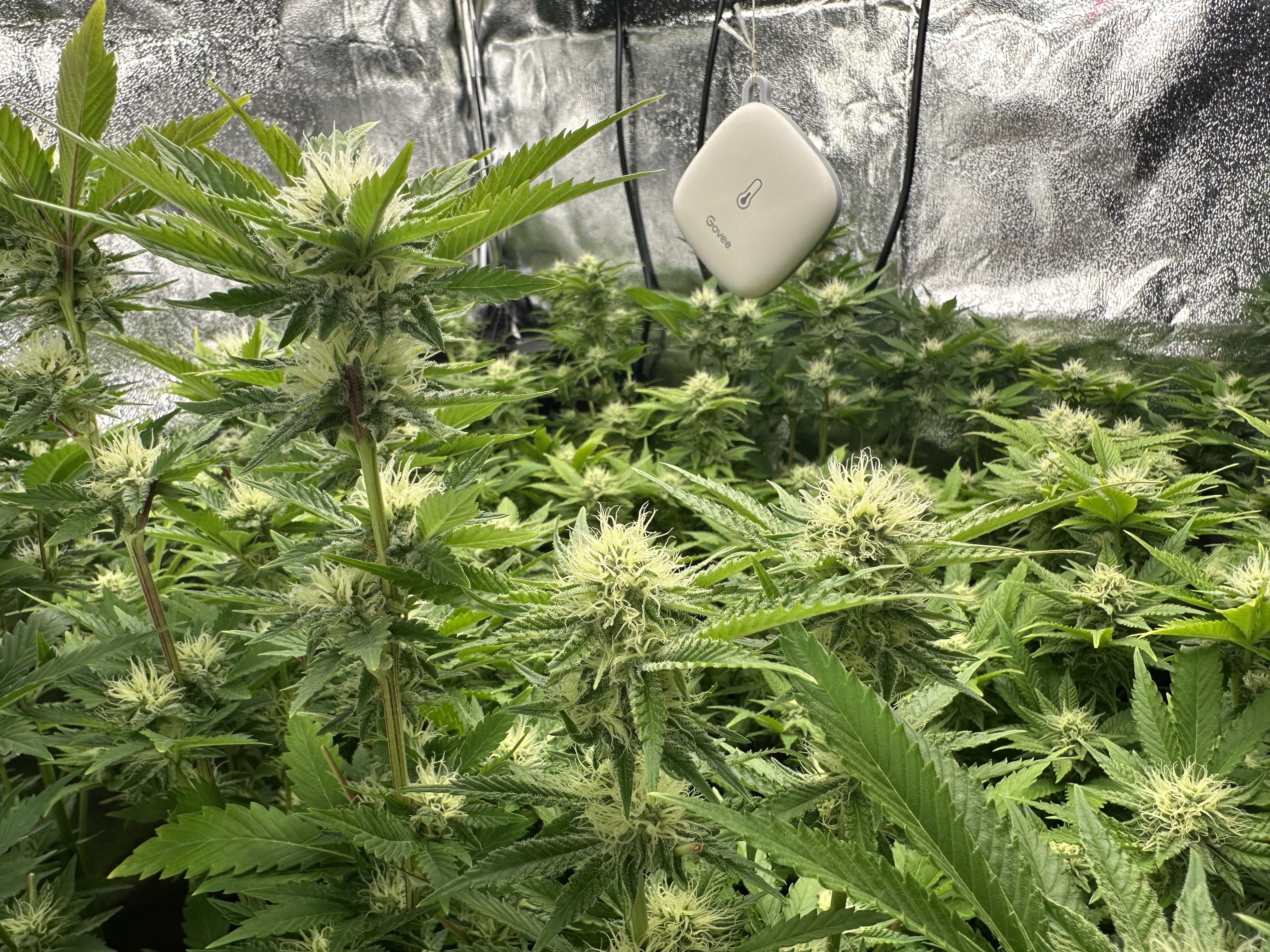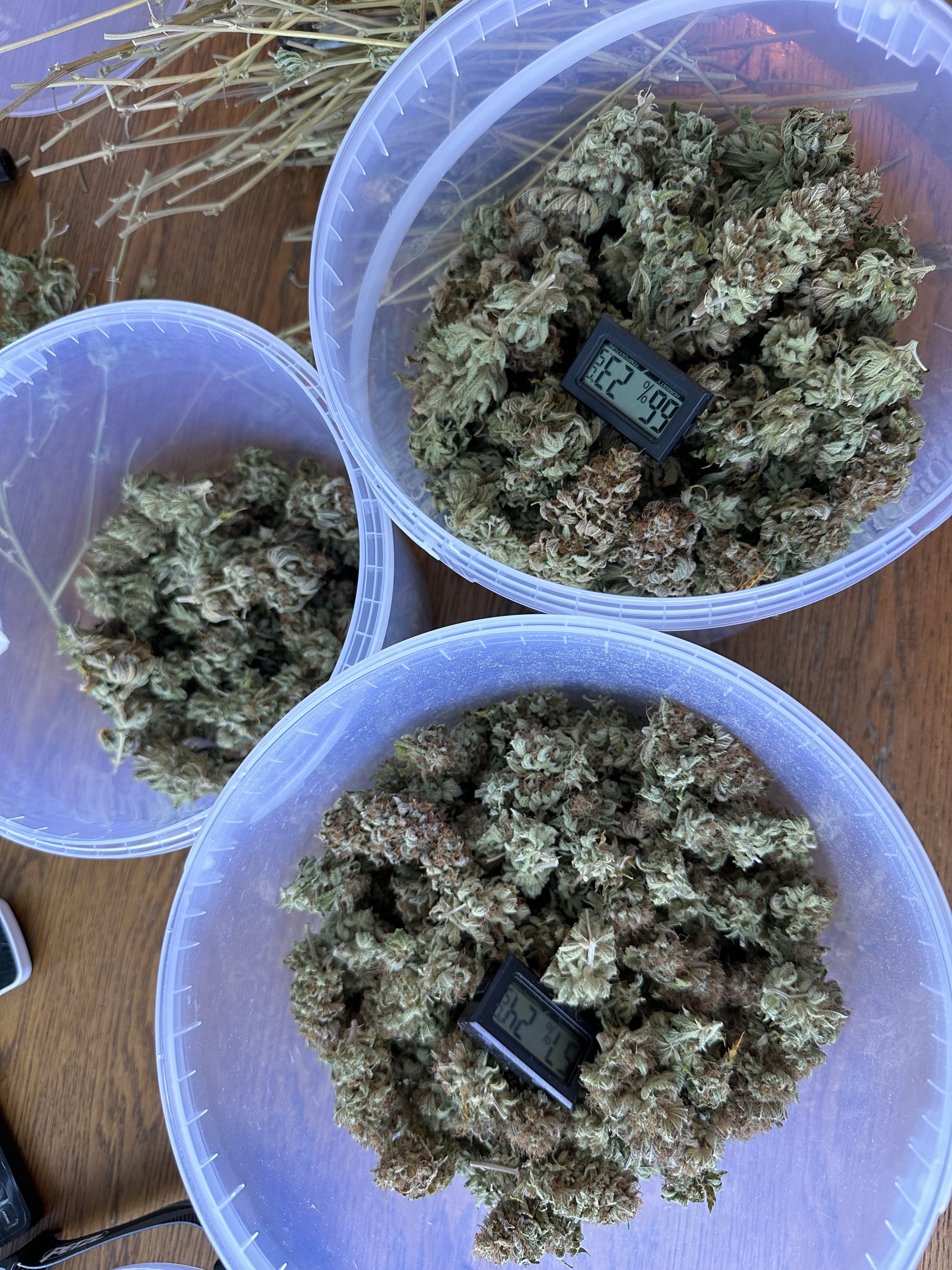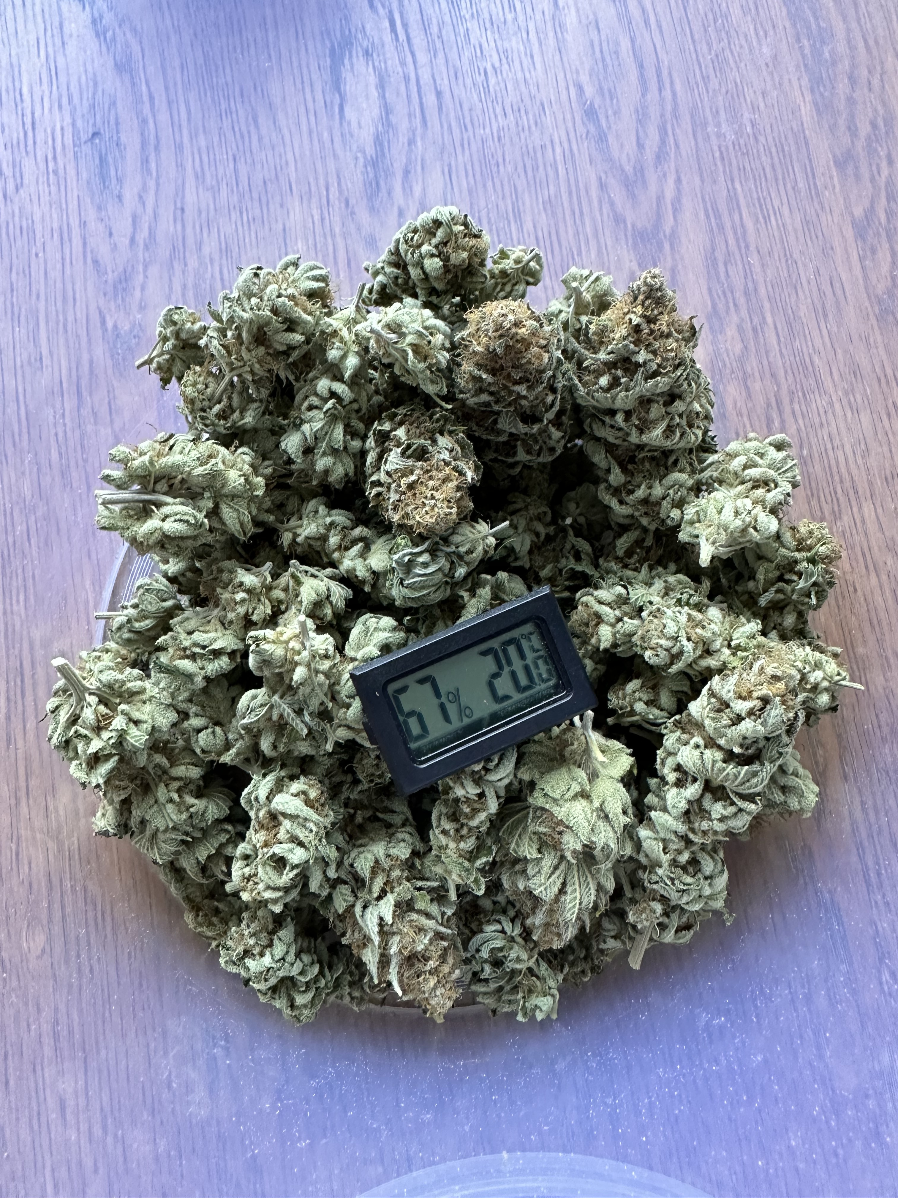 Entfeuchter steht auf 60% und geht meist erst abends an, entfeuchtet immer auf 55% und in den letzten 3 Wochen stelle ich ihn auf 50% dann sollten da so 45-48% rauskommen.