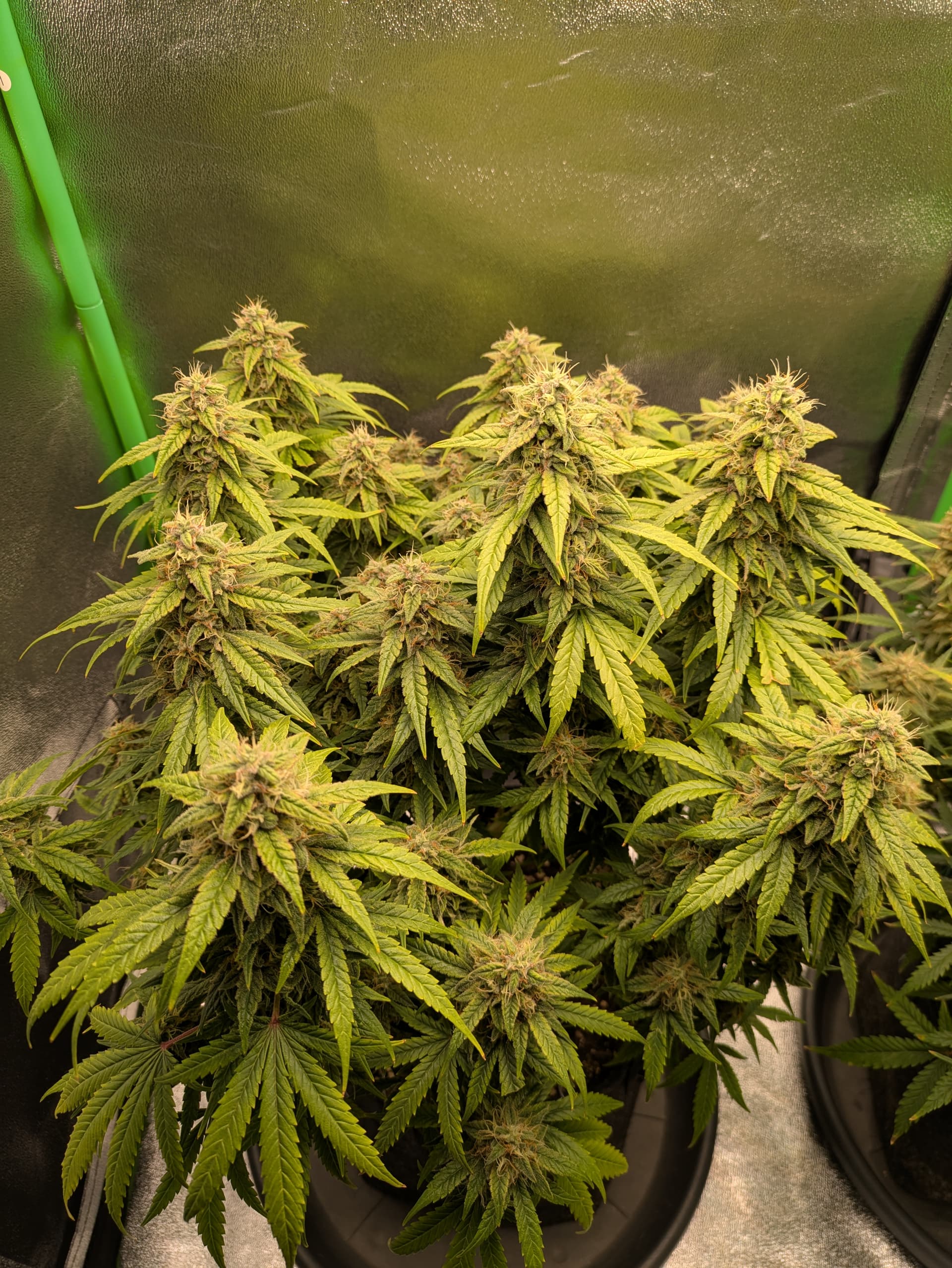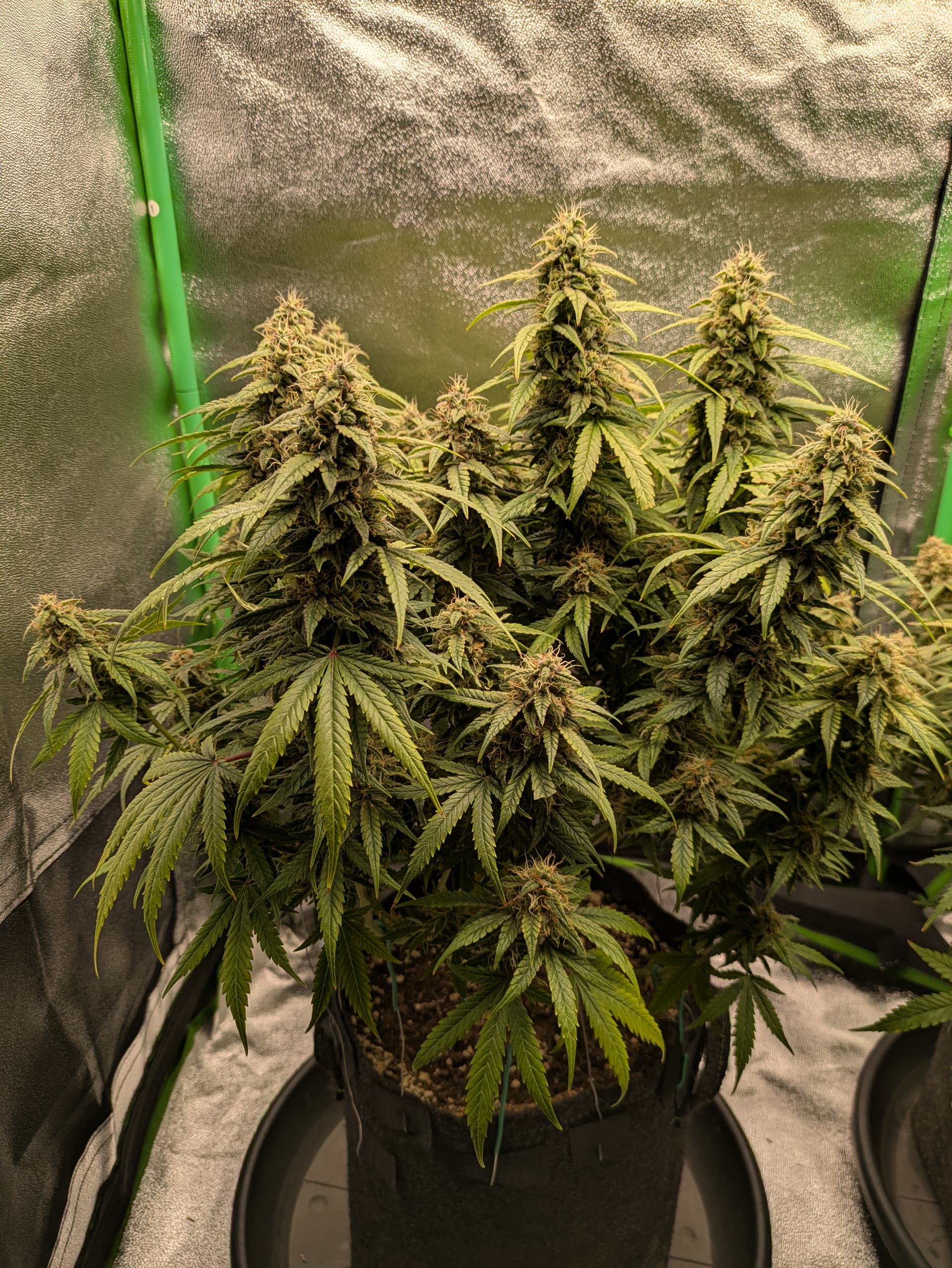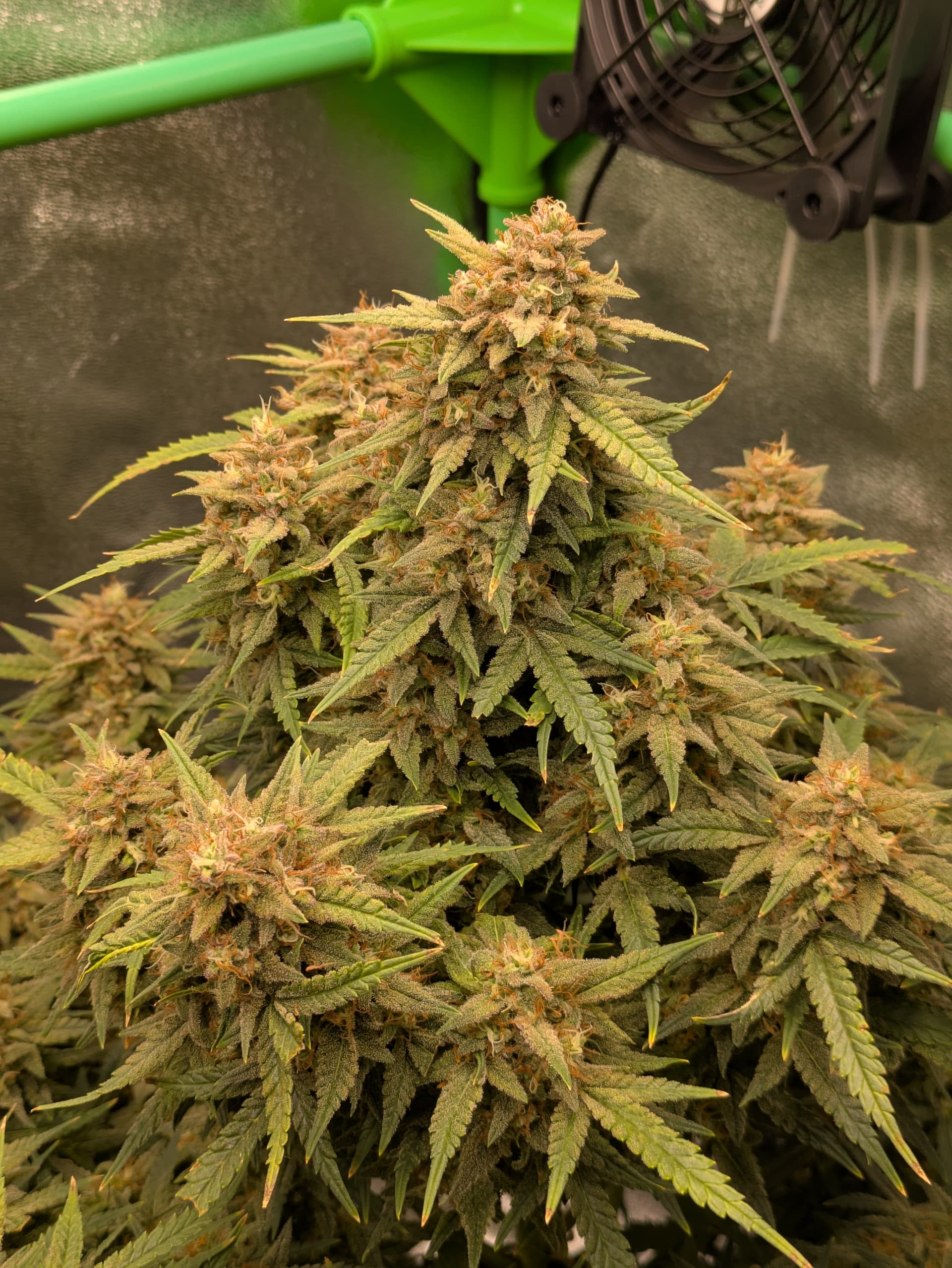 Gefällt mir alles sehr, was ich da sehe! Sie ist wieder n bissl heller geworden, aber das werden wir mit diesem (letztmaligen?) Gießen korrigieren. Für sie gabs heute 3,5l mit CalMag+BS, PowerZyme, SuperVIT, Blüh-Complex, 25% Phosphors Plus und 4ml TNT. Also weniger P+ und mehr TNT als beim letzten Gießen. Mal sehen, ob es für sie schon das letzte Mal mit Dünger war. Trichome schon viele milchig, aber da geht noch was, denke ich. Auch im Volumen der „Kolben“.. ![]()