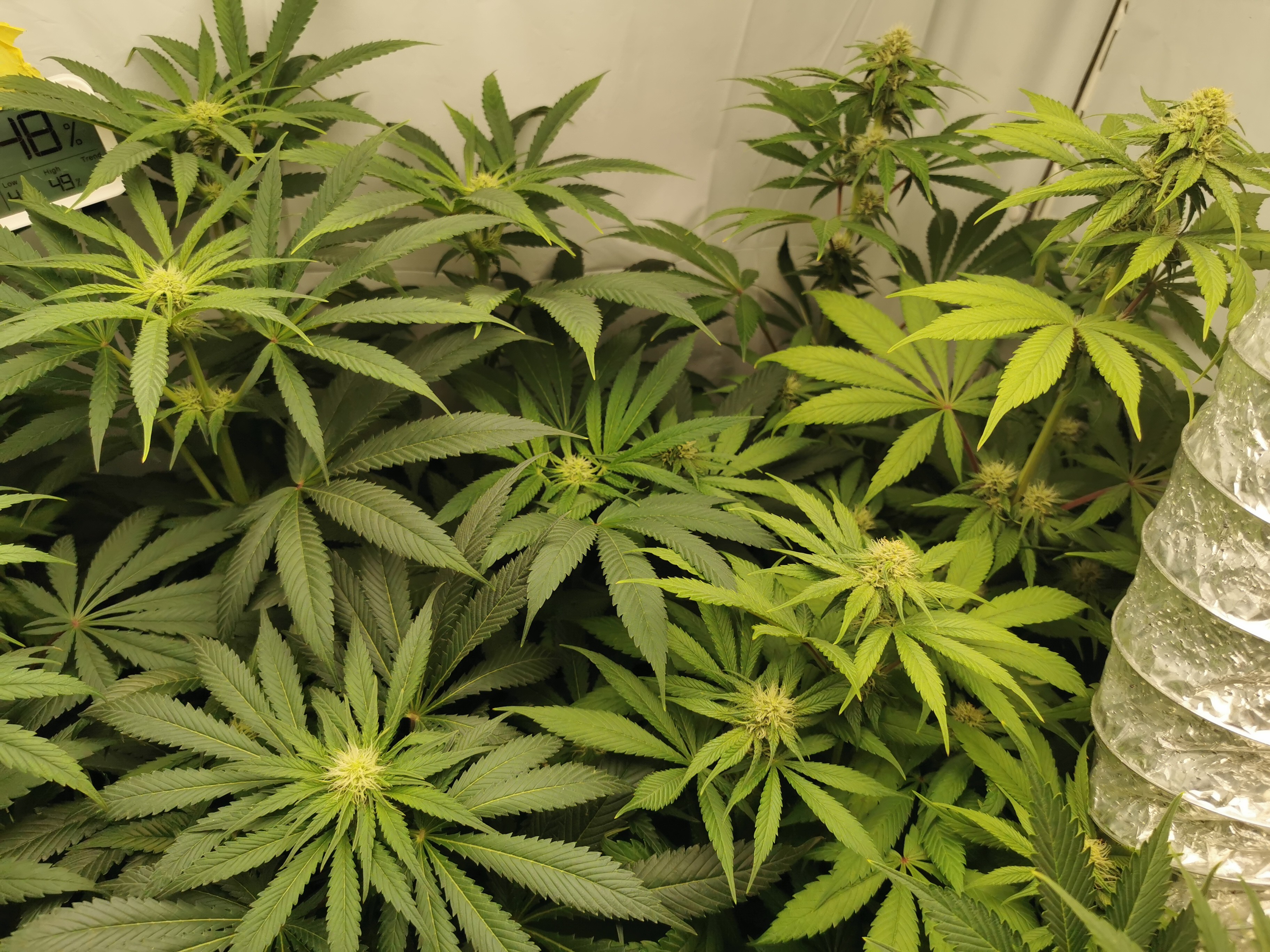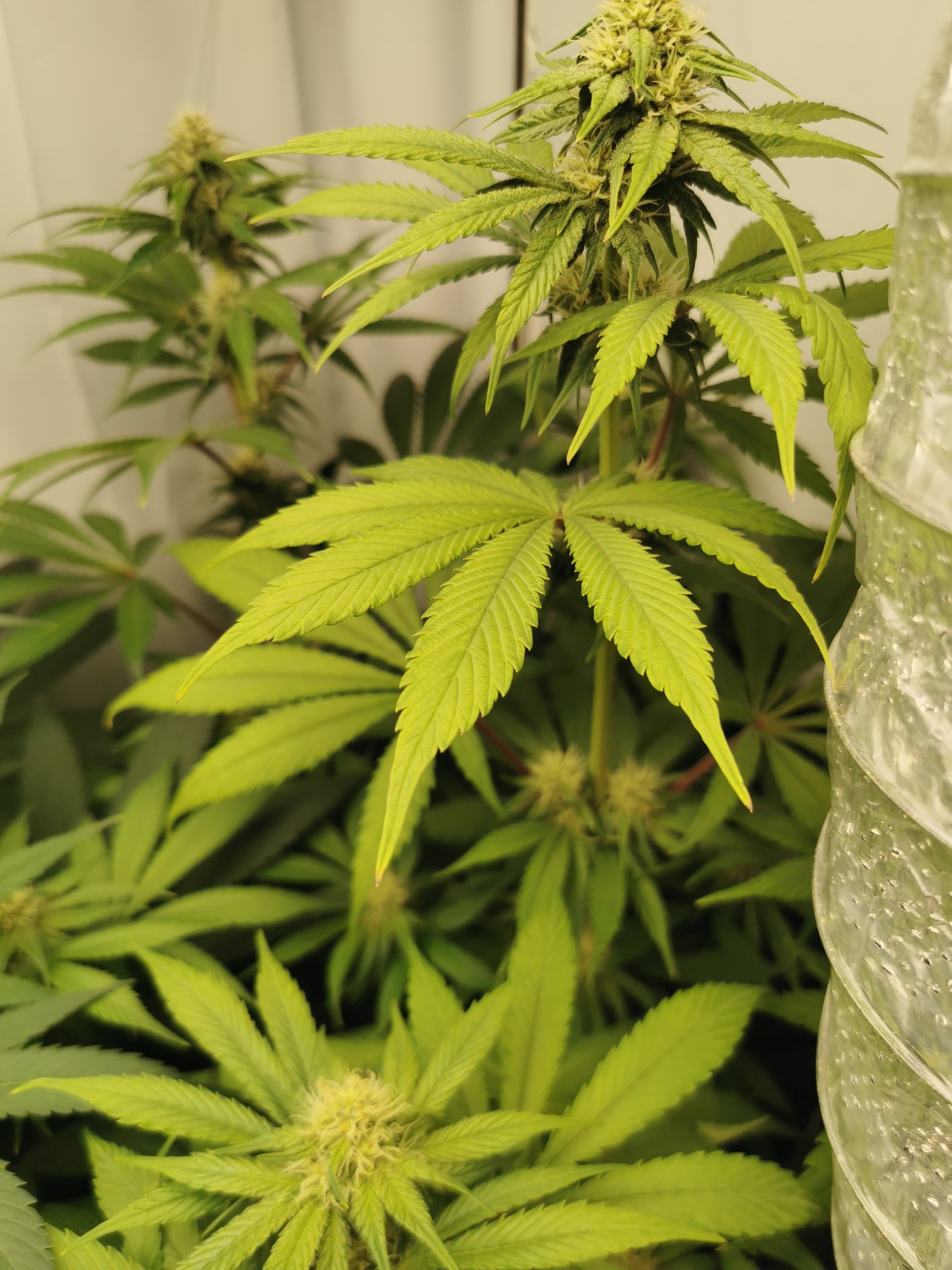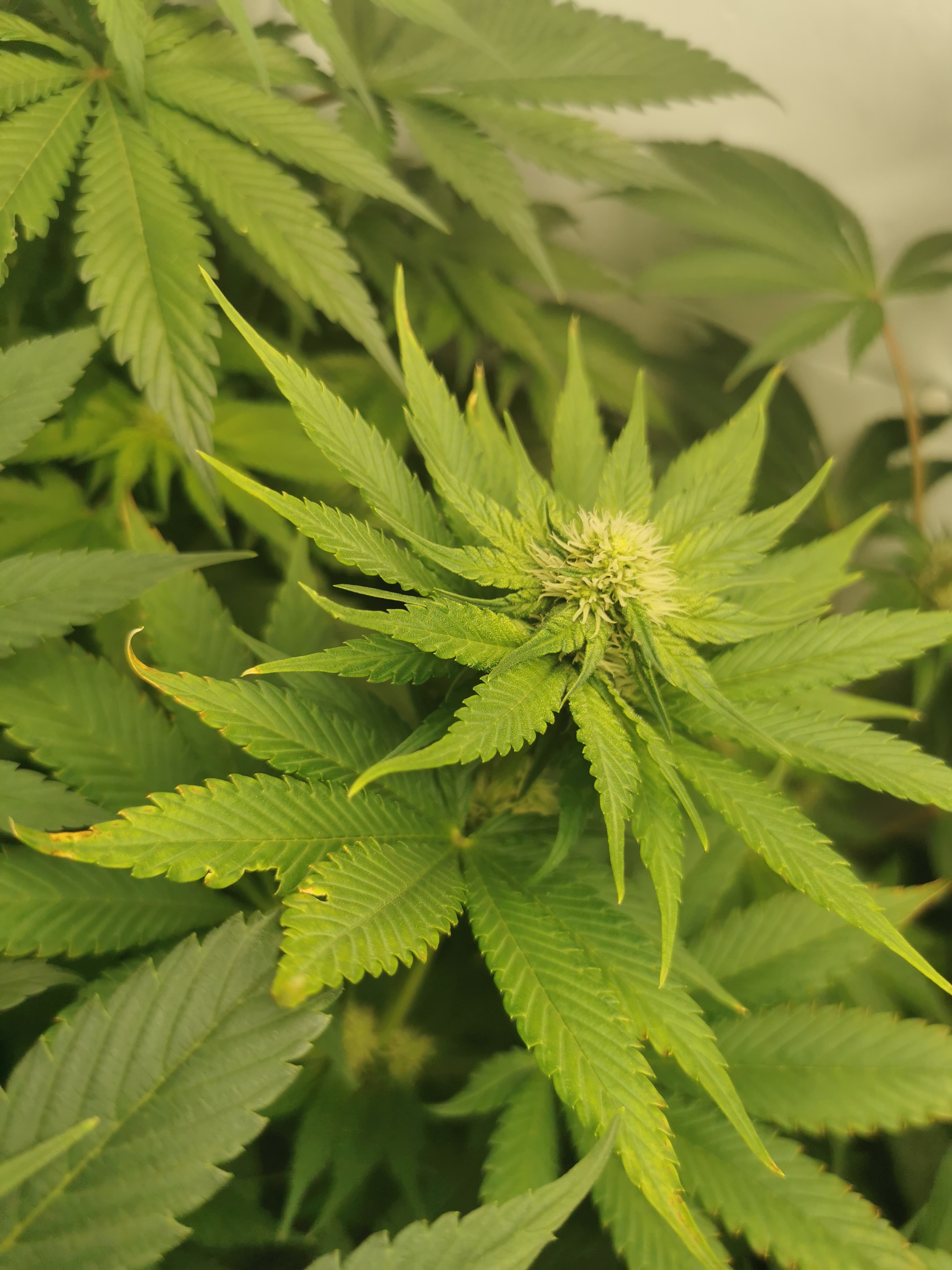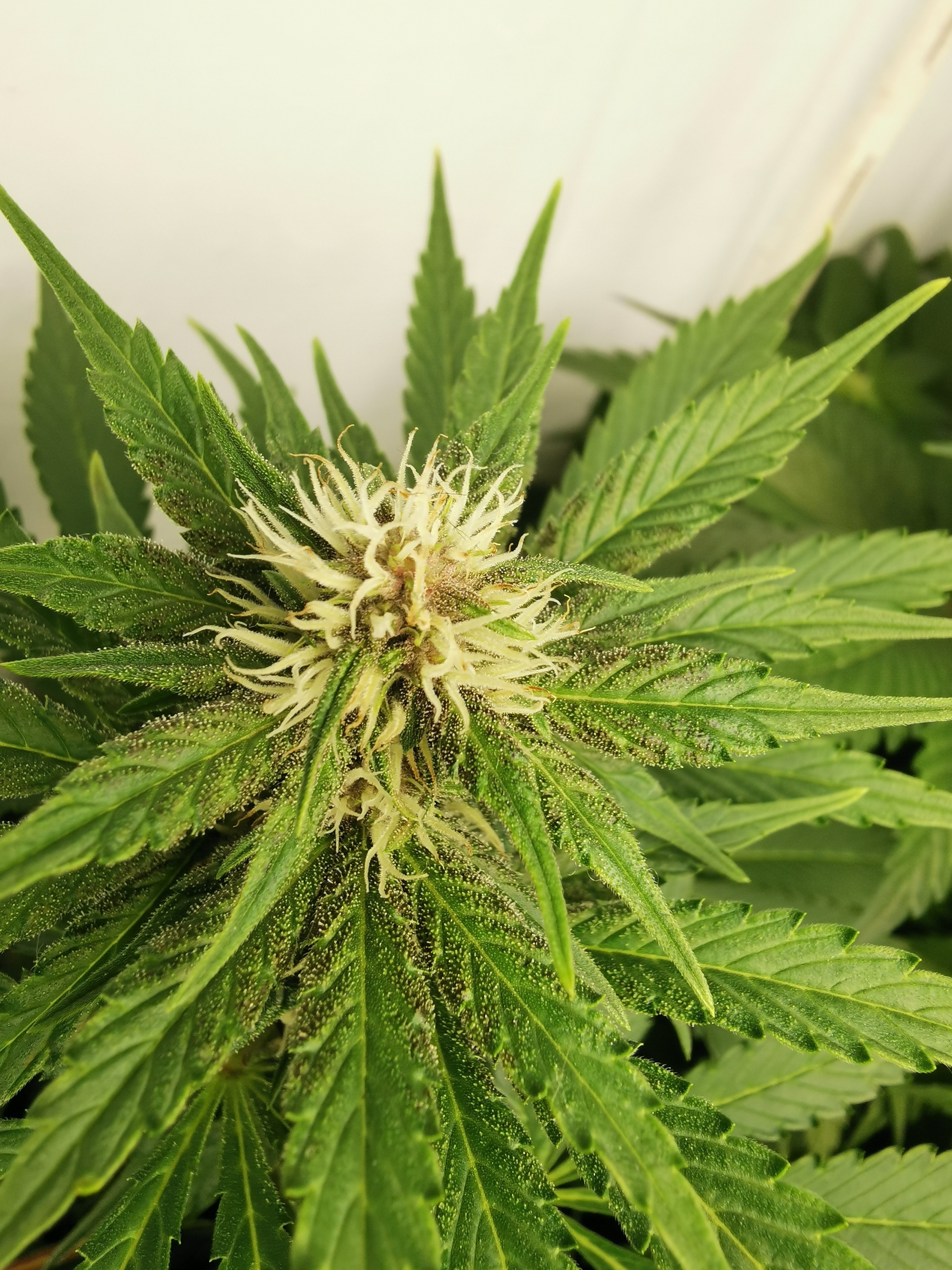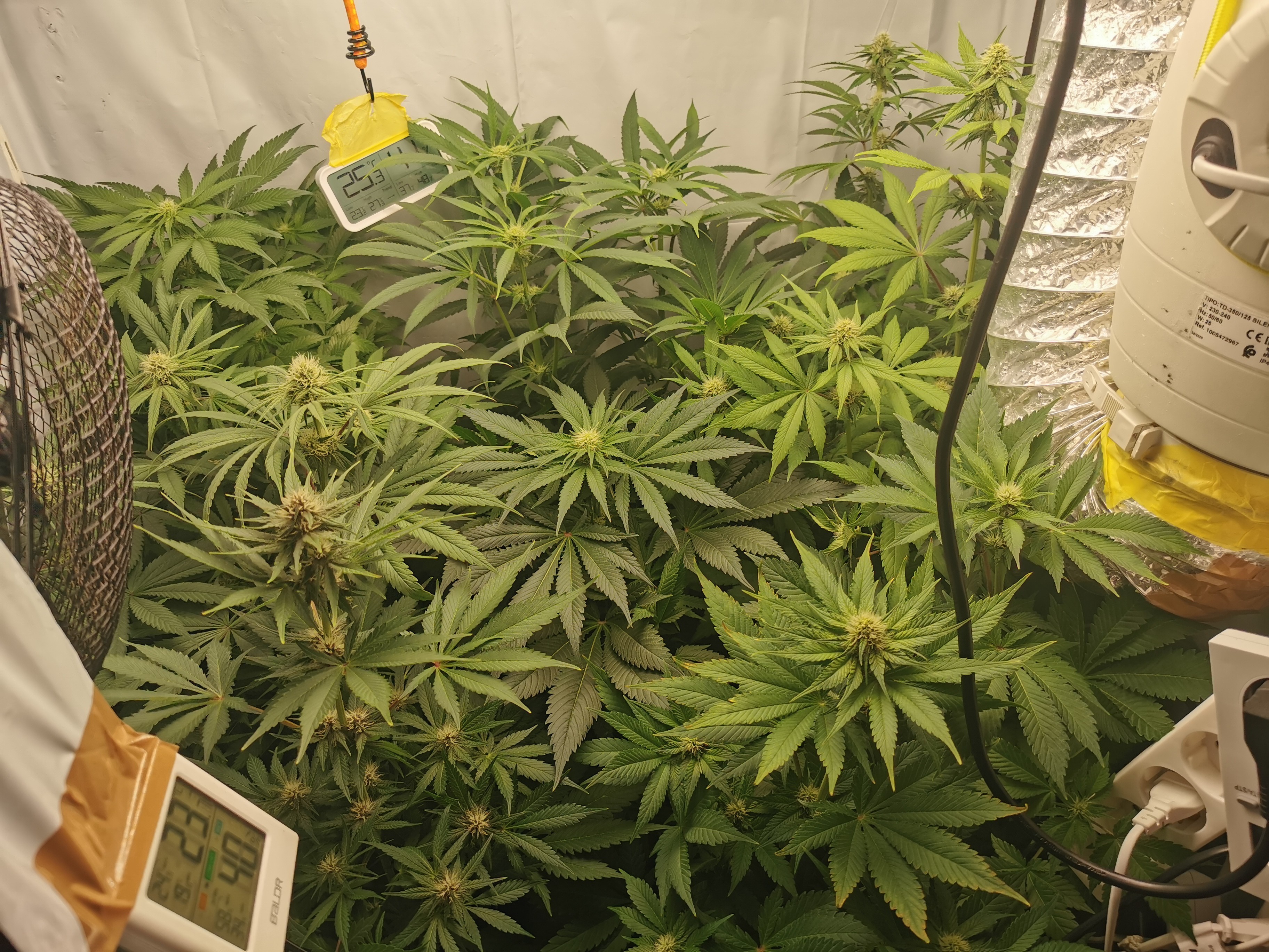 Das Licht ist auf 100% da ich jetzt im 2. Grow die Temperaturen wieder im Griff habe. Davor hatte ich ca. 29 Grad und knusprige headbuds und Blätter… Bei 40cm Abstand.
