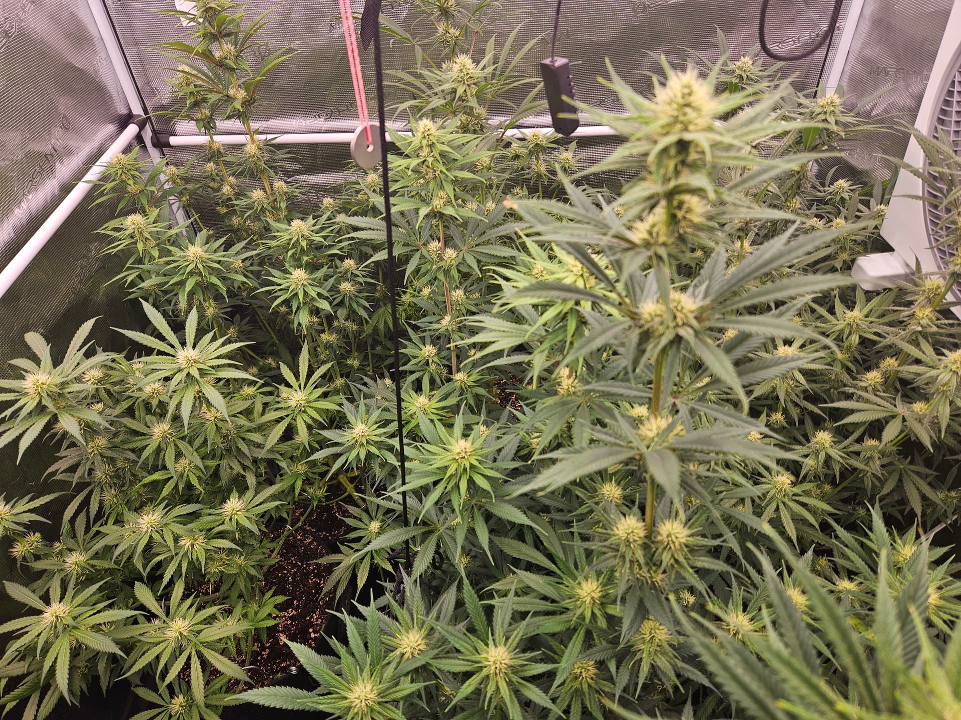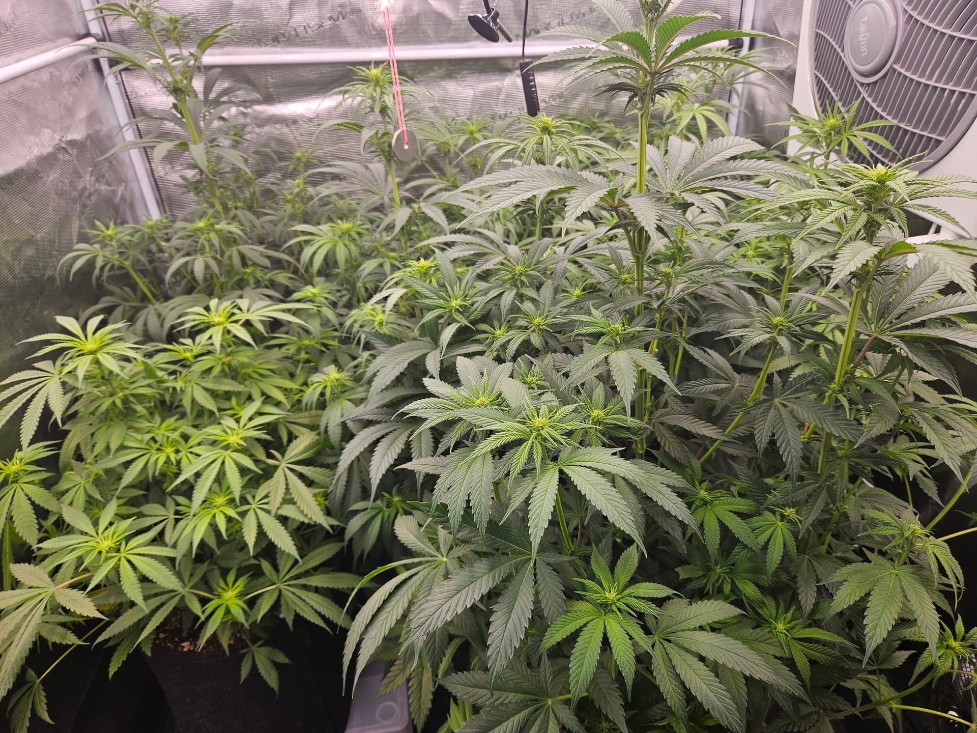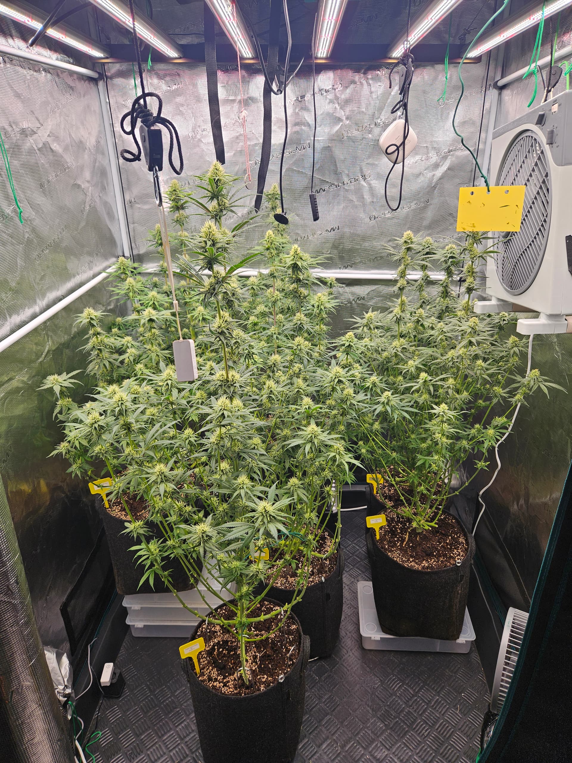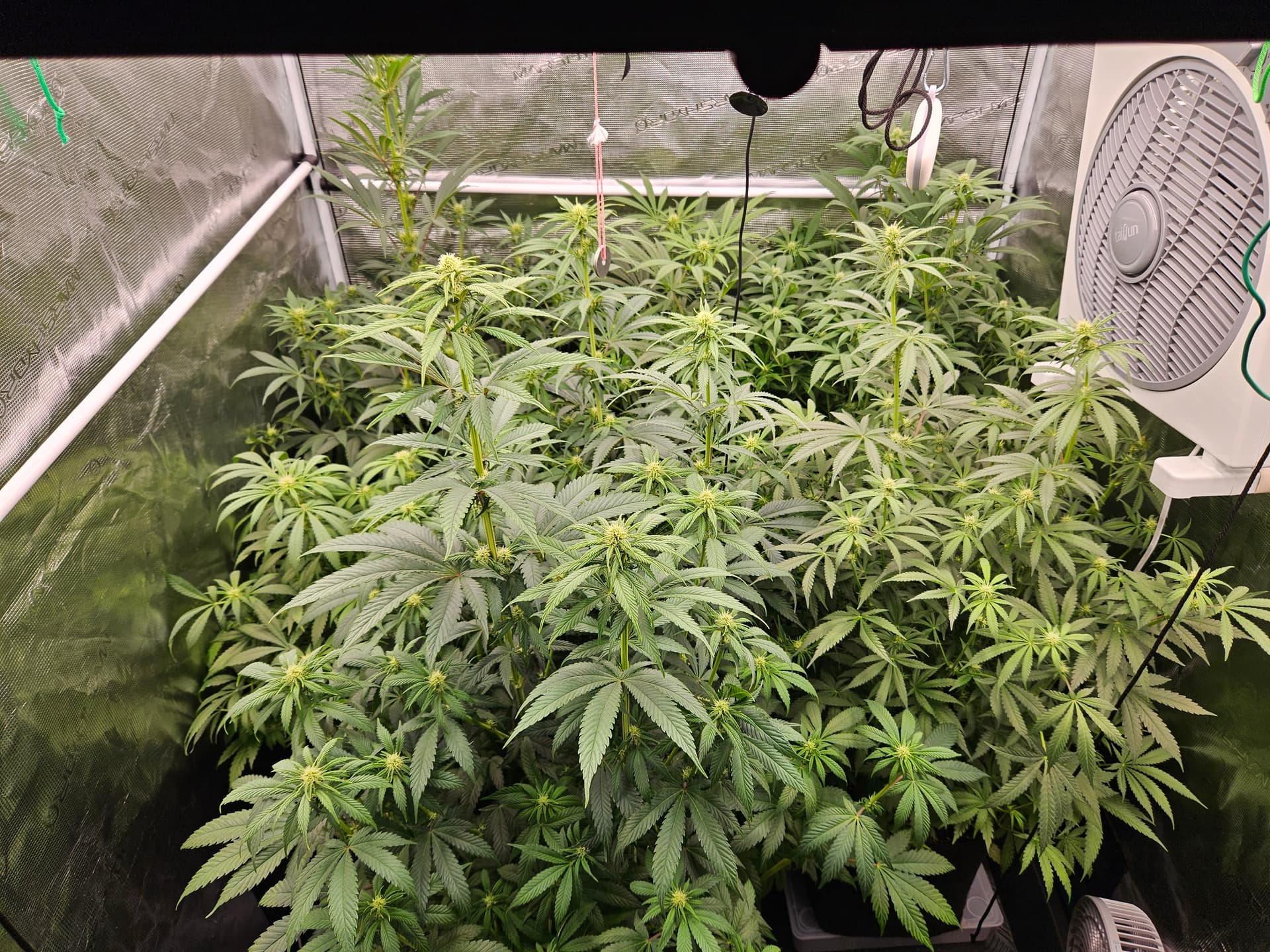 Zum senken deiner LF lege ich dir nah nochmal die grossen Sonnensegel zu beseitigen,hat den Vorteil daß das verschieden Buds mehr Licht bekommen und dein VPD verbessert. Bist ja doch schon wieder ziemlich dicht. Auch die Zirkulation der Luft wird besser,in dem Fall beugst du dem evtl Schimmelbefall vor. Wenn du den VPD verbesserst werden deine Buds auch besser. Sanlight hat dazu eine Studie kann man sich auf YT anschauen ist sehr interessant.
