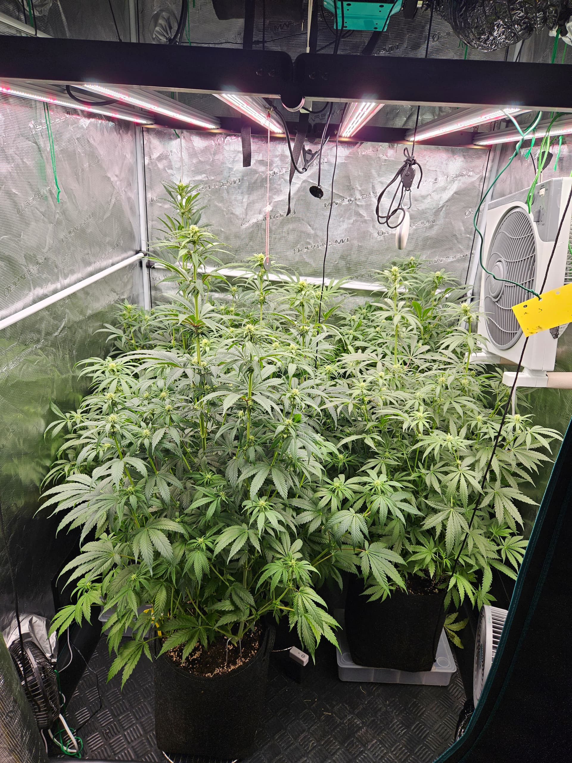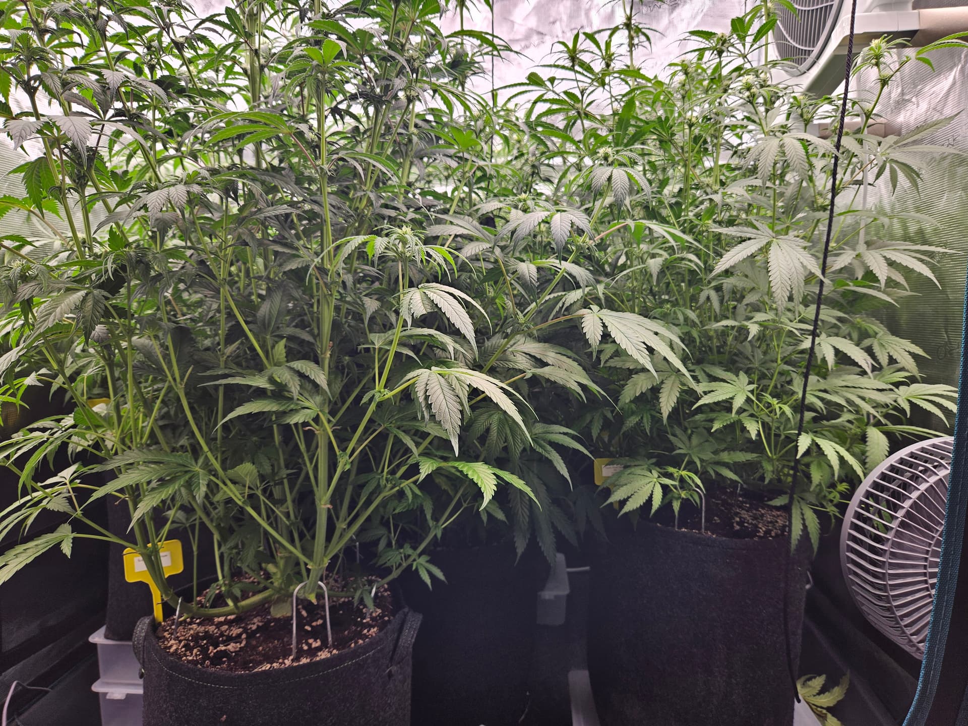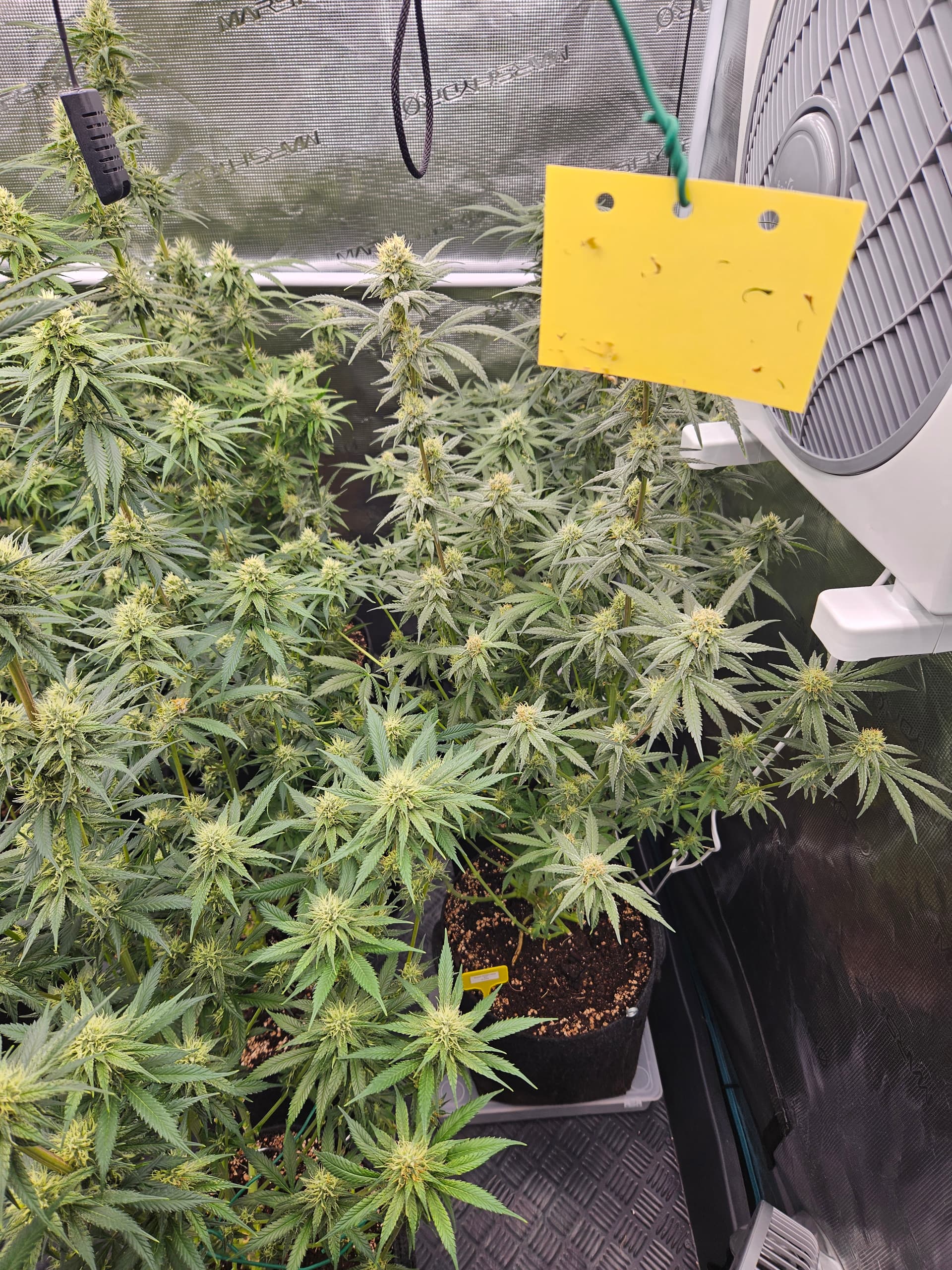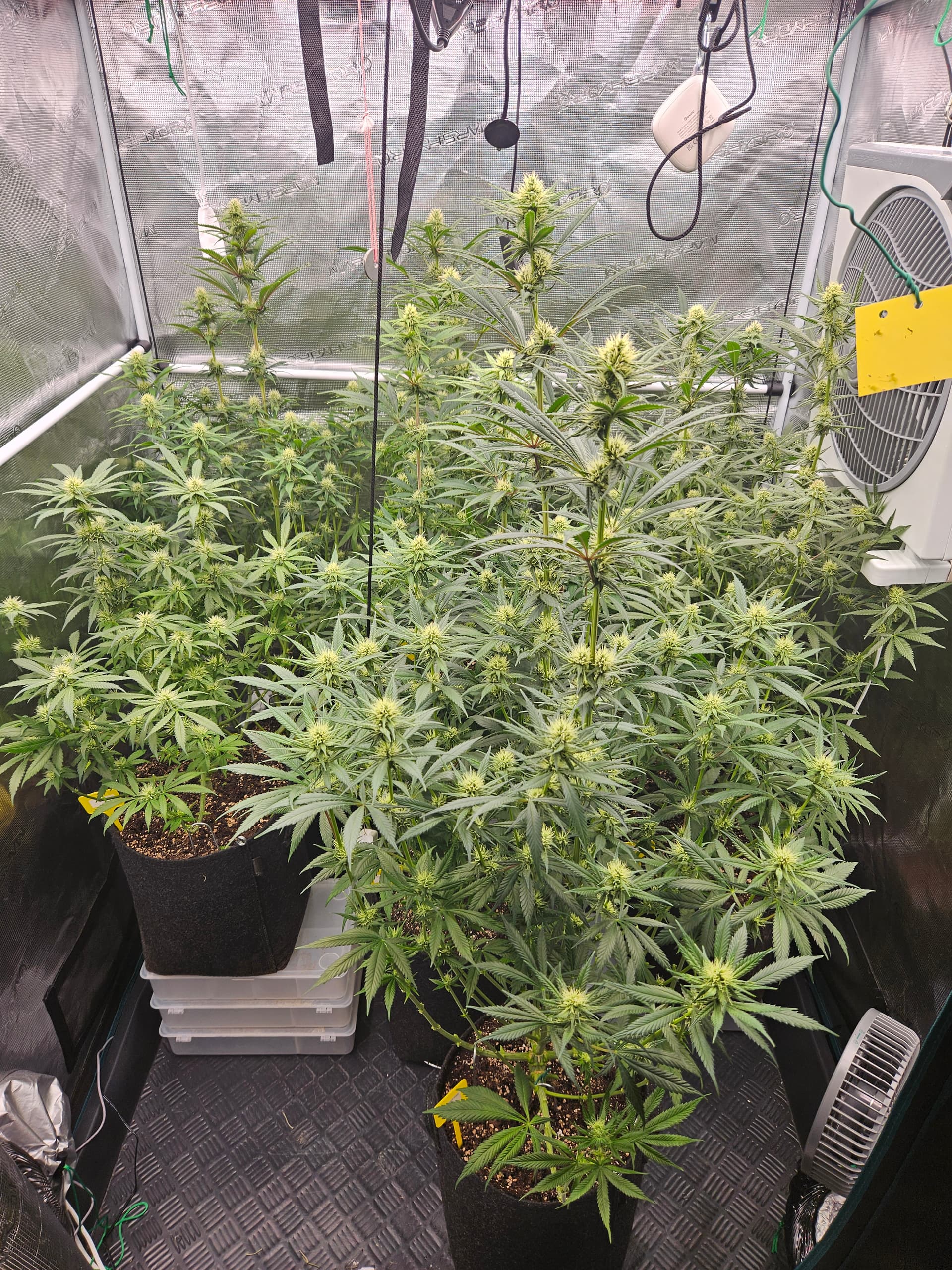 Zum senken deiner LF lege ich dir nah nochmal die grossen Sonnensegel zu beseitigen,hat den Vorteil daß das verschieden Buds mehr Licht bekommen und dein VPD verbessert. Bist ja doch schon wieder ziemlich dicht. Auch die Zirkulation der Luft wird besser,in dem Fall beugst du dem evtl Schimmelbefall vor. Wenn du den VPD verbesserst werden deine Buds auch besser. Sanlight hat dazu eine Studie kann man sich auf YT anschauen ist sehr interessant.