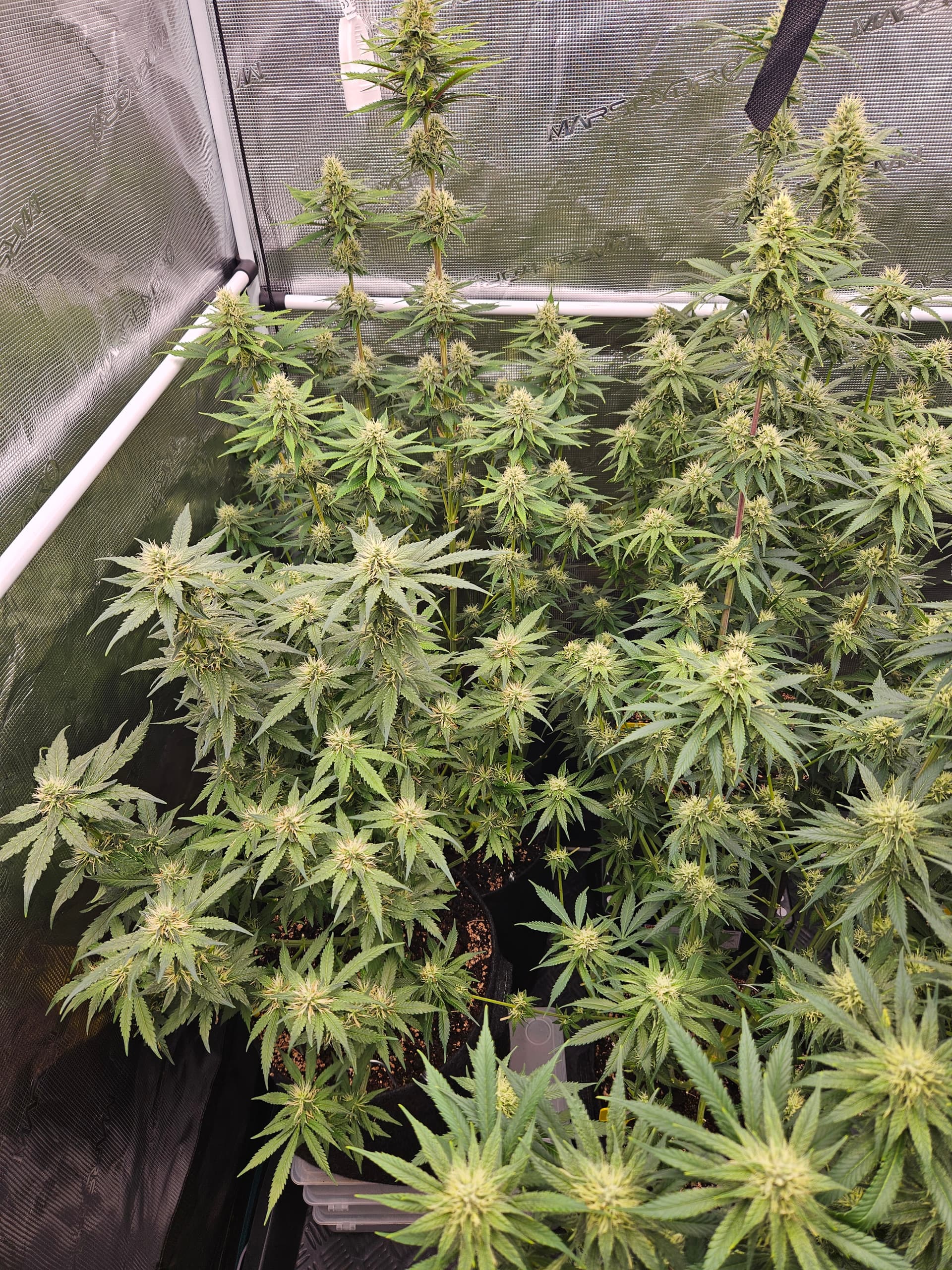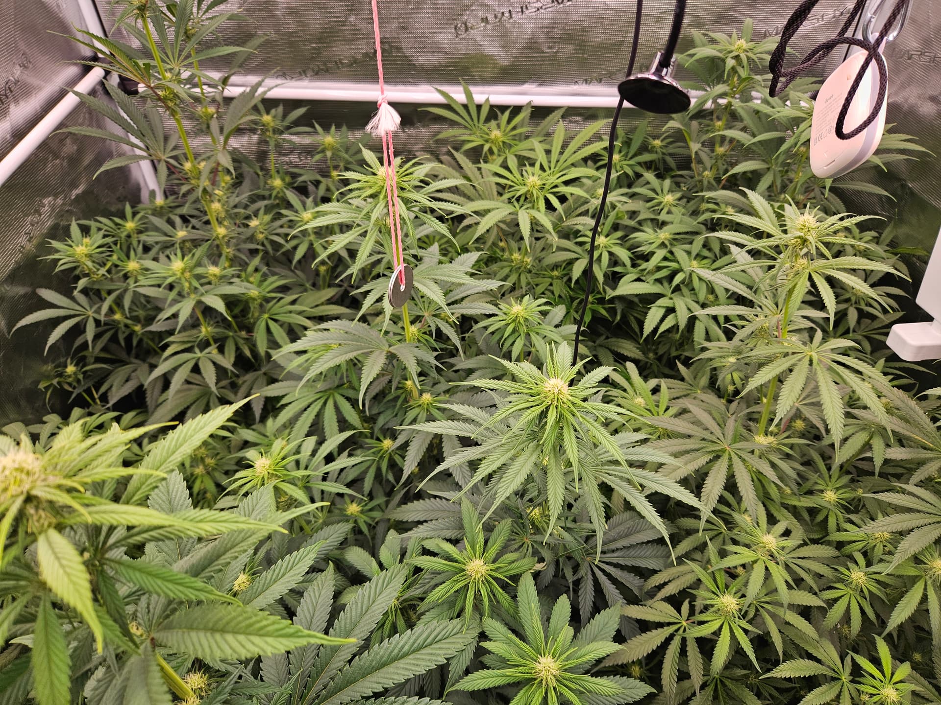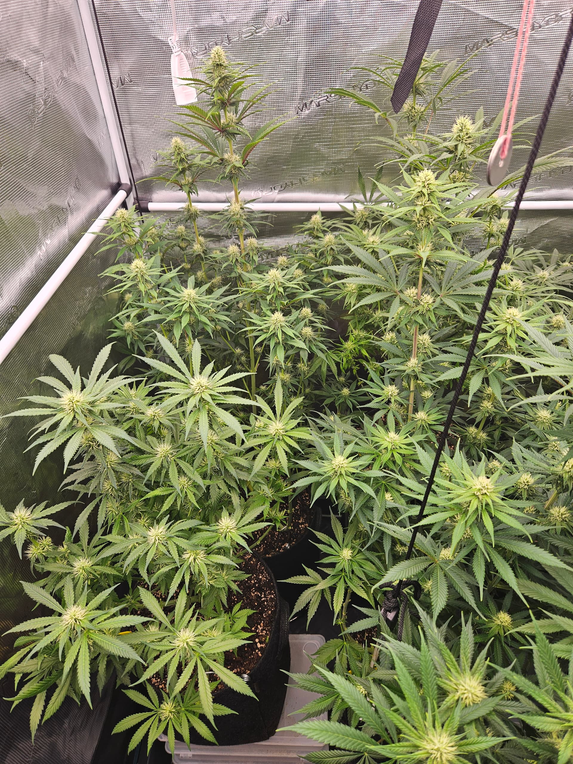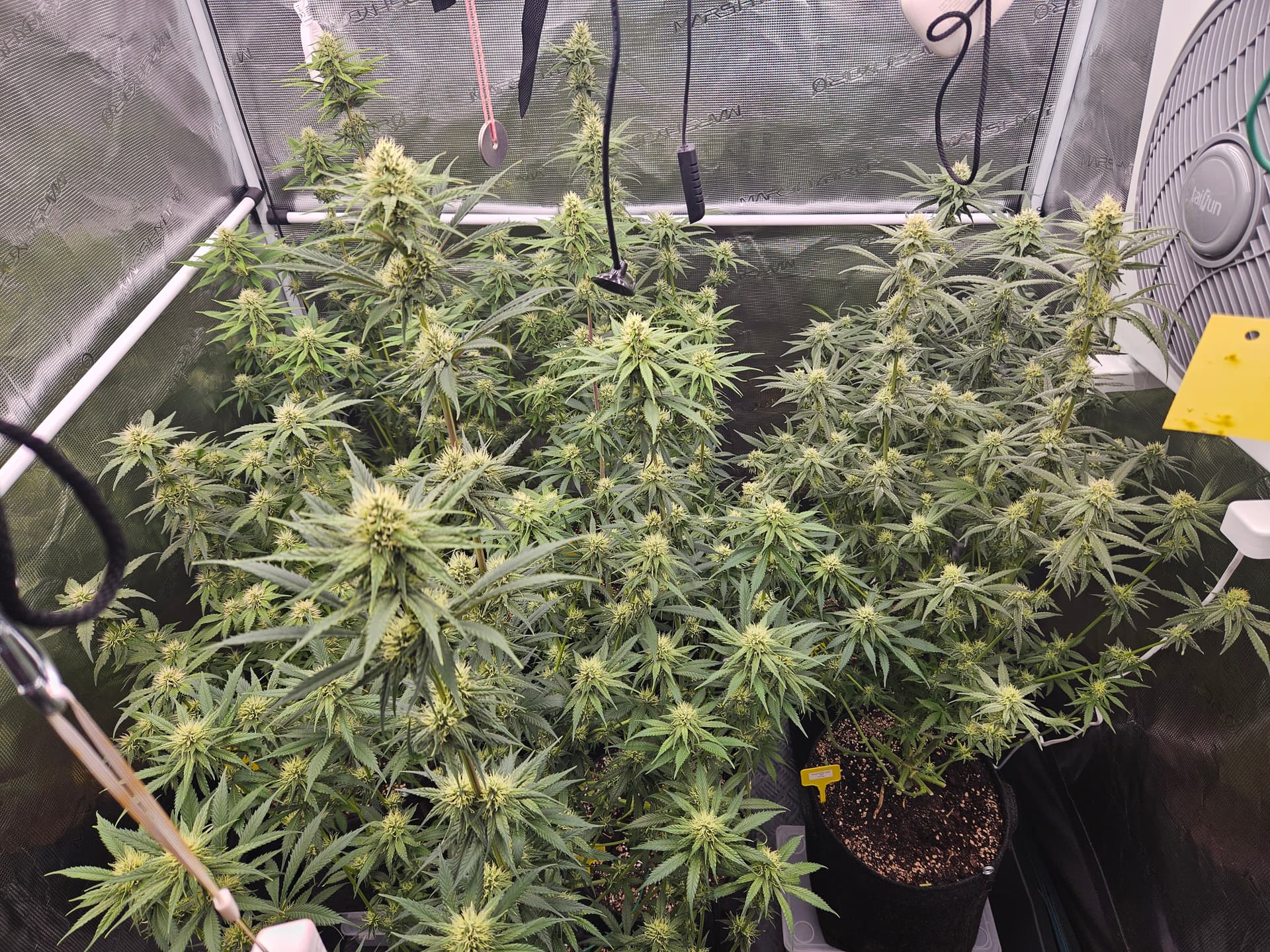 Zum senken deiner LF lege ich dir nah nochmal die grossen Sonnensegel zu beseitigen,hat den Vorteil daß das verschieden Buds mehr Licht bekommen und dein VPD verbessert. Bist ja doch schon wieder ziemlich dicht. Auch die Zirkulation der Luft wird besser,in dem Fall beugst du dem evtl Schimmelbefall vor. Wenn du den VPD verbesserst werden deine Buds auch besser. Sanlight hat dazu eine Studie kann man sich auf YT anschauen ist sehr interessant.