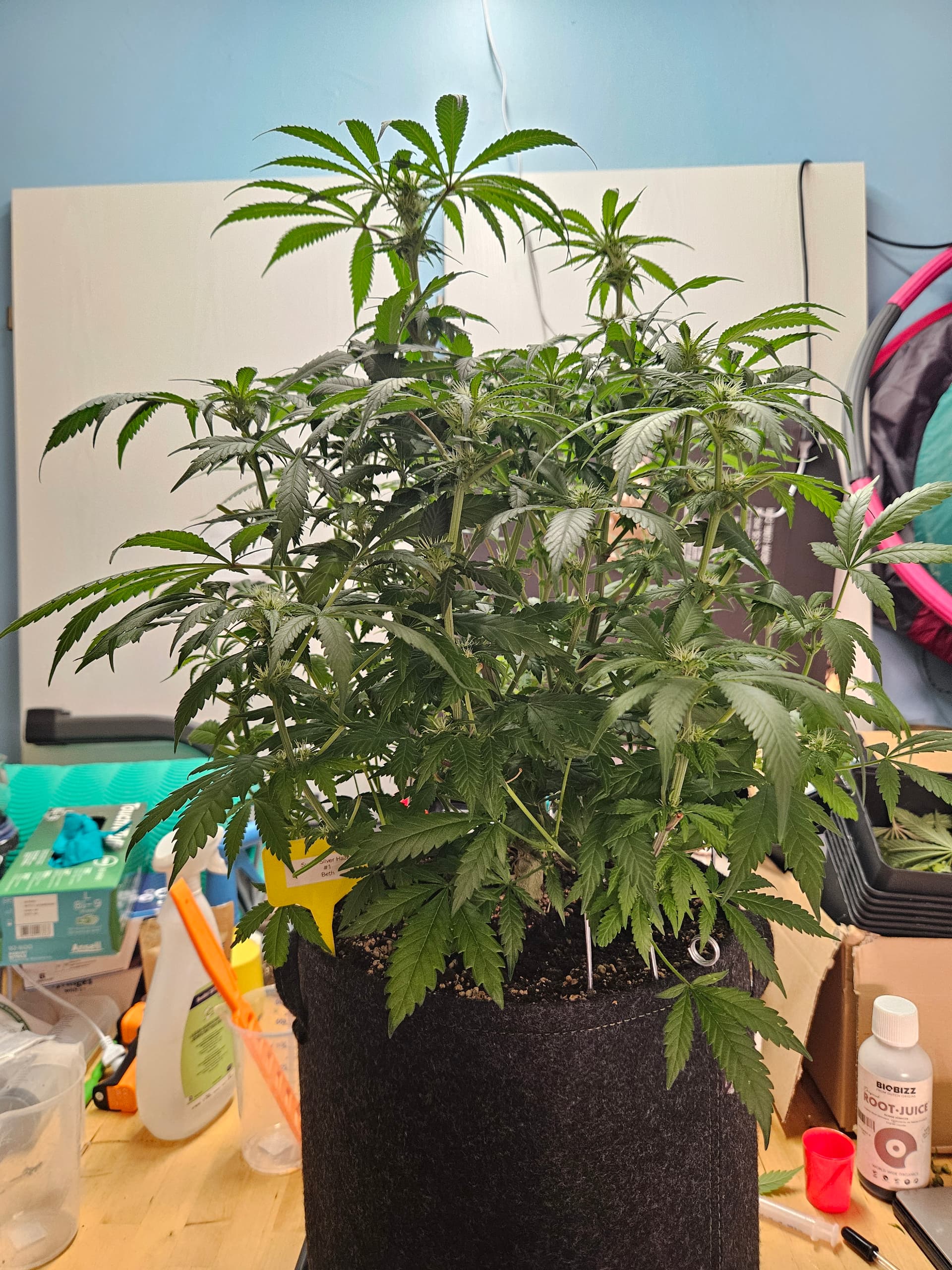 Nur gestern beim gießen kann man festhalten das die Super Silver Haze es nun sind, welche deutlich kräftiger riechen und auch deren Blätter „funkeln“ auch schon deutlich kräftiger.
