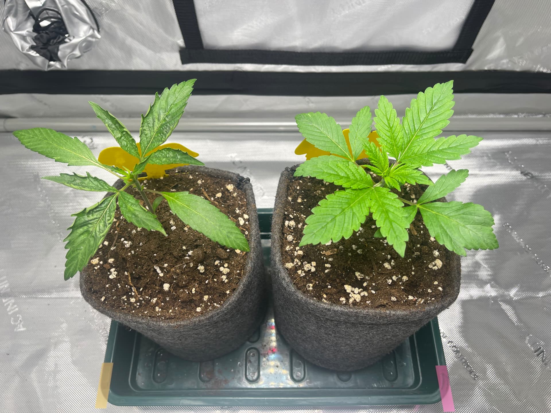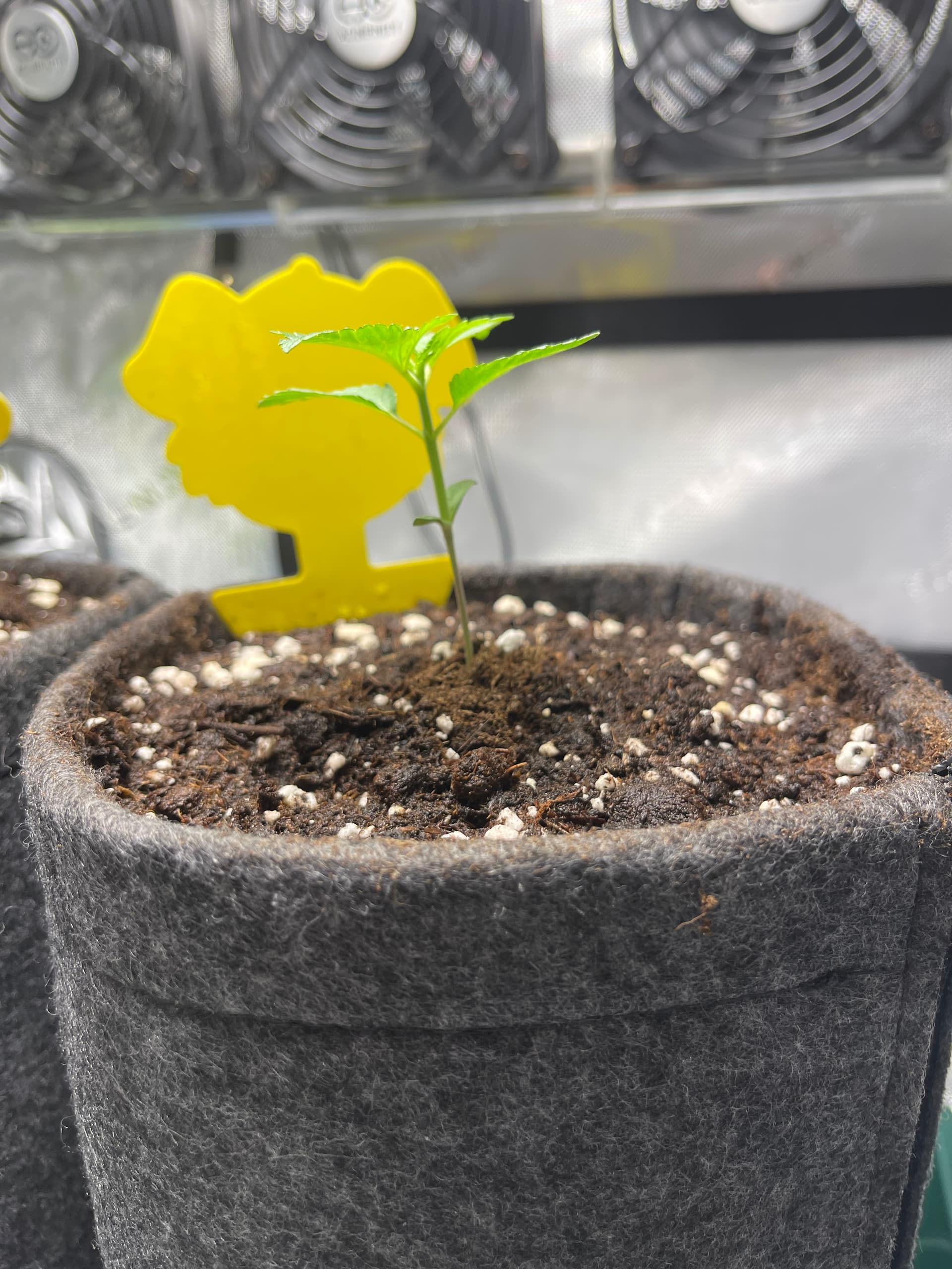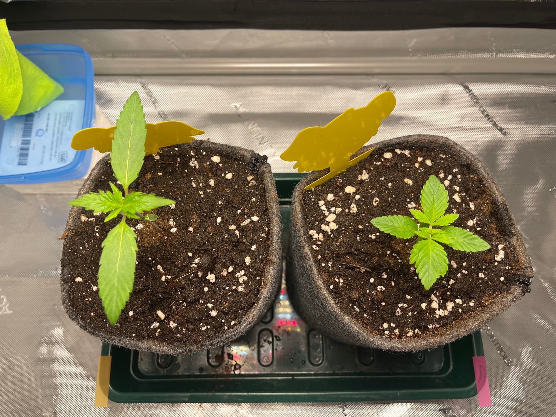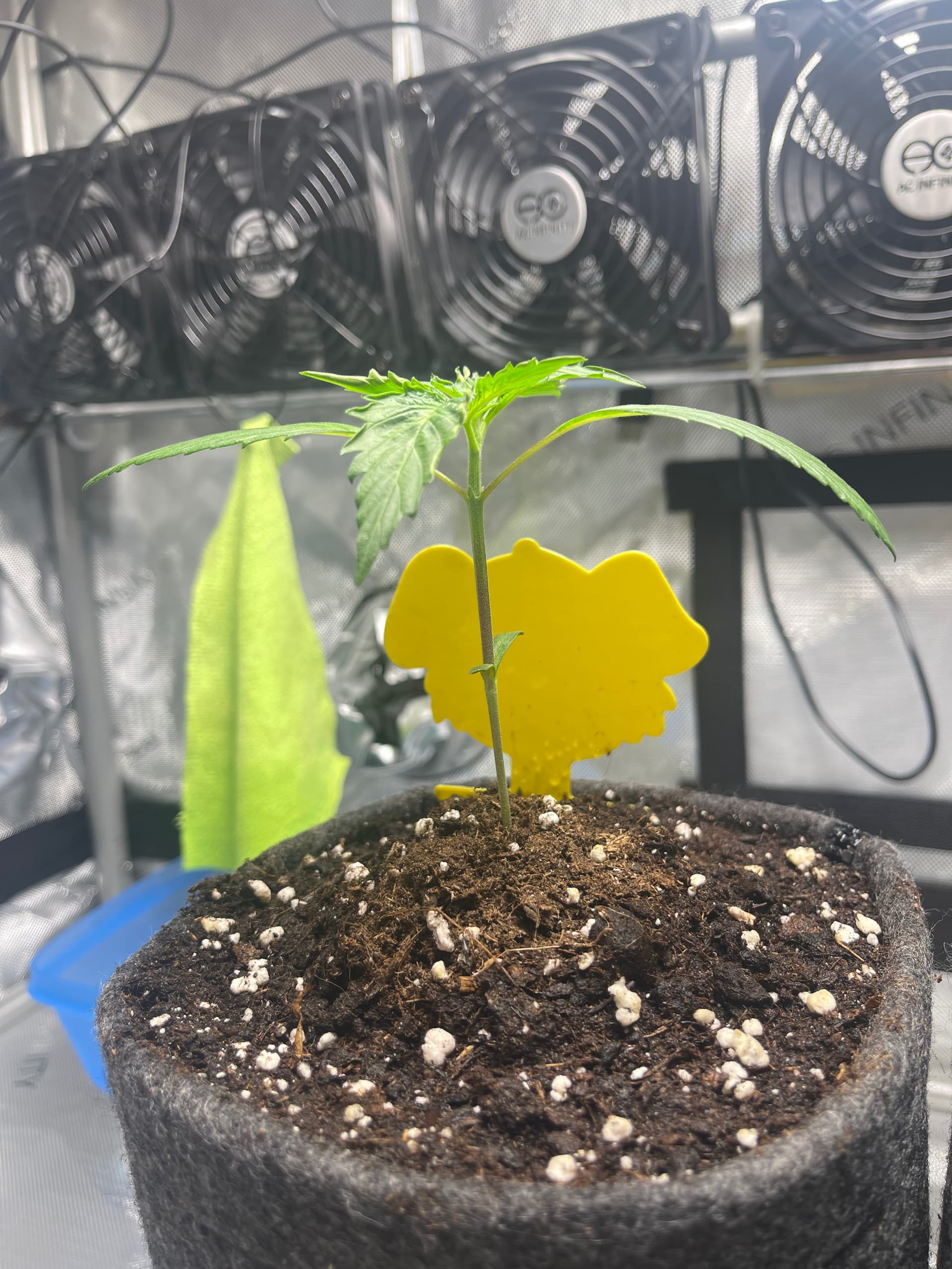 Die Ladies scheinen etwas zu spargeln. Licht ist nun etwa 35cm entfernt und die Pflänzchen bekommen ca. 250 PPFD. SFV Dog zeigt mir nur den Rücken… hoffentlich streckt sich das Köpfchen noch nach oben