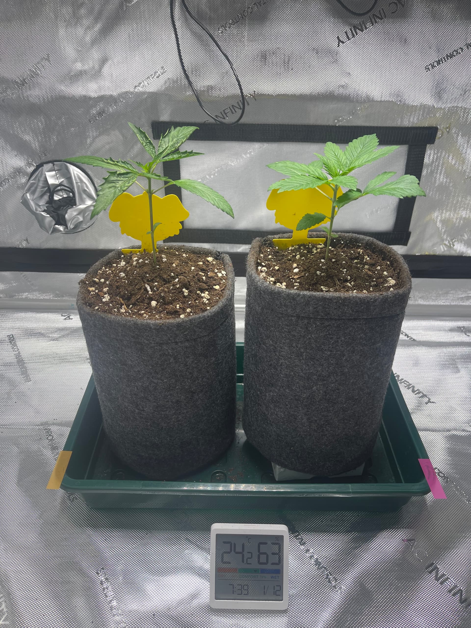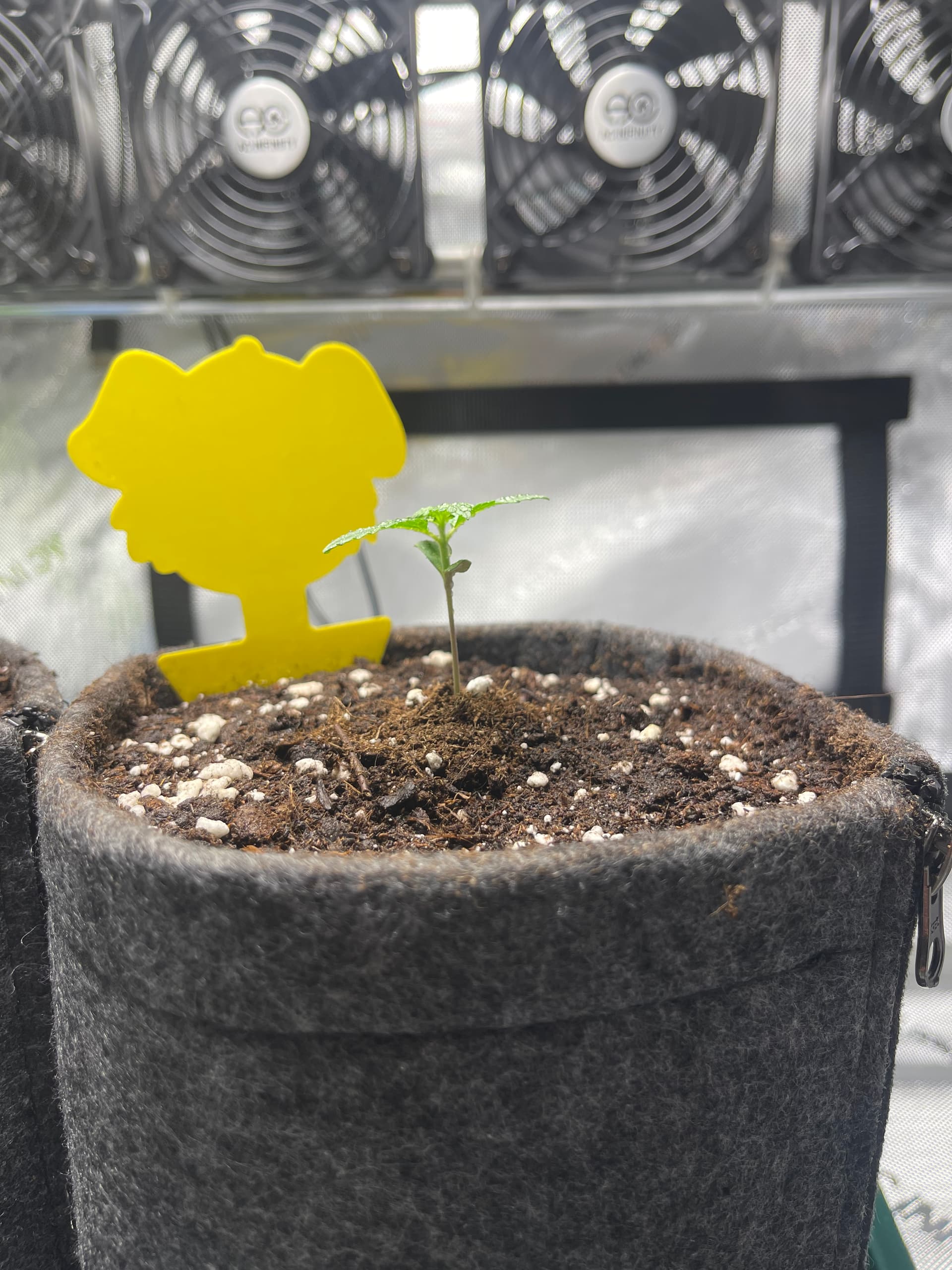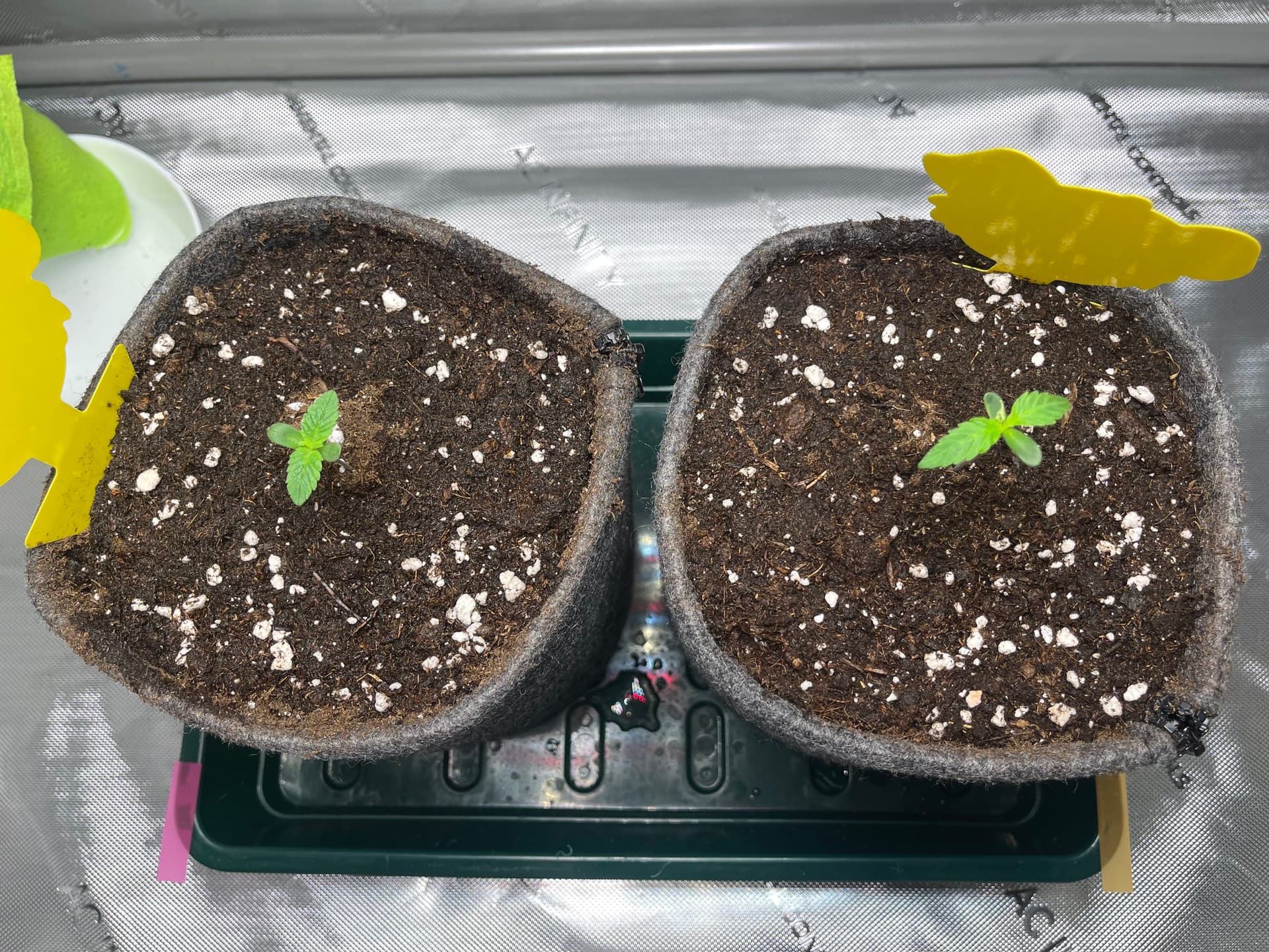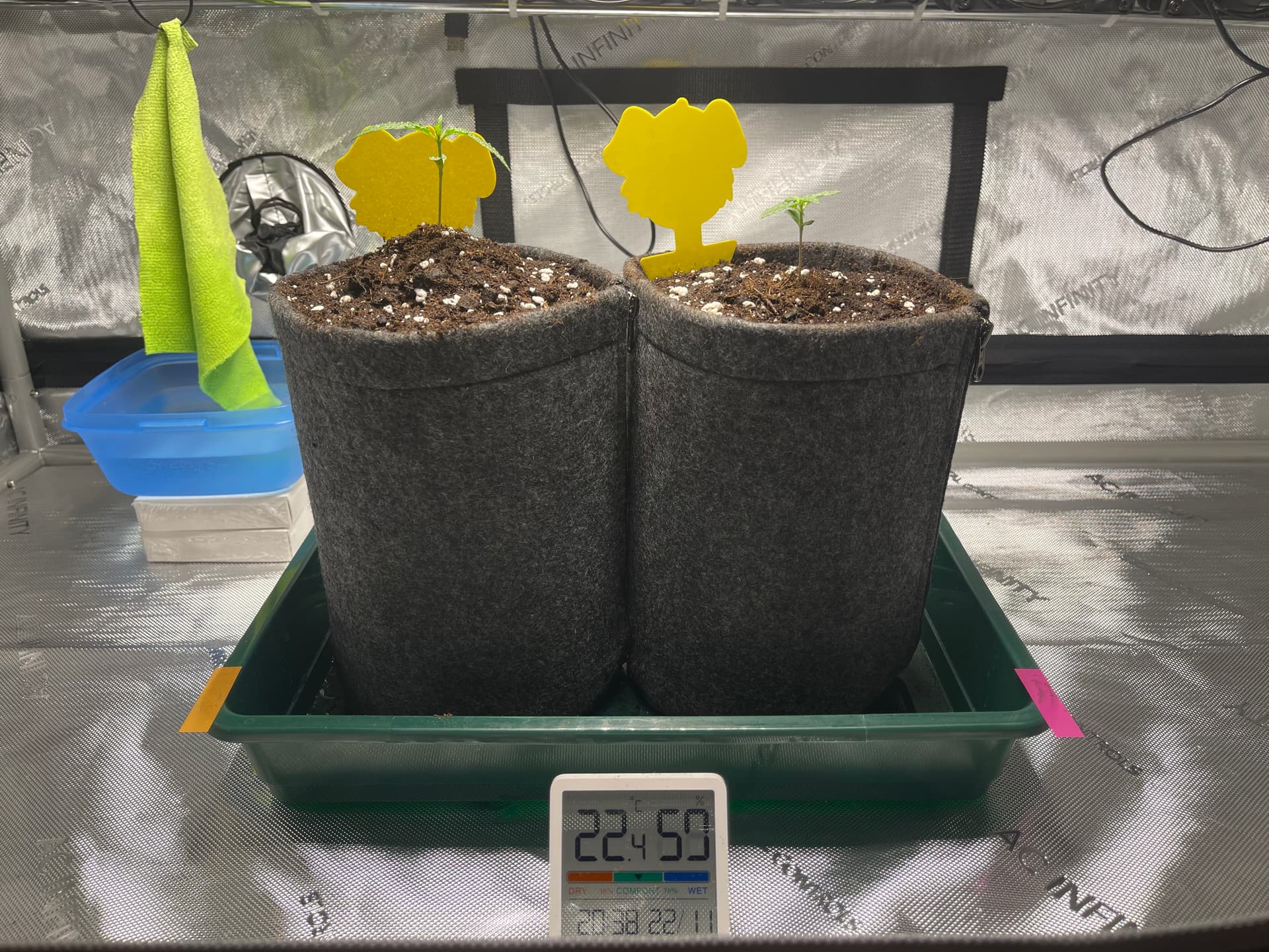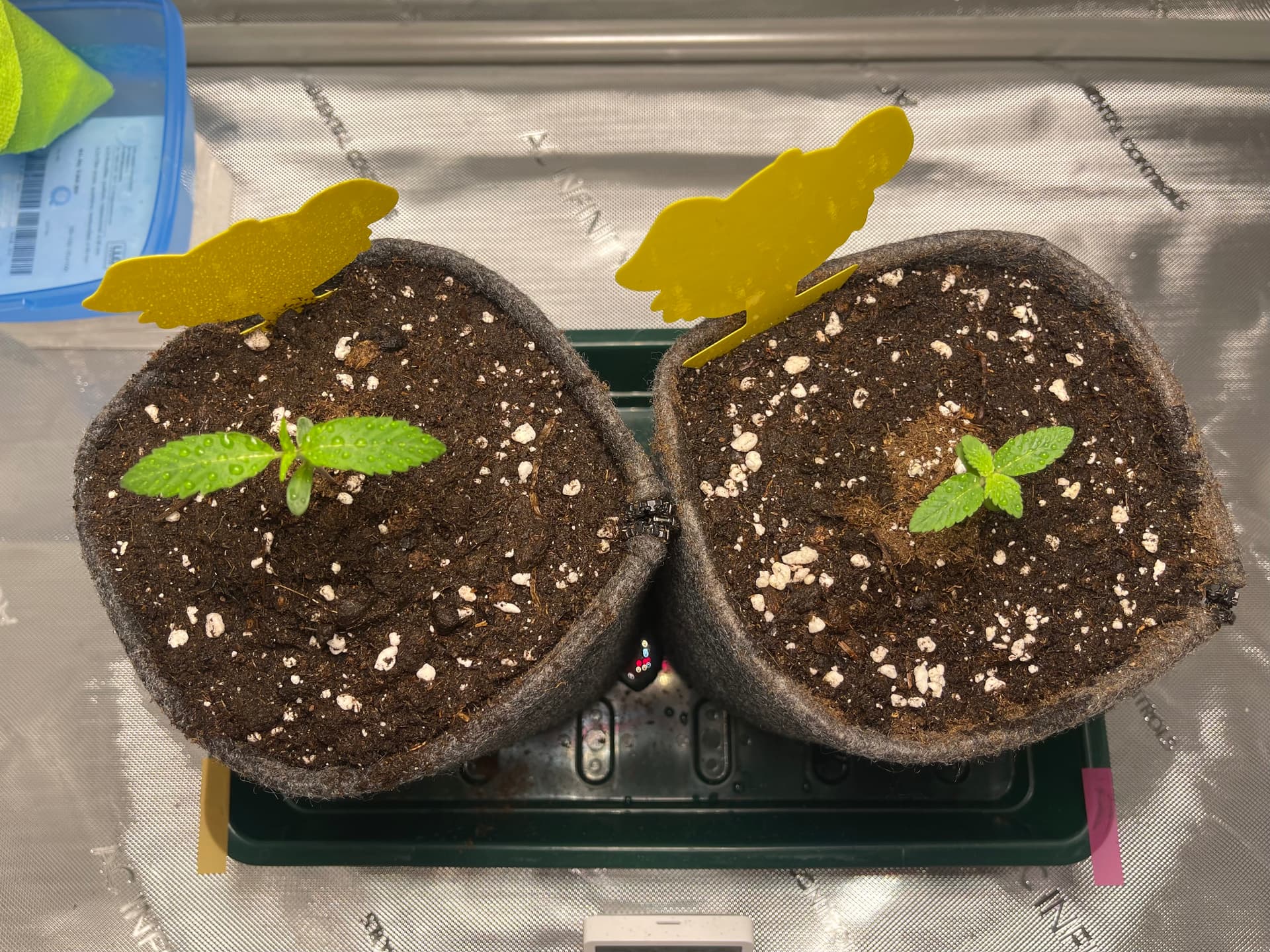 Die Ladies scheinen etwas zu spargeln. Licht ist nun etwa 35cm entfernt und die Pflänzchen bekommen ca. 250 PPFD. SFV Dog zeigt mir nur den Rücken… hoffentlich streckt sich das Köpfchen noch nach oben