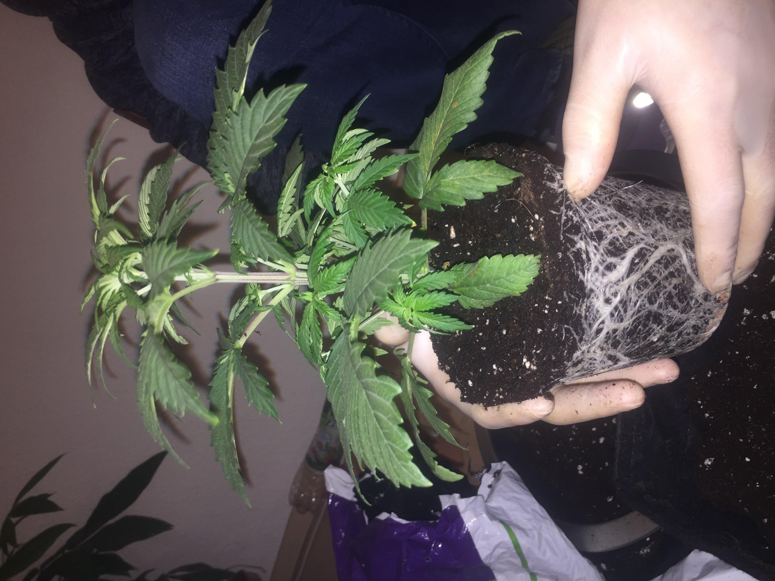 Ach ja wir haben die gekeimten Samen in in Mini Töpfe gesetzt mit anzuchterde! Danach in einen 1 Blumentopf ausm Baumarkt mit anzucht und light mix (50/50%) umgesetzt und ein Tag später erst gegossen weil die Erde ein hohe Grundffeuchte enthielt. Wir gaben bei diesem gießen das erst mal wurzeldünger und grow von Biobizz hinzu! Wurzeldünger nur beim ersten Gießen, danach nur noch Grow! Und dann wie oben geschrieben gestern in den 8L Stoff-Gronest Topf umgesetzt weil sie wie oben im Bild zu sehen gut durchwurzelt waren, im 8L Topf ist eine 1cm Seramisschicht unter der Erde aus (50/50 mix aus BioBizz Lightmix und Plagron Lightmix) weiter wird gegossen mit growdünger von Biobizz!