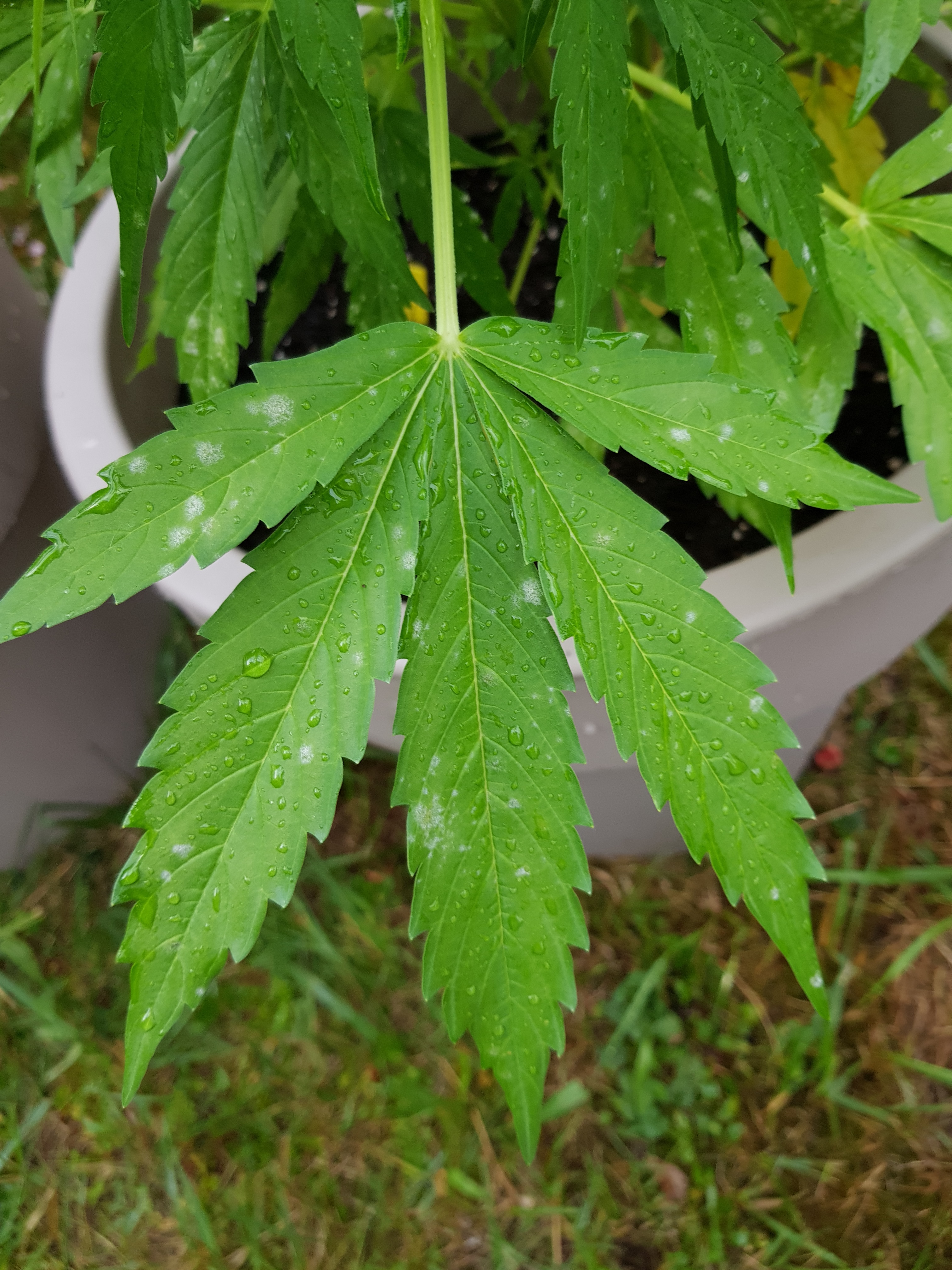 Eine der Pflanzen hat es wohl erwischt. Vor dem Regen waren ein Teil der Blätter auch mit dem weißen Staub überzogen. Ich denke jetzt über die Wasser/Buttermilch-Lösung nach. Insgesamt macht die Pflante auch einen eher schlappen Eindruck: