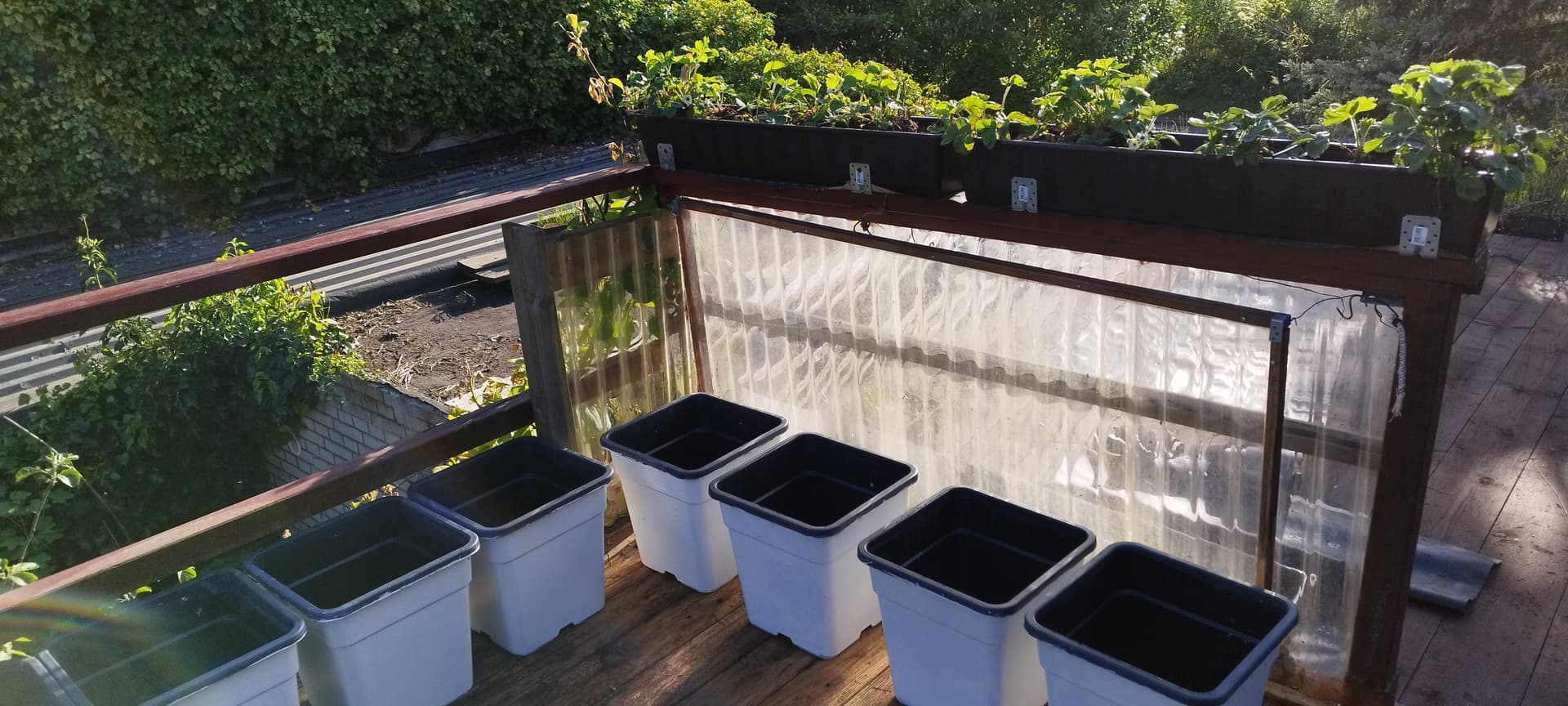 Die Pötte: 25 l , dieses Jahr weiss beklebt, damit das Wurzelwerk nicht wieder " geschmort" wird.