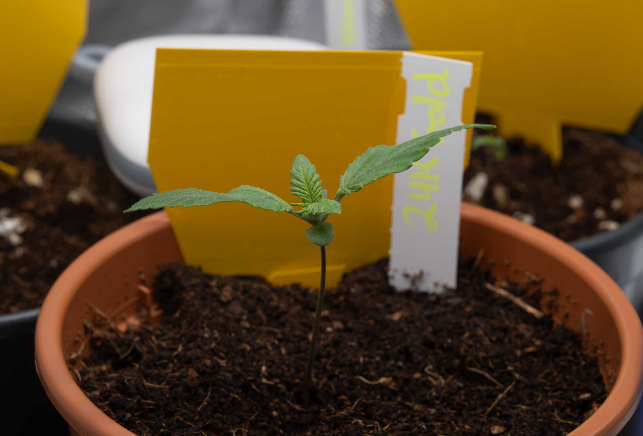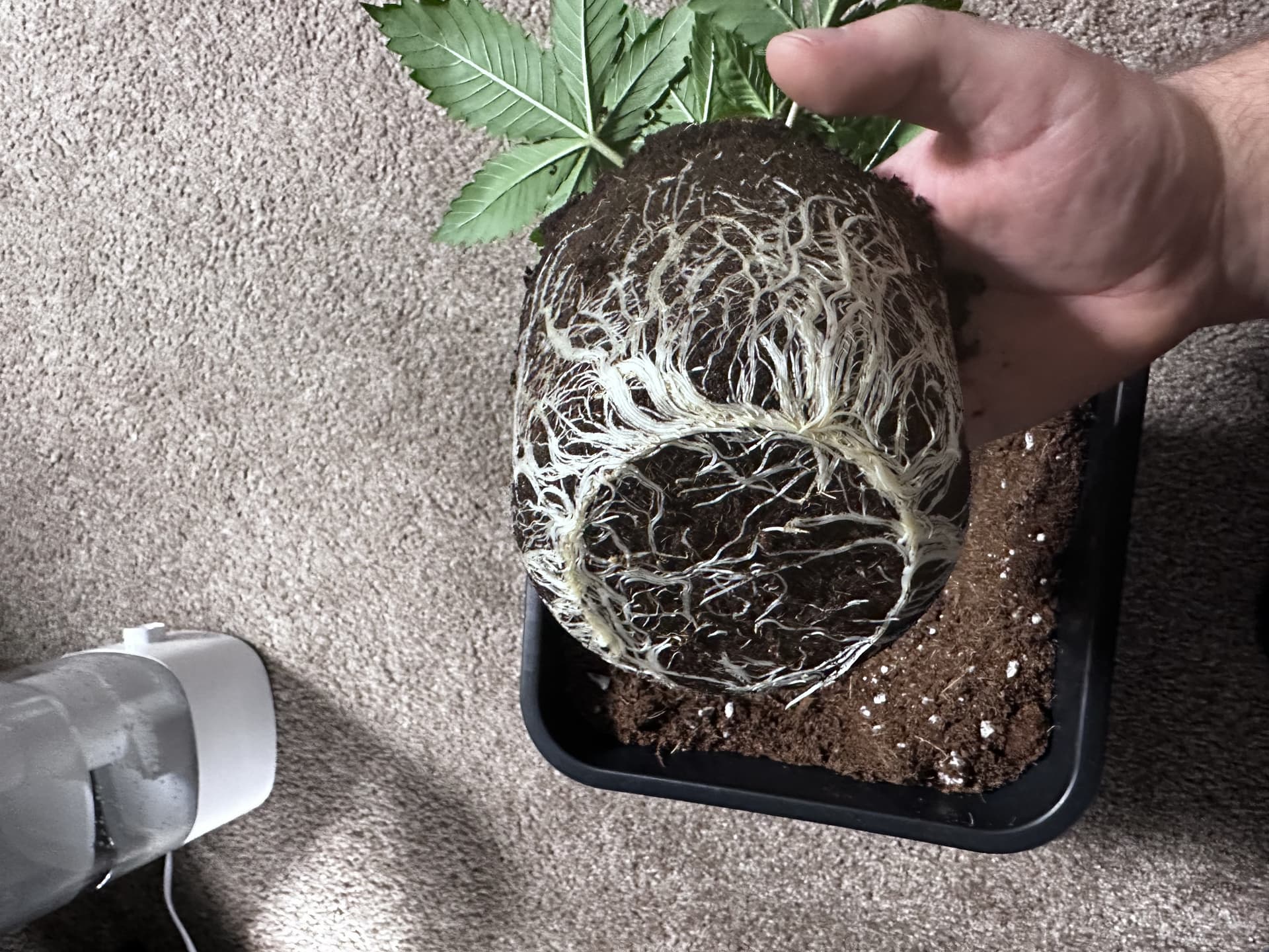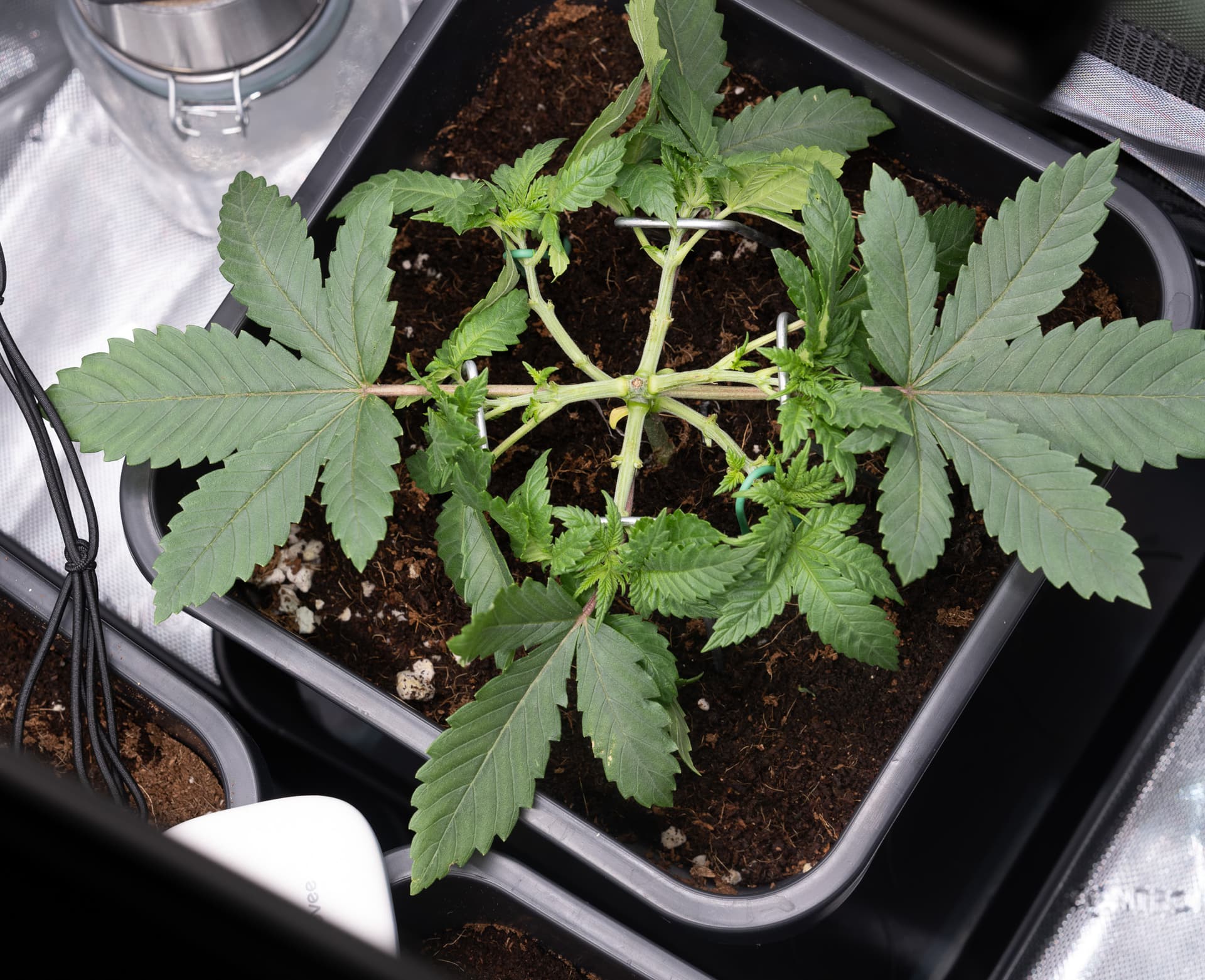 Ich gieße jetzt alle Pflanzen täglich mit einer 1000ppm Nährlösung. Das entspricht dem Advanced Nutrients Schema der vierten Woche. Wurzelstims habe ich beim Umtopfen noch einmal mitgegeben.
