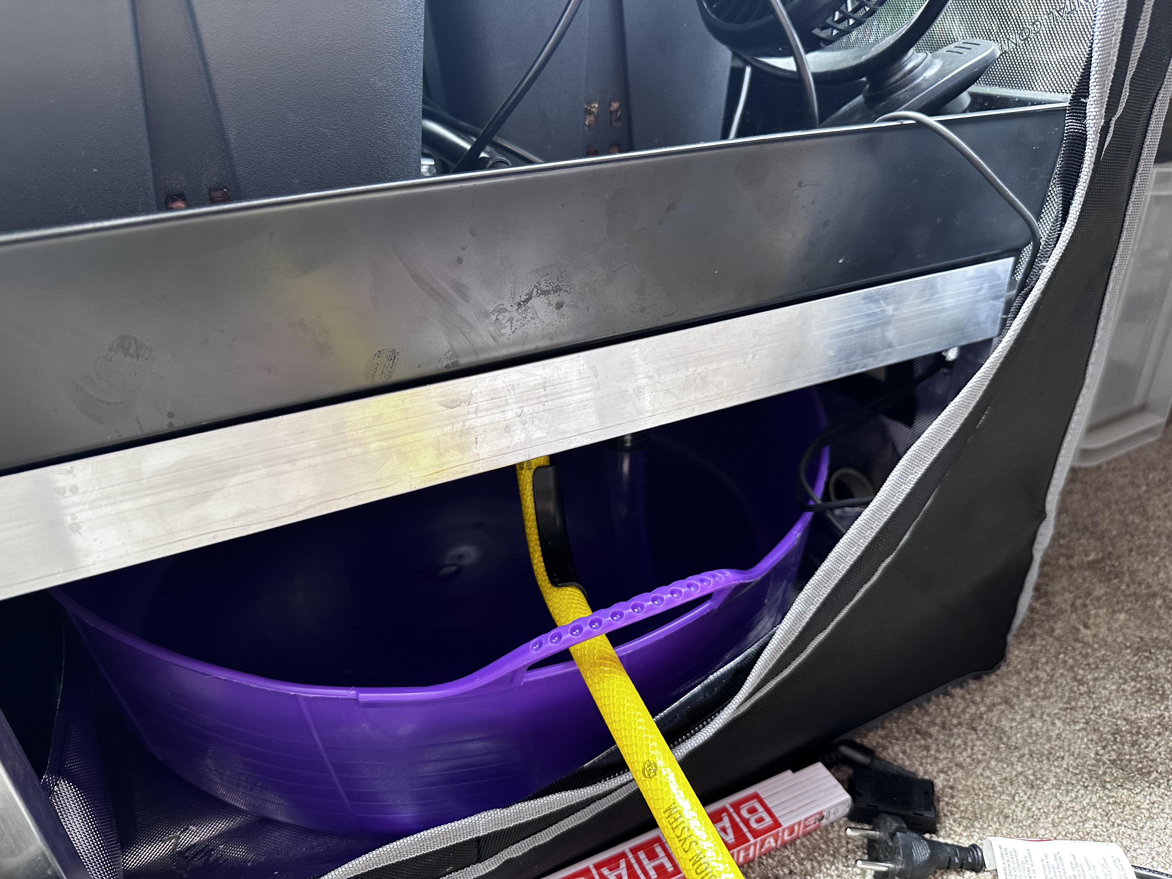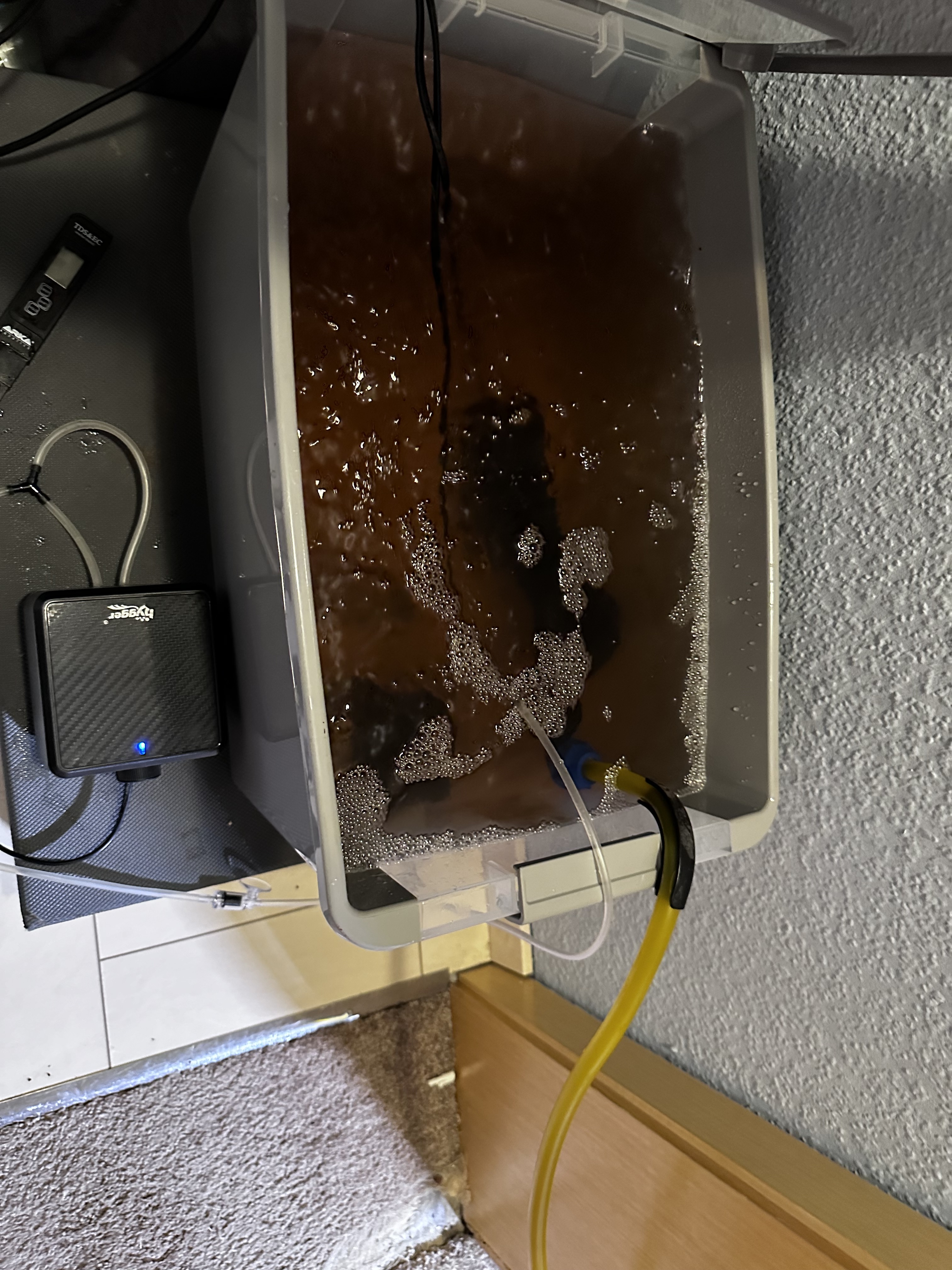 Der Nährstofftank steht jetzt auf einem Rollbrett und ist voll modular :D. Abstöpseln, im Bad auskippen + reinigen und in der Küche per Osmoseanlage auffüllen