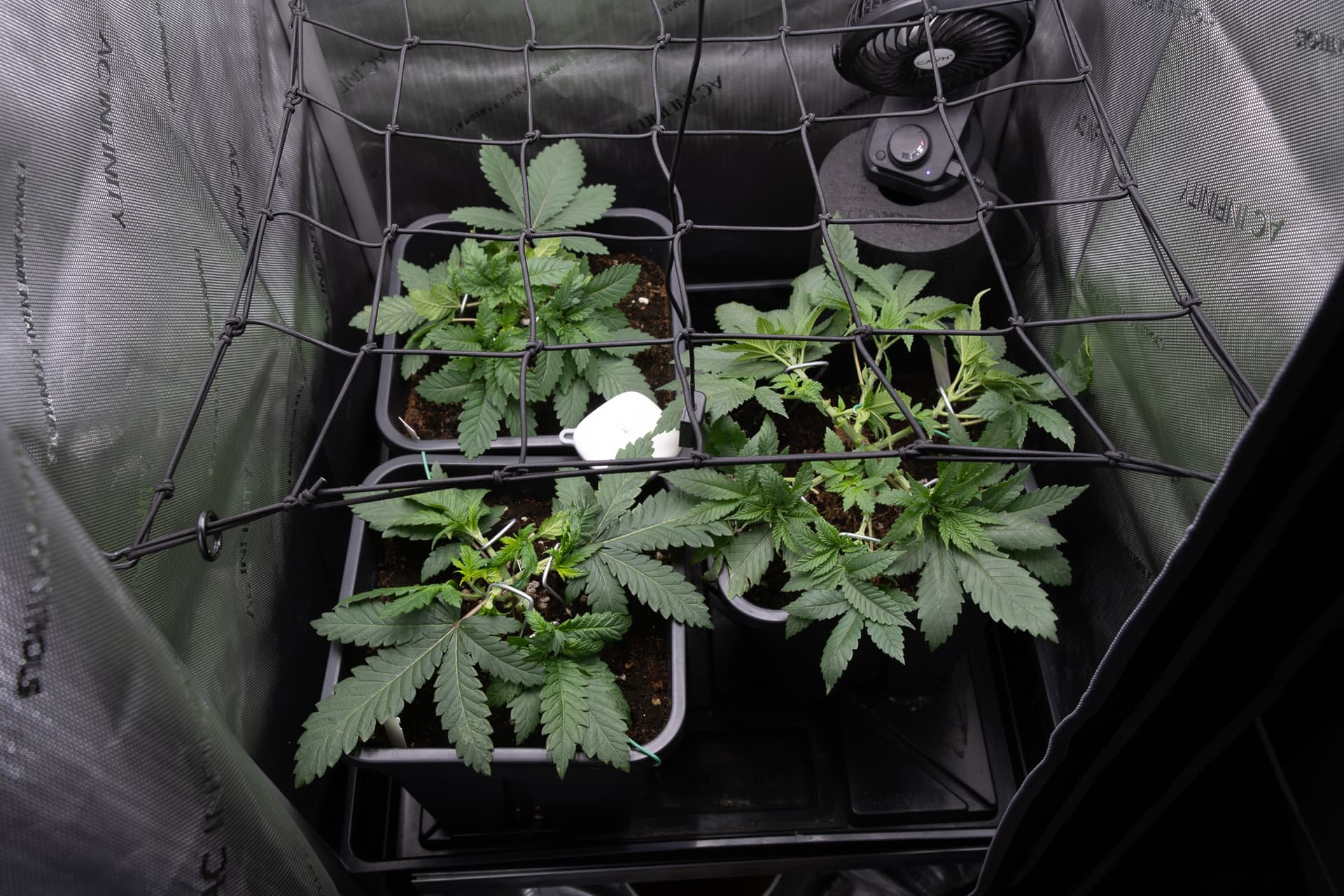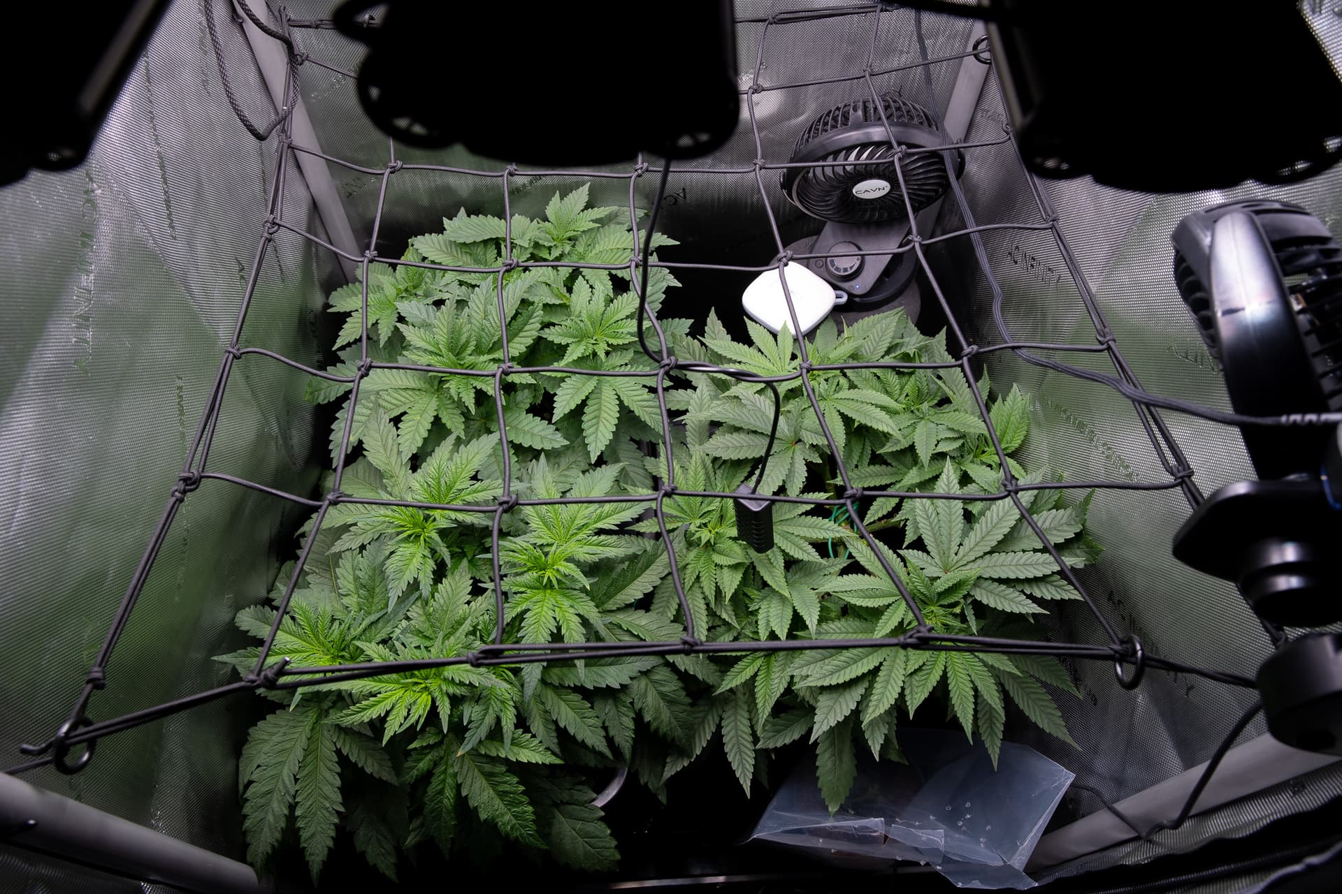 Das ScrogNetz hab ich einmal nach oben gezogen. Wird ja sowieso nur zum Verteilen der Triebe benutzt. Am Ende muss ich da aber nicht ganz so viel rumfummeln um es aus den Pflanzen zu bekommen.