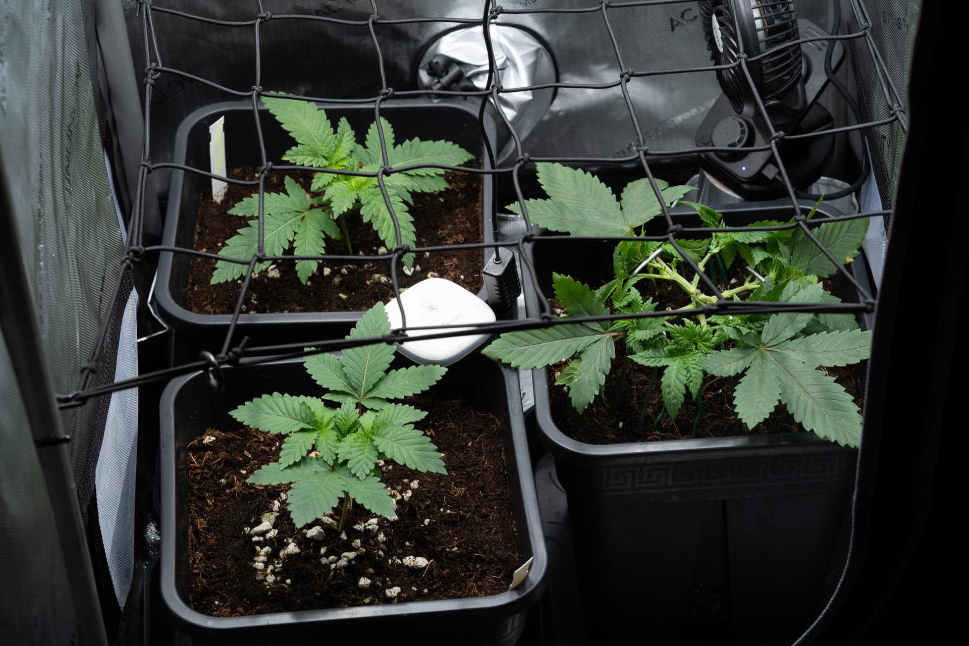 Mein Plan die 24k schön klein zu halten klappt wunderbar. Rechts ist die zu sehen. die beiden linken stretchen nämlich deutlich weniger und ich möchte die beiden Pflanzen links gerne etwas höher haben, damit die Pflanzen nach dem Stretch in etwa gleich Hoch sind.