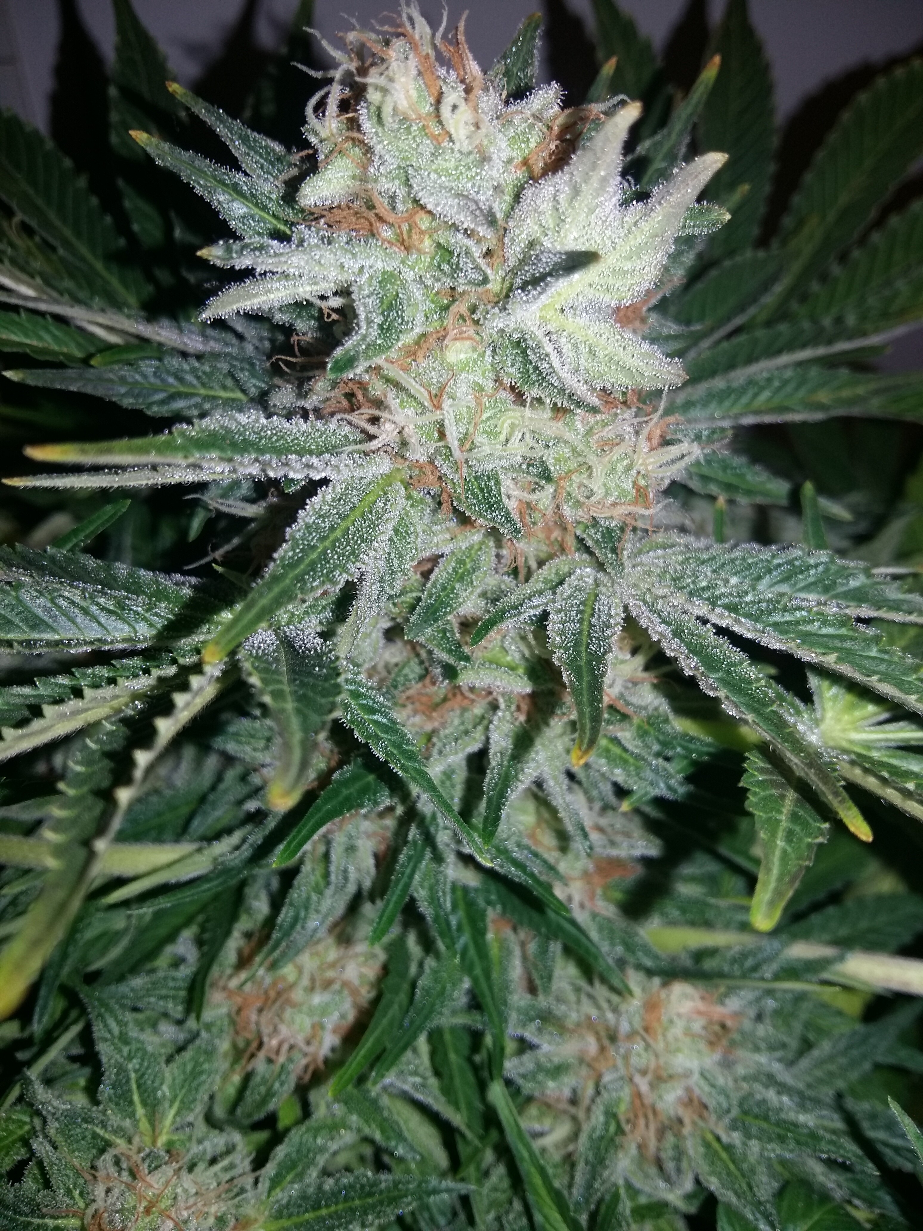 Blütetag 50 ist erreicht und der Grow fährt so langsam in Richtung Zielgeraden! In den letzten zwei Wochen gab es wenig zu tun, außer zu gießen und den Mädels beim „budden“ zuzusehen. Hier&Da wurde immer mal etwas Blattwerk entfernt, insgesamt aber überschaubar. Die „Gieß-Frequenz“ wurde seit dem letzten Wässern auch wieder etwas zurückgefahren, da sie den Verbrauch etwas herunterfahren. Der Reifegrad der Pflanzen ist unterschiedlich - Die kleine im 7L Topf wurde vor ein paar Tagen geerntet, war ne spontane Entscheidung…Hab in der Aktion vergessen Bilder von ihr zu machen, aber spektakulär war sie nicht unbedingt. Da mein Weed leider komplett aufgebraucht war, habe ich gehandelt…Sie war etwas früh dran, klar…Letztlich aber im Rahmen. Das Gewicht hat mich überrascht, war mehr als erwartet!