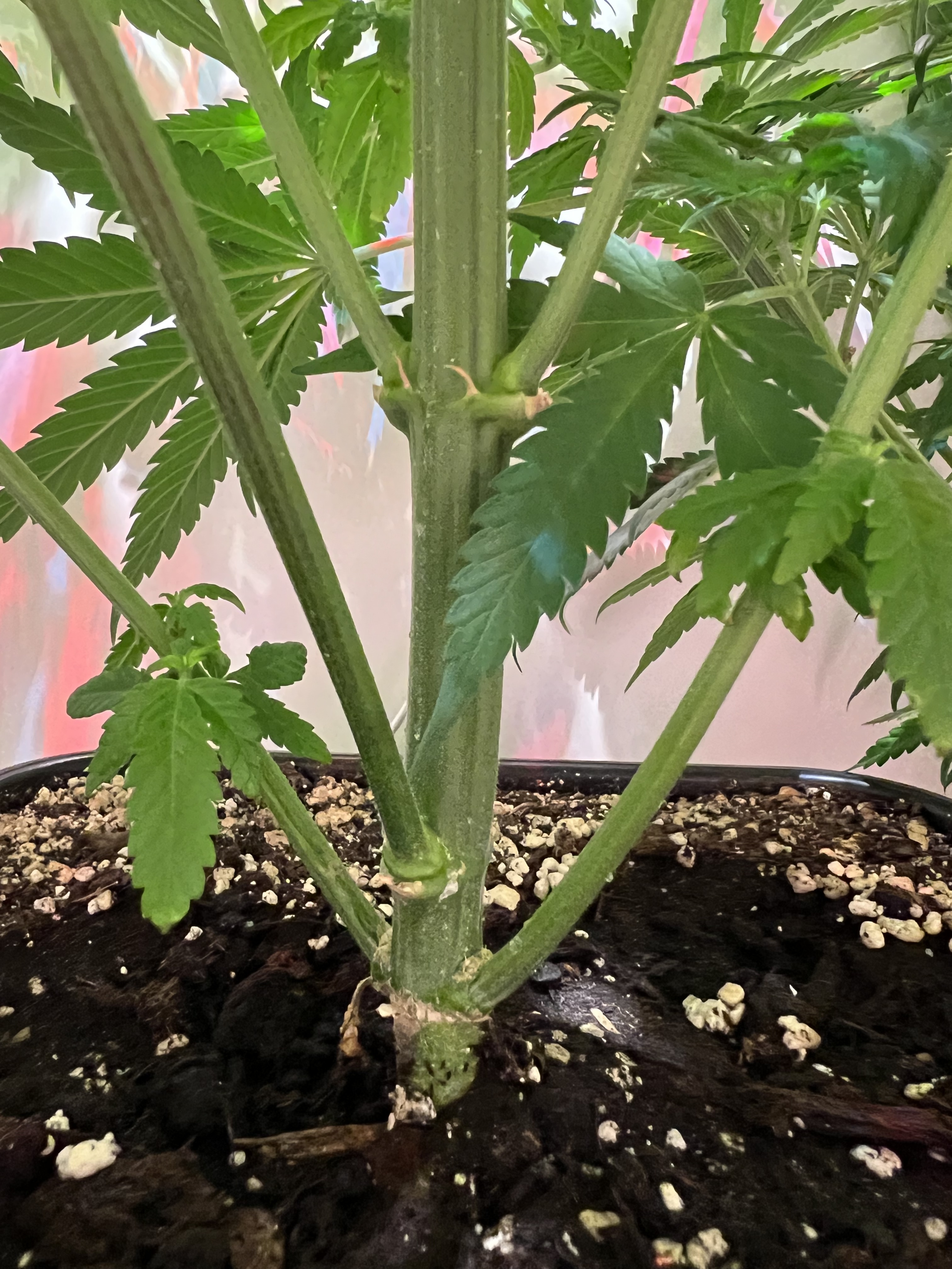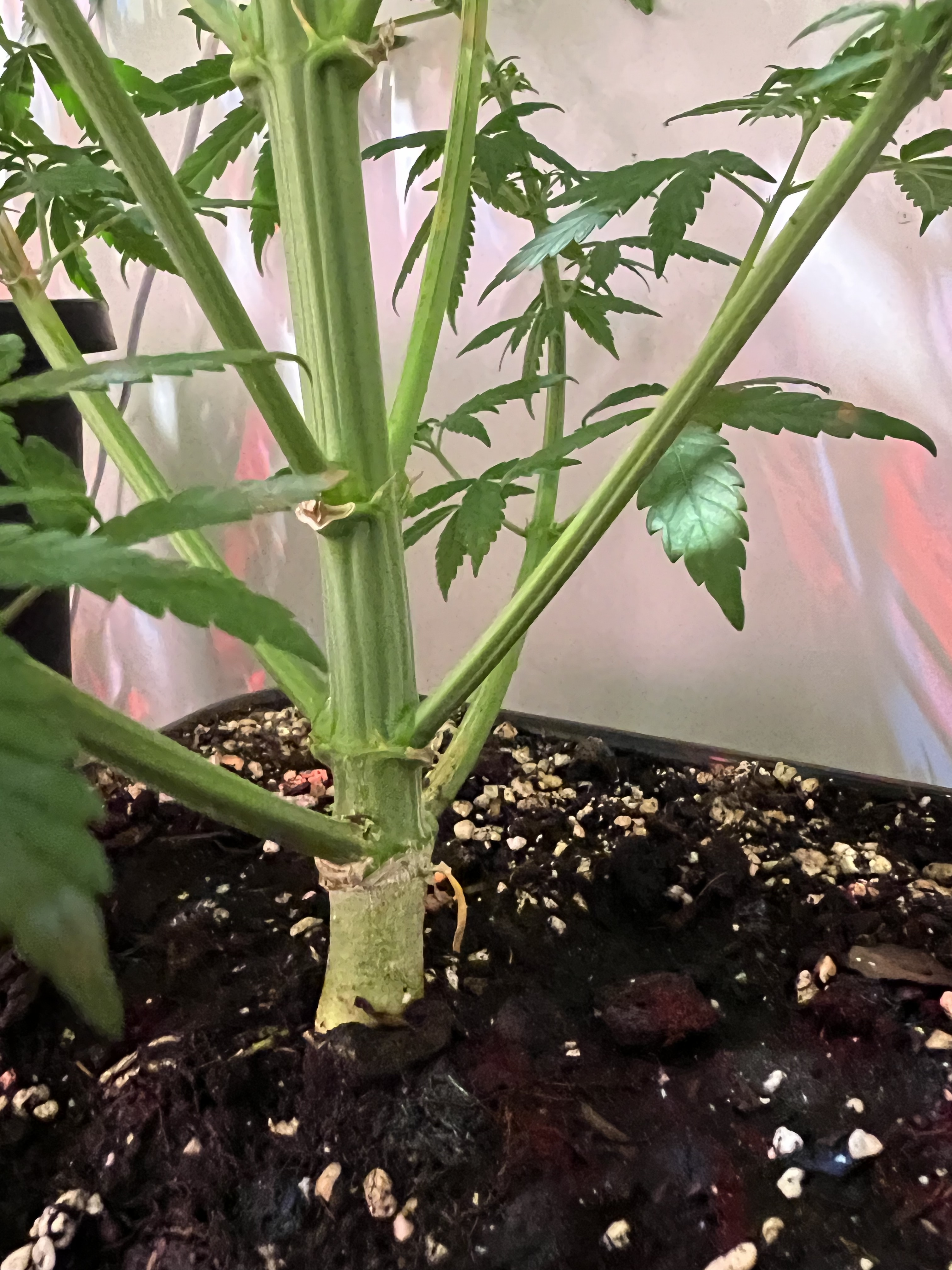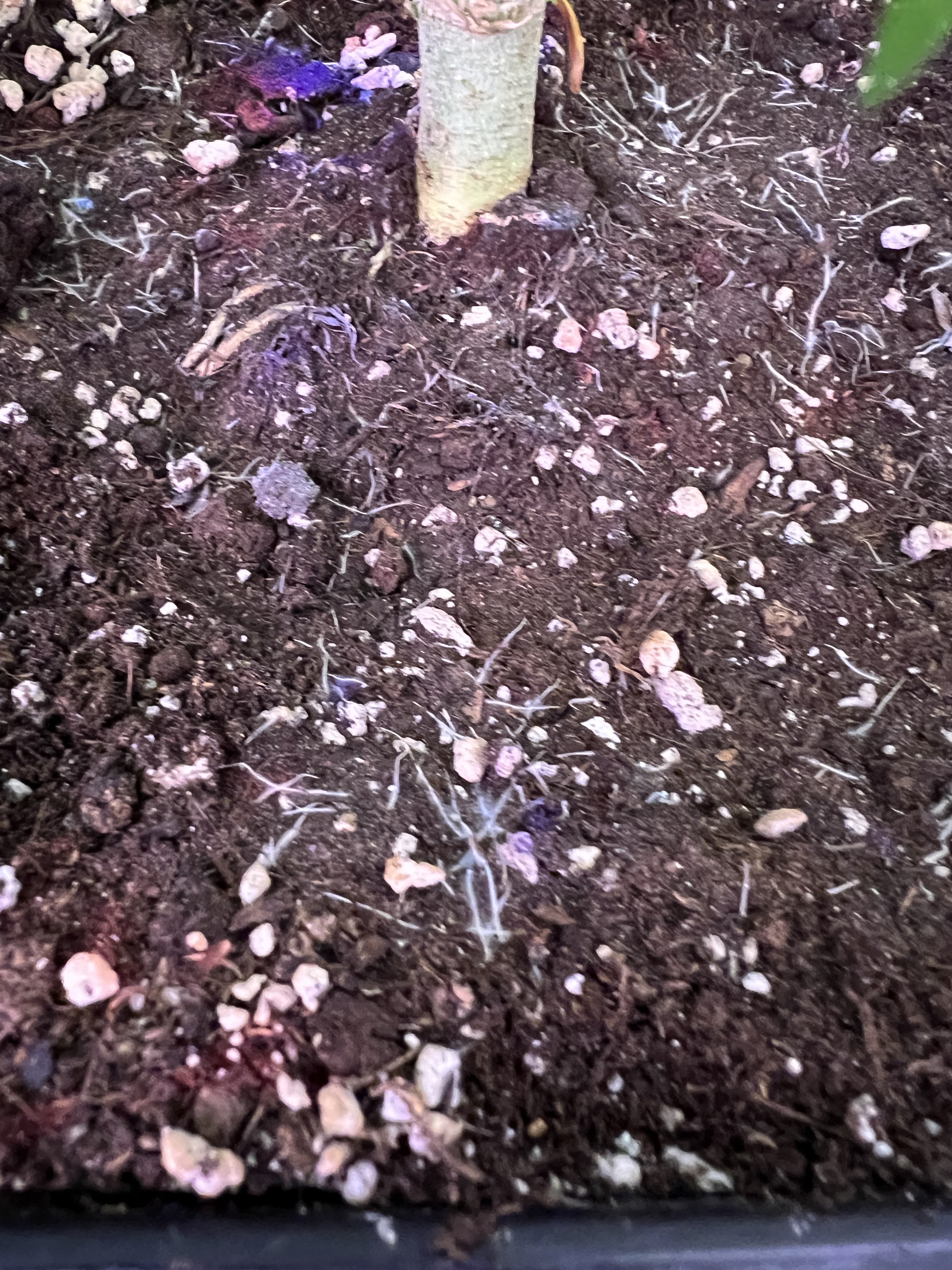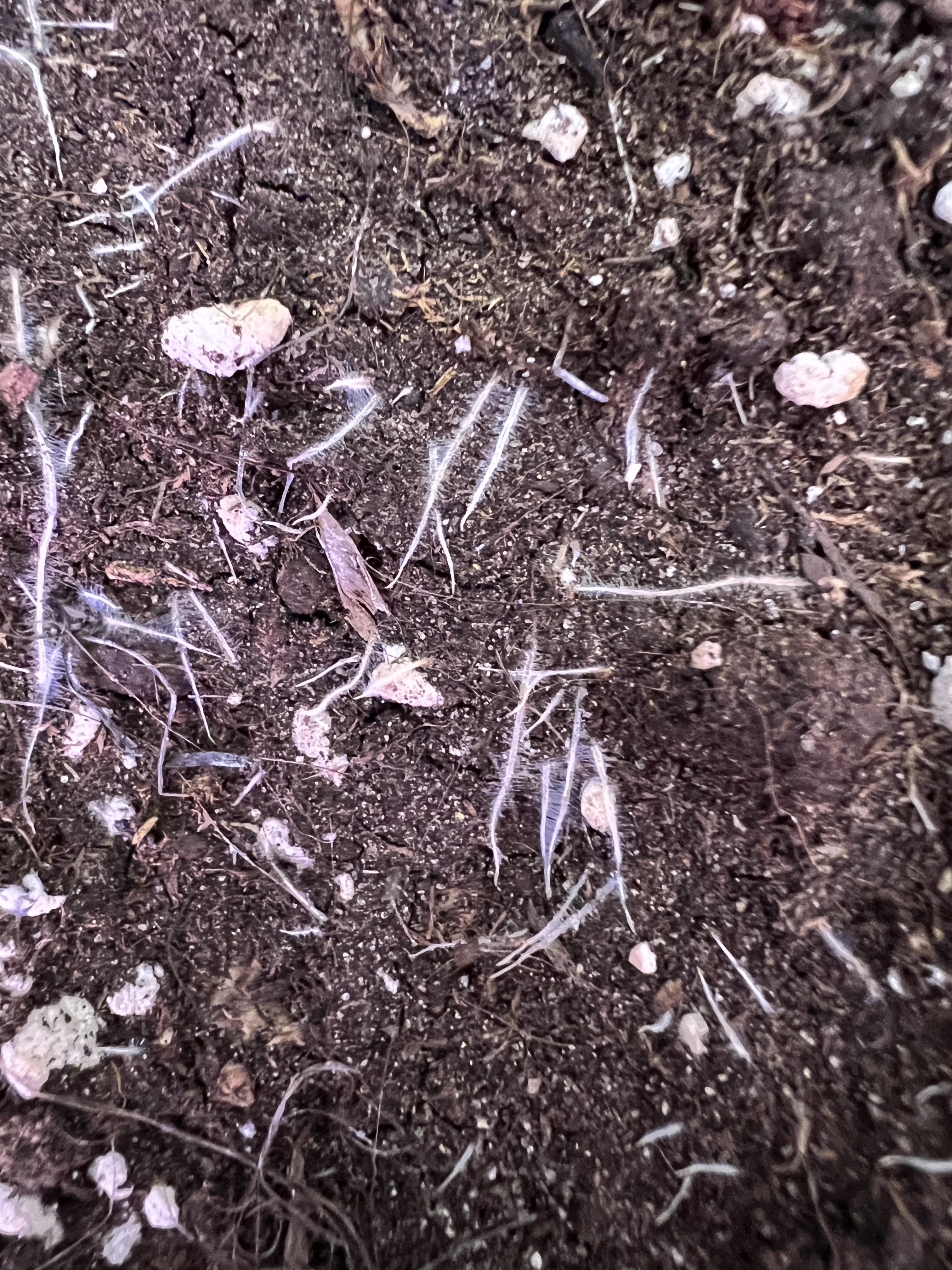 Aber schaut mal auf dem Boden? Sind das Wurzeln oder ist das ein Pilz? Ich habe das bei zwei von drei Pflanzen. Nur bei den zwei größten. Eine von Beide hat nur sehr wenig davon.