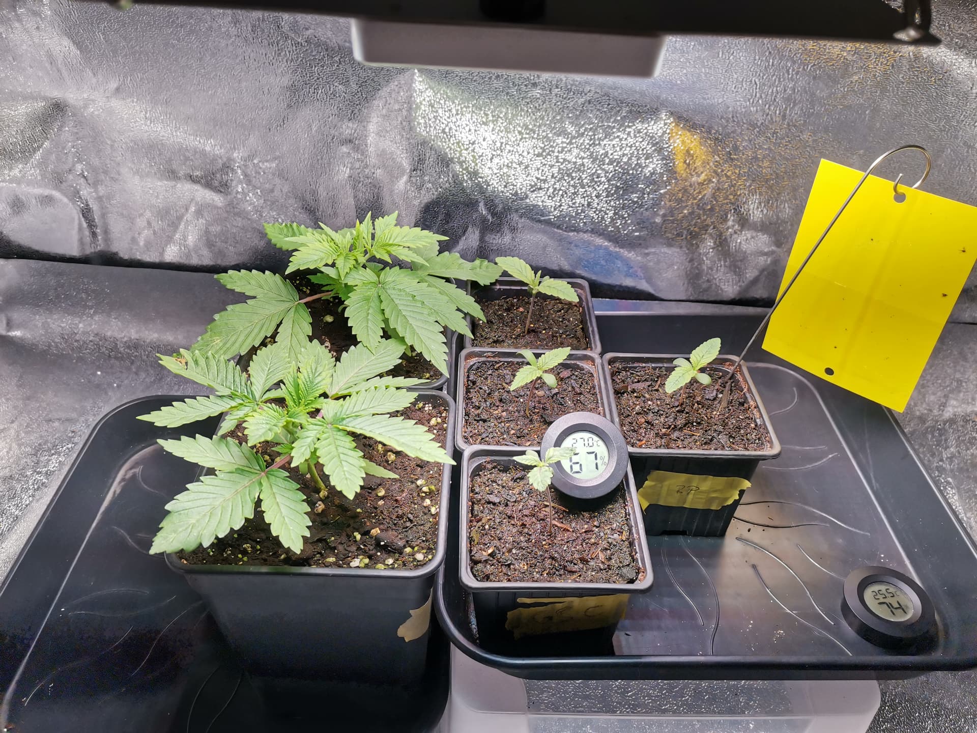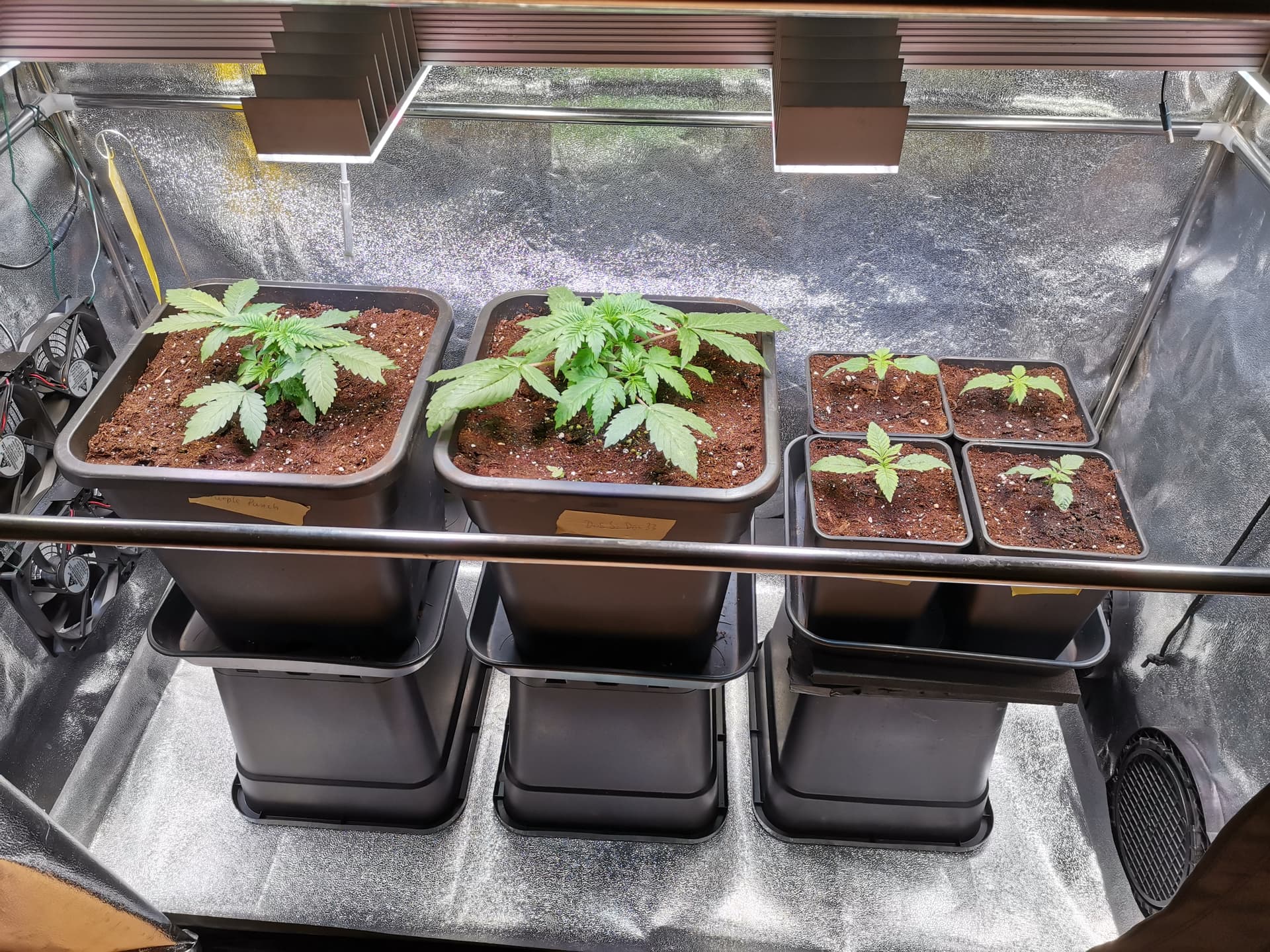 es geht weiter. Ich habe umgetopft. Die beiden Großen haben jetzt ihre Endtöpfe und die Kleinen durften in 2 Liter einziehen. Die große Lampe wurde angeworfen und liefert bei 40 % 400 PPFD bei 35 cm Abstand. Auch die Abluft habe ich jetzt mit 20 % in Betrieb. Die habe ich eigentlich nur an, um die Temperatur unter 28 Grad zu halten. Ich überlege aber sie erst einmal wieder abzustellen, da mir nun die Luftfeuchtigkeit weg gezogen wird. Bin nur noch bei 50 %. Ohne Abluft hatte es muckelige 28,5 Grad und über 70 % LF. Bin aber nicht sicher. Ich glaube, 100 Watt wird ohne Luftaustausch schnell zu warm im Zelt. Ich muss das mal beobachten. Zum weiteren Vorgehen… die 2 Großen haben ihren endgültigen Platz und auf den 3ten Slot setzt ich wohl 2 Kleine. Und dann wird sich zeigen, ob da zwei bleiben oder später noch eine Kleine das Zelt verlassen muss. Ich fürchte bereits, dass ich mir mit dem unterschiedlichen Alter und auch noch 3 verschiedenen Sorten zukünftigen Stress auf halse. Hoffentlich bereue ich es am Ende nicht, nicht neu gestartet zu sein mit 3 gleichen Samen.