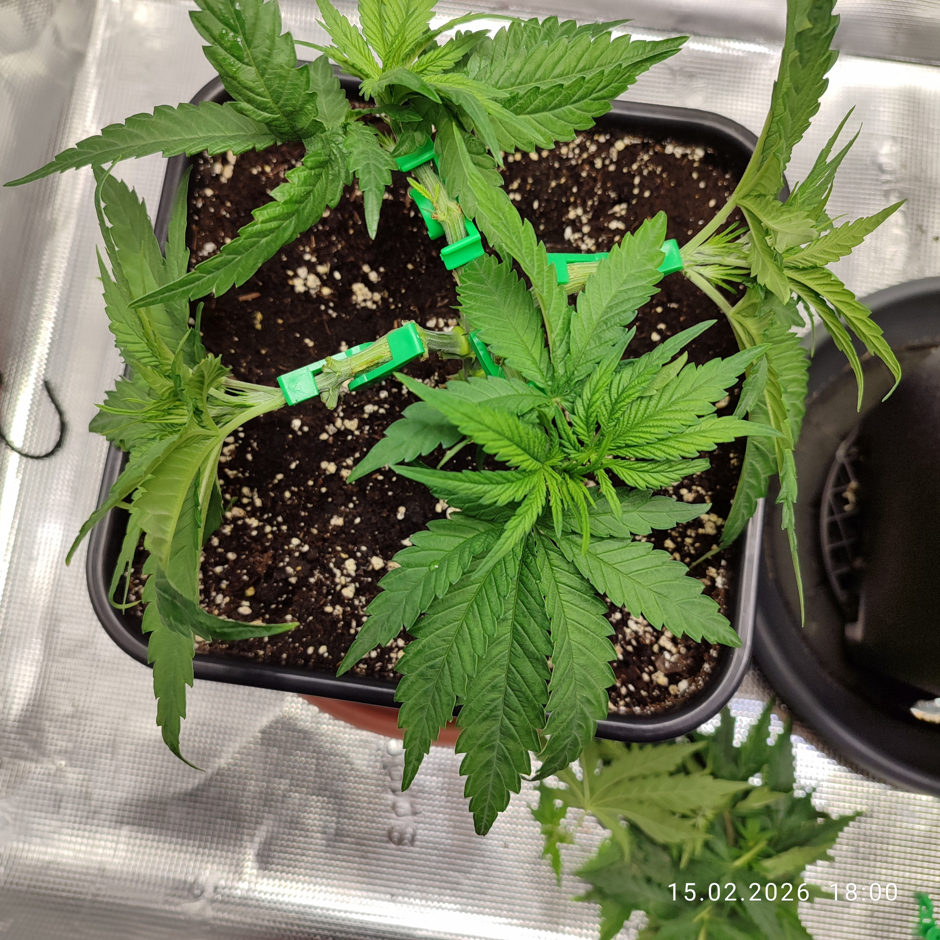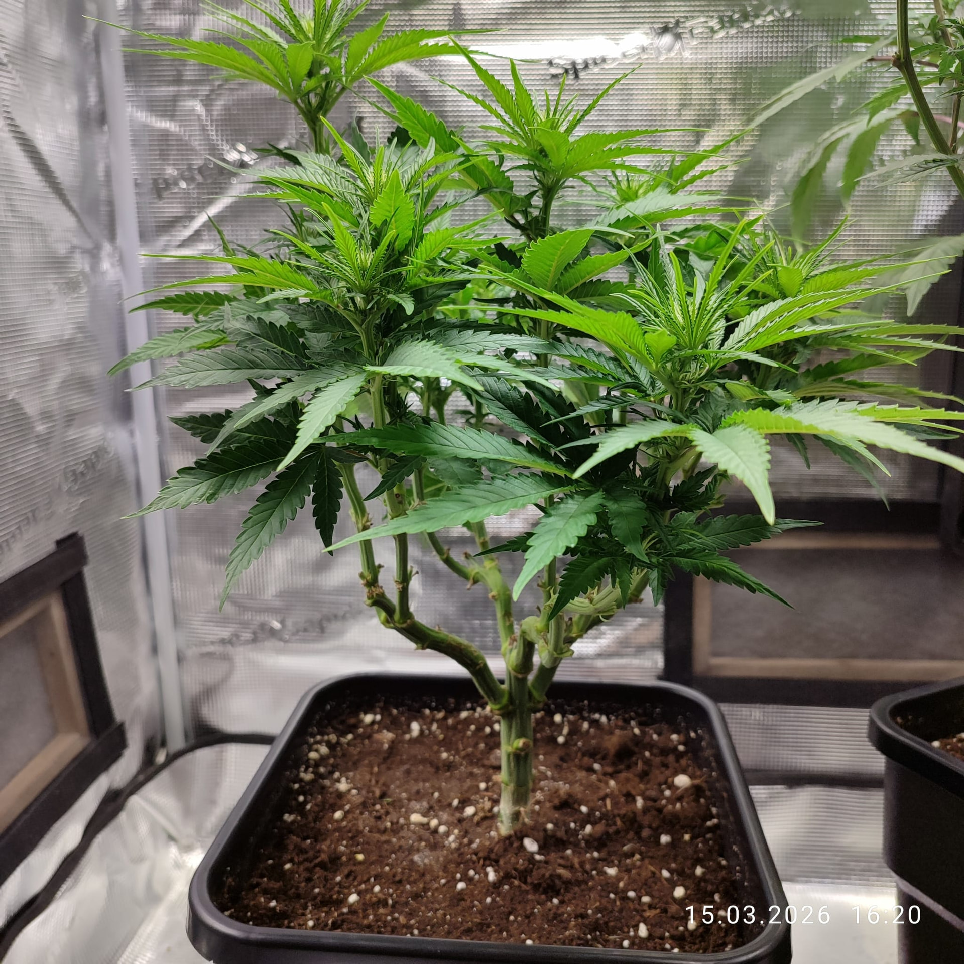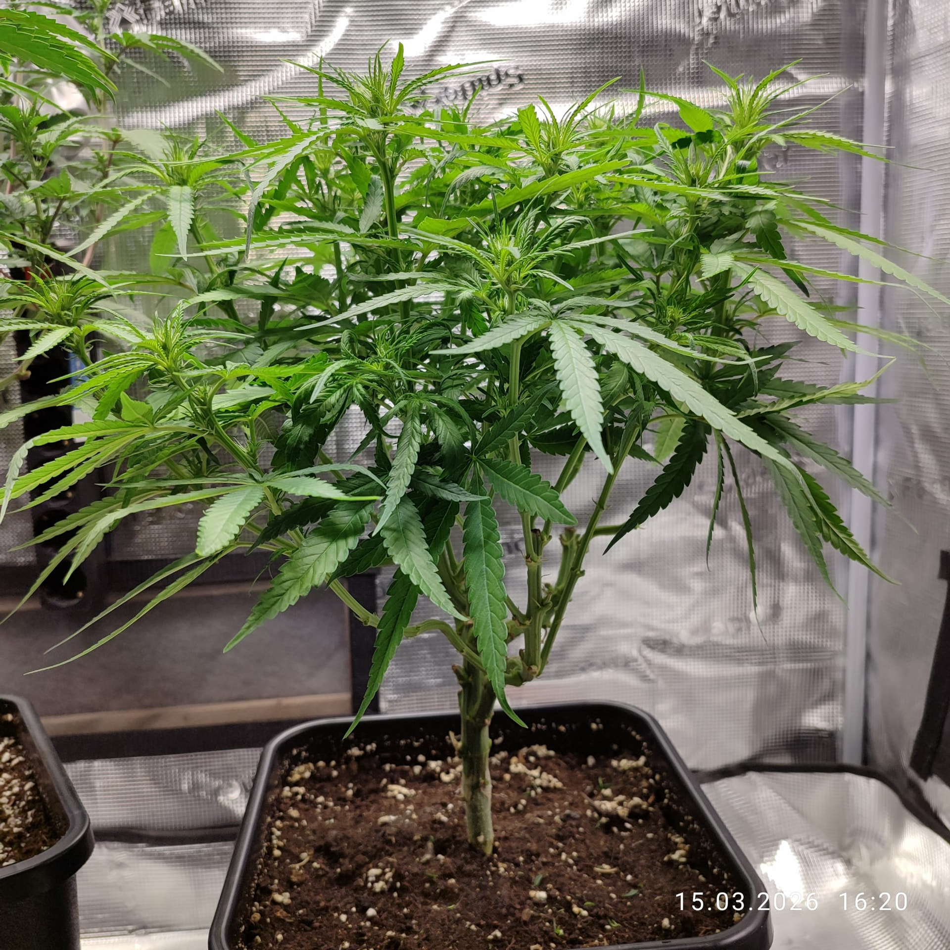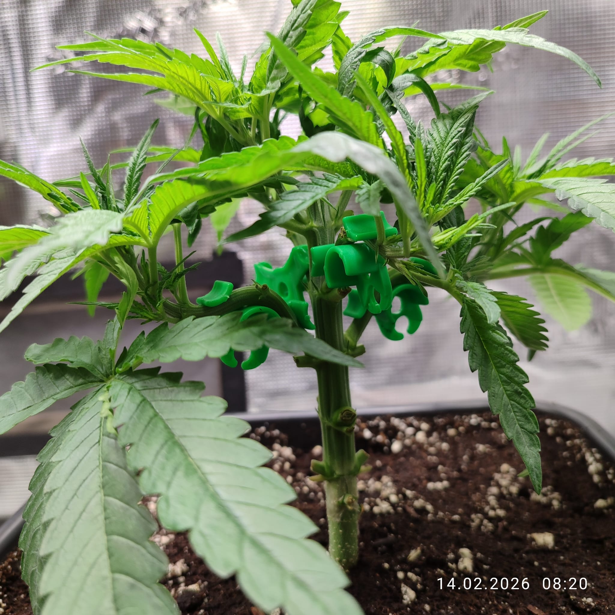 Sonntag, den 01. Februar umgetopft und die Erde mit dem Plagron Kick vermengt. Bei 11l Töppen waren das 55g pro Topf. Ich meinte es zu gut mit dem Licht oder hab den Strain unterschätz, auf jeden Fall wächst es sehr gedrungen.