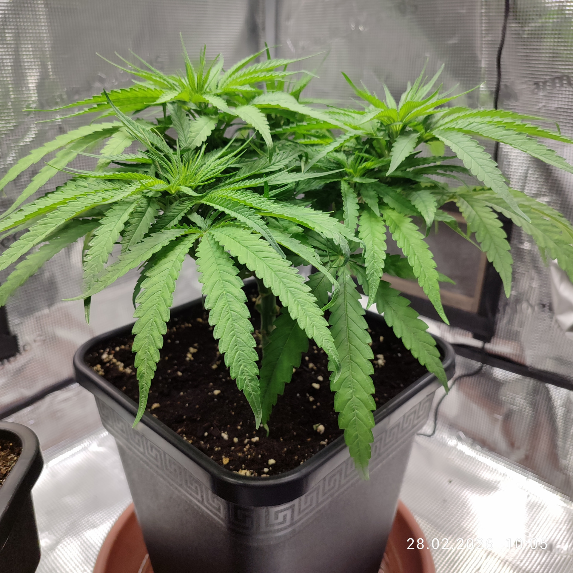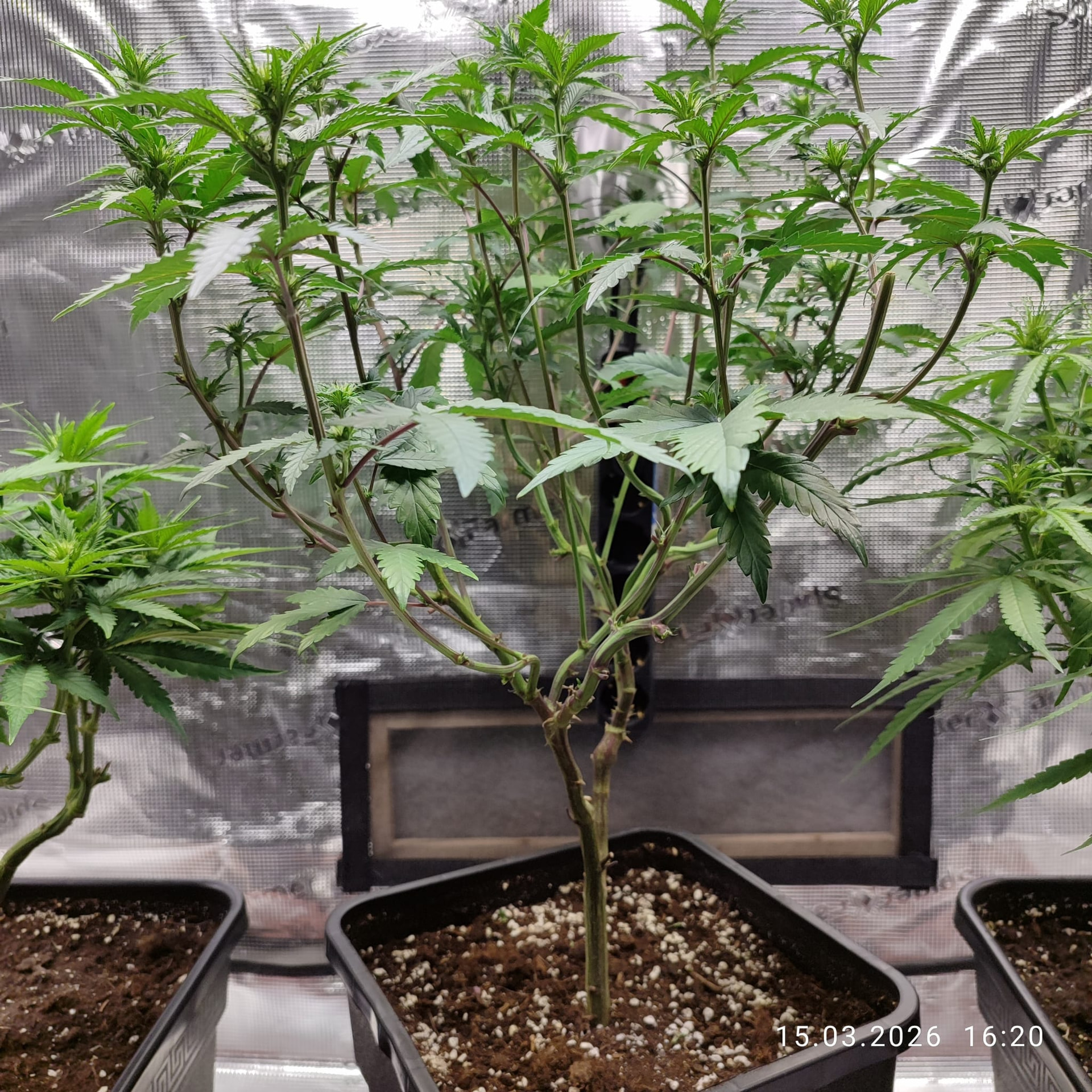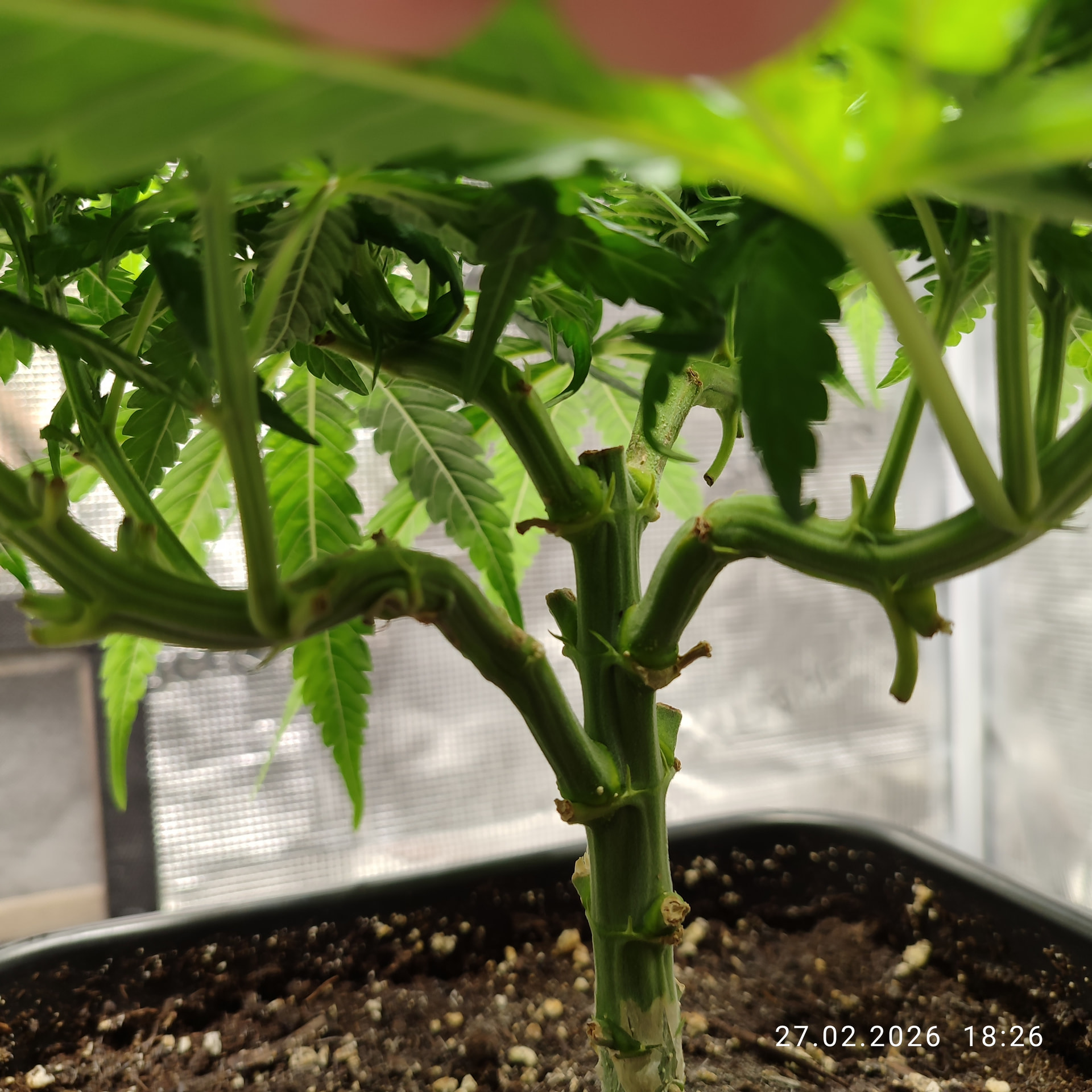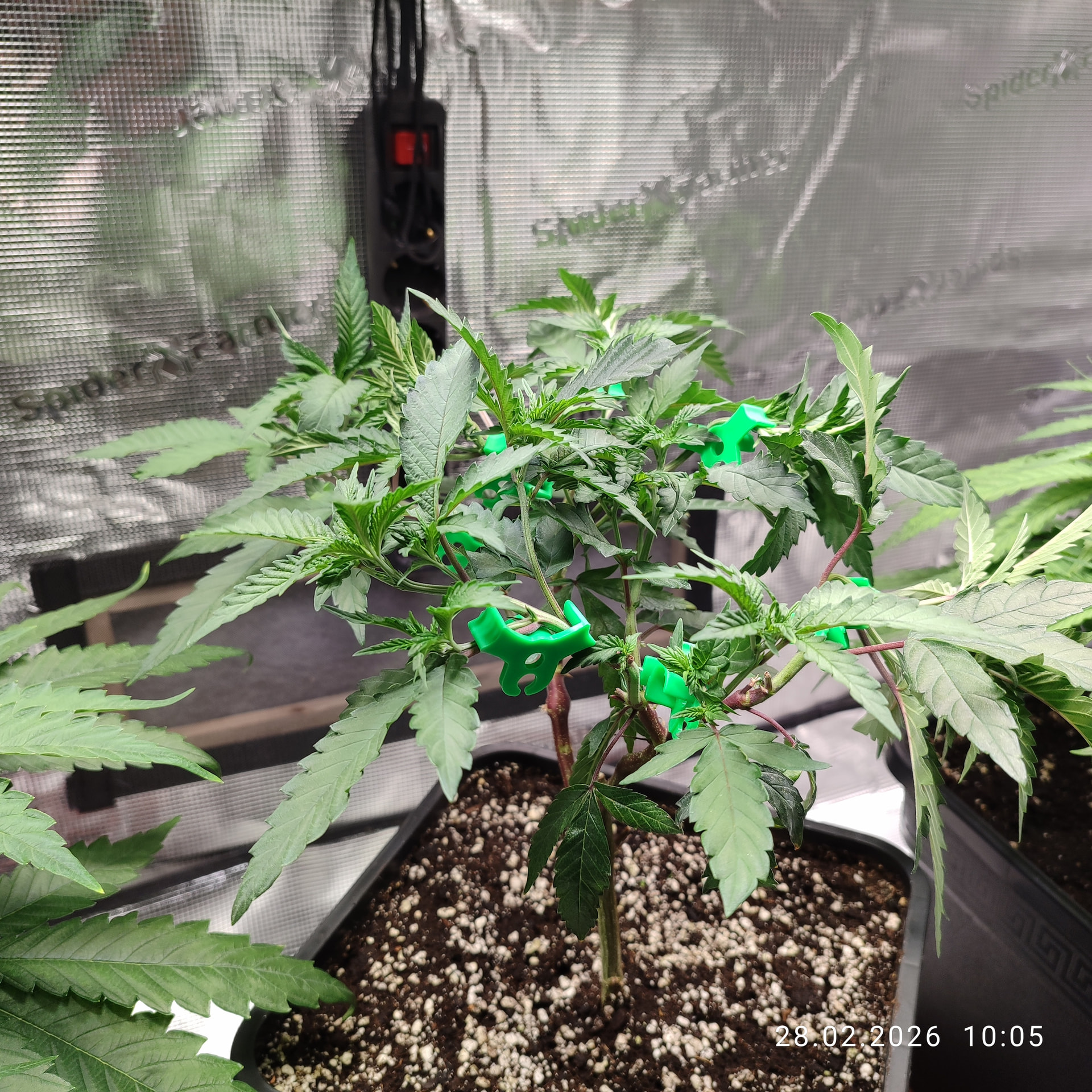 Sonntag, den 01. Februar umgetopft und die Erde mit dem Plagron Kick vermengt. Bei 11l Töppen waren das 55g pro Topf. Ich meinte es zu gut mit dem Licht oder hab den Strain unterschätz, auf jeden Fall wächst es sehr gedrungen.