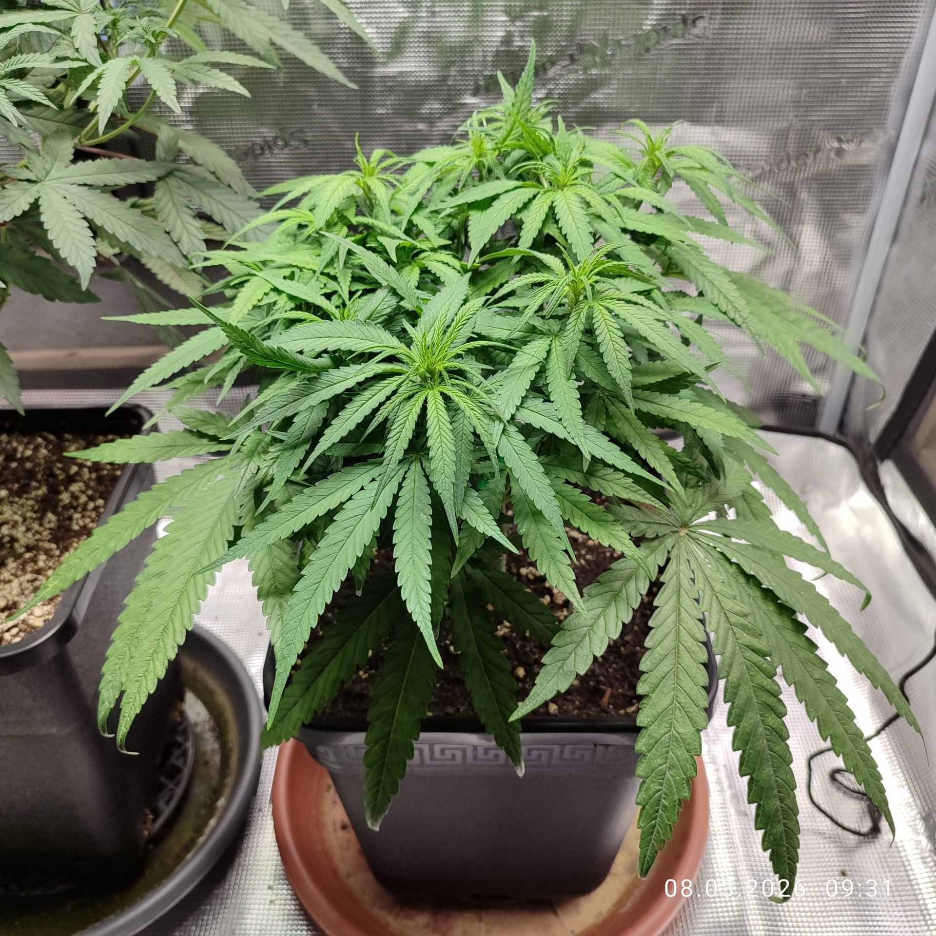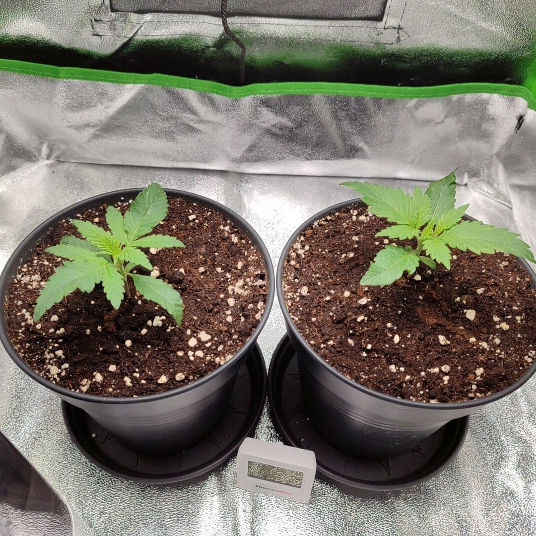 Nach 2 Wochen als Sämling stehen sie ganz gut da. Ab und an gabs etwas Wasser aus dem Sprüher, mehr ist bis dahin nicht nötig. Bis zur Vegetation und somit umtopfen in die Endpötte, gabs dann 2x je Topf 700ml, alles noch ohne Düngung oder sonstigen Zusatz.