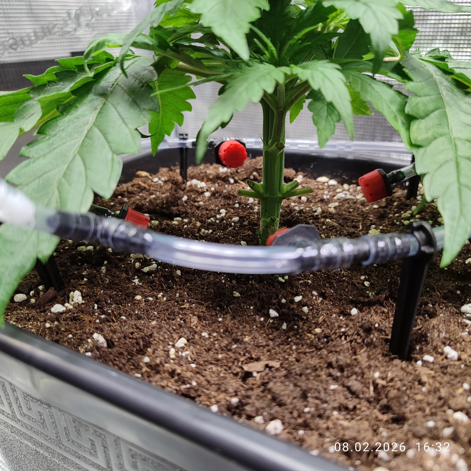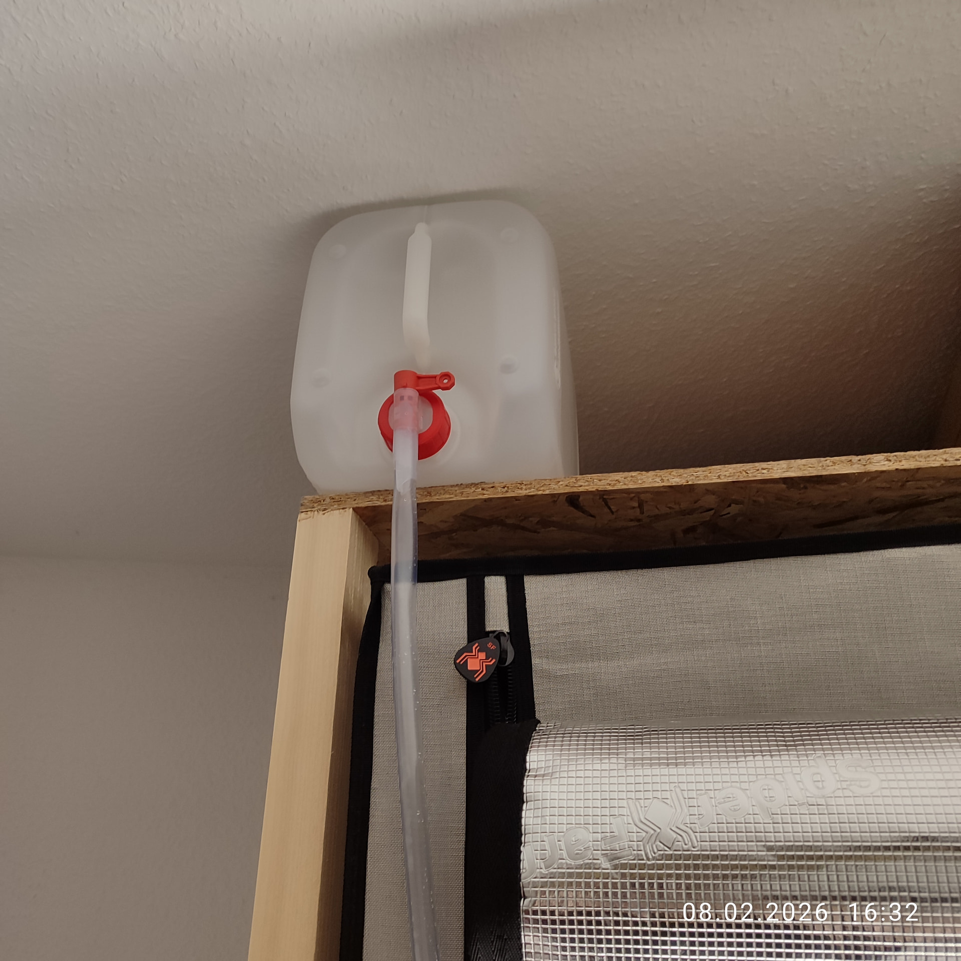 Noch ein kleines Detail zur Bewässerung. Bis jetzt goß ich immer mit einem Gießball, was gut geklappt hat aber doch sehr viel Zeit in anspruch nimmt, wenn man langsam gießt. Ich bin gerade bei mir ein Tröpflersystem zu bauen was praktisch nur mit Schwerkraft funktioniert. Der 10l Kanister kommt auf das Rahmengestell des Zeltes, mit Schläuchen geht es dann ins Zelt zu den Tröpflern. Mir fehlen noch ein paar Schläuche zum fertigstellen, weil ich mich etwas verschätzt hatte in der Länge.