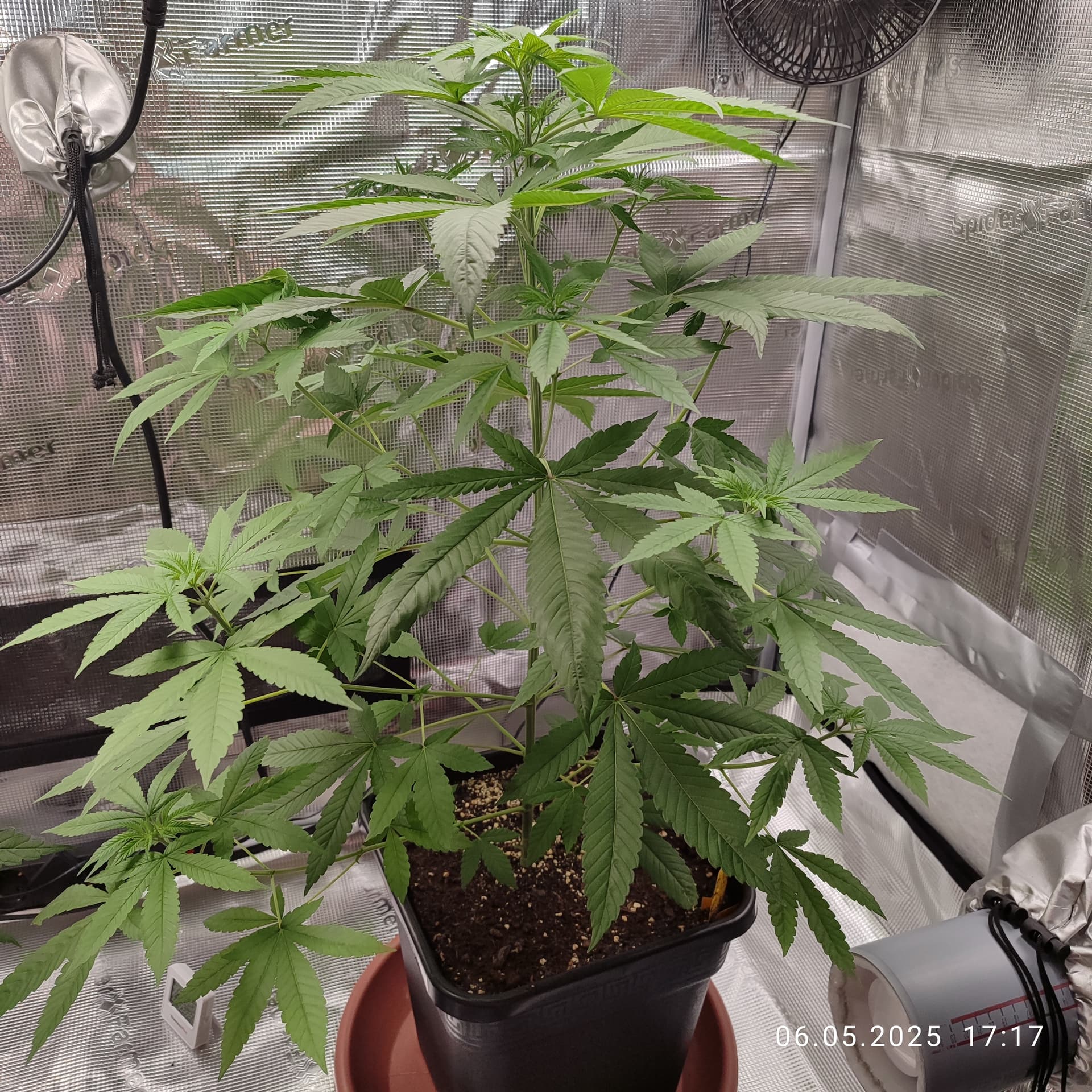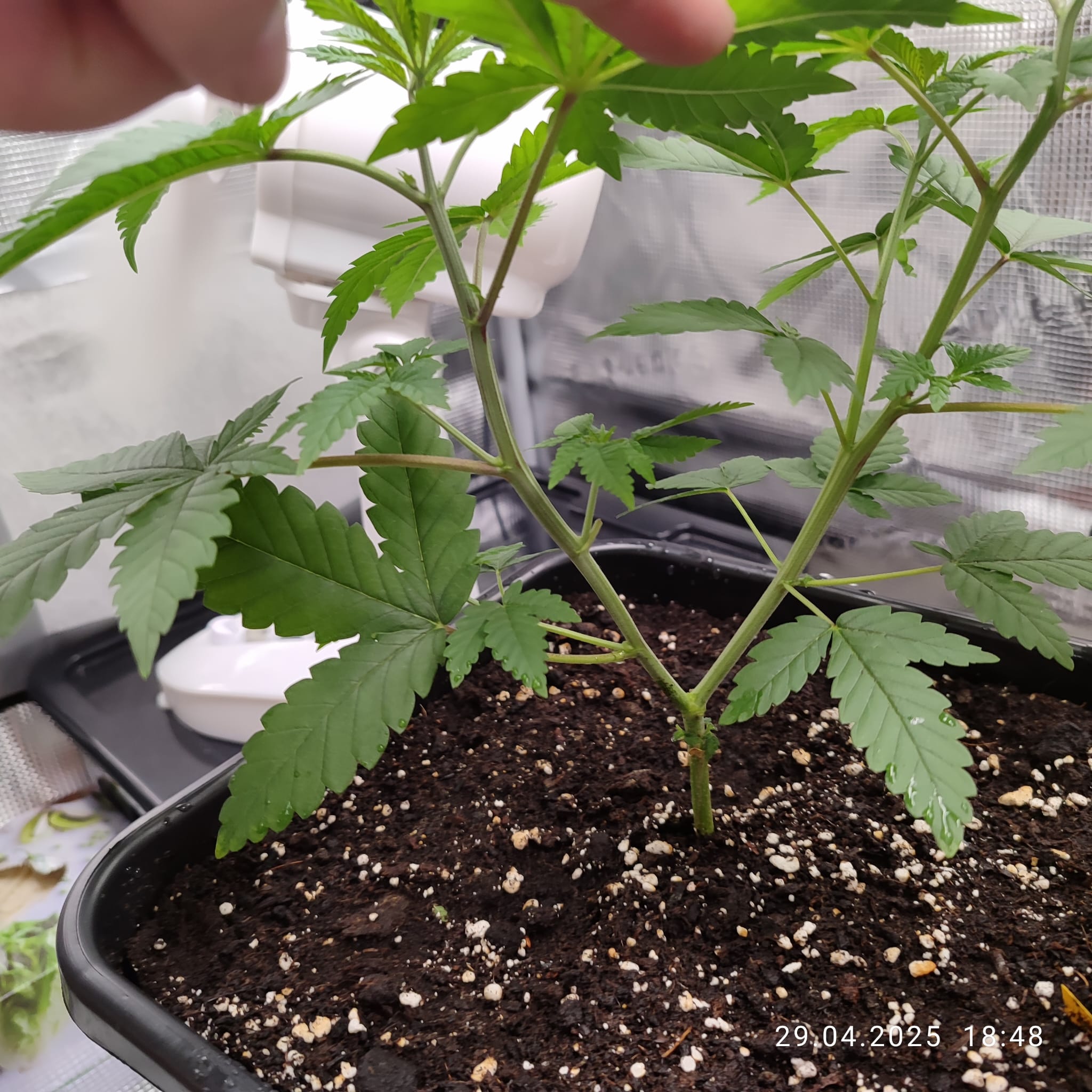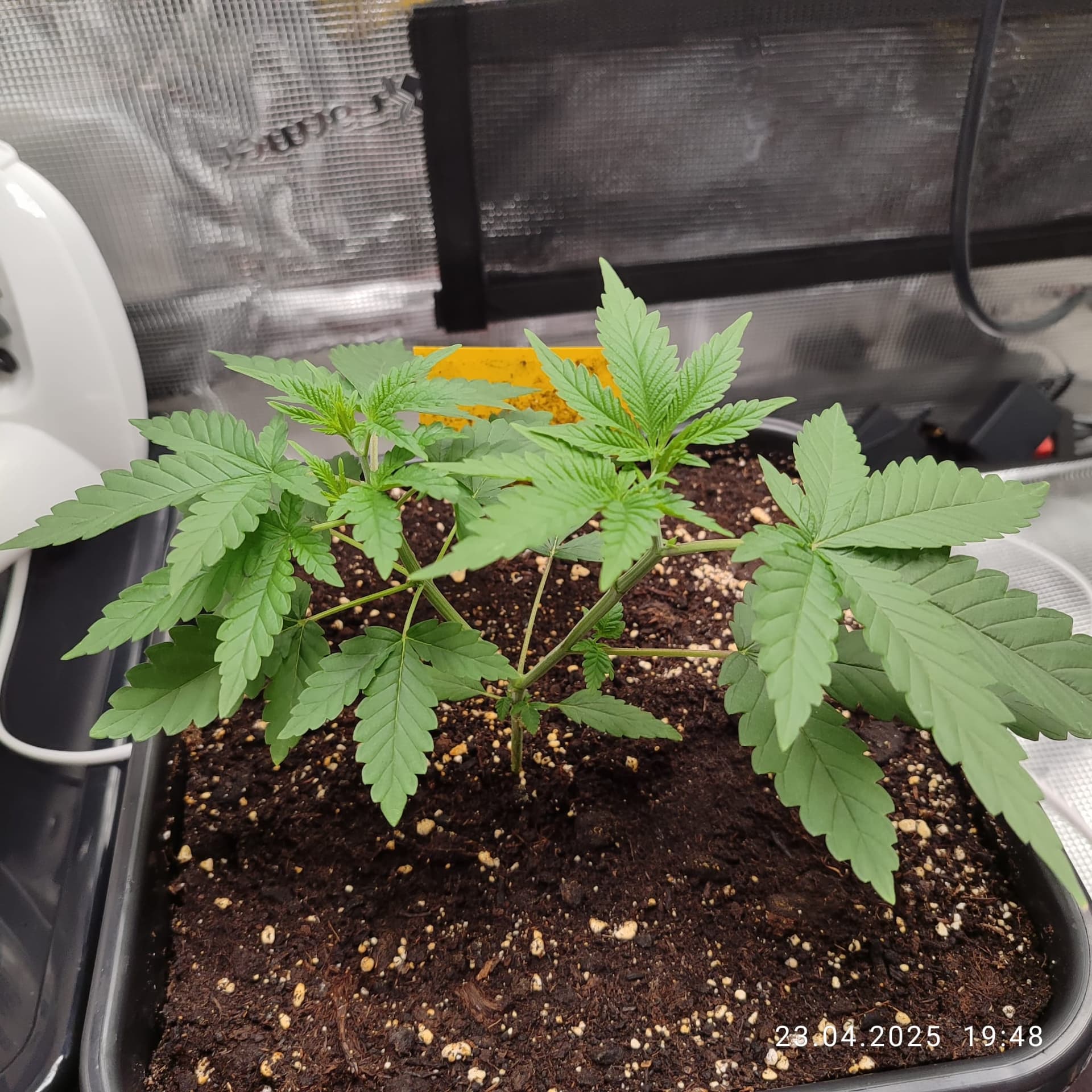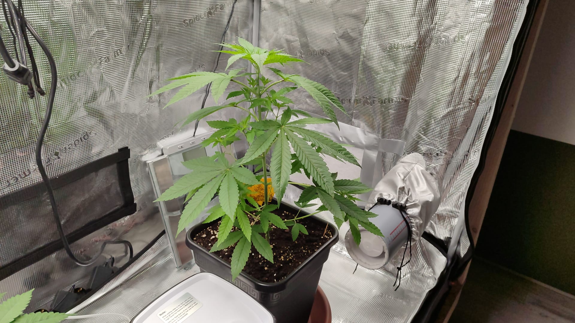 Die Blätter hängen etwas weil gerade umgetopf und bewässert. Im gegensatz zu ihrer Schwester im Zelt, wächst sie noch sehr kompakt. Aber mal schauen was noch wird.