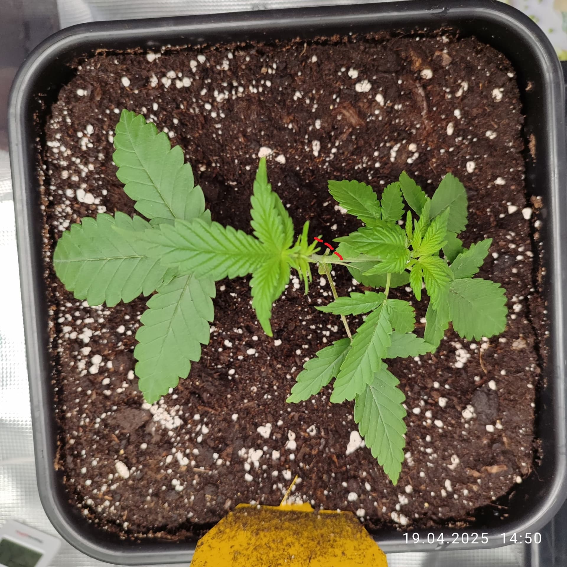 Man kann mittlerweile deutlich sehen, dass sich 2 Haupttriebe entwickelt haben. Ich wollte bei der eigentlich eh das Toppen testen. Hat sich dann erstmal erledigt.