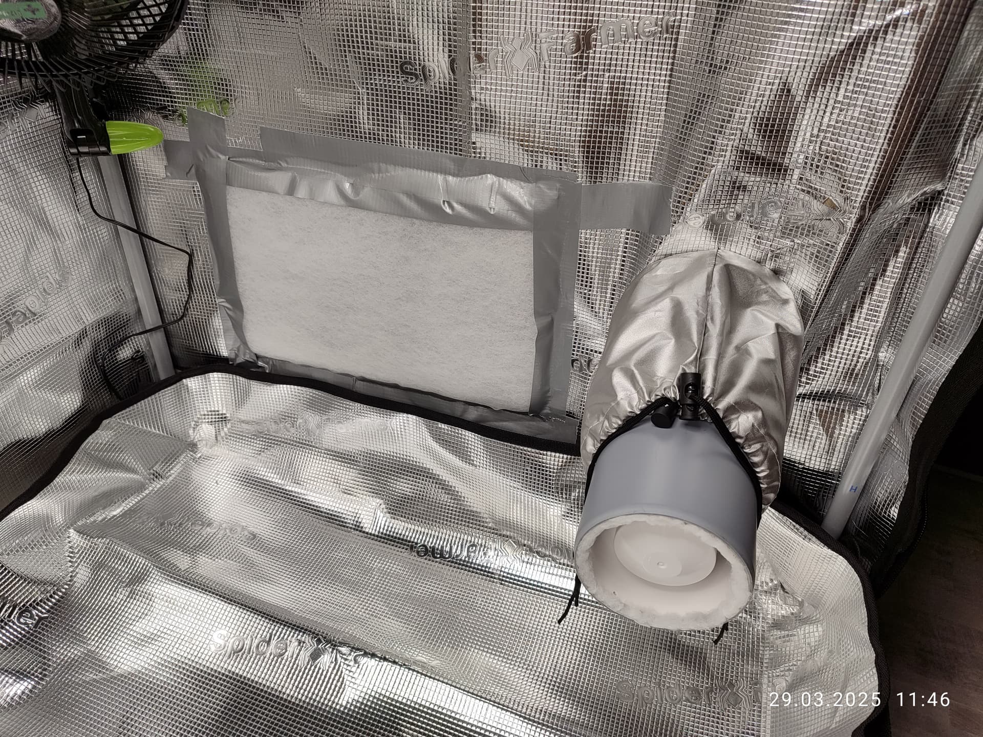 Hab umgebaut um die Lampen höher zu hängen nach dem Aufdrehen. Hab in dem Zelt 2 Durchlässe, habe nun auf den oberen gewechselt. Licht ging gerade aus als ich das Foto machen wollte, dieses gibts nurnoch von 6-18 Uhr.