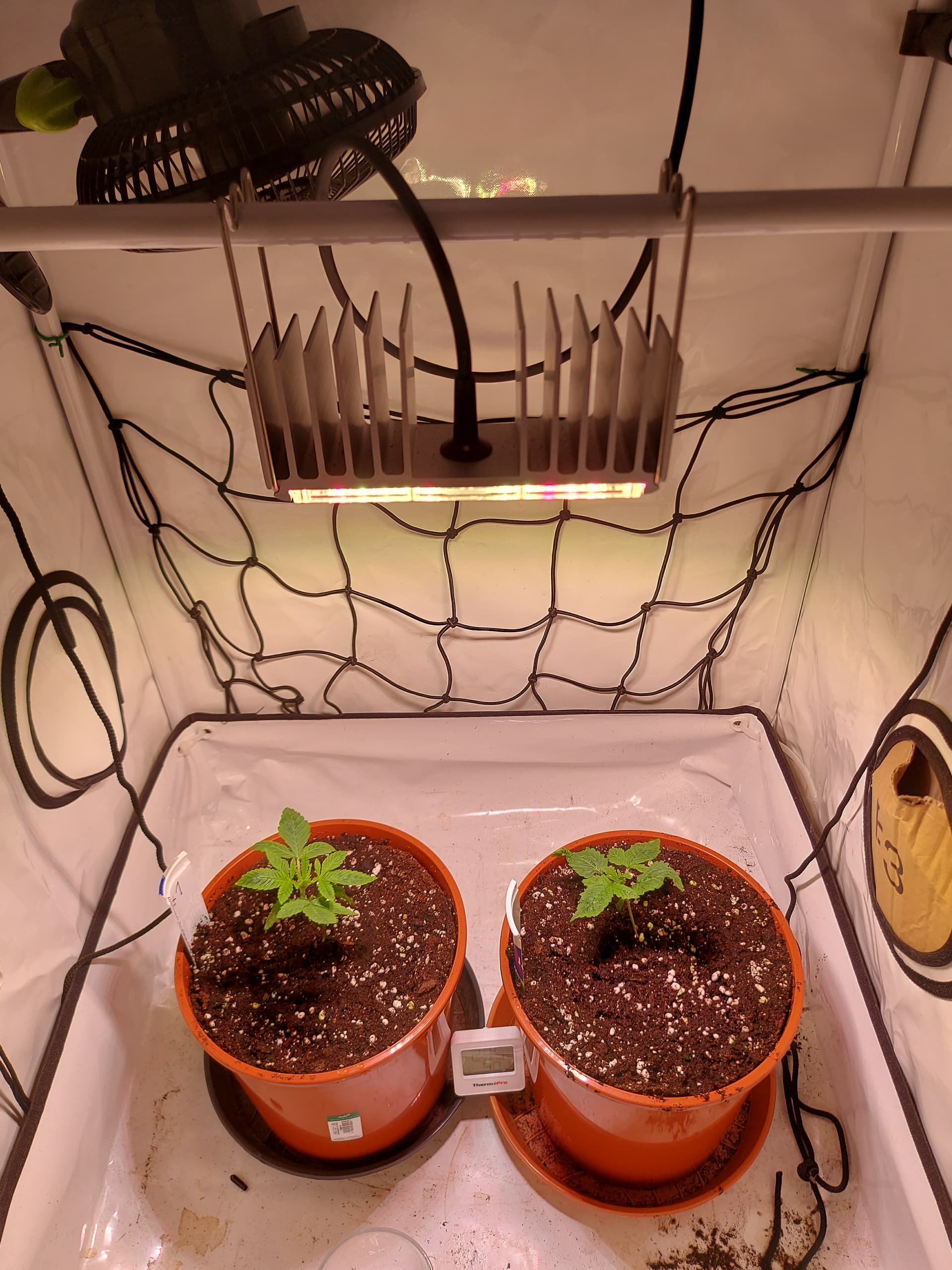 Das Gewächshaus ist jetzt weg und der Umluft-venti eingeschaltet damit sie fein im Wind tänzeln. 50W LED läuft jetzt auf 80% bei ungefähr 30cm Abstand. Nachdem sie sich vom Umtopfen erholt haben, gibt es 100% und dann kommt auch bald die große Lampe zum Einsatz, für maximale Energie im Wachstum.