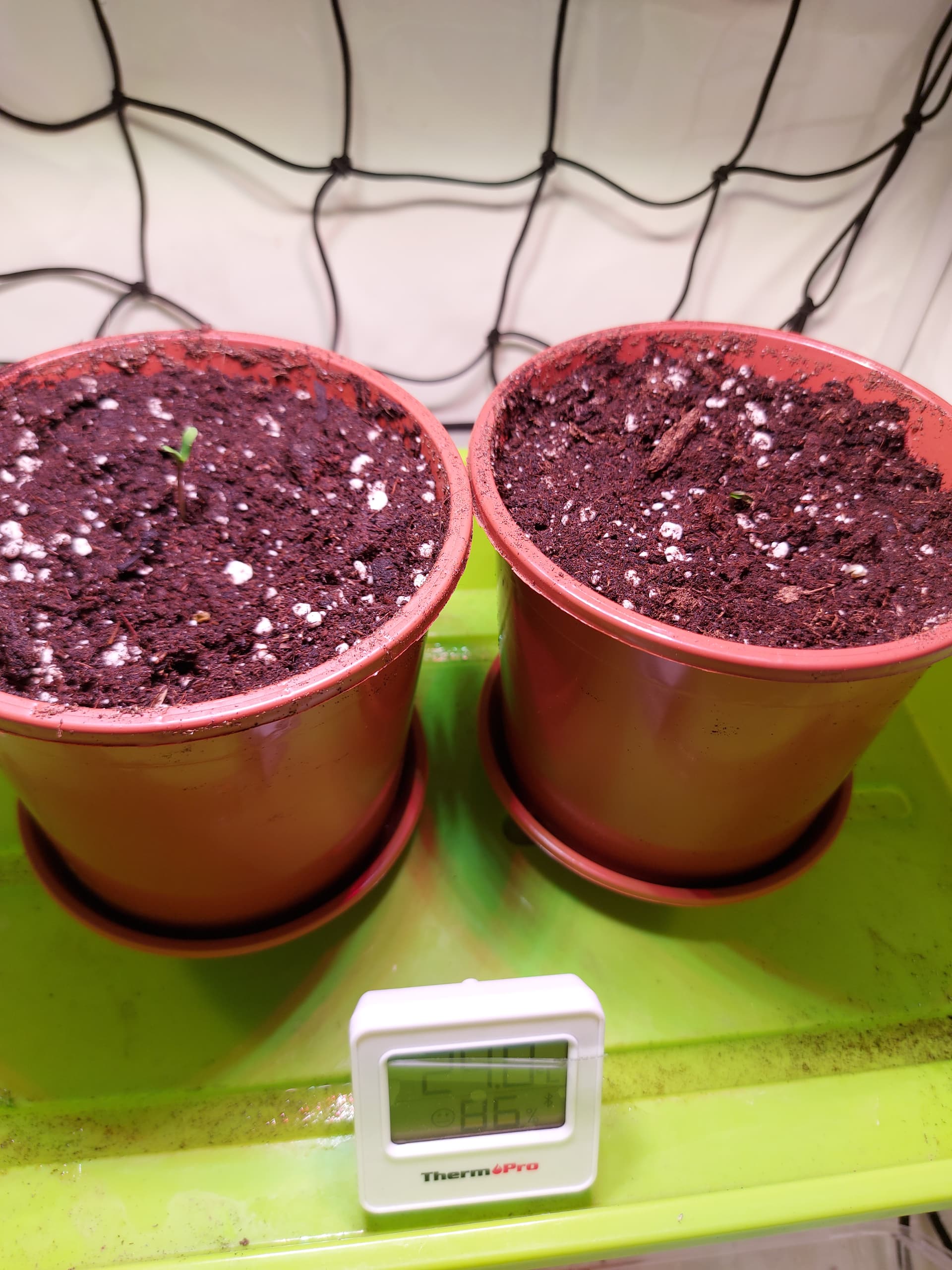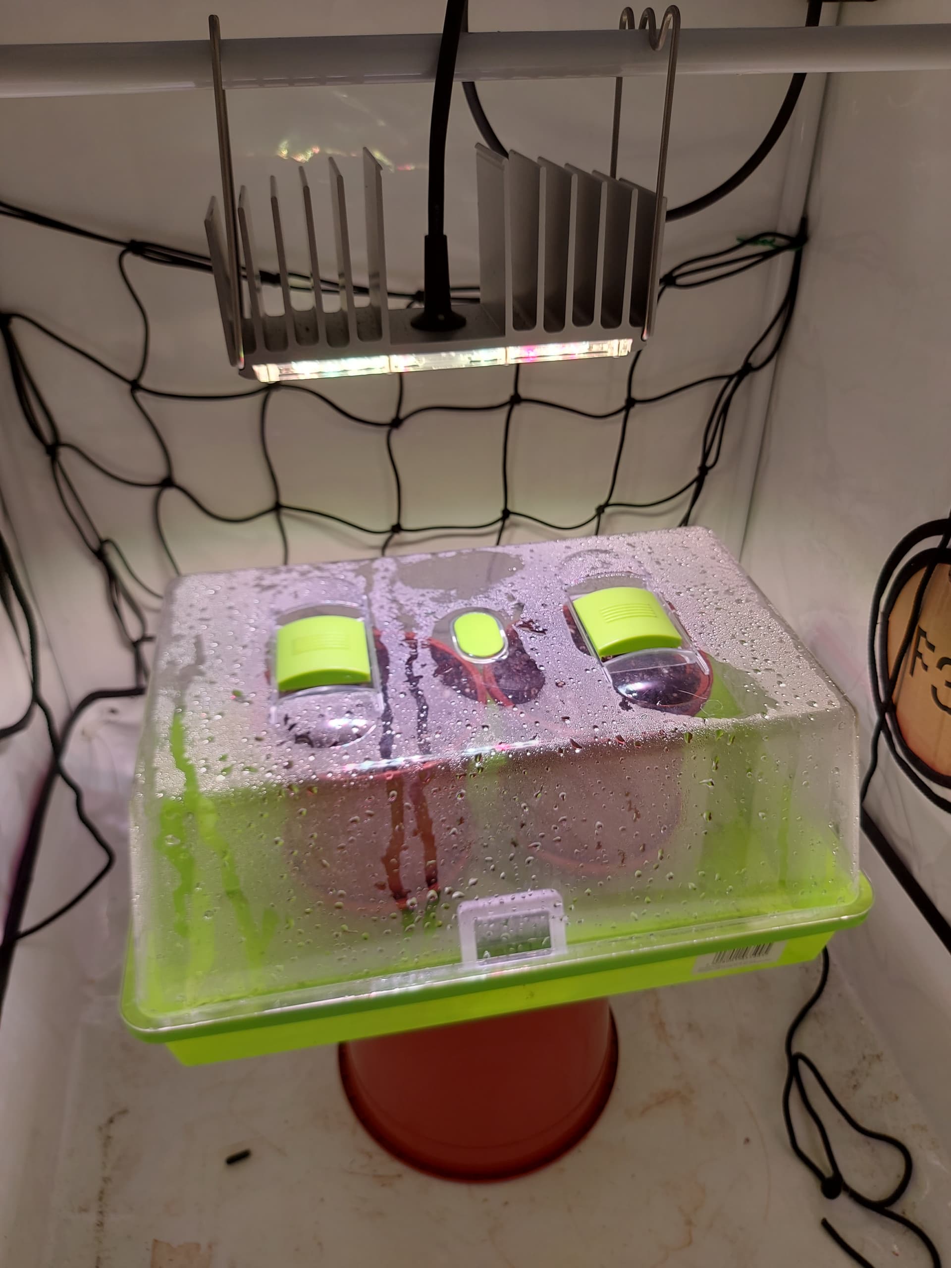 Dann ging es in 1l Plastiktöpfe und in ein kleines Gewächshaus unter der q1w dim. Dort zeigten sich auch die ersten Keimblätter nach einigen Tagen. Die 50w LED lief zunächst auf 40%, mittlerweile auf 60% da eine Pflanze etwas anfing zu spargeln, das sieht man aber auf den Bildern noch nicht.