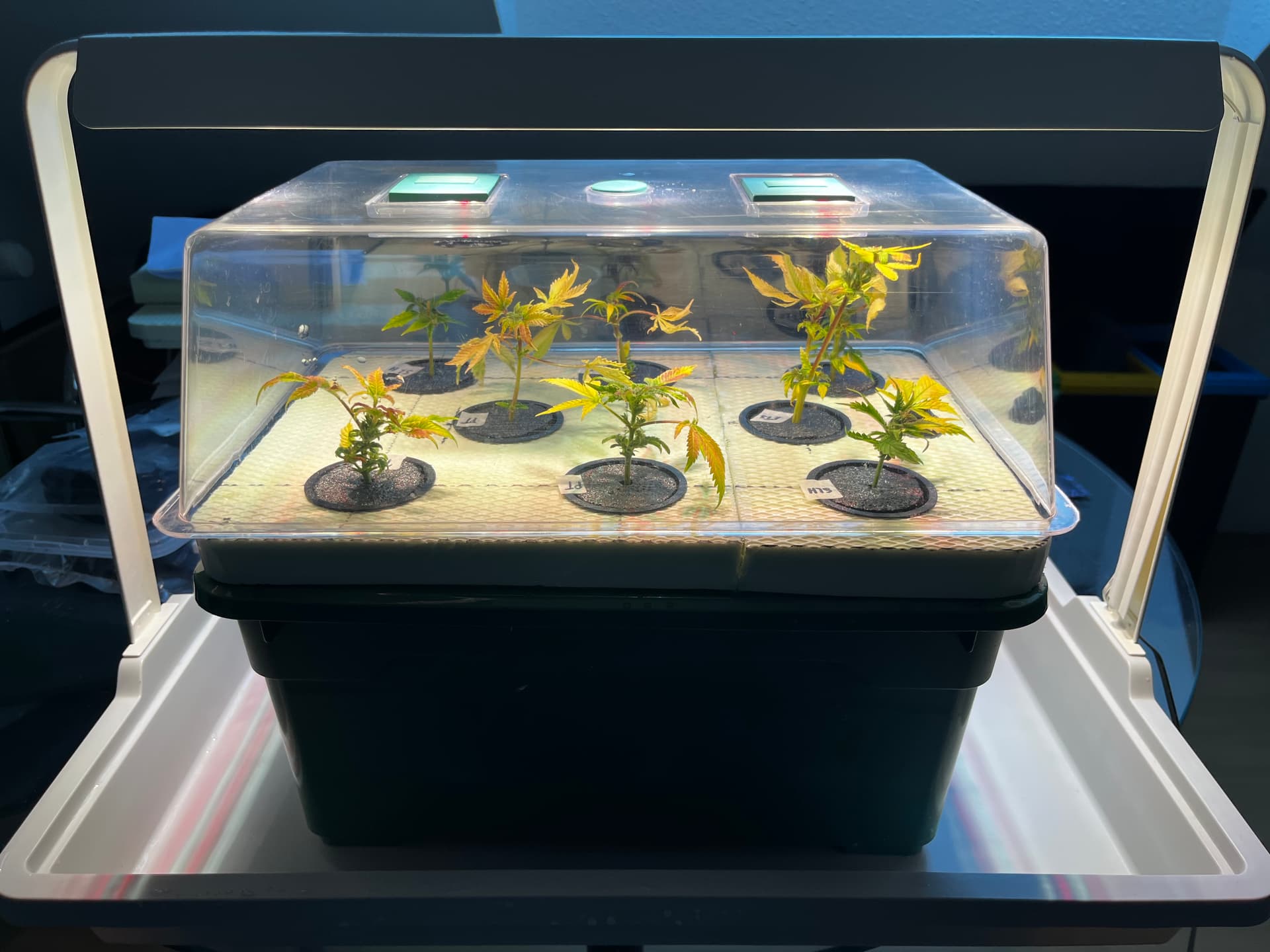 Als ich Stecklinge bewurzelt hab, bevor der LetPot bei mir eingezogen ist, hab ich die entweder einzeln in Kokosquelltabs gesteckt oder nur mit Wasser dann über das Gefäß ne dunkle Folie, Löcher rein und die Steckis einzeln durch die Löcher. Bei letzterem jeden 2. Tag frisches Wasser, die hat allerdings dann mein Kater gefressen bis auf 3 Krüppelchen, von denen 1 ne richtig hübsche Pflanze geworden ist.