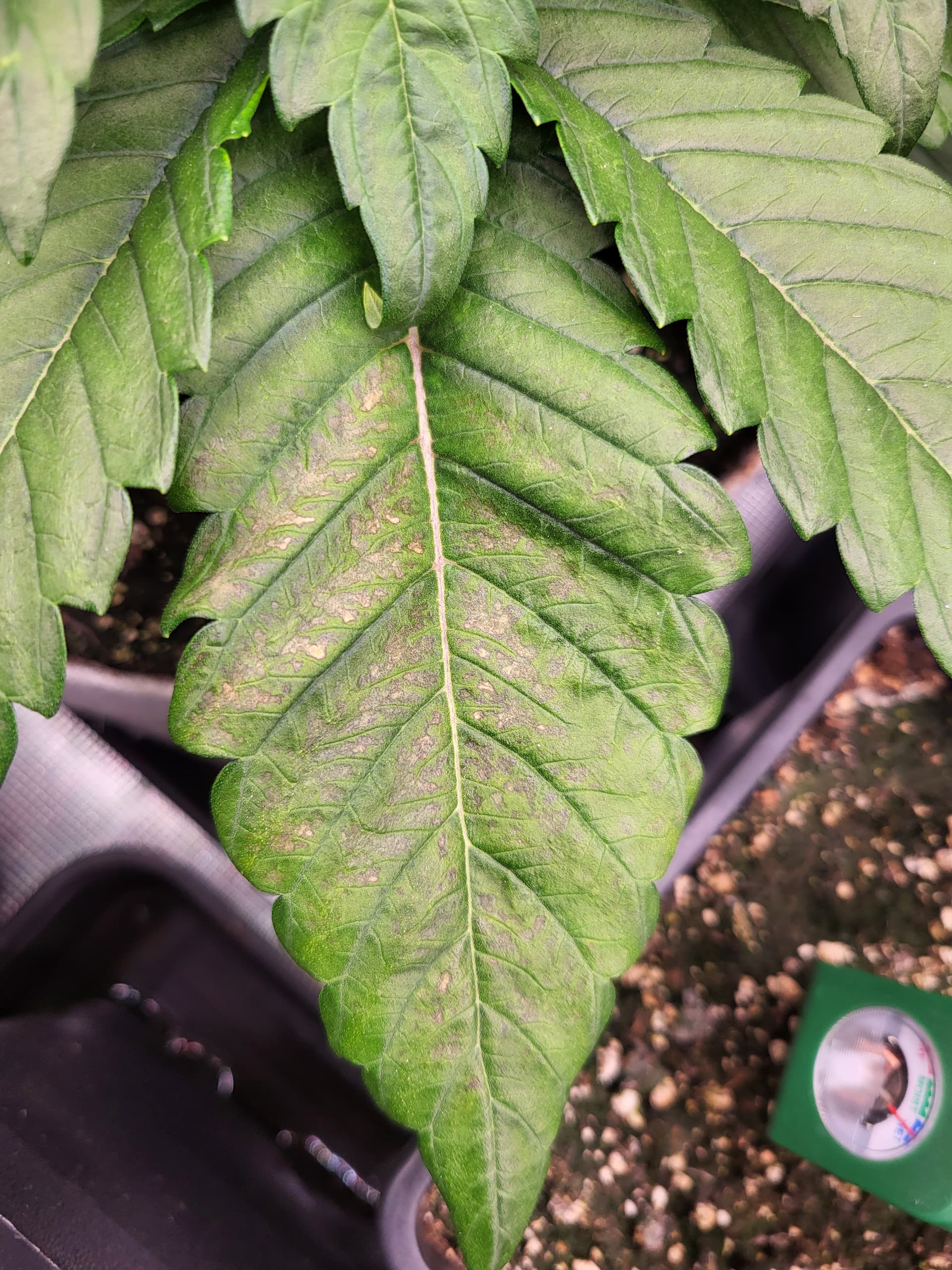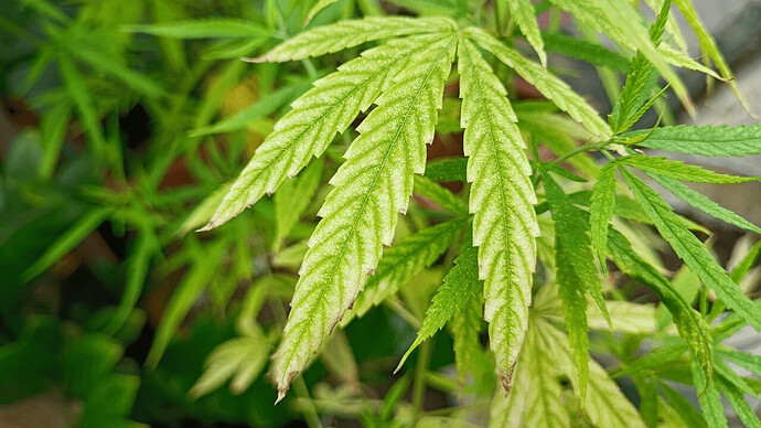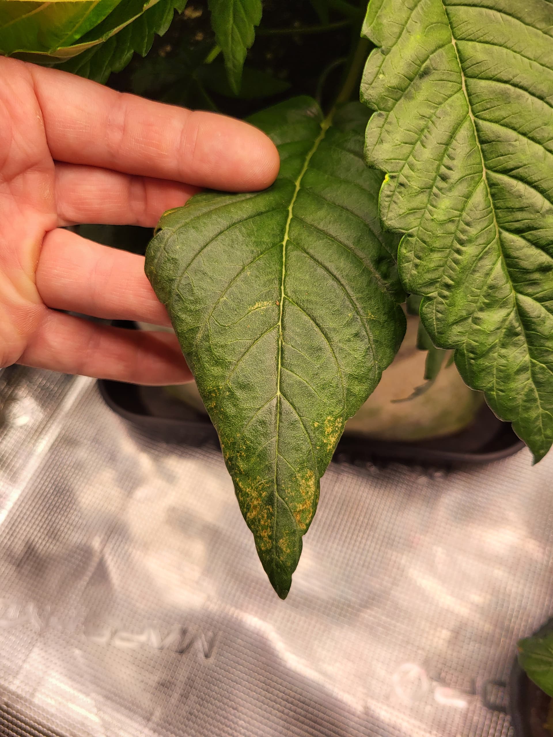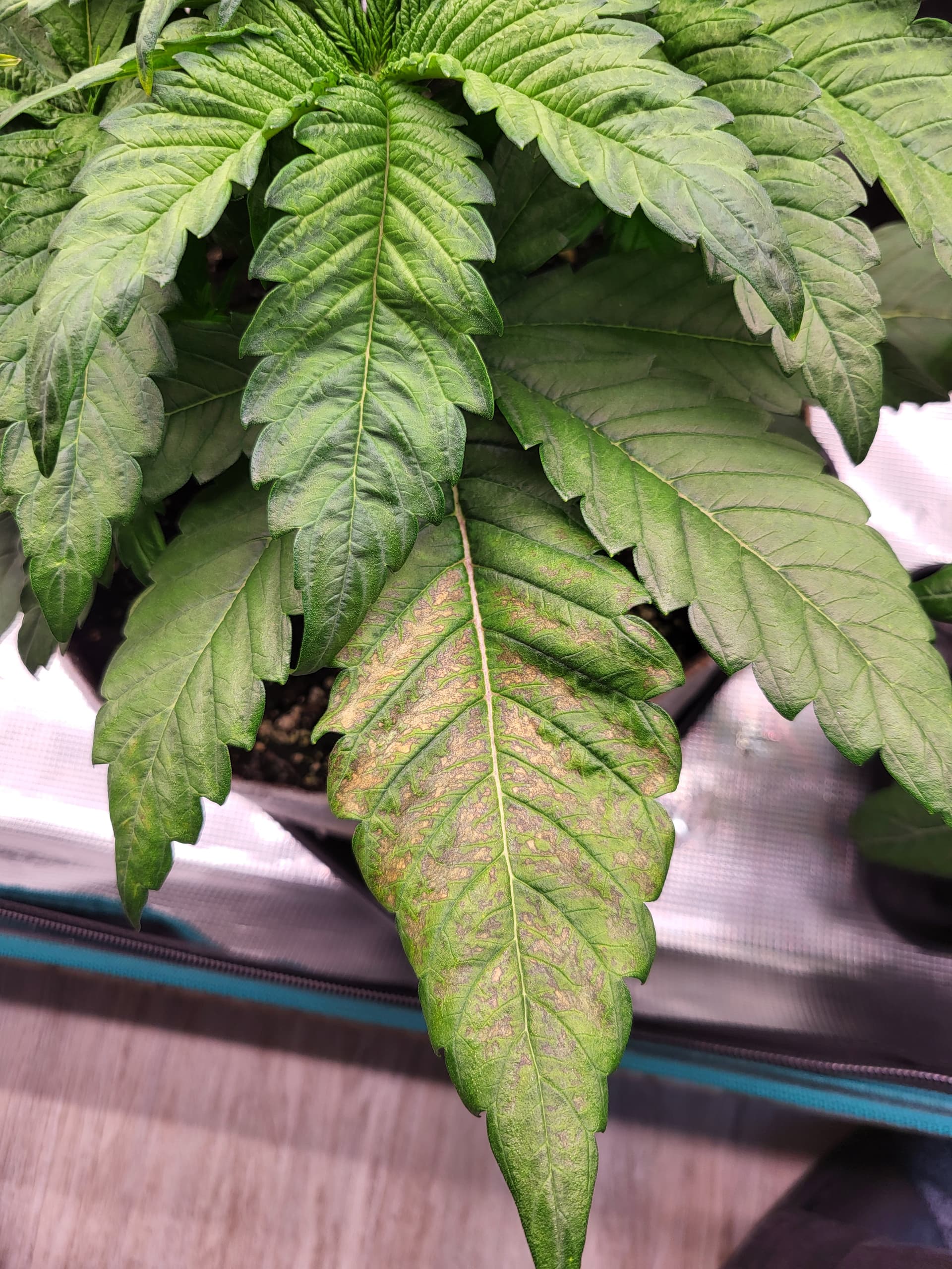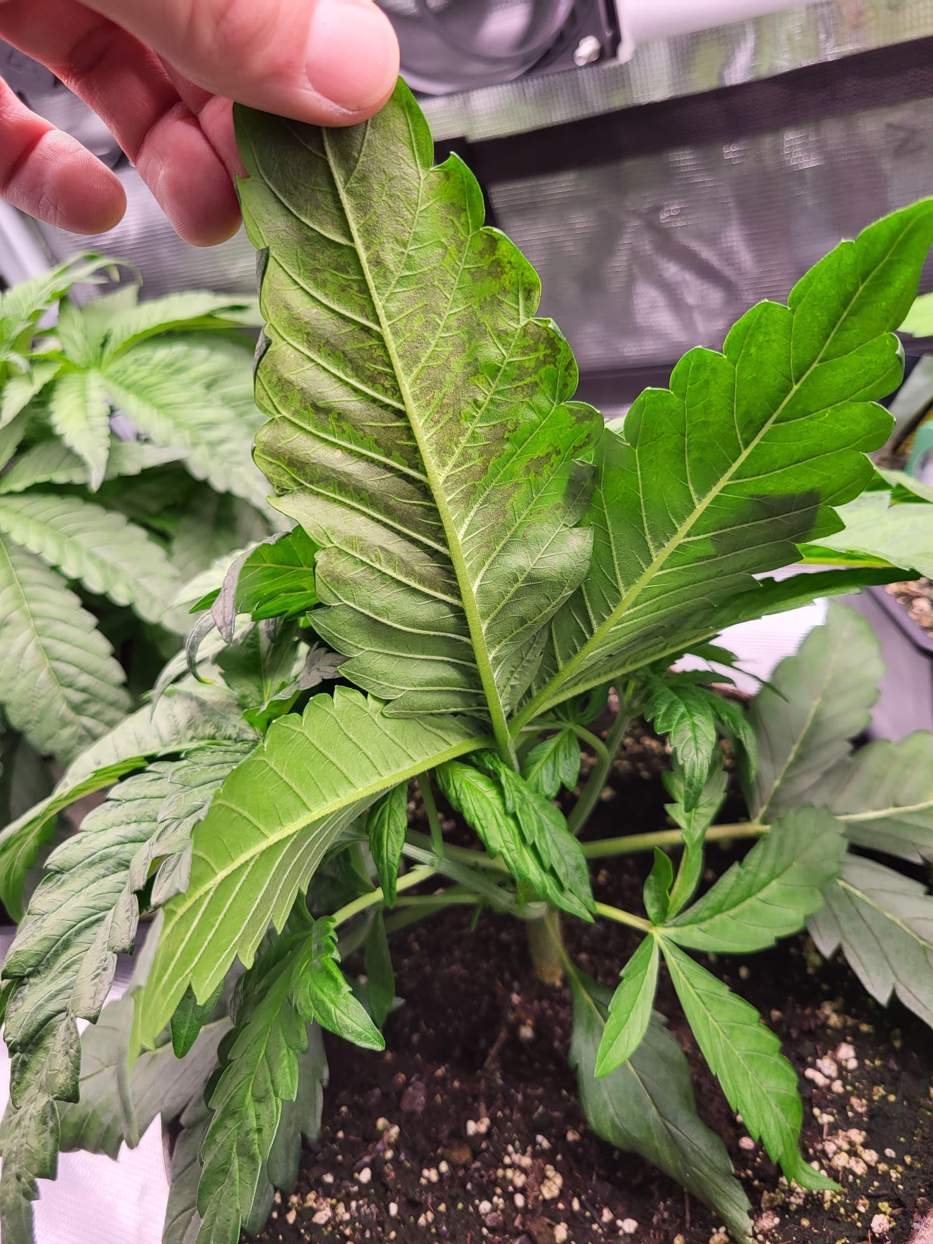 Benutze kein CalMag. Hab damals nur 5 g Dolomitkalk pro liter Substrat dabei getan. Sowie 2 hände voll Urgesteinmehl auf 50 Liter Substrat. Diese braunen Flecken kommen jetzt bei beiden Pflanzen.
