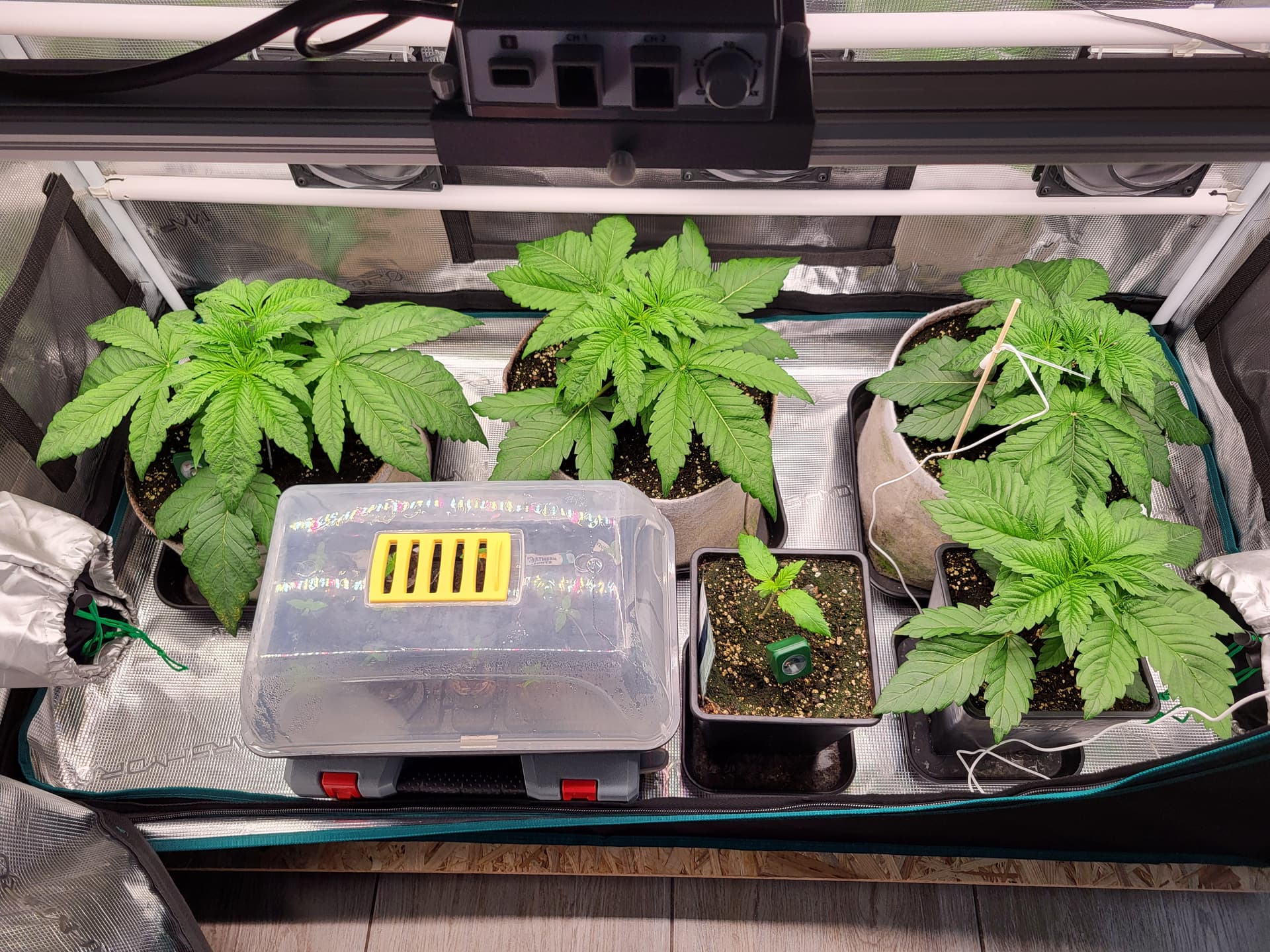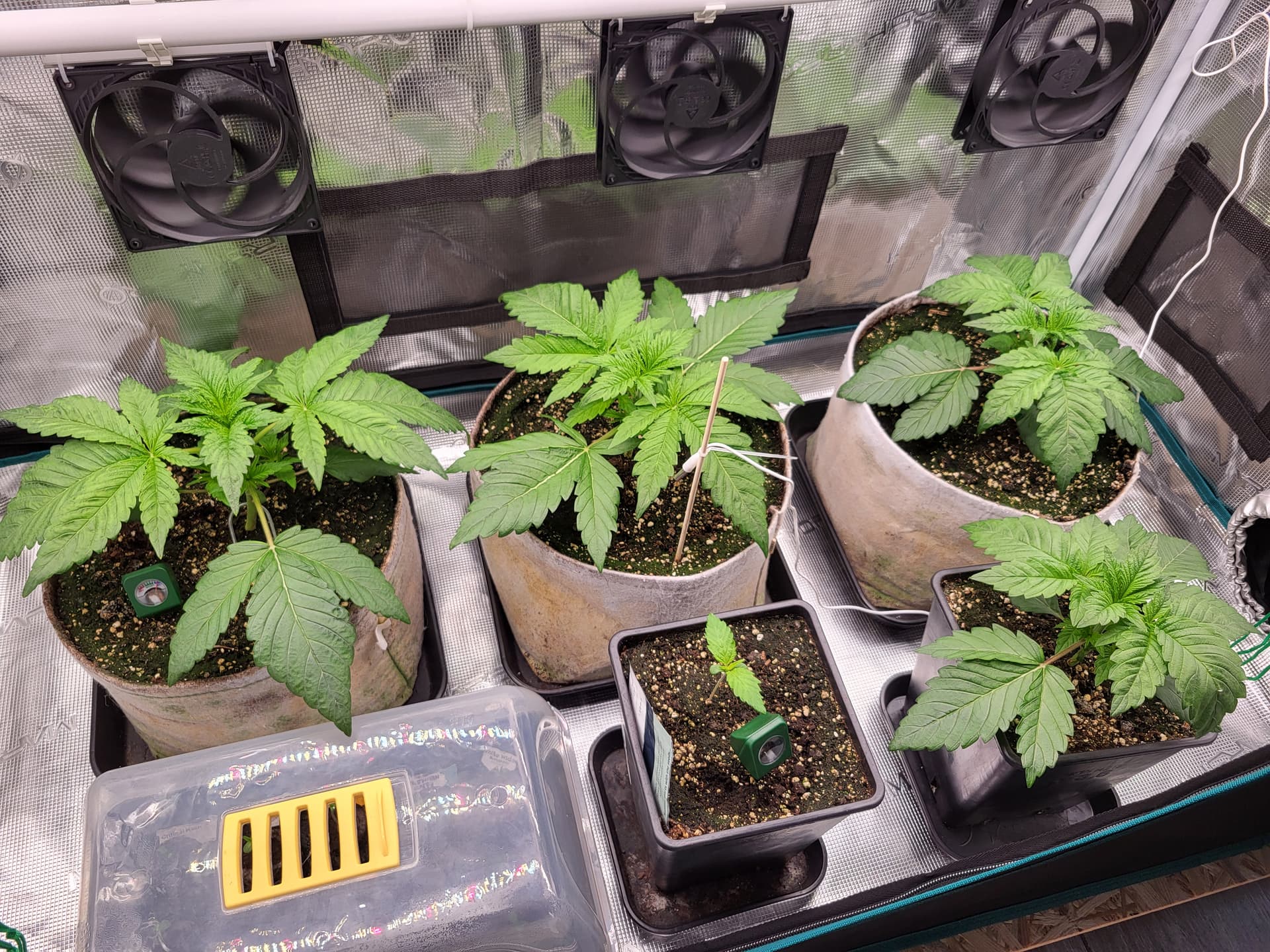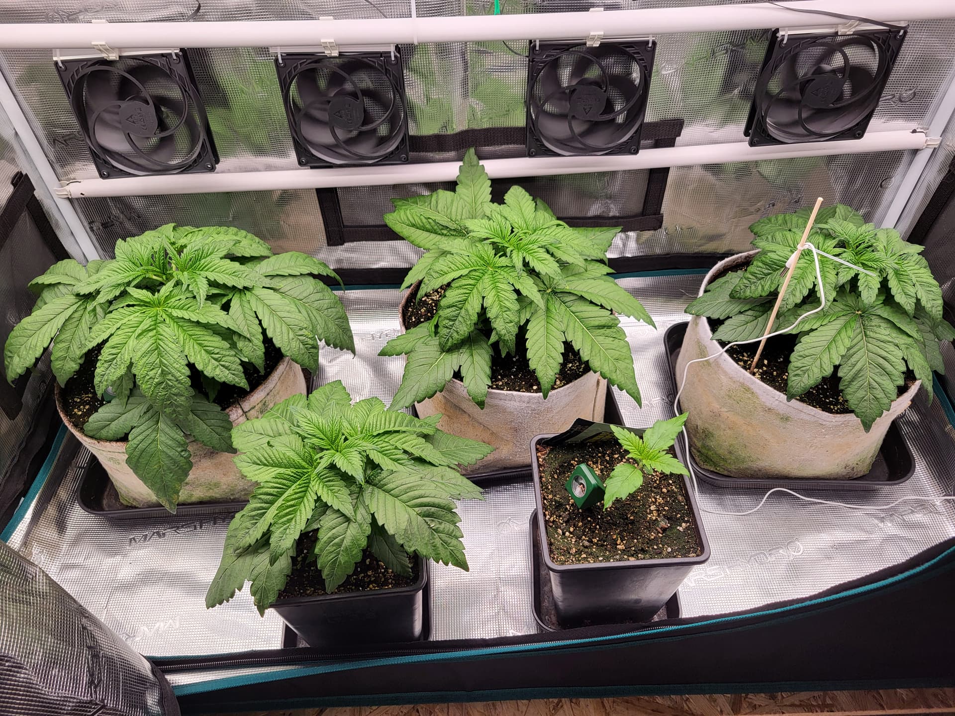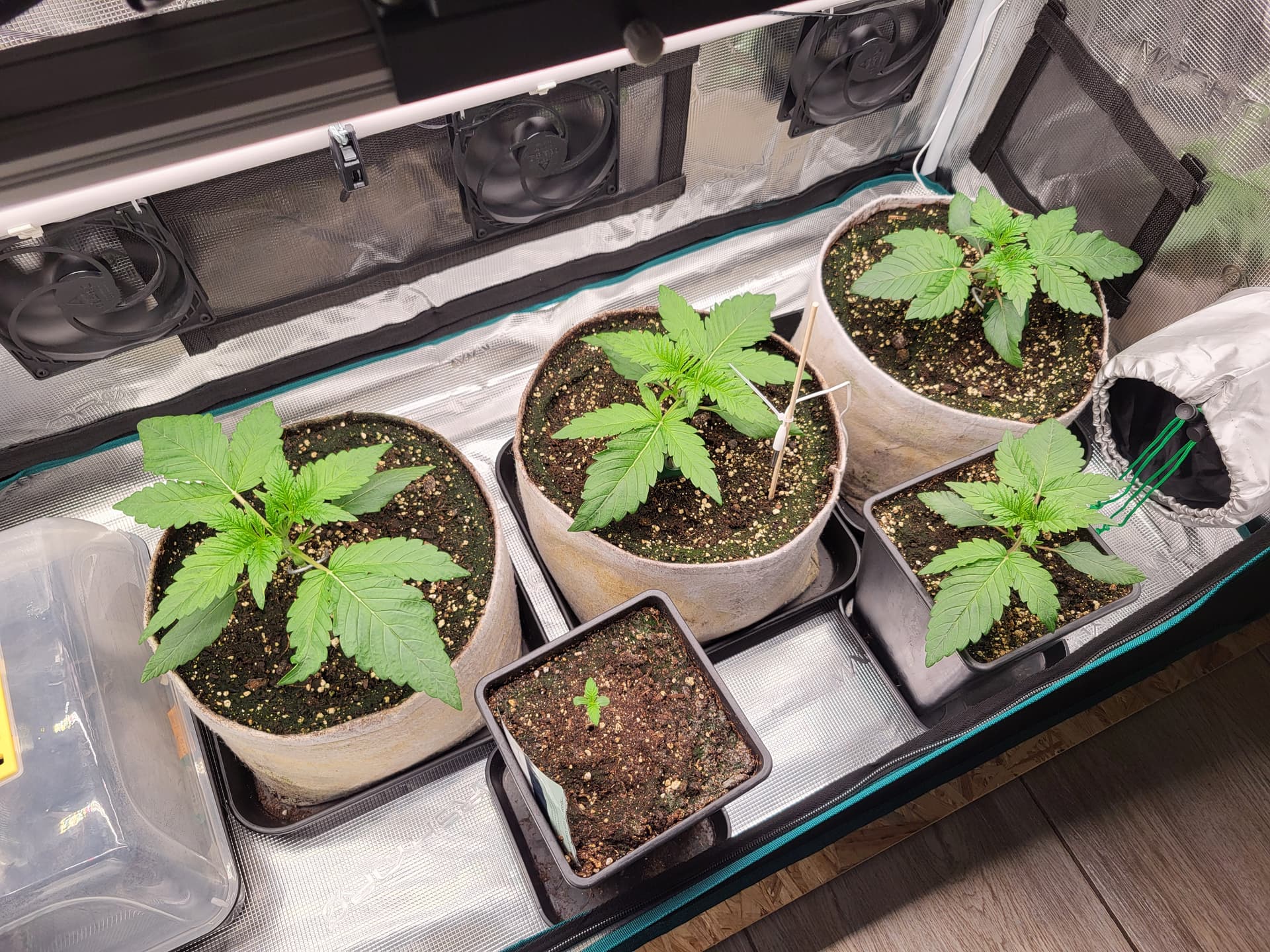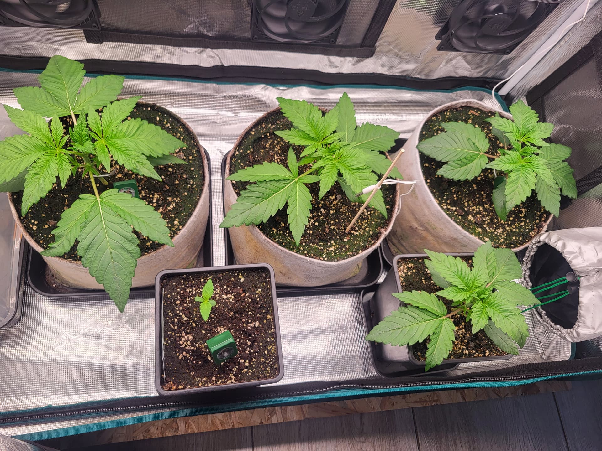 Die 4 machen sich gut. Die kleine zieht nach, weil ein Samen damals nicht gekeimt hat. Etwa 19000 Lux, also etwa um die 300 ppfd und ca. 20 DLI bei 18 H. Abstand besträgt aktuell 44 cm.