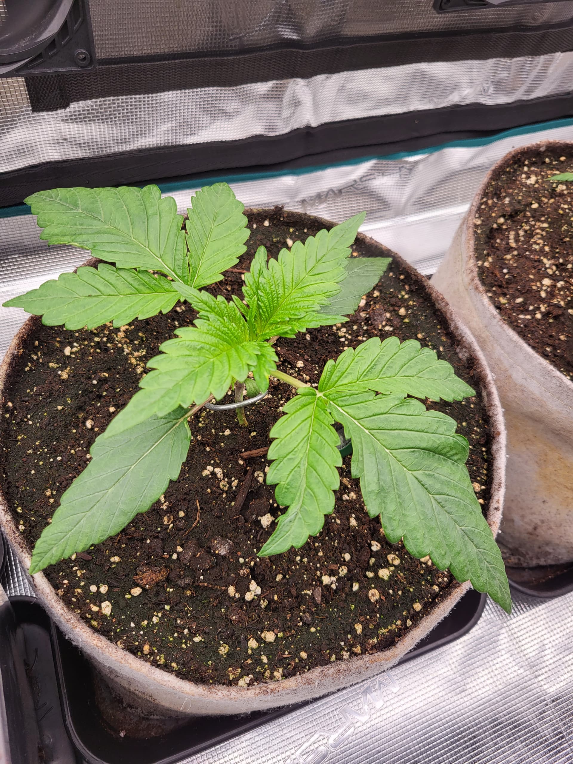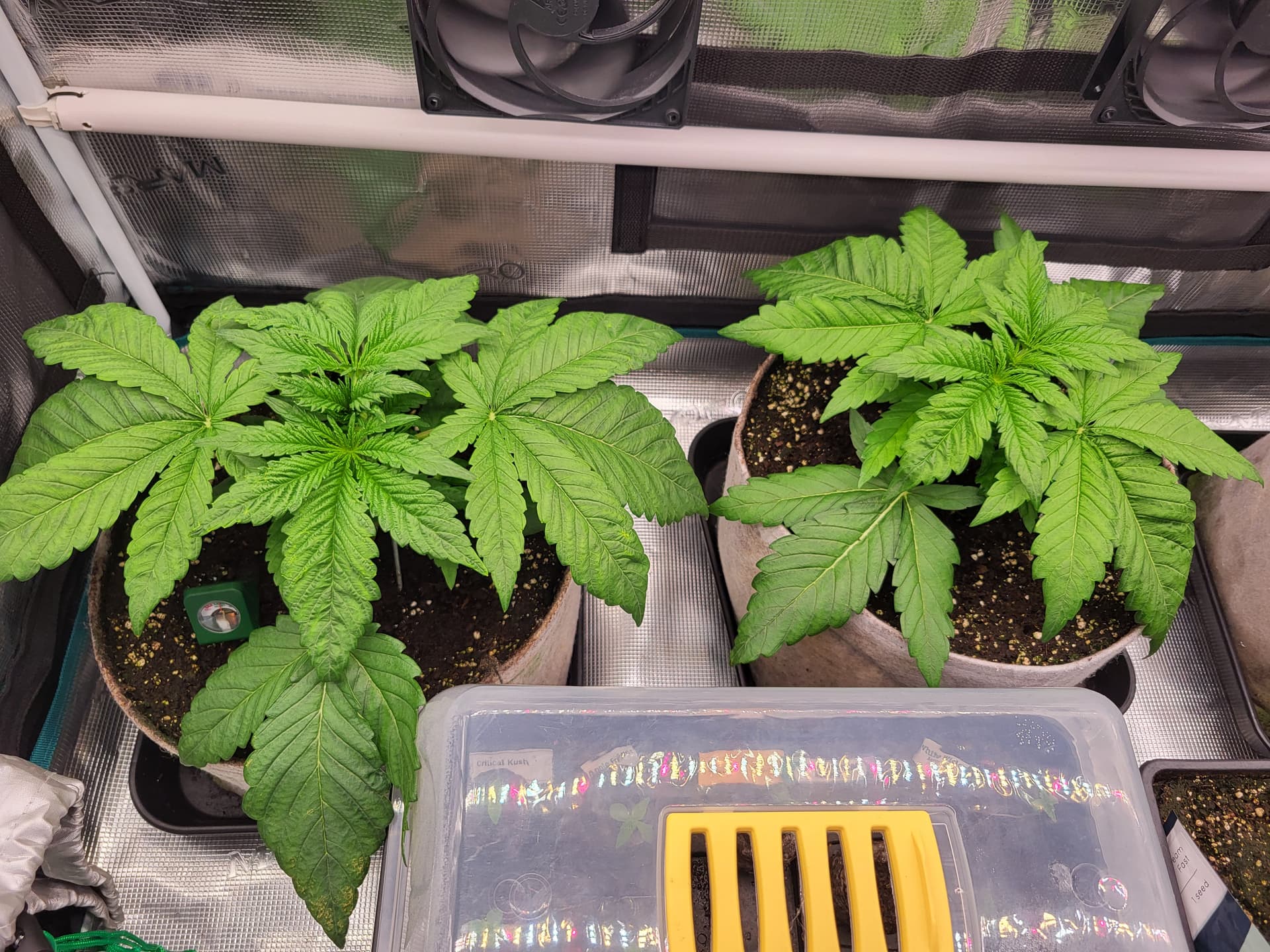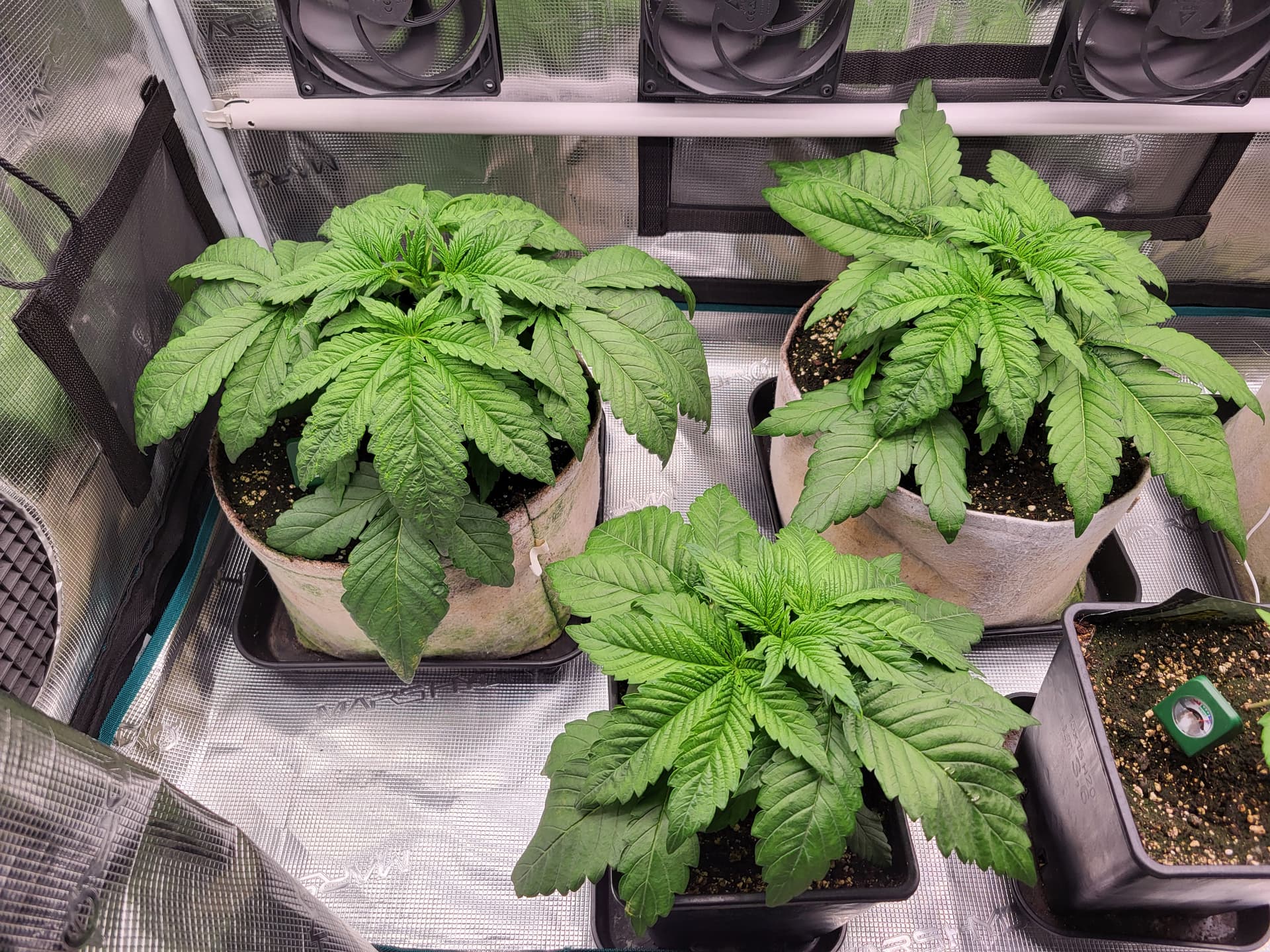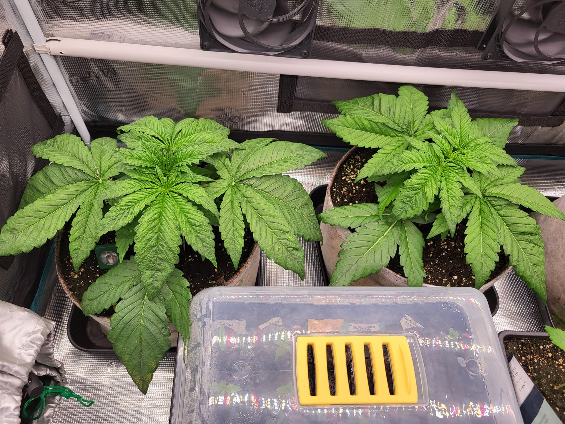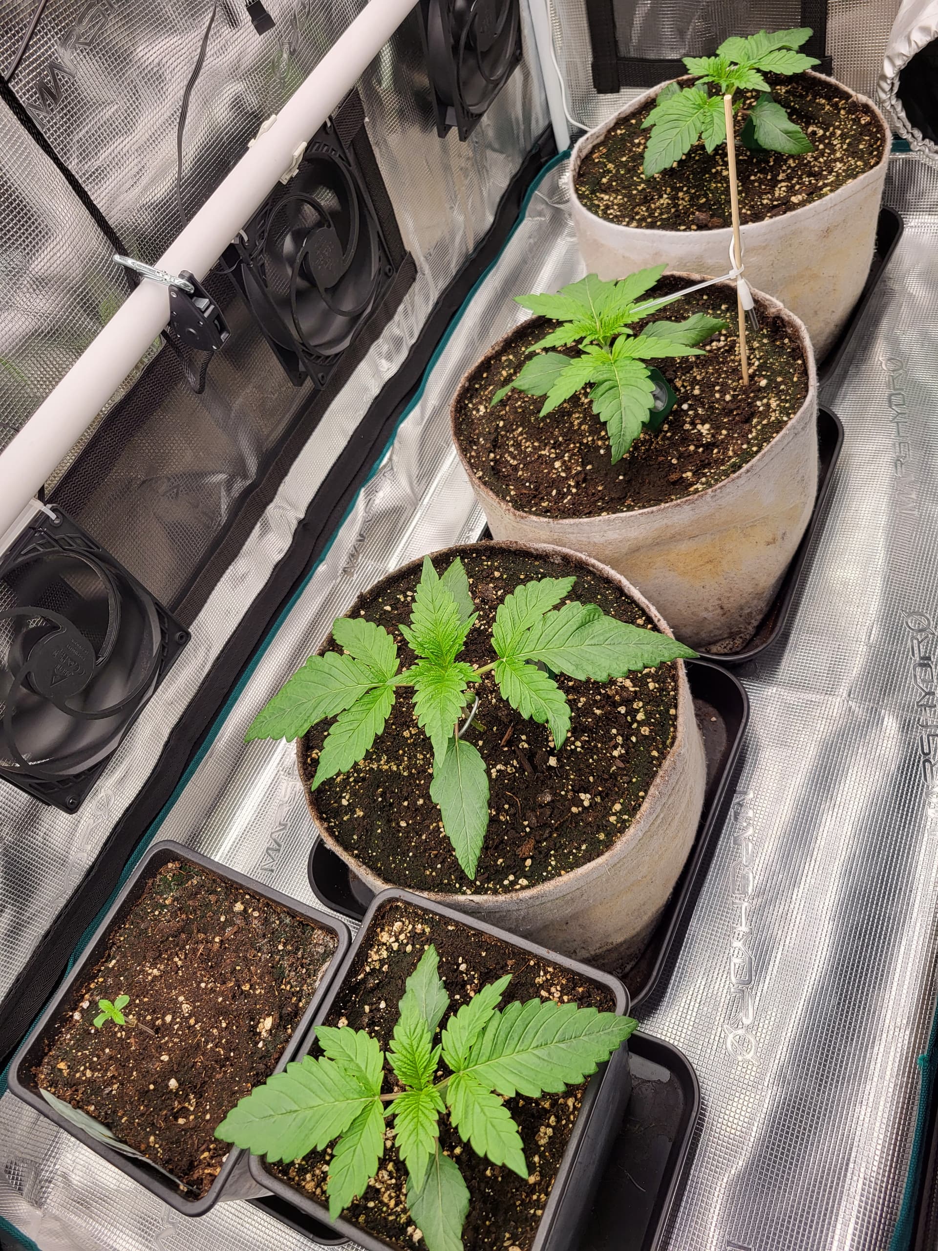 Die 4 machen sich gut. Die kleine zieht nach, weil ein Samen damals nicht gekeimt hat. Etwa 19000 Lux, also etwa um die 300 ppfd und ca. 20 DLI bei 18 H. Abstand besträgt aktuell 44 cm.